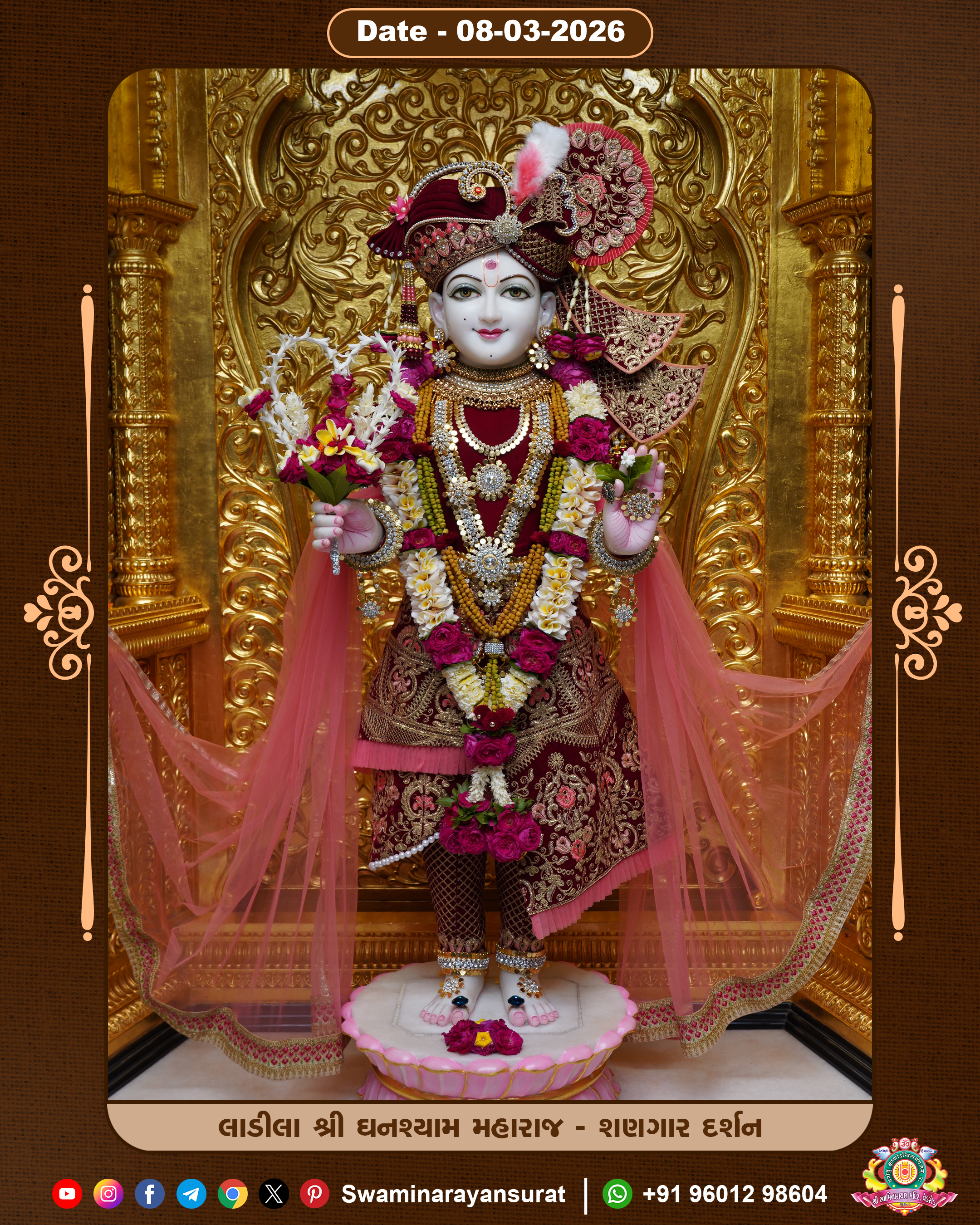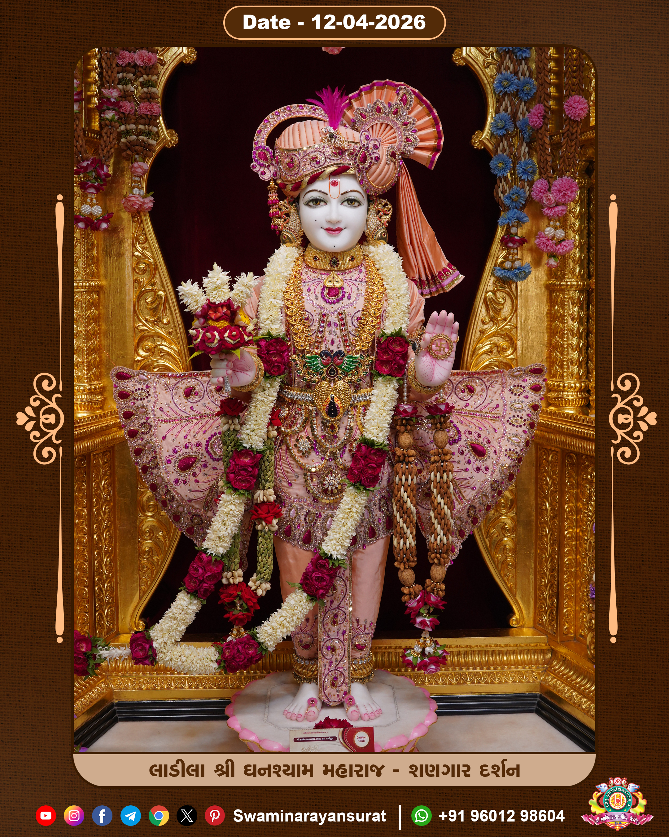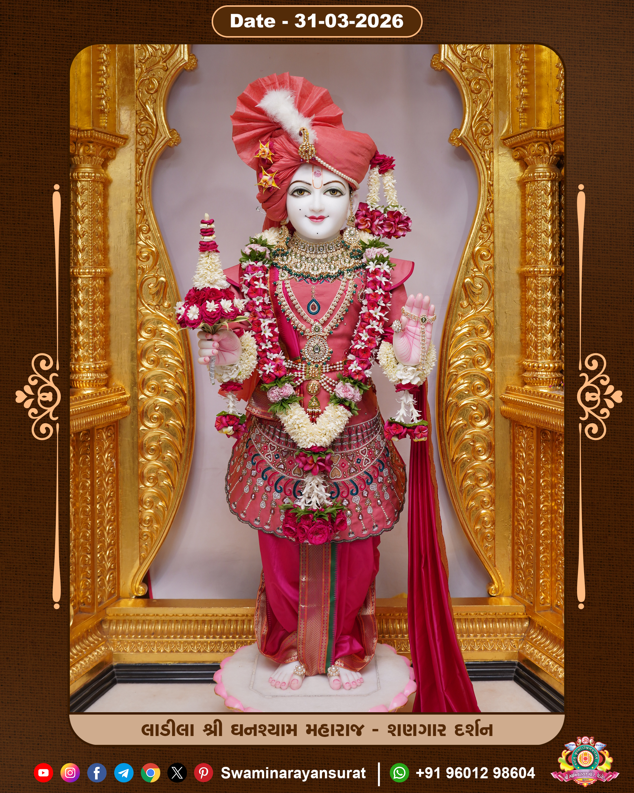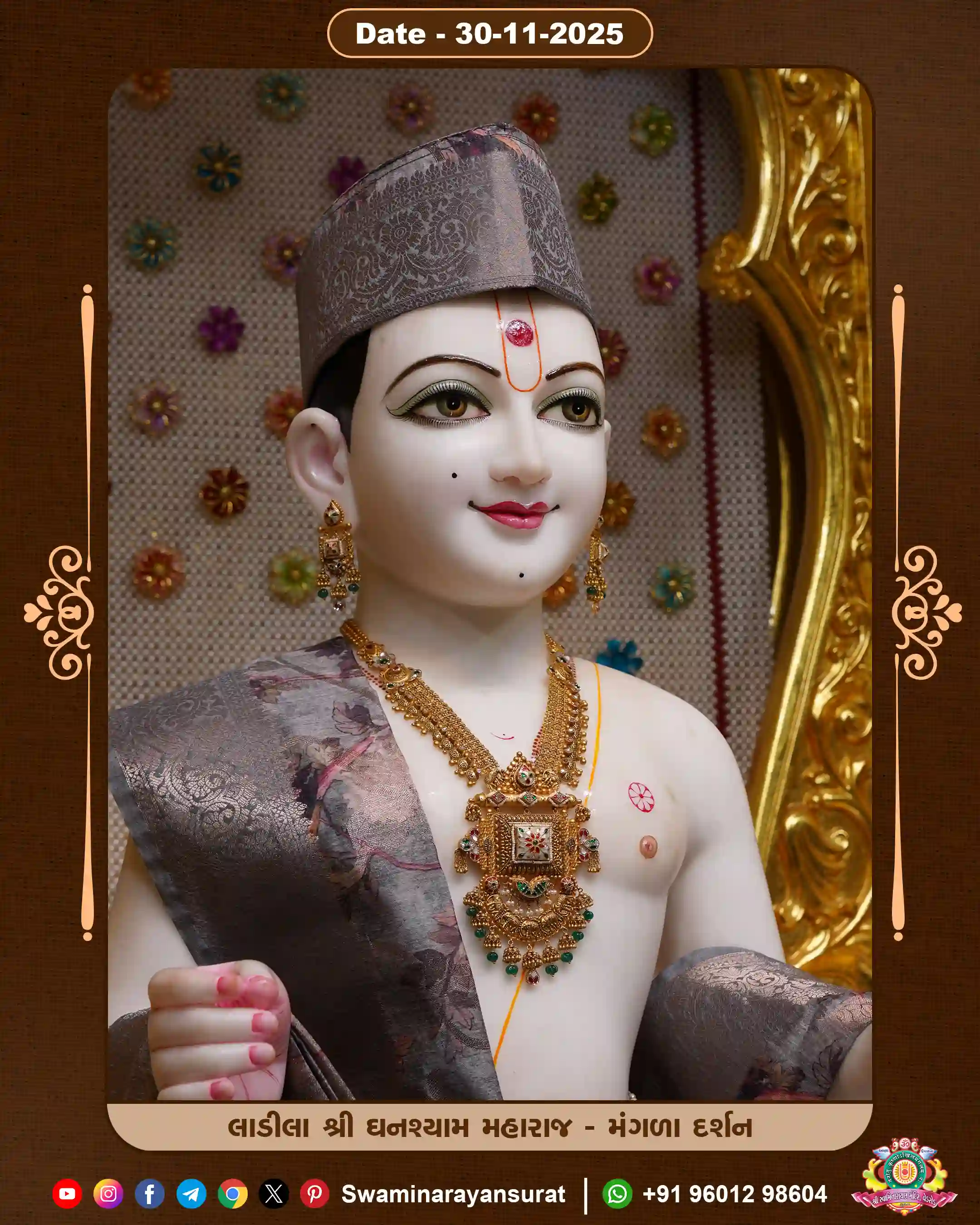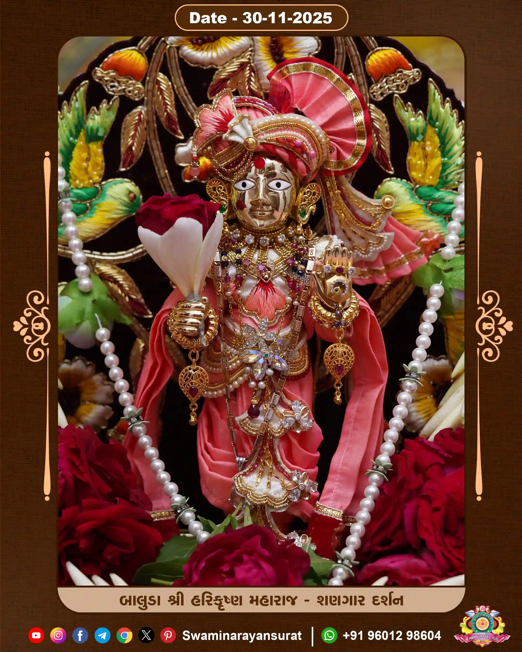Shree Swaminarayan Temple, VedRoad is a Spiritual Organization Which falls under the region Of Vadtal Temple (The Headquarter Of Laxminarayan Dev Gadi). It is the First Organization Which is Constructed By Pink Stone With Beautiful and Marvellous Carving in Surat Of Swaminarayan Sampraday, Vadtal desh Which is increasing Pride & Prestige of Surat City, This temple contains One Main Shrine under which the idol of Ladila Shree Ghanshyam Maharaj is installed. P. Pu. Sadguru Shree Prabhucharandasji Swami is the Creator of this divine Organization. By the Several Activities & appearance Many devotees feels Easy in difficult Circumstances. He with his approx. 15 Saints & Devotees does Several Social & Spiritual Activities to fulfill the goal of Swaminarayan Sampraday, to do Worship with religious practices.