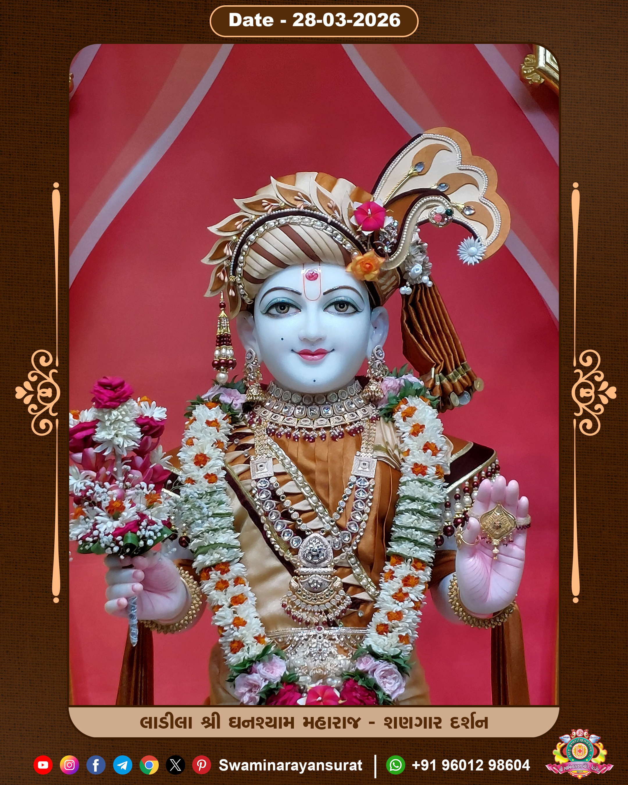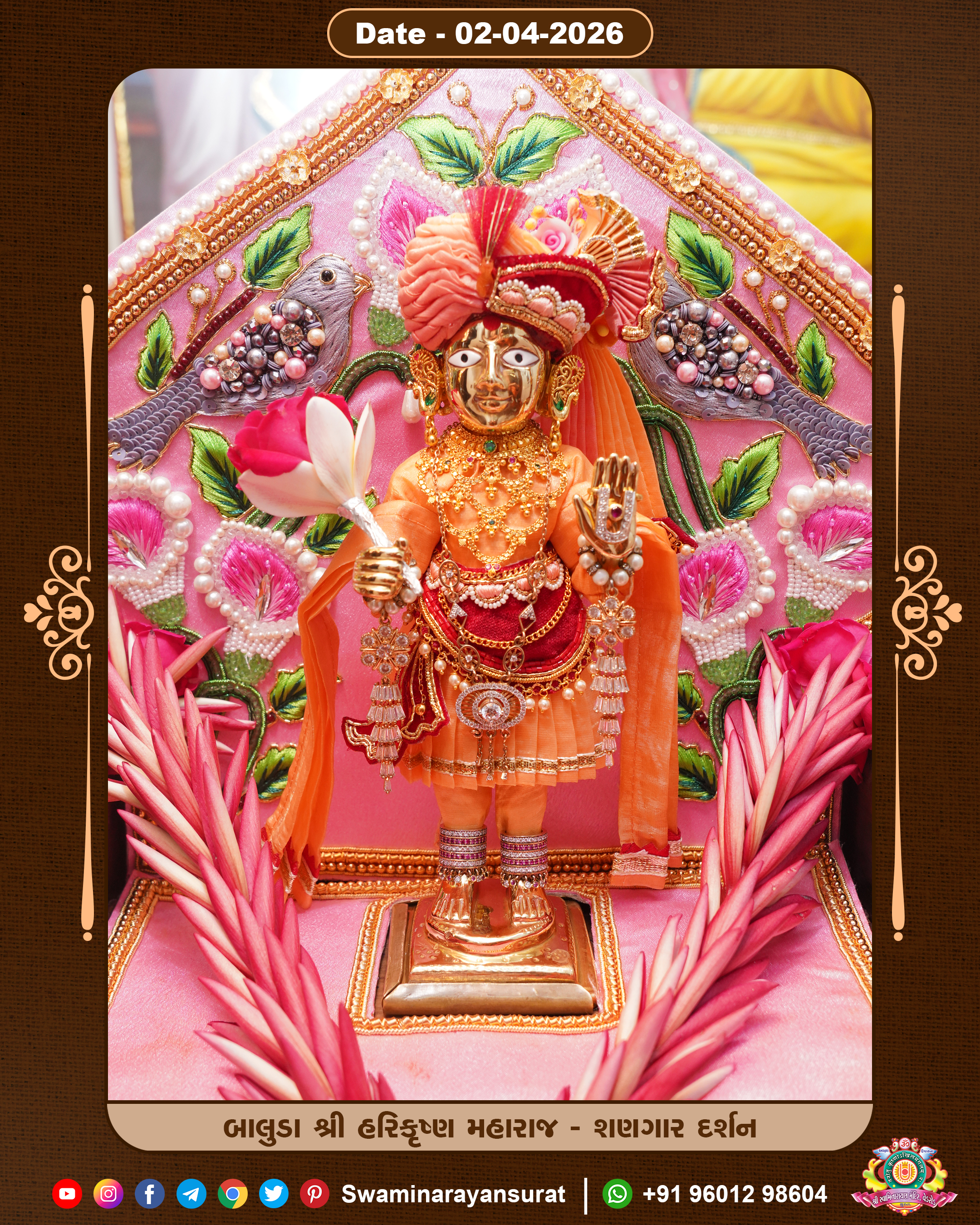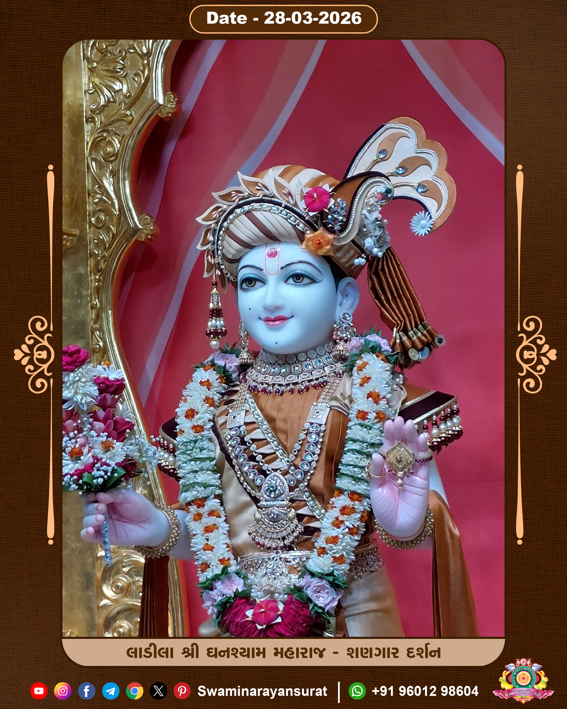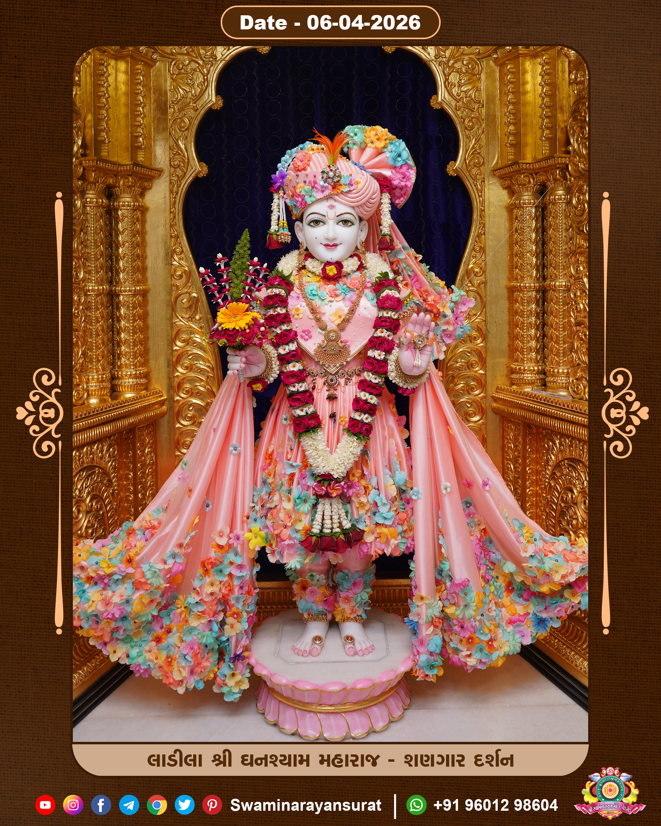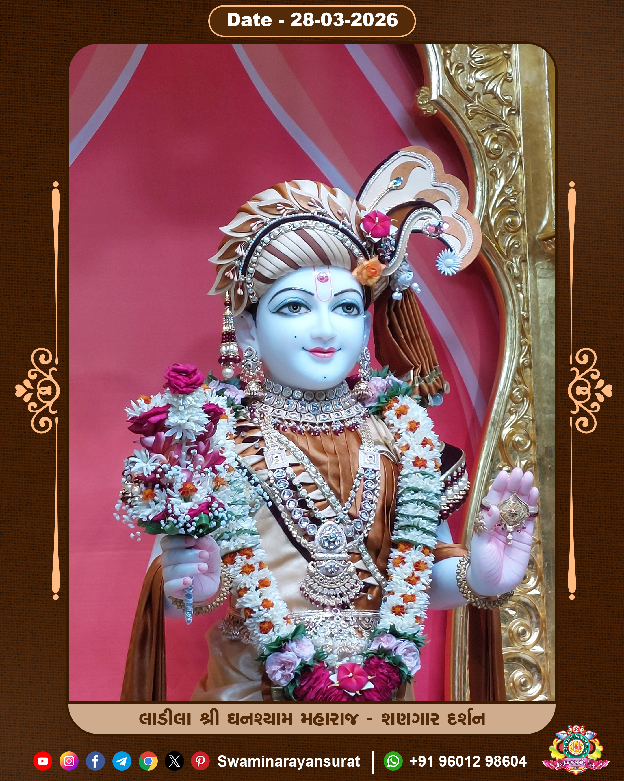 Shree Swaminarayan Temple, VedRoad is a Spiritual Organization Which falls under the region Of Vadtal Temple (The Headquarter Of Laxminarayan Dev Gadi). It is the First Organization Which is Constructed By Pink Stone With Beautiful and Marvellous Carving in Surat Of Swaminarayan Sampraday, Vadtal desh Which is increasing Pride & Prestige of Surat City, This temple contains One Main Shrine under which the idol of Ladila Shree Ghanshyam Maharaj is installed. P. Pu. Sadguru Shree Prabhucharandasji Swami is the Creator of this divine Organization. By the Several Activities & appearance Many devotees feels Easy in difficult Circumstances. He with his approx. 15 Saints & Devotees does Several Social & Spiritual Activities to fulfill the goal of Swaminarayan Sampraday, to do Worship with religious practices.