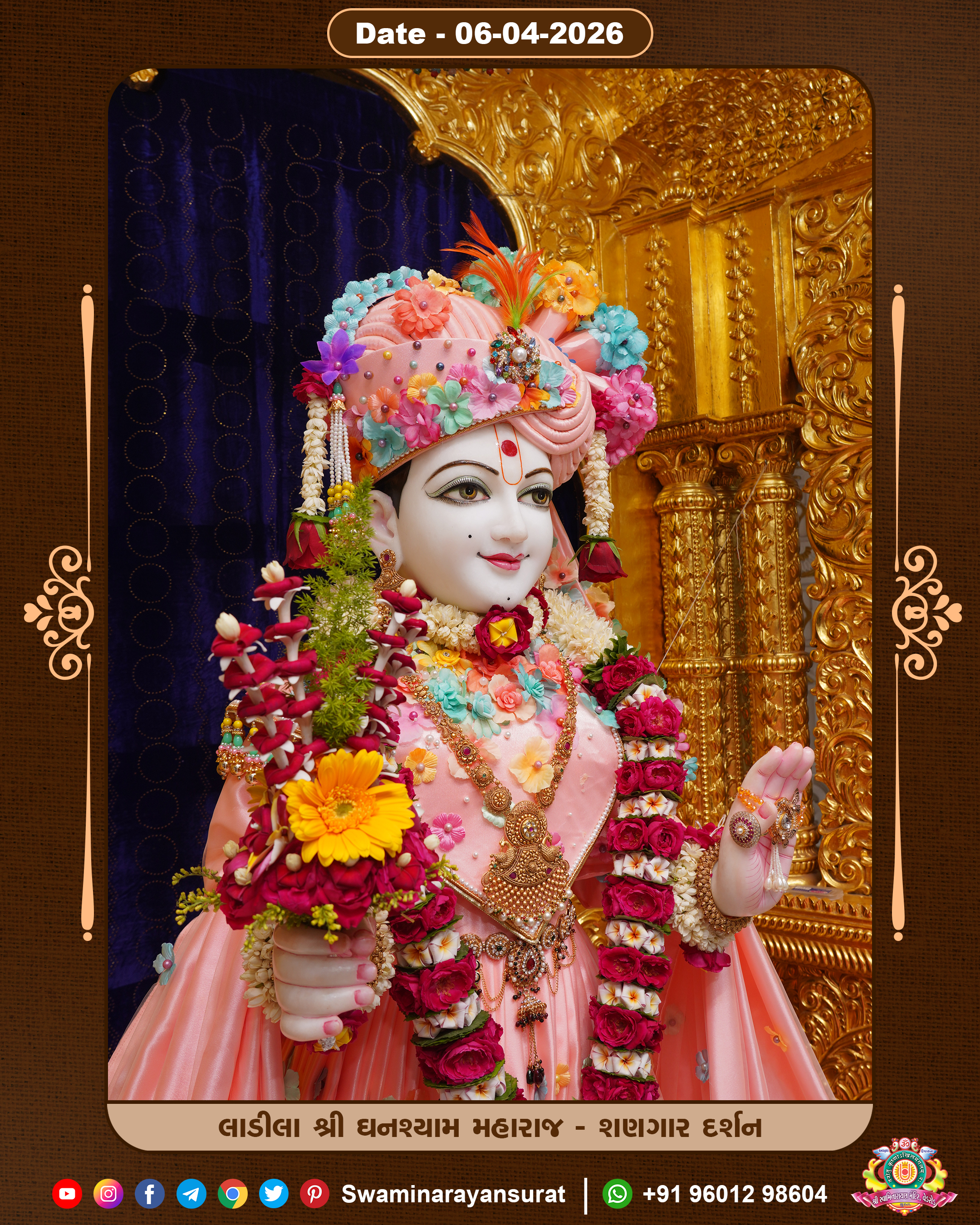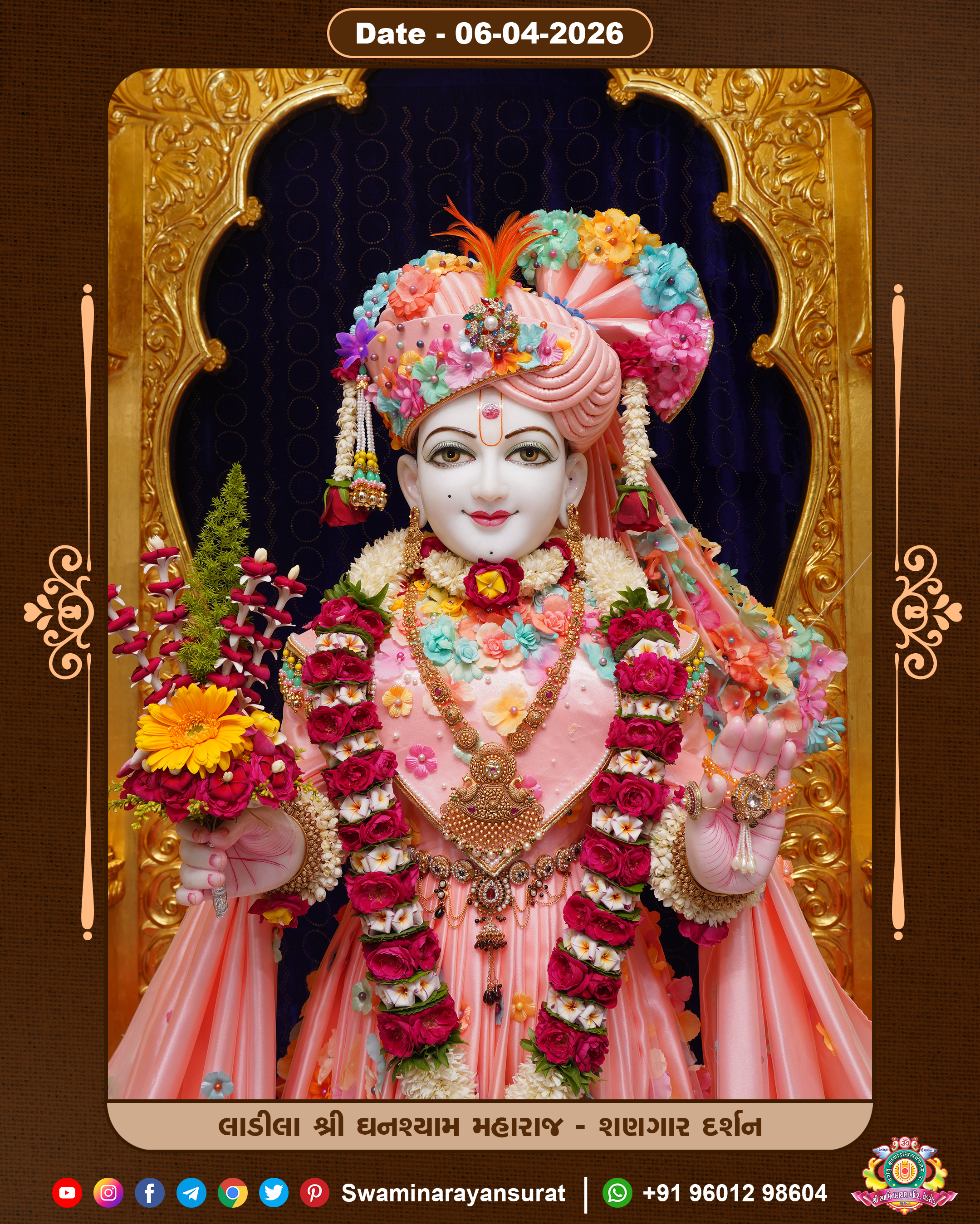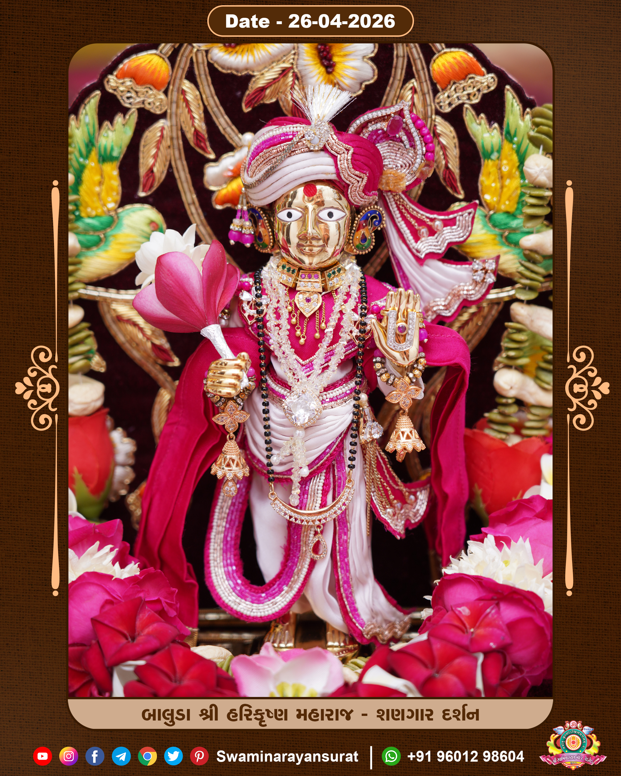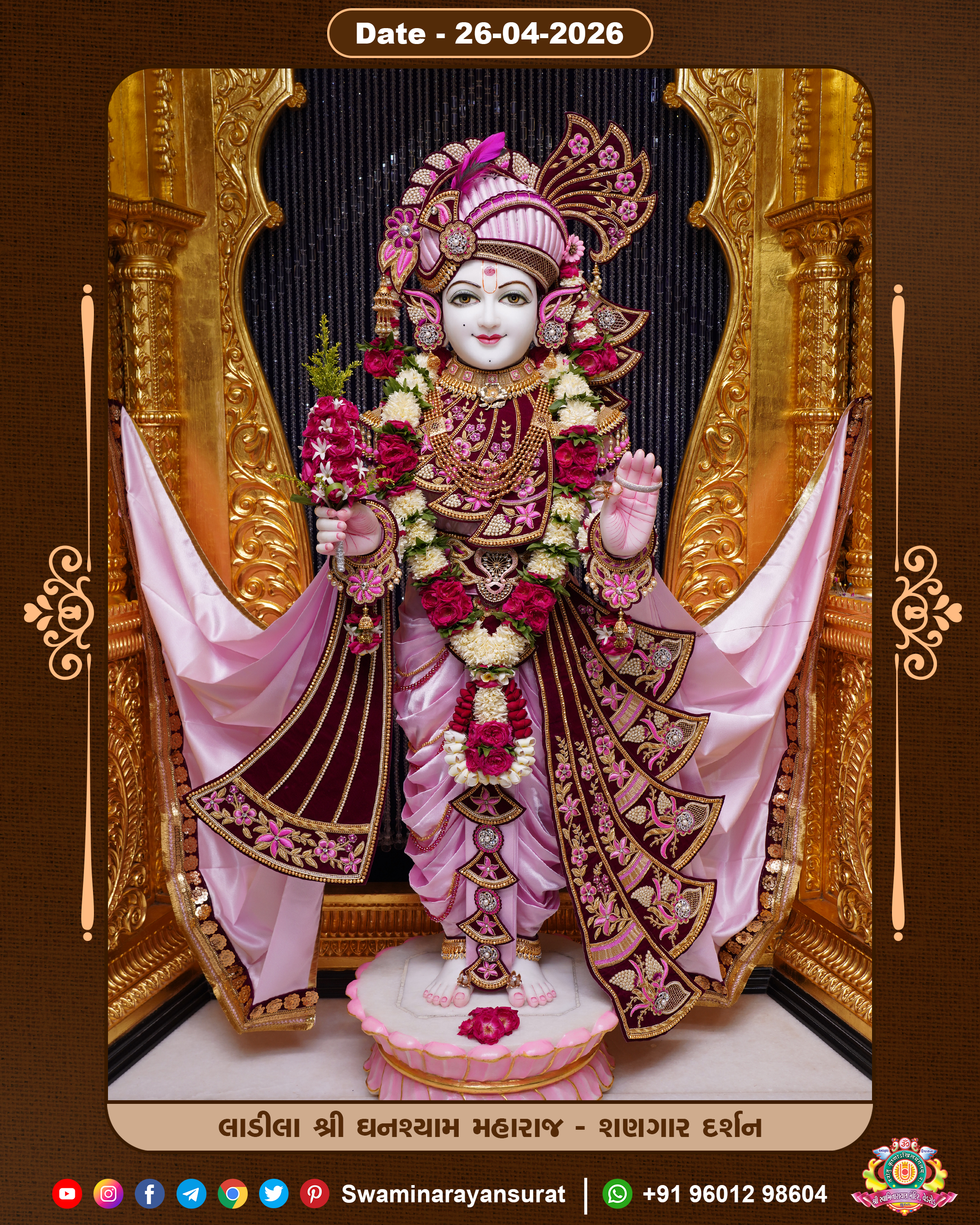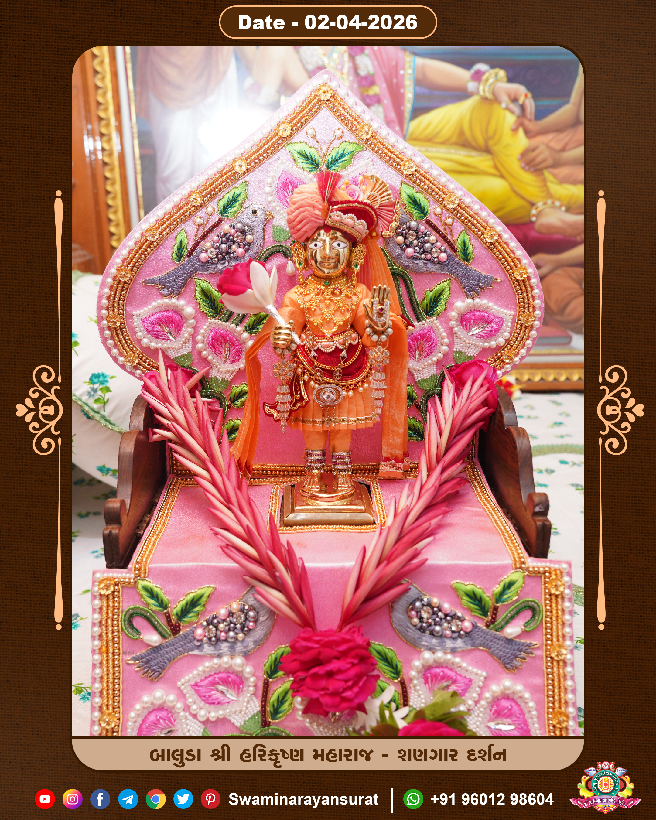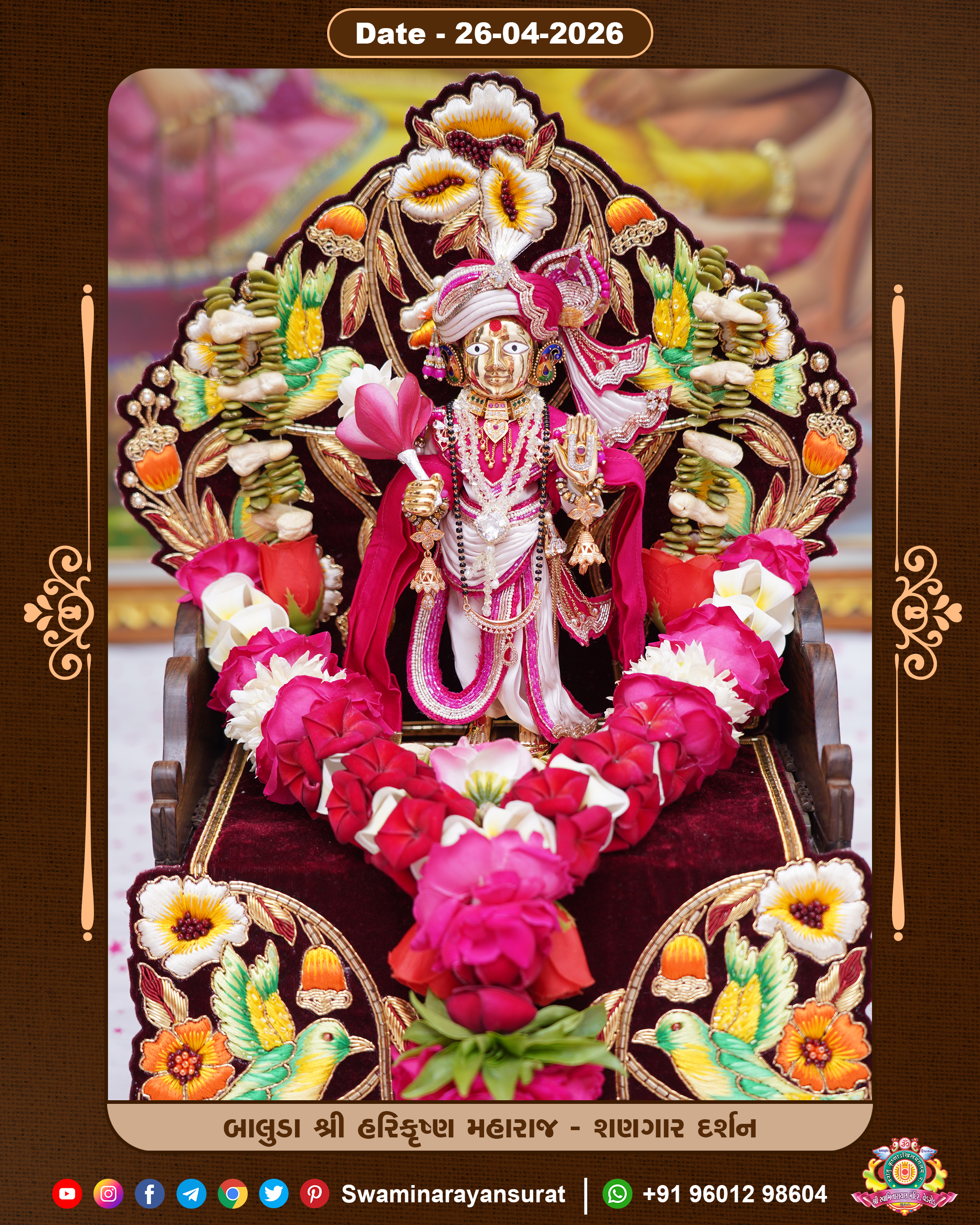 Shree Swaminarayan Temple, VedRoad is a Spiritual Organization Which falls under the region Of Vadtal Temple (The Headquarter Of Laxminarayan Dev Gadi). It is the First Organization Which is Constructed By Pink Stone With Beautiful and Marvellous Carving in Surat Of Swaminarayan Sampraday, Vadtal desh Which is increasing Pride & Prestige of Surat City, This temple contains One Main Shrine under which the idol of Ladila Shree Ghanshyam Maharaj is installed. P. Pu. Sadguru Shree Prabhucharandasji Swami is the Creator of this divine Organization. By the Several Activities & appearance Many devotees feels Easy in difficult Circumstances. He with his approx. 15 Saints & Devotees does Several Social & Spiritual Activities to fulfill the goal of Swaminarayan Sampraday, to do Worship with religious practices.