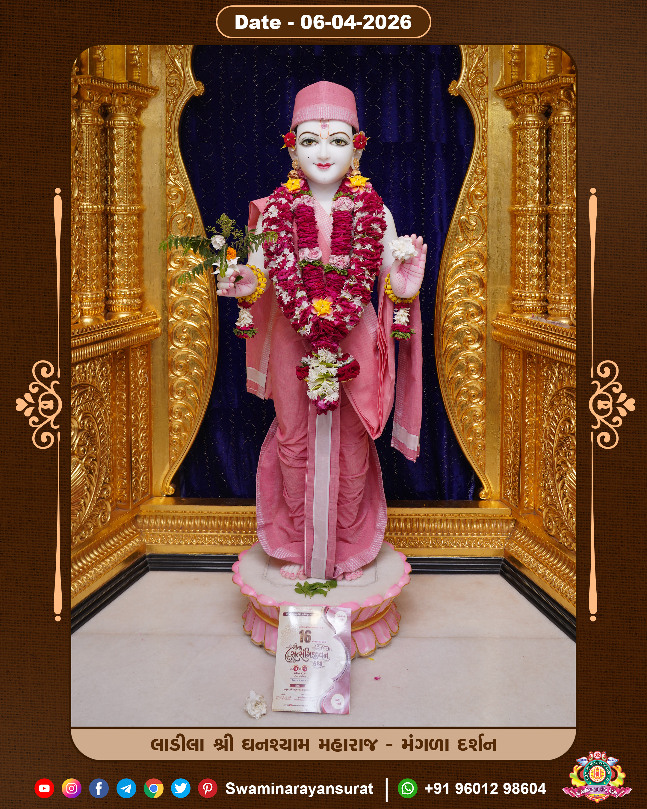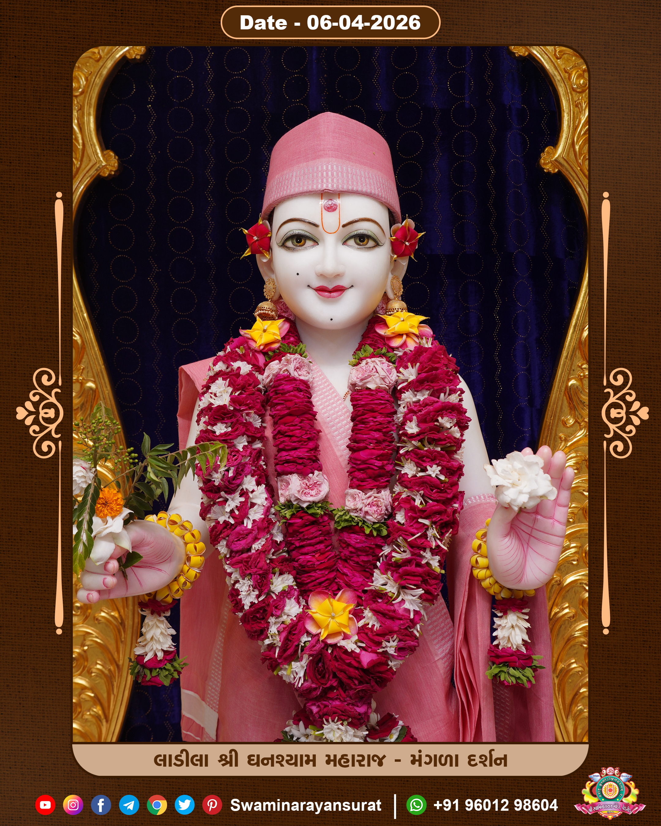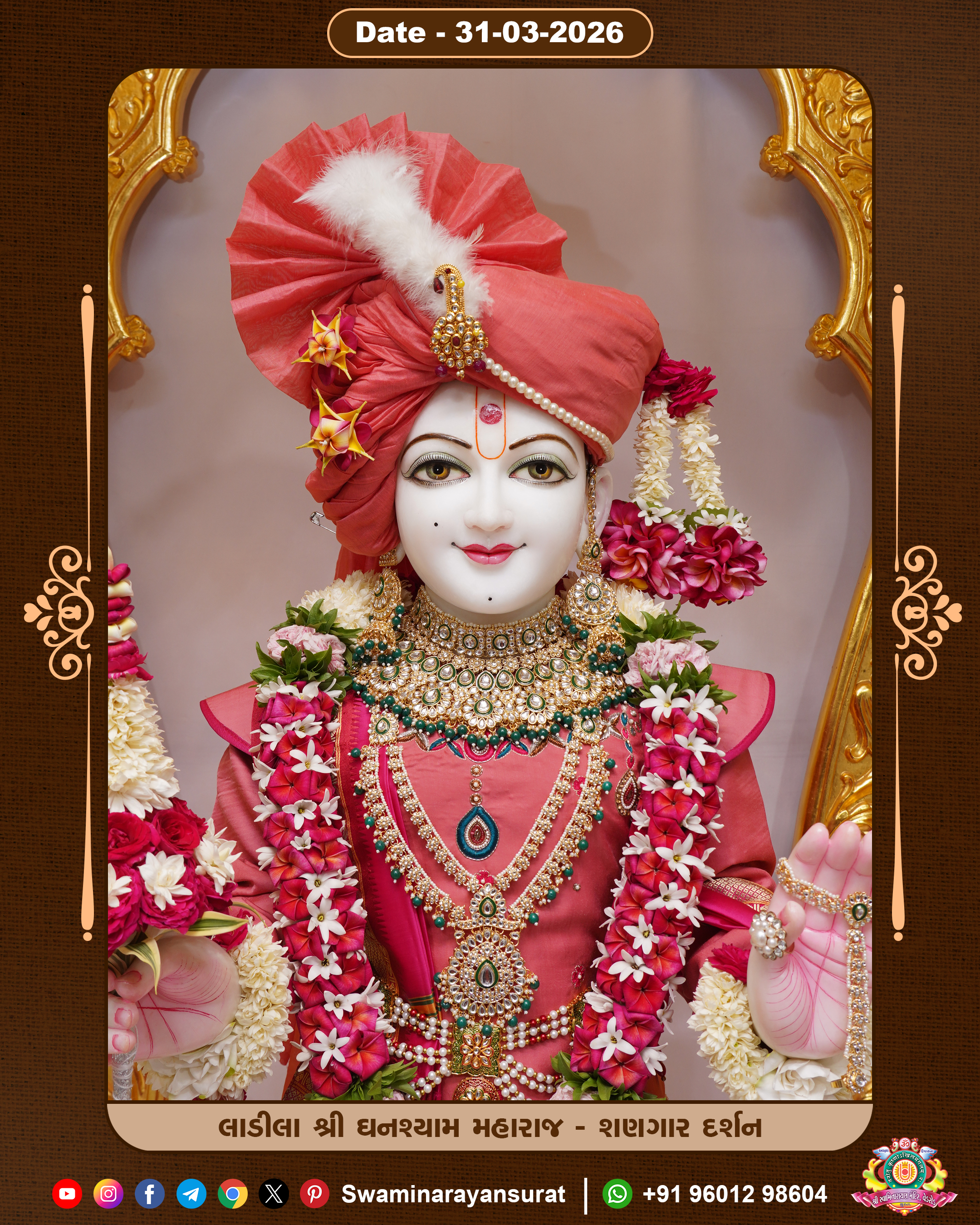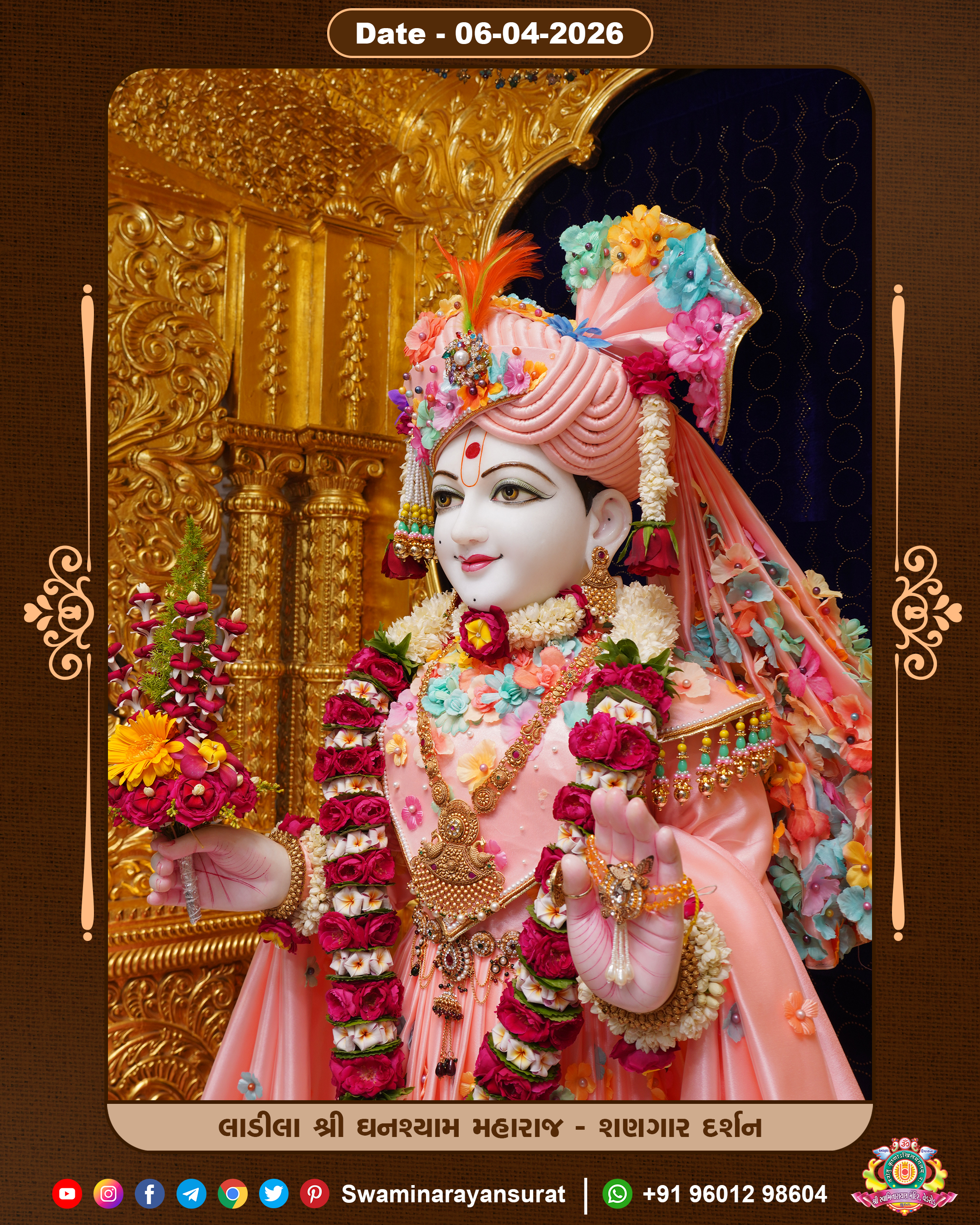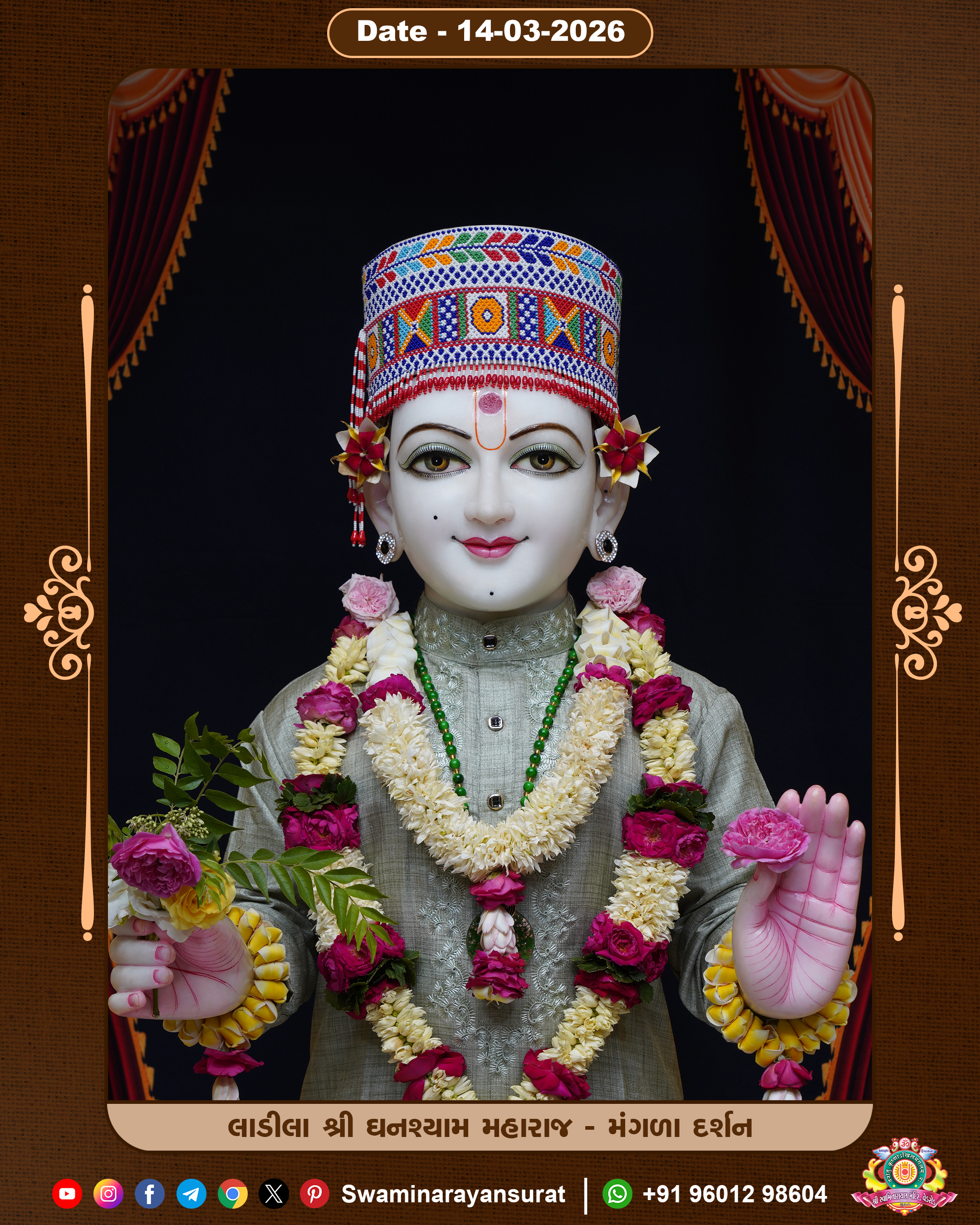 Shree Swaminarayan Temple, VedRoad is a Spiritual Organization Which falls under the region Of Vadtal Temple (The Headquarter Of Laxminarayan Dev Gadi). It is the First Organization Which is Constructed By Pink Stone With Beautiful and Marvellous Carving in Surat Of Swaminarayan Sampraday, Vadtal desh Which is increasing Pride & Prestige of Surat City, This temple contains One Main Shrine under which the idol of Ladila Shree Ghanshyam Maharaj is installed. P. Pu. Sadguru Shree Prabhucharandasji Swami is the Creator of this divine Organization. By the Several Activities & appearance Many devotees feels Easy in difficult Circumstances. He with his approx. 15 Saints & Devotees does Several Social & Spiritual Activities to fulfill the goal of Swaminarayan Sampraday, to do Worship with religious practices.