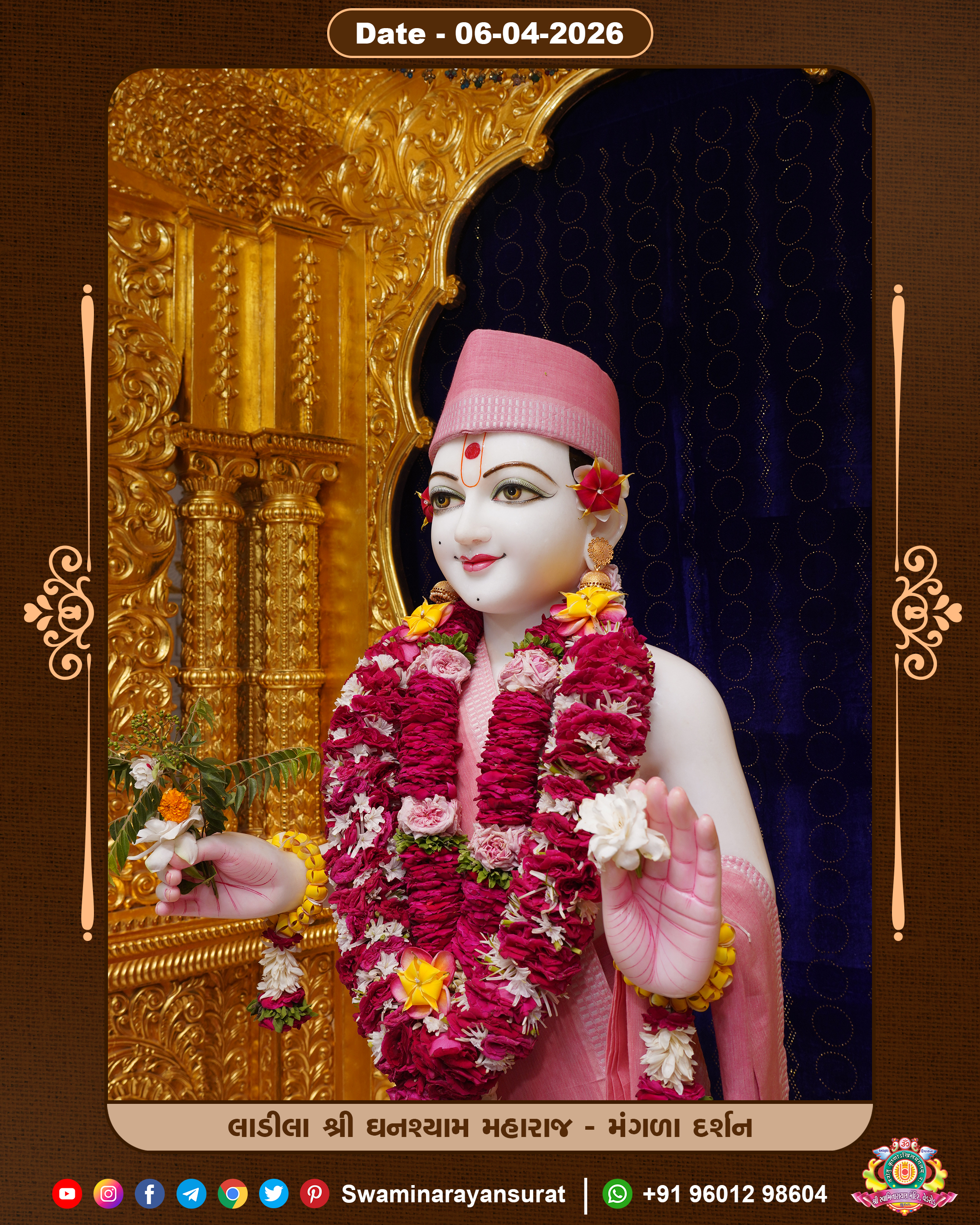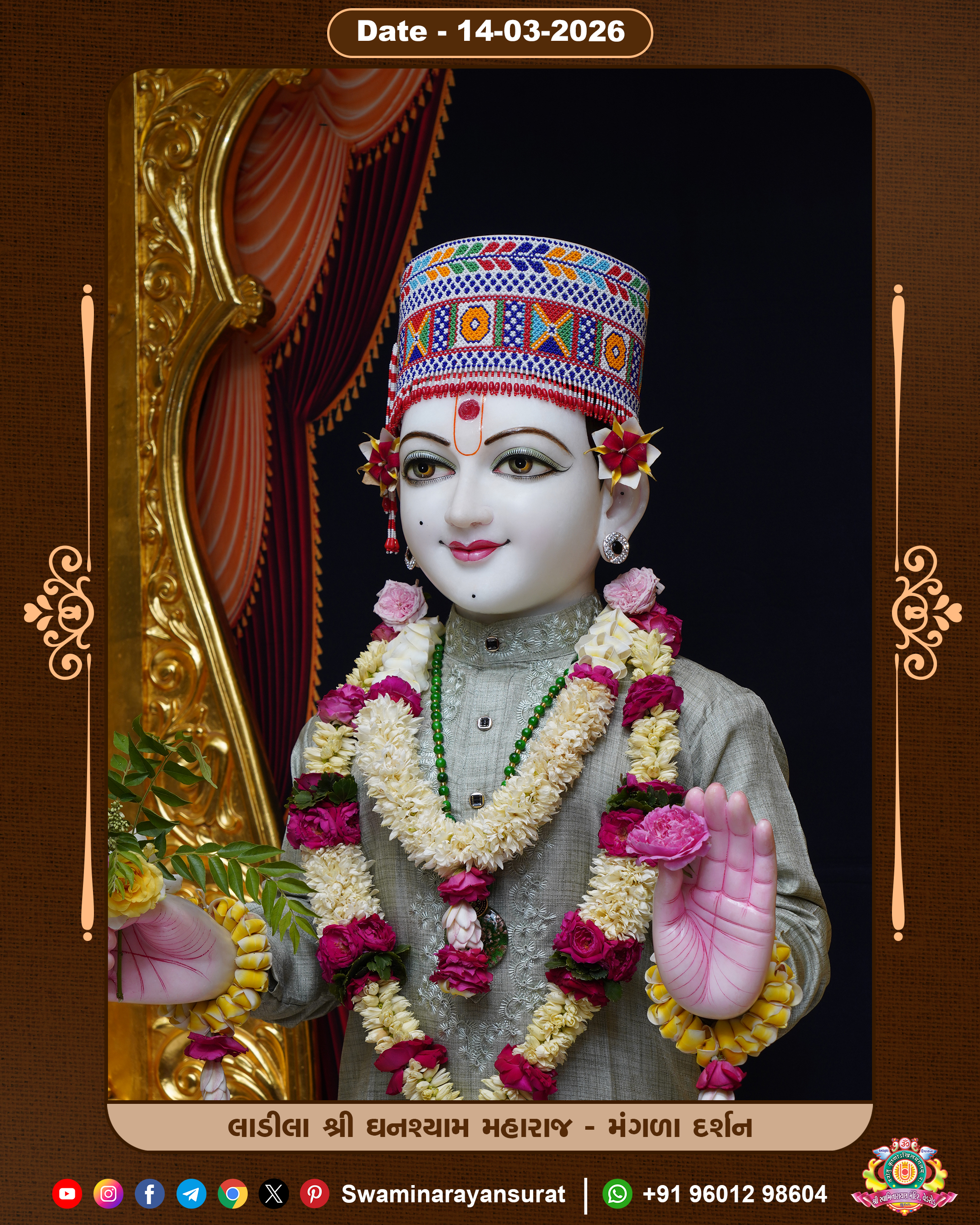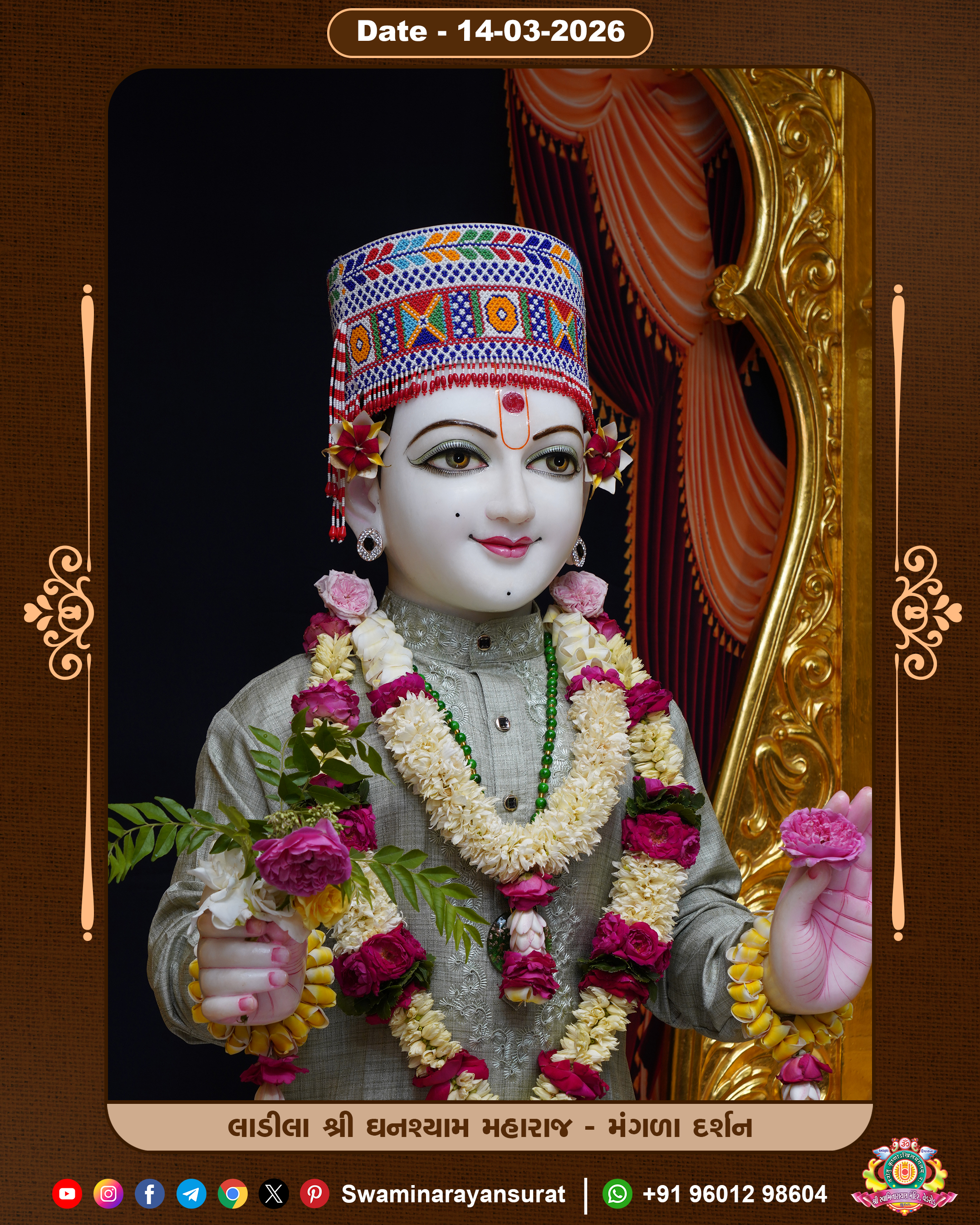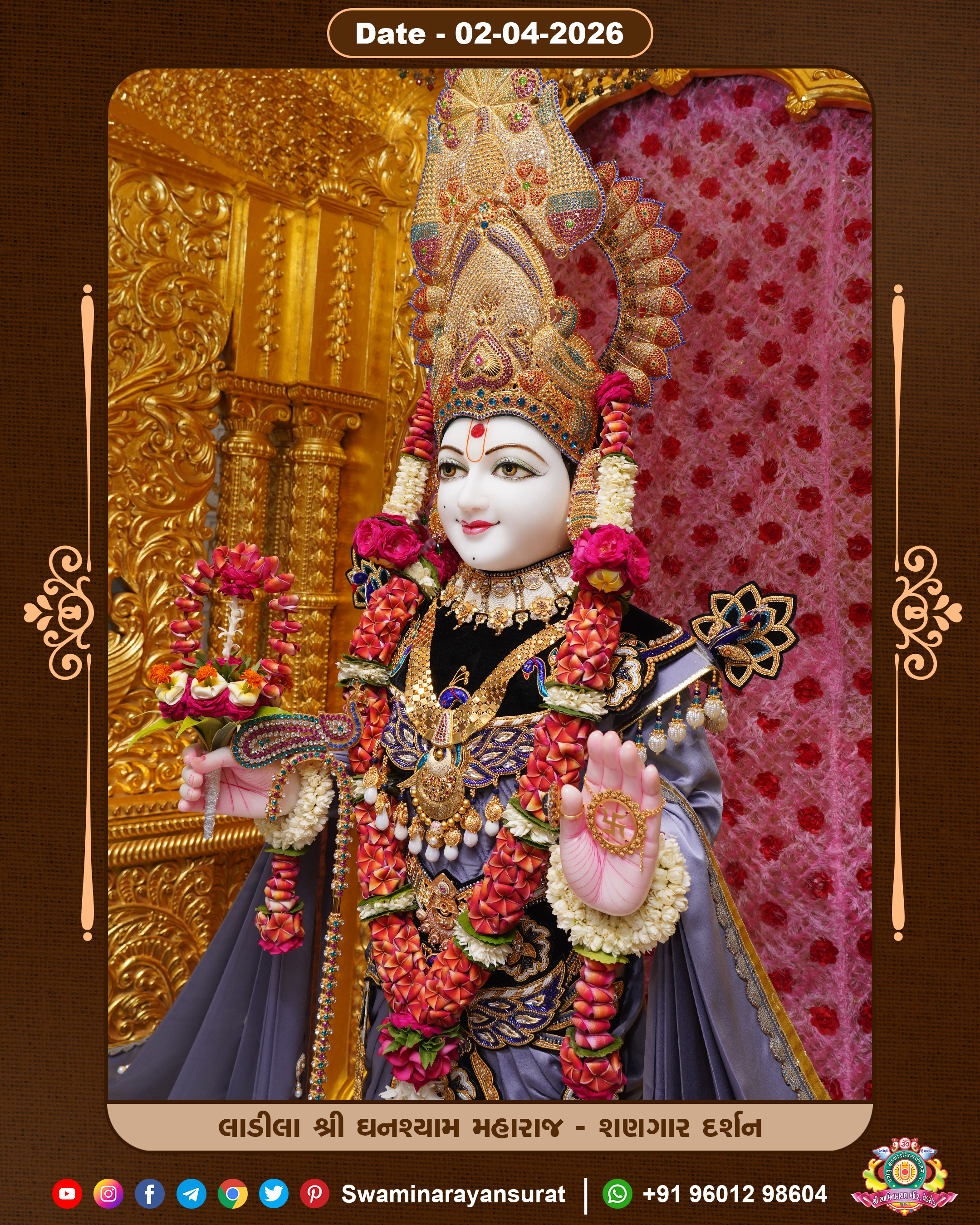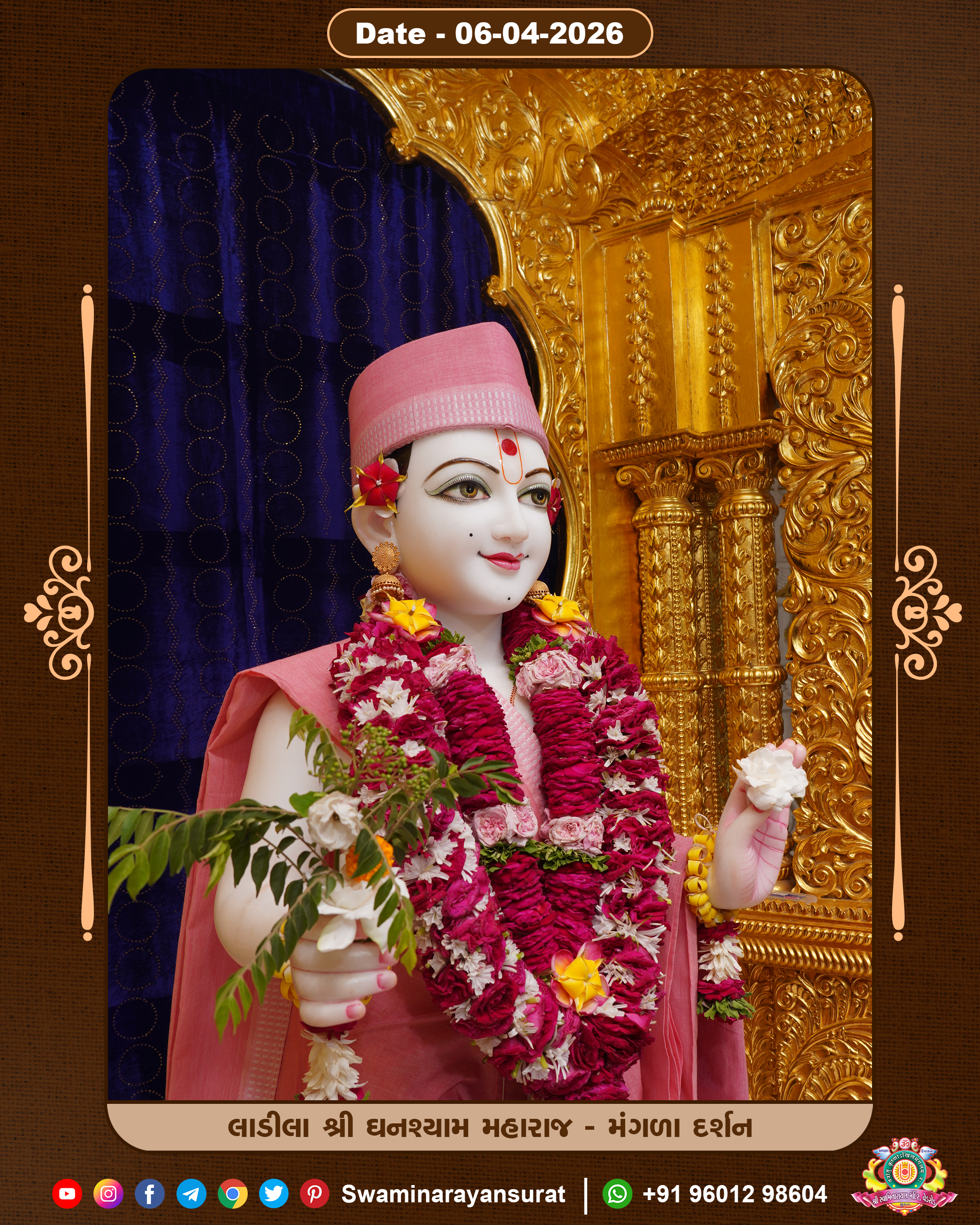Shree Swaminarayan Temple, VedRoad is a Spiritual Organization Which falls under the region Of Vadtal Temple (The Headquarter Of Laxminarayan Dev Gadi). It is the First Organization Which is Constructed By Pink Stone With Beautiful and Marvellous Carving in Surat Of Swaminarayan Sampraday, Vadtal desh Which is increasing Pride & Prestige of Surat City, This temple contains One Main Shrine under which the idol of Ladila Shree Ghanshyam Maharaj is installed. P. Pu. Sadguru Shree Prabhucharandasji Swami is the Creator of this divine Organization. By the Several Activities & appearance Many devotees feels Easy in difficult Circumstances. He with his approx. 15 Saints & Devotees does Several Social & Spiritual Activities to fulfill the goal of Swaminarayan Sampraday, to do Worship with religious practices.