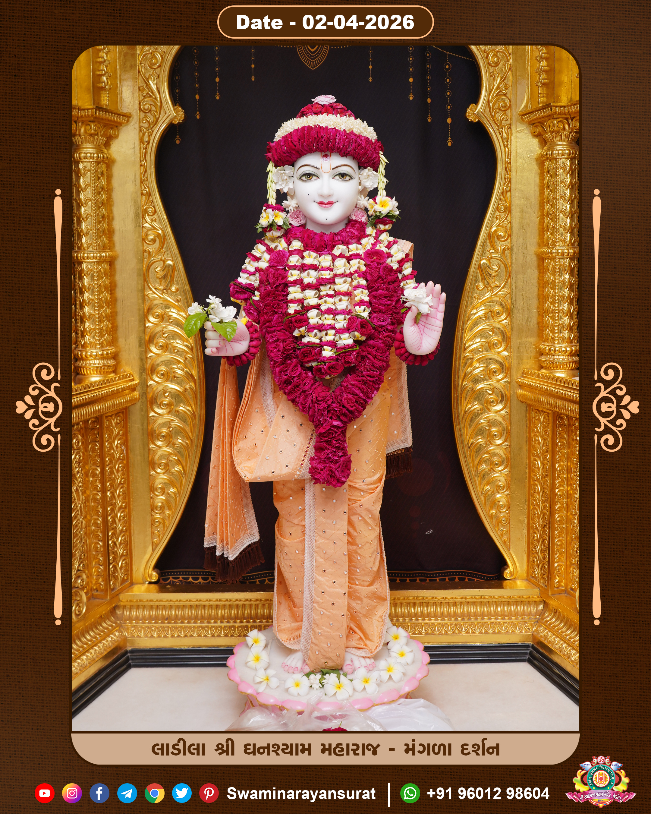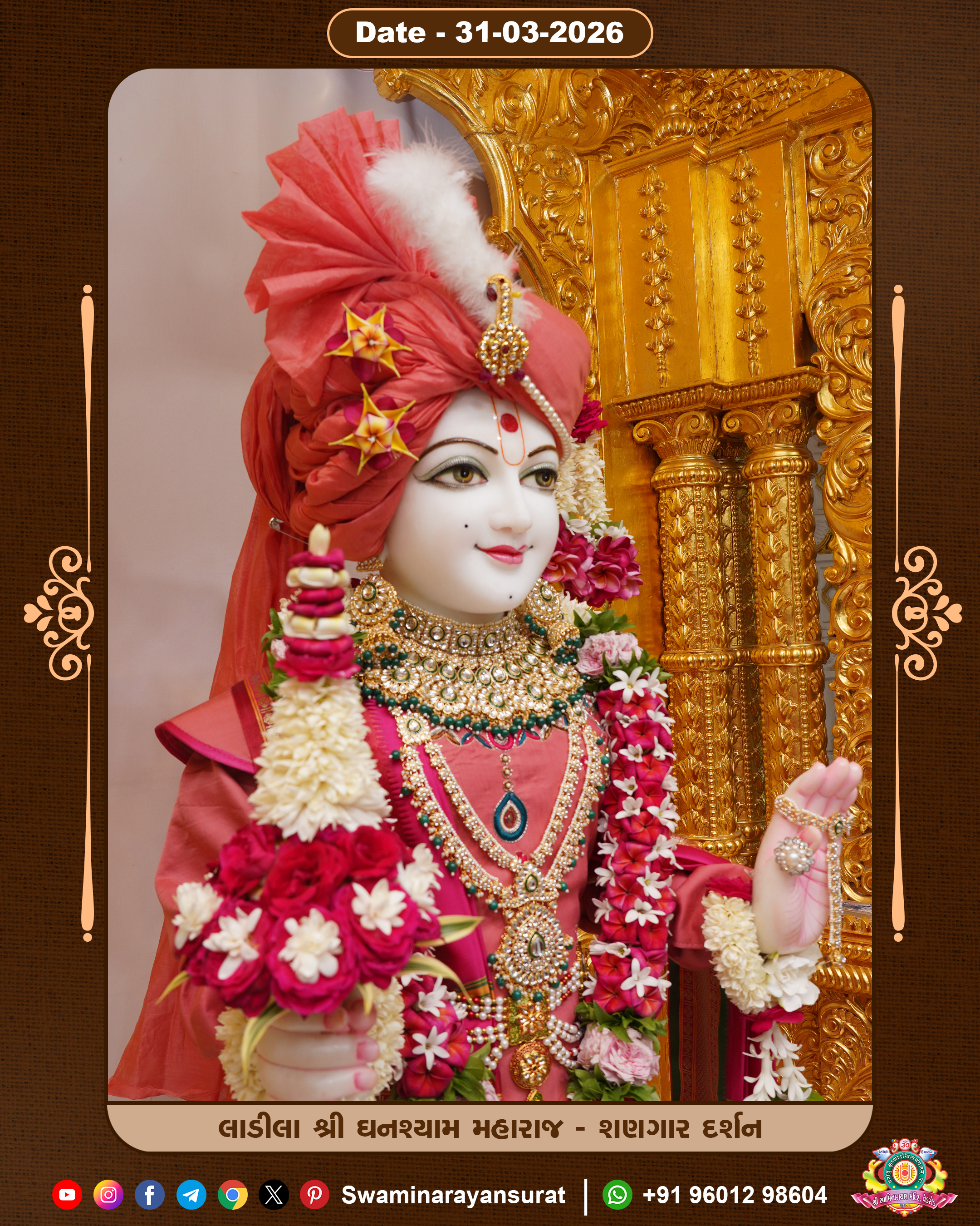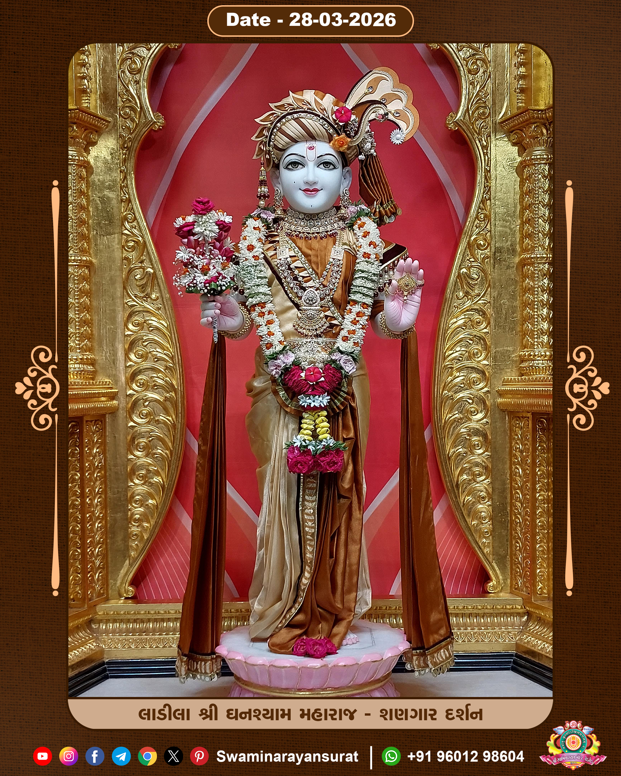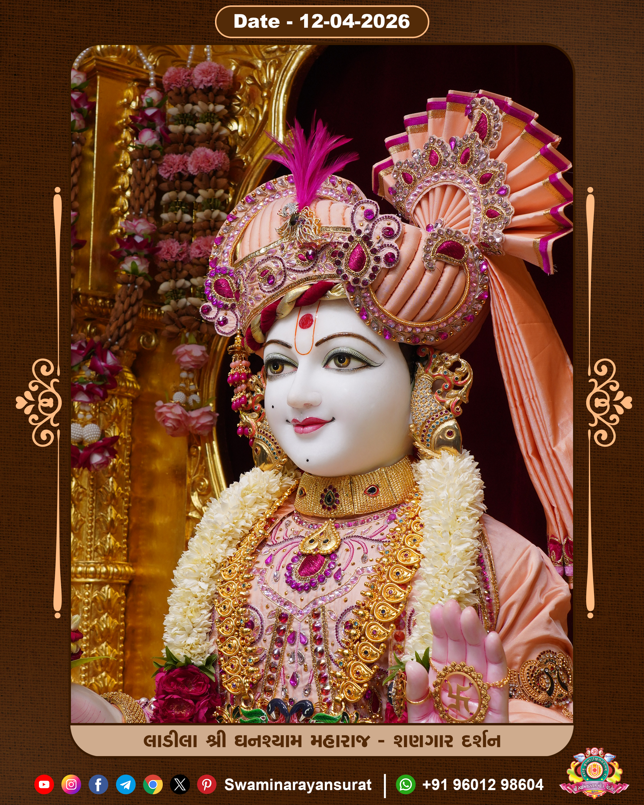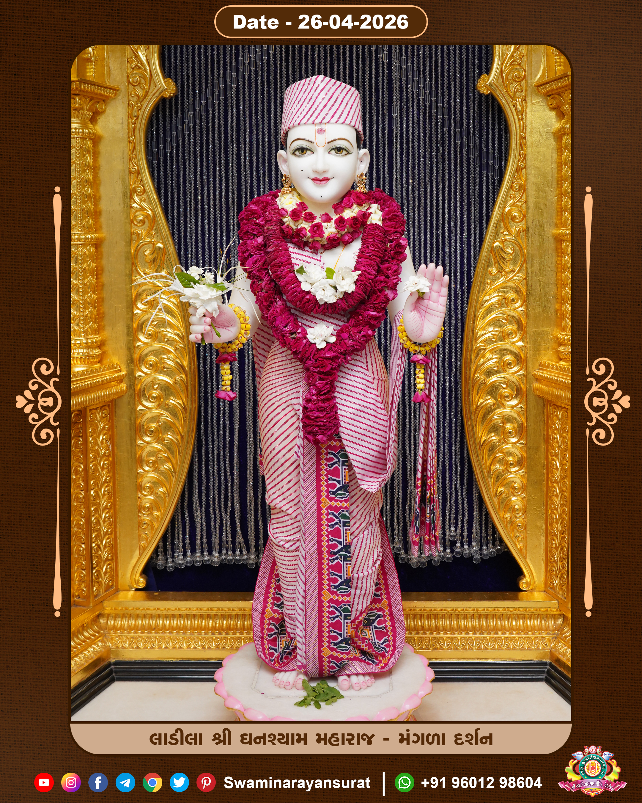 Shree Swaminarayan Temple, VedRoad is a Spiritual Organization Which falls under the region Of Vadtal Temple (The Headquarter Of Laxminarayan Dev Gadi). It is the First Organization Which is Constructed By Pink Stone With Beautiful and Marvellous Carving in Surat Of Swaminarayan Sampraday, Vadtal desh Which is increasing Pride & Prestige of Surat City, This temple contains One Main Shrine under which the idol of Ladila Shree Ghanshyam Maharaj is installed. P. Pu. Sadguru Shree Prabhucharandasji Swami is the Creator of this divine Organization. By the Several Activities & appearance Many devotees feels Easy in difficult Circumstances. He with his approx. 15 Saints & Devotees does Several Social & Spiritual Activities to fulfill the goal of Swaminarayan Sampraday, to do Worship with religious practices.