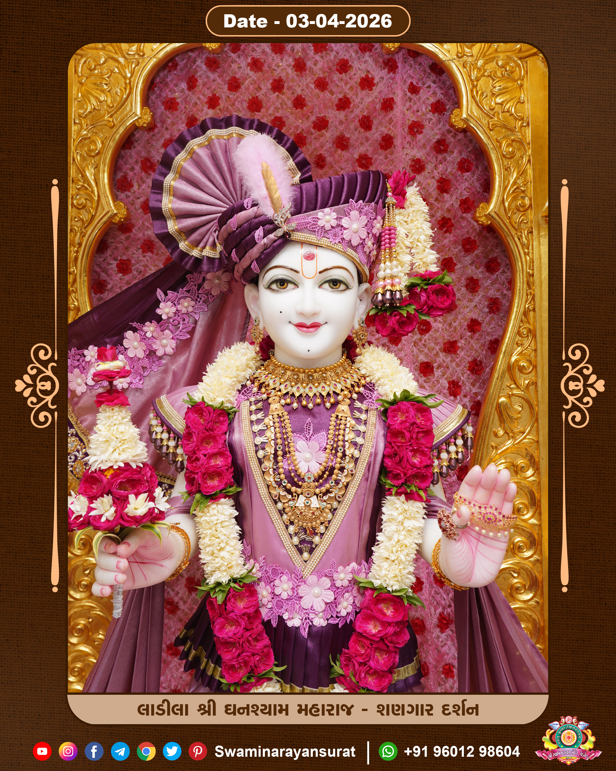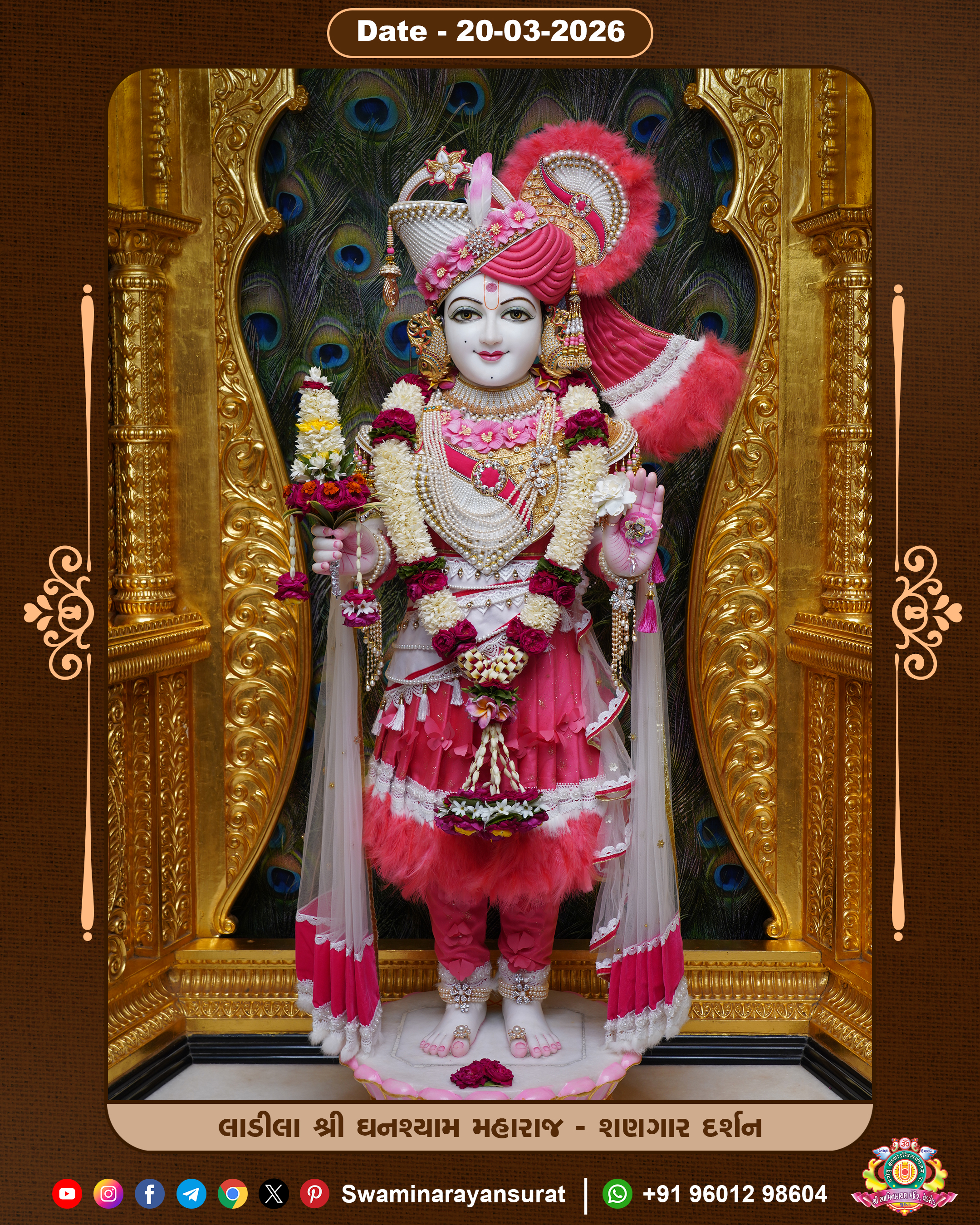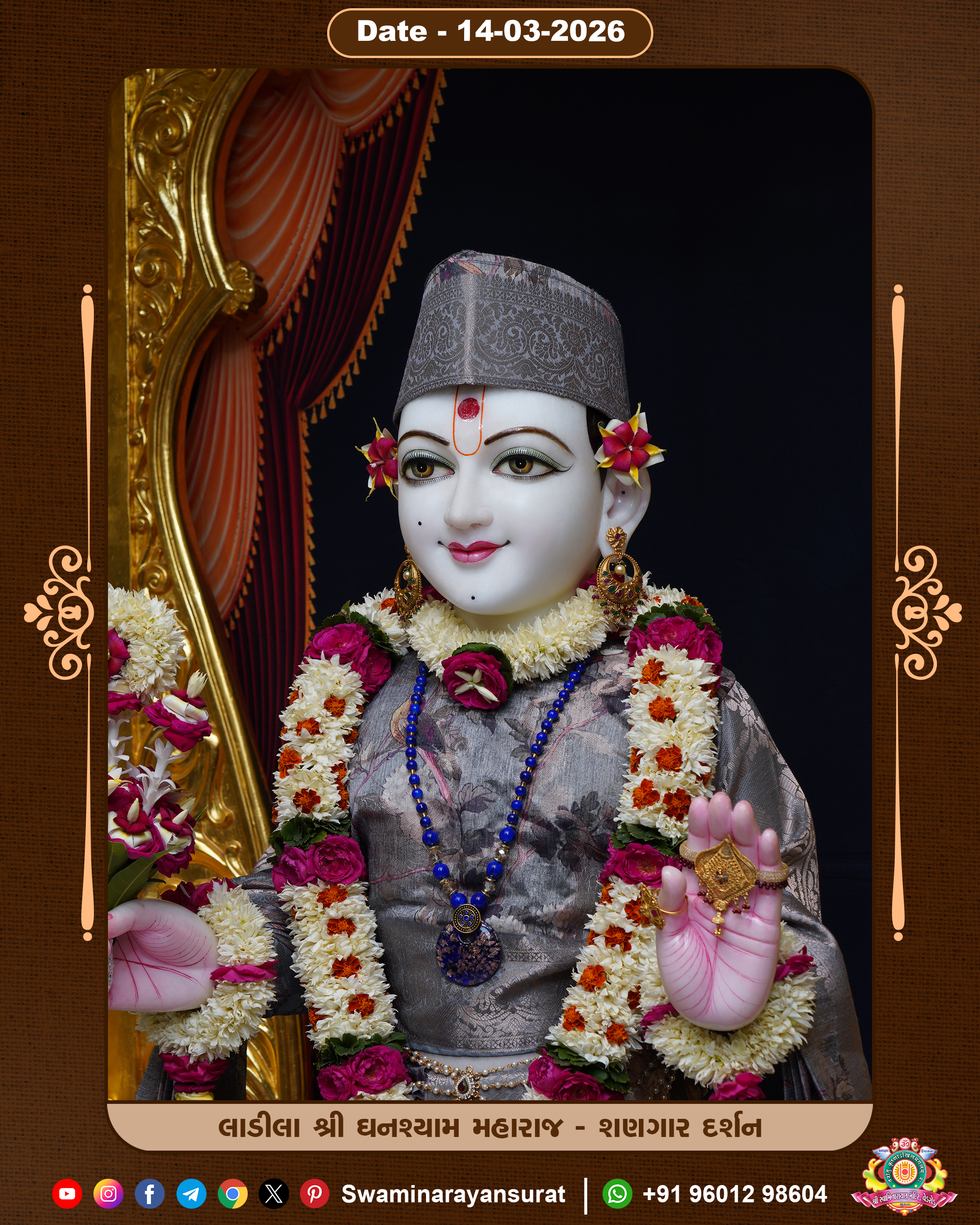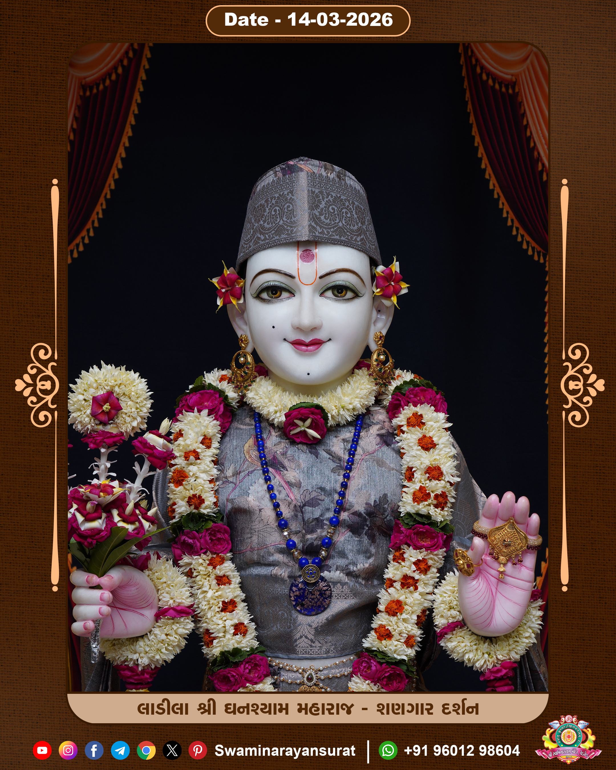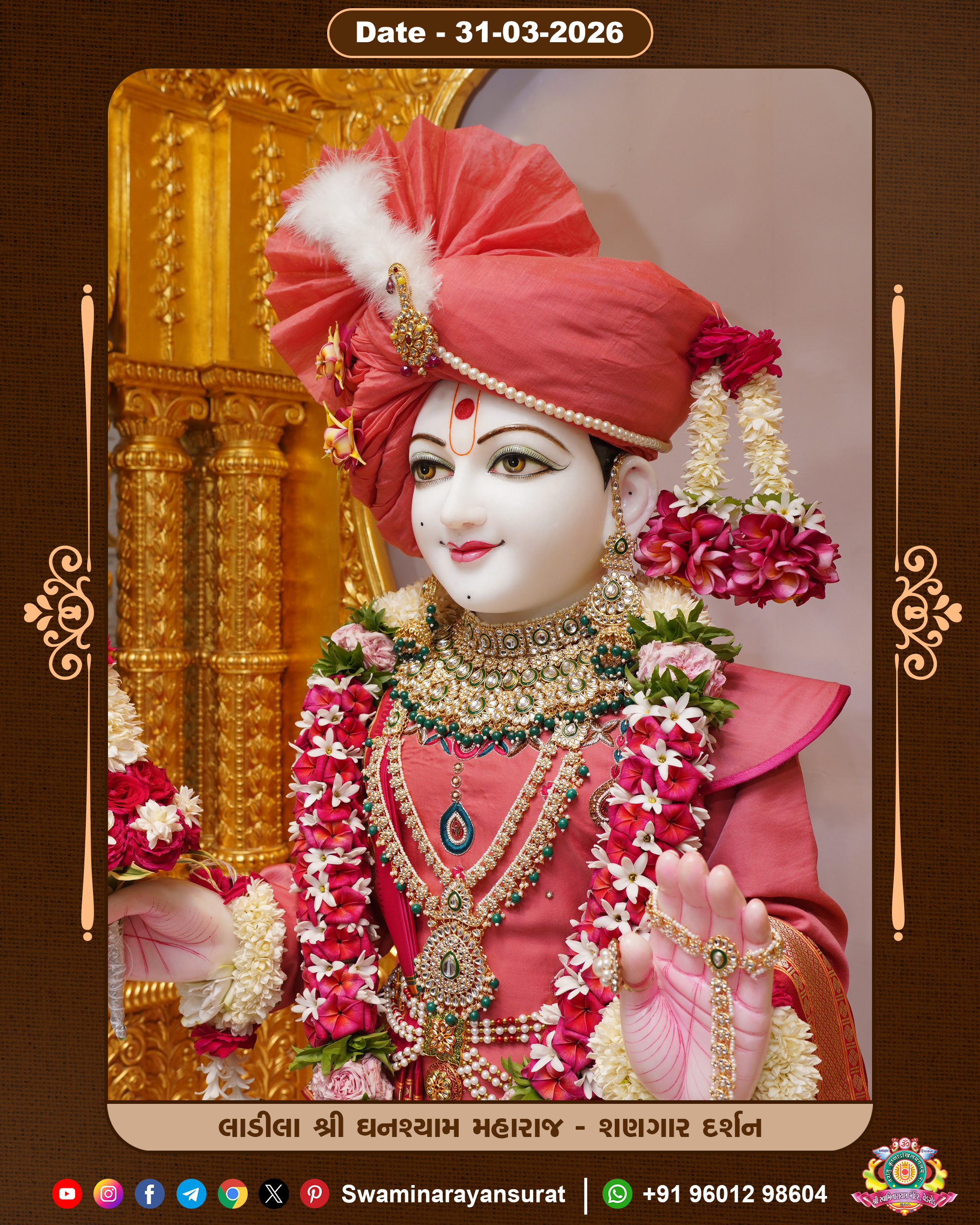 Shree Swaminarayan Temple, VedRoad is a Spiritual Organization Which falls under the region Of Vadtal Temple (The Headquarter Of Laxminarayan Dev Gadi). It is the First Organization Which is Constructed By Pink Stone With Beautiful and Marvellous Carving in Surat Of Swaminarayan Sampraday, Vadtal desh Which is increasing Pride & Prestige of Surat City, This temple contains One Main Shrine under which the idol of Ladila Shree Ghanshyam Maharaj is installed. P. Pu. Sadguru Shree Prabhucharandasji Swami is the Creator of this divine Organization. By the Several Activities & appearance Many devotees feels Easy in difficult Circumstances. He with his approx. 15 Saints & Devotees does Several Social & Spiritual Activities to fulfill the goal of Swaminarayan Sampraday, to do Worship with religious practices.