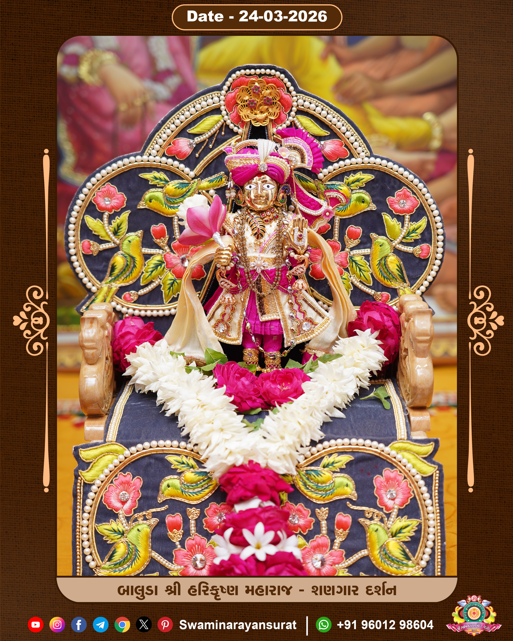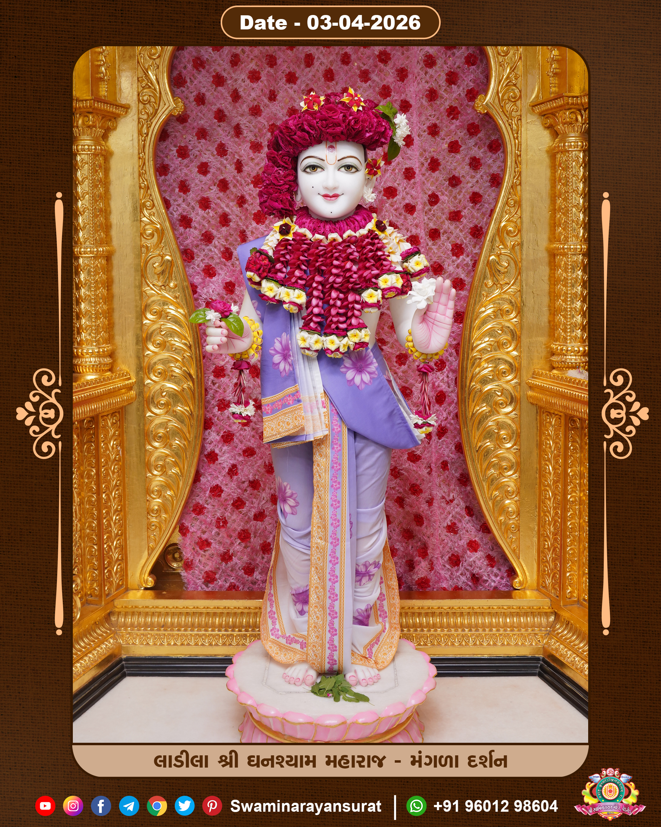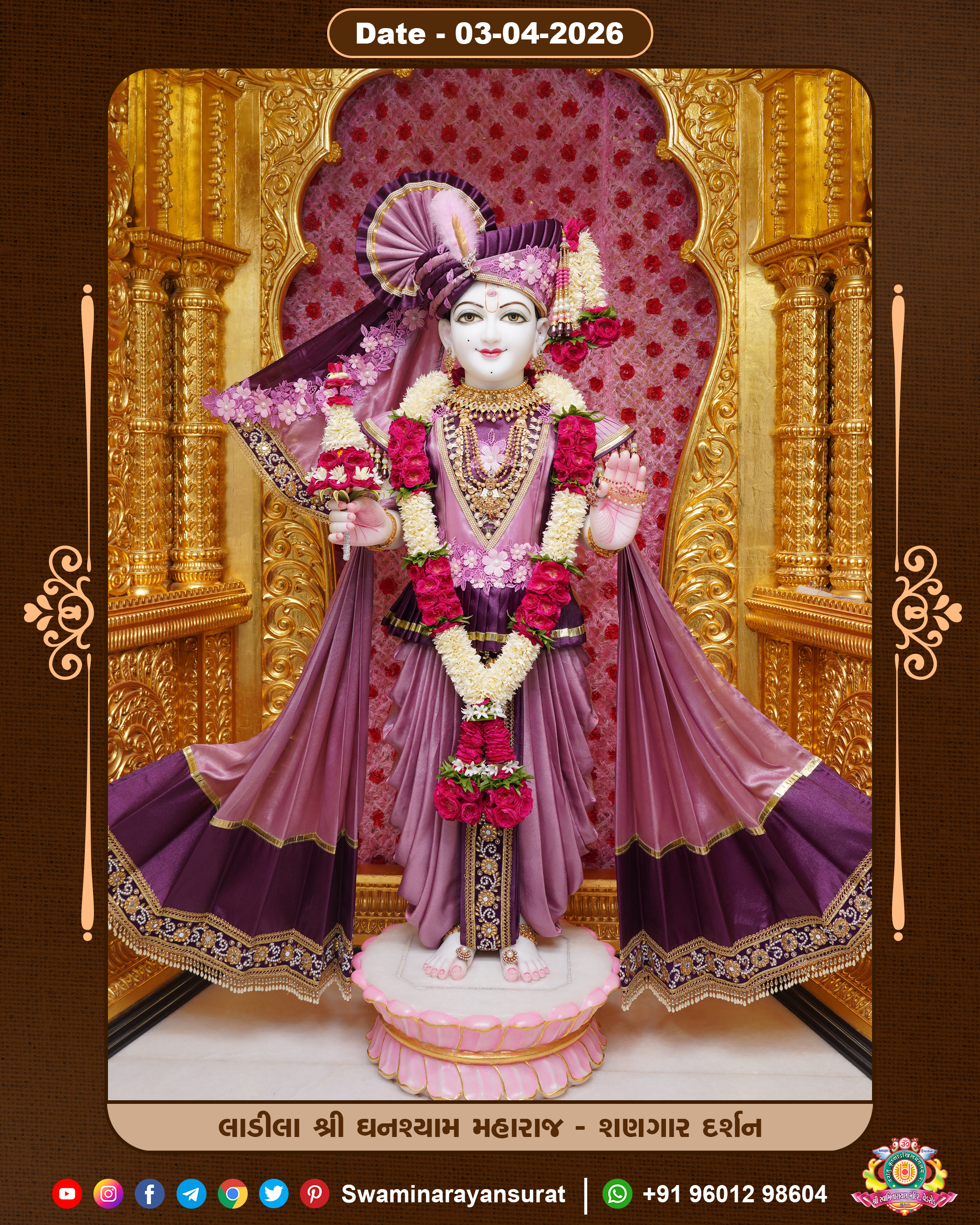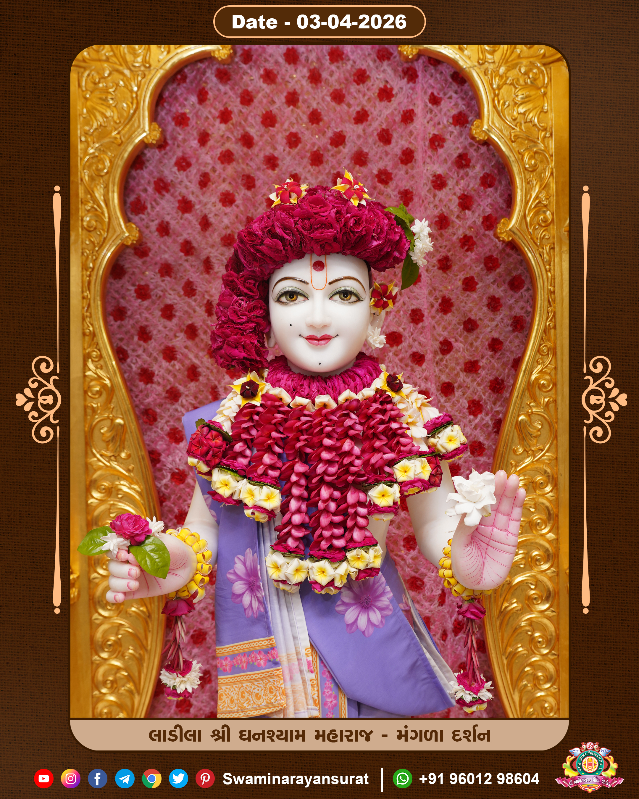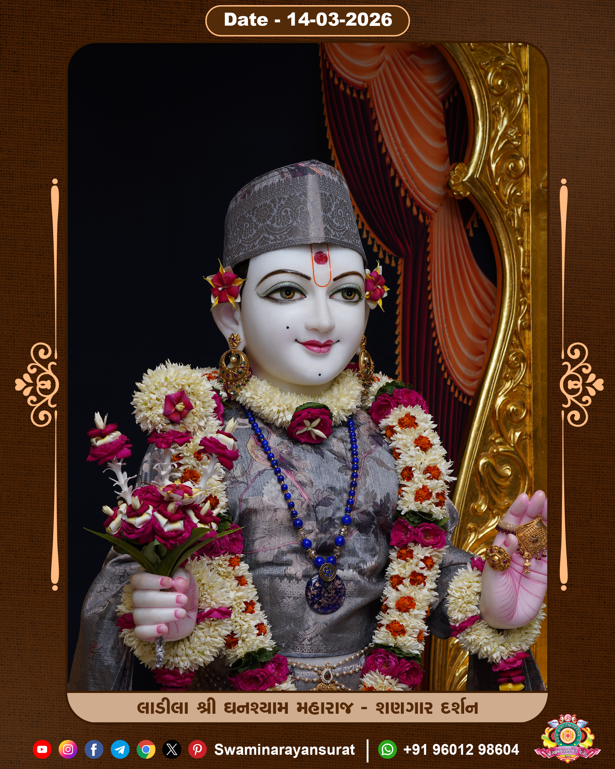 Shree Swaminarayan Temple, VedRoad is a Spiritual Organization Which falls under the region Of Vadtal Temple (The Headquarter Of Laxminarayan Dev Gadi). It is the First Organization Which is Constructed By Pink Stone With Beautiful and Marvellous Carving in Surat Of Swaminarayan Sampraday, Vadtal desh Which is increasing Pride & Prestige of Surat City, This temple contains One Main Shrine under which the idol of Ladila Shree Ghanshyam Maharaj is installed. P. Pu. Sadguru Shree Prabhucharandasji Swami is the Creator of this divine Organization. By the Several Activities & appearance Many devotees feels Easy in difficult Circumstances. He with his approx. 15 Saints & Devotees does Several Social & Spiritual Activities to fulfill the goal of Swaminarayan Sampraday, to do Worship with religious practices.