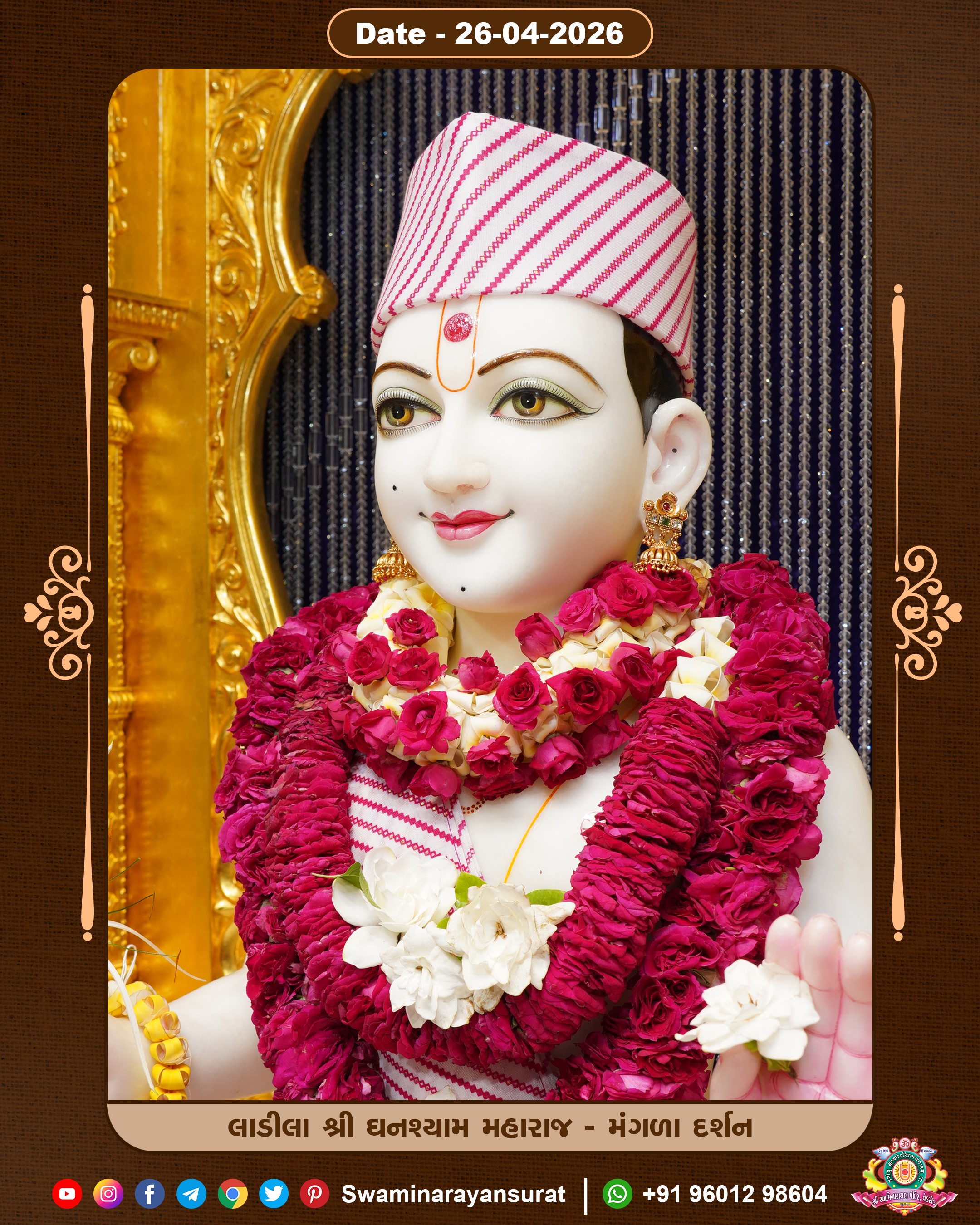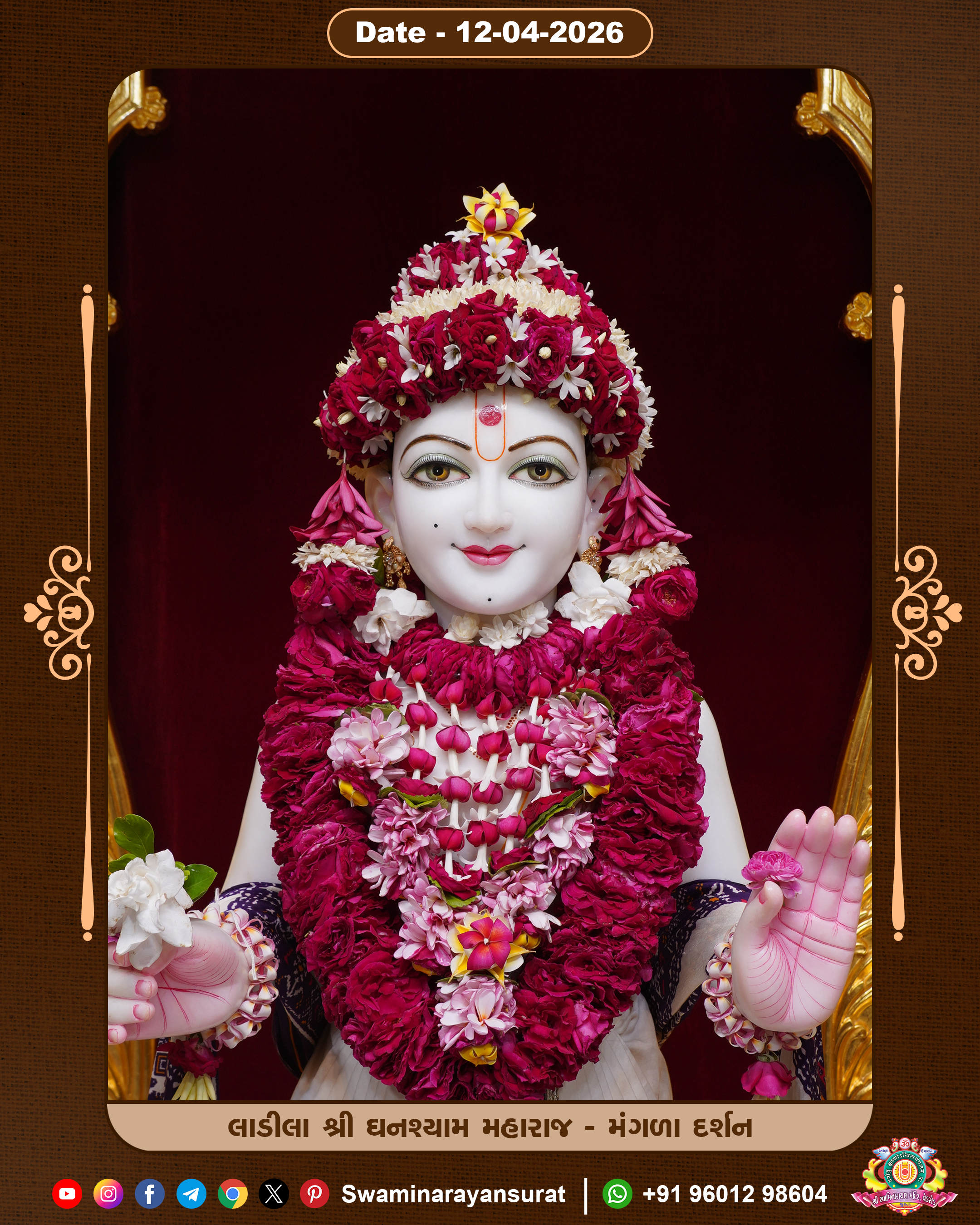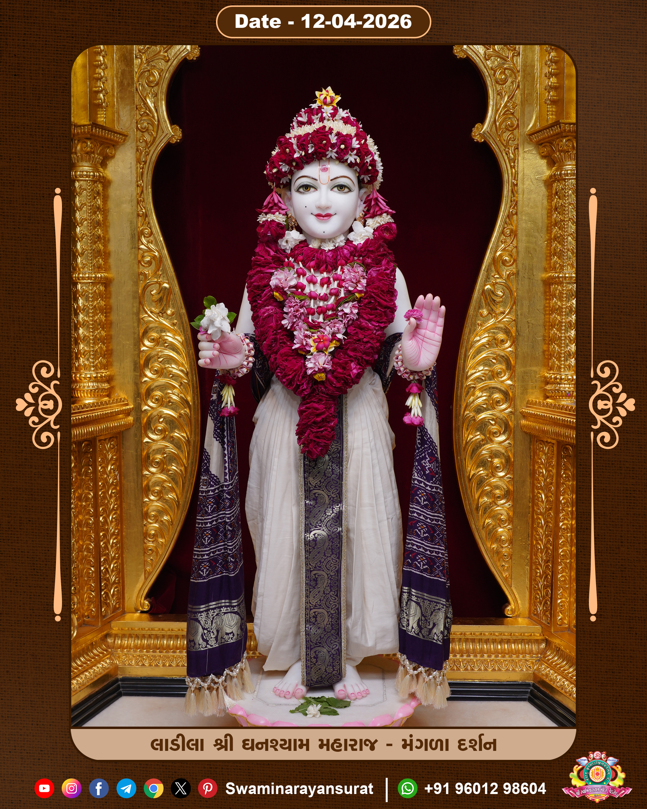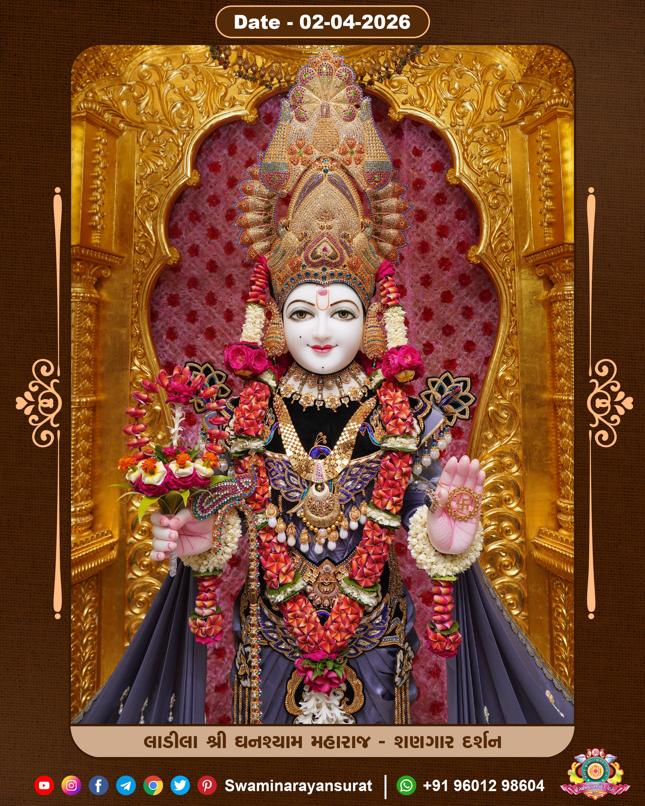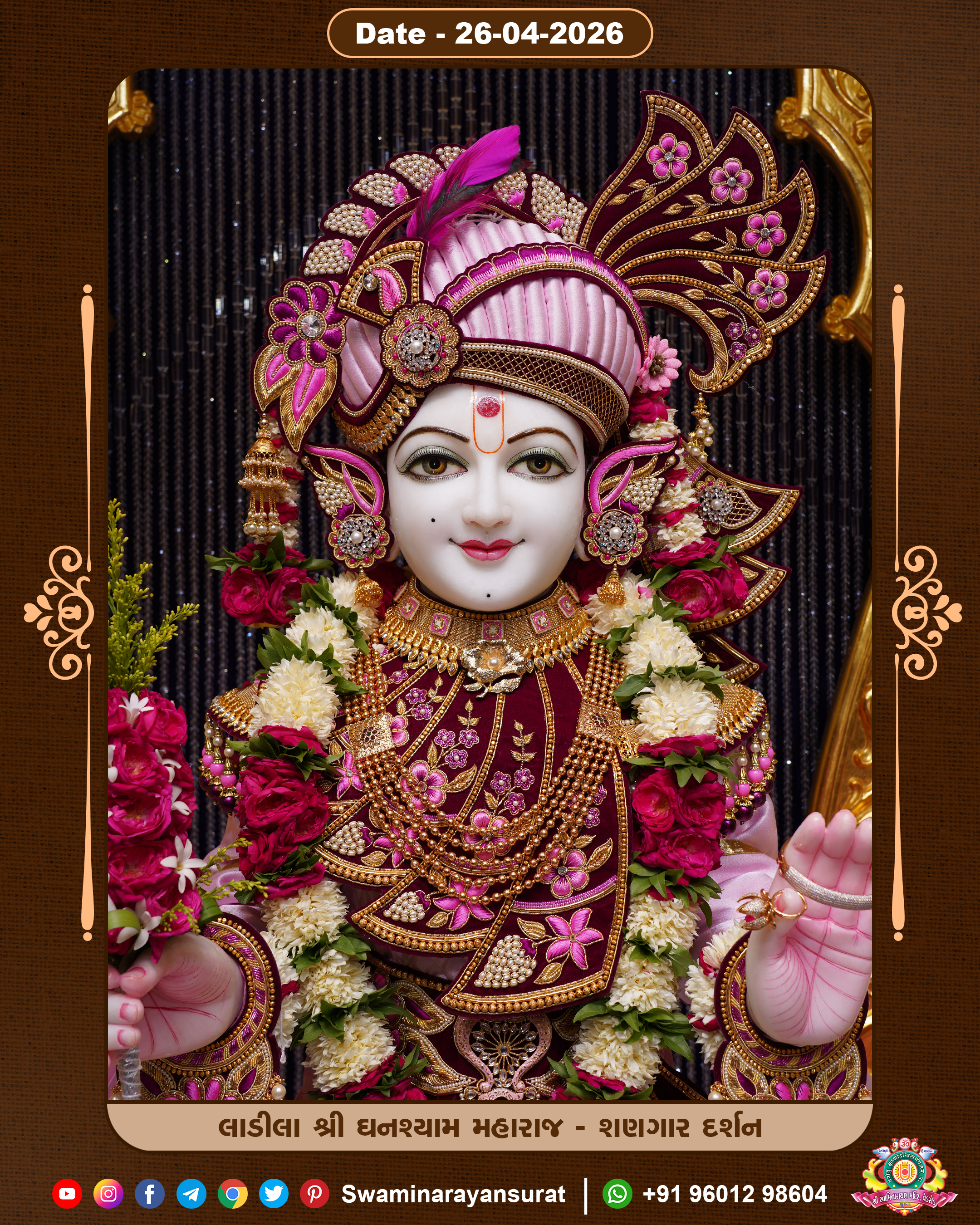 Shree Swaminarayan Temple, VedRoad is a Spiritual Organization Which falls under the region Of Vadtal Temple (The Headquarter Of Laxminarayan Dev Gadi). It is the First Organization Which is Constructed By Pink Stone With Beautiful and Marvellous Carving in Surat Of Swaminarayan Sampraday, Vadtal desh Which is increasing Pride & Prestige of Surat City, This temple contains One Main Shrine under which the idol of Ladila Shree Ghanshyam Maharaj is installed. P. Pu. Sadguru Shree Prabhucharandasji Swami is the Creator of this divine Organization. By the Several Activities & appearance Many devotees feels Easy in difficult Circumstances. He with his approx. 15 Saints & Devotees does Several Social & Spiritual Activities to fulfill the goal of Swaminarayan Sampraday, to do Worship with religious practices.