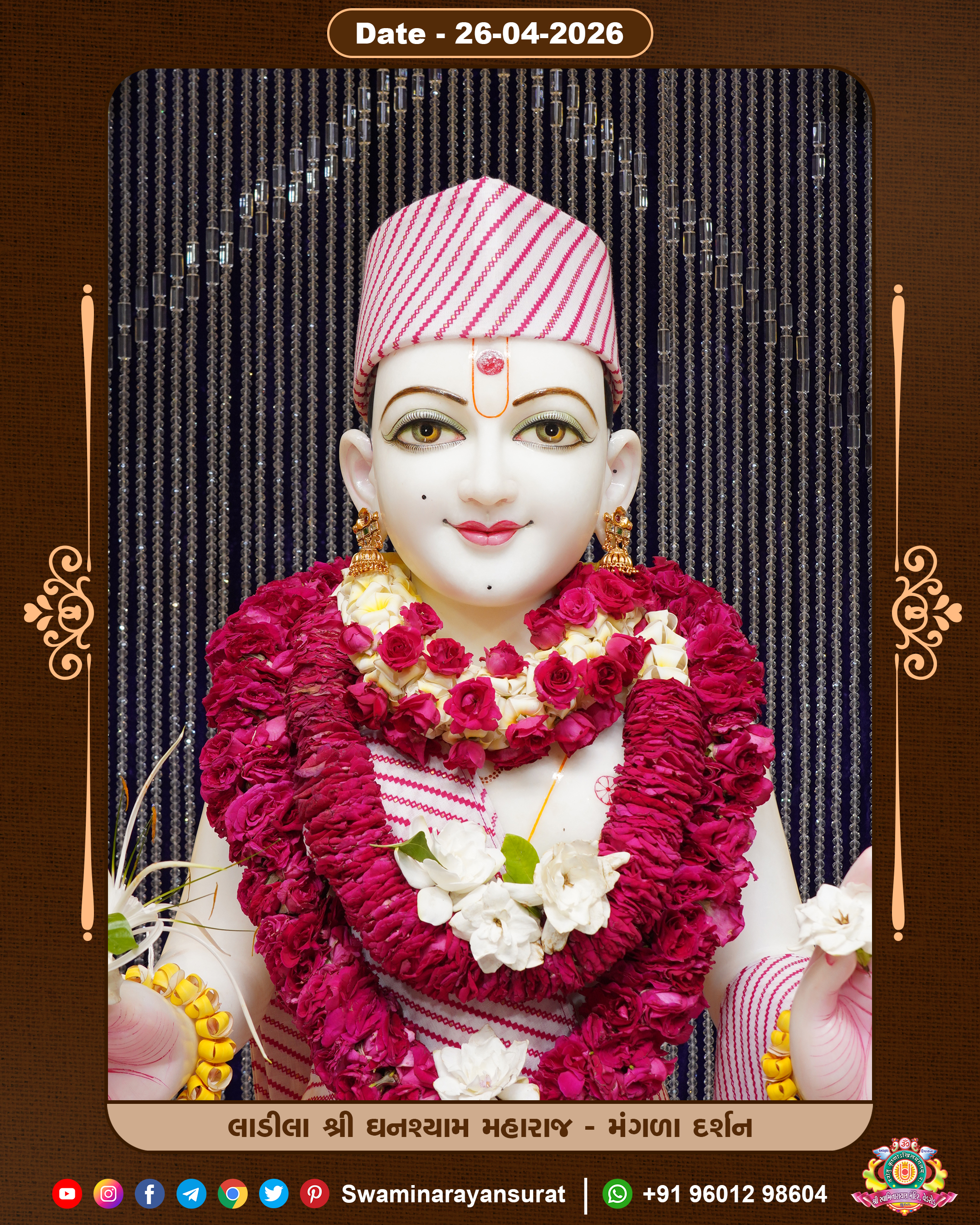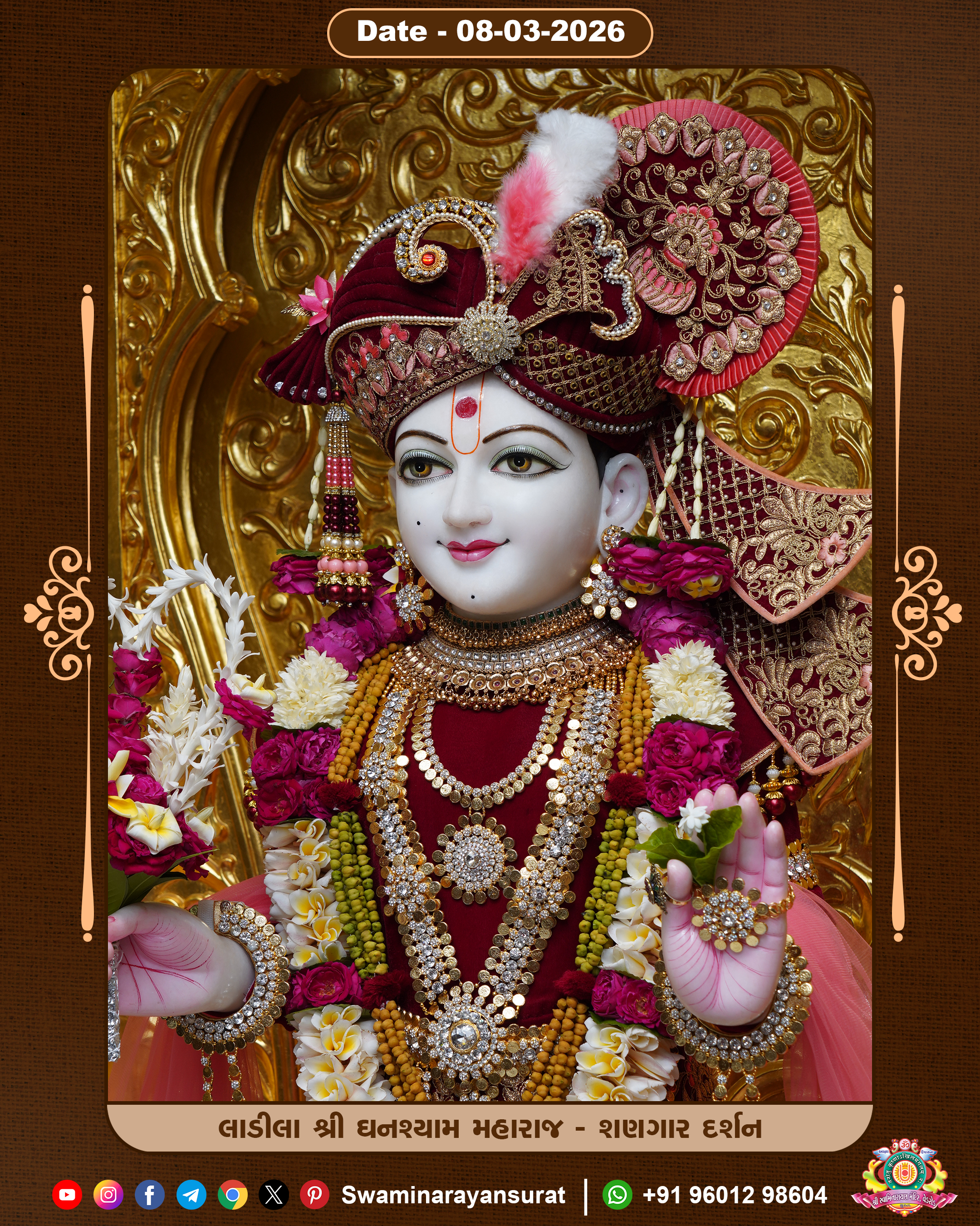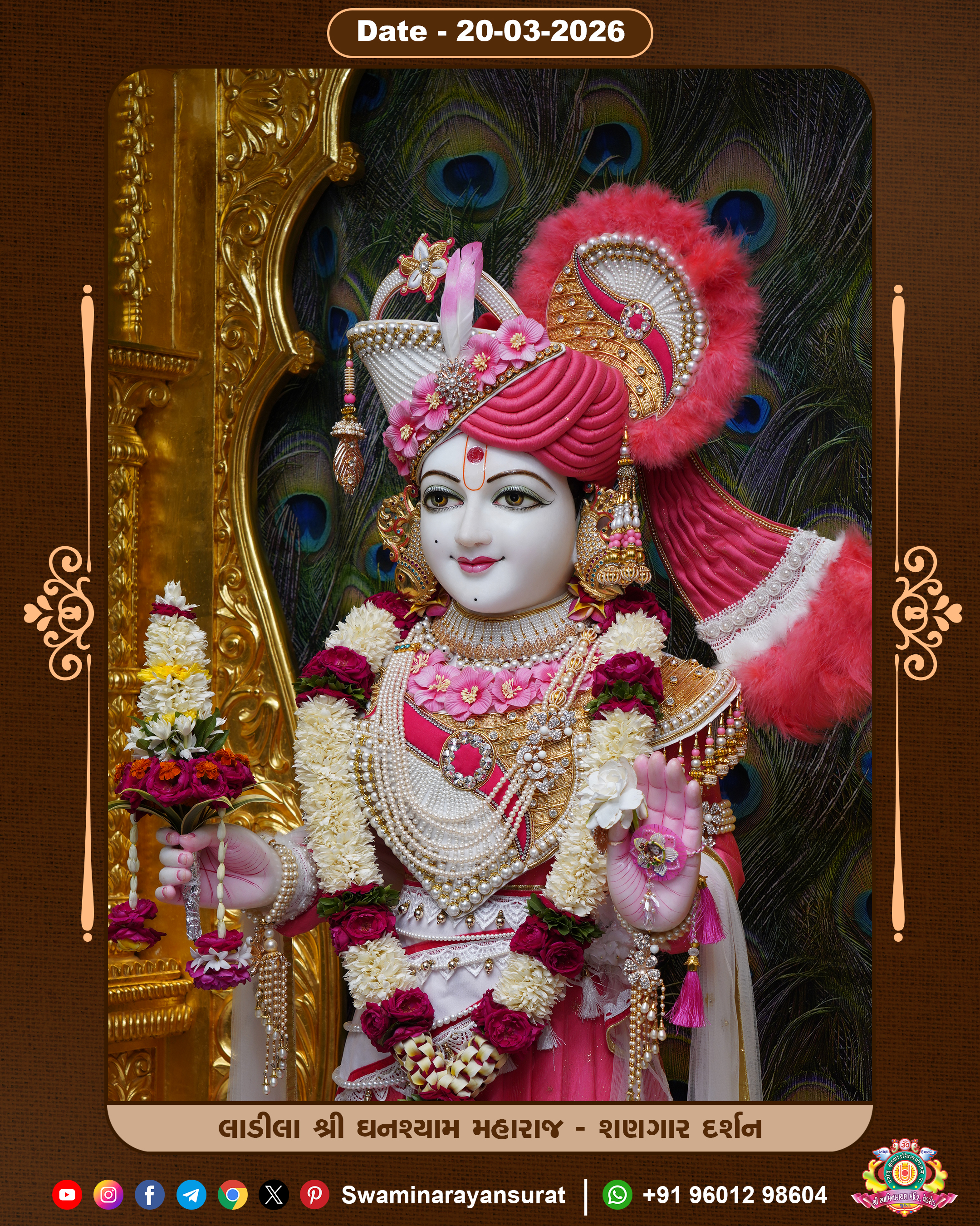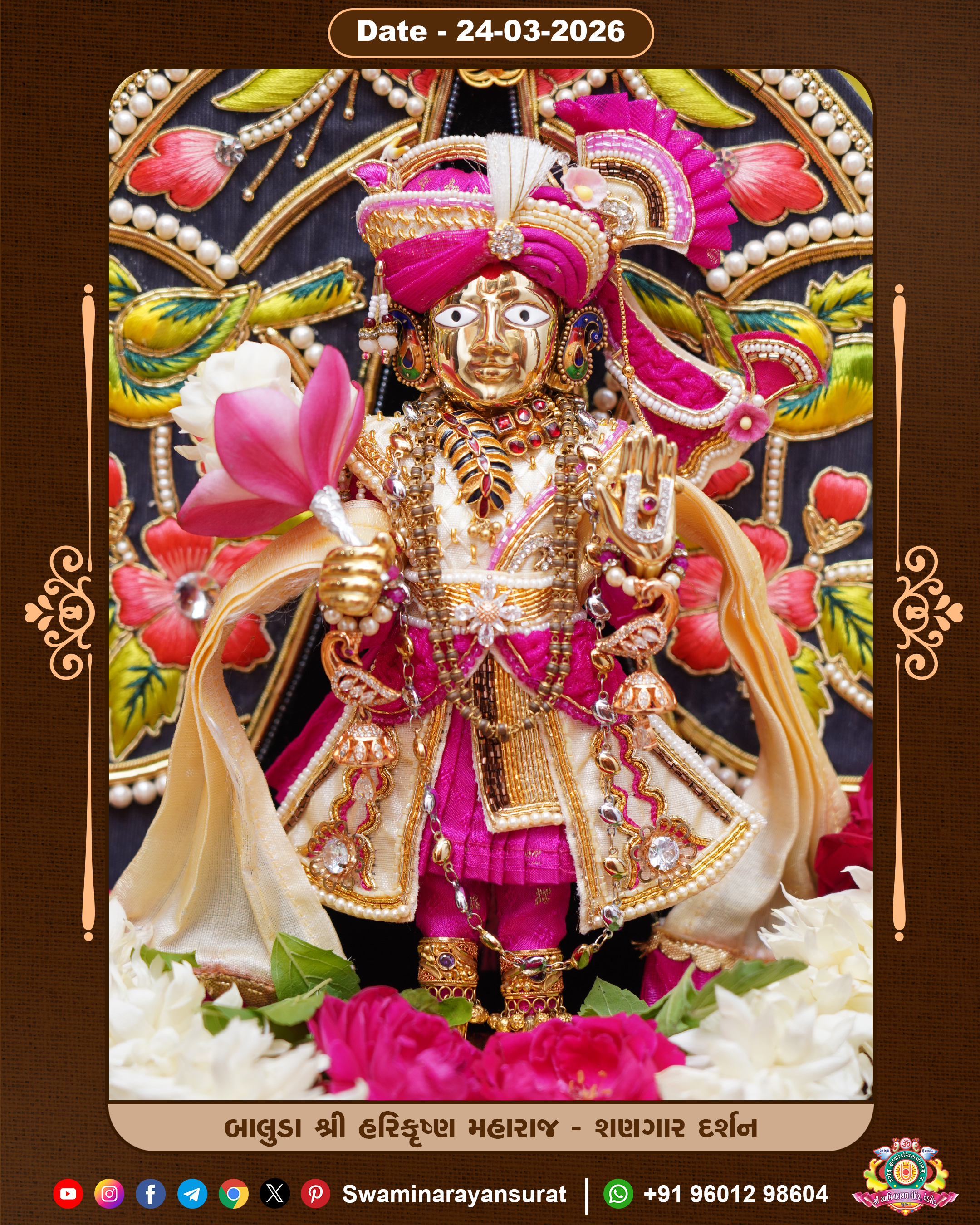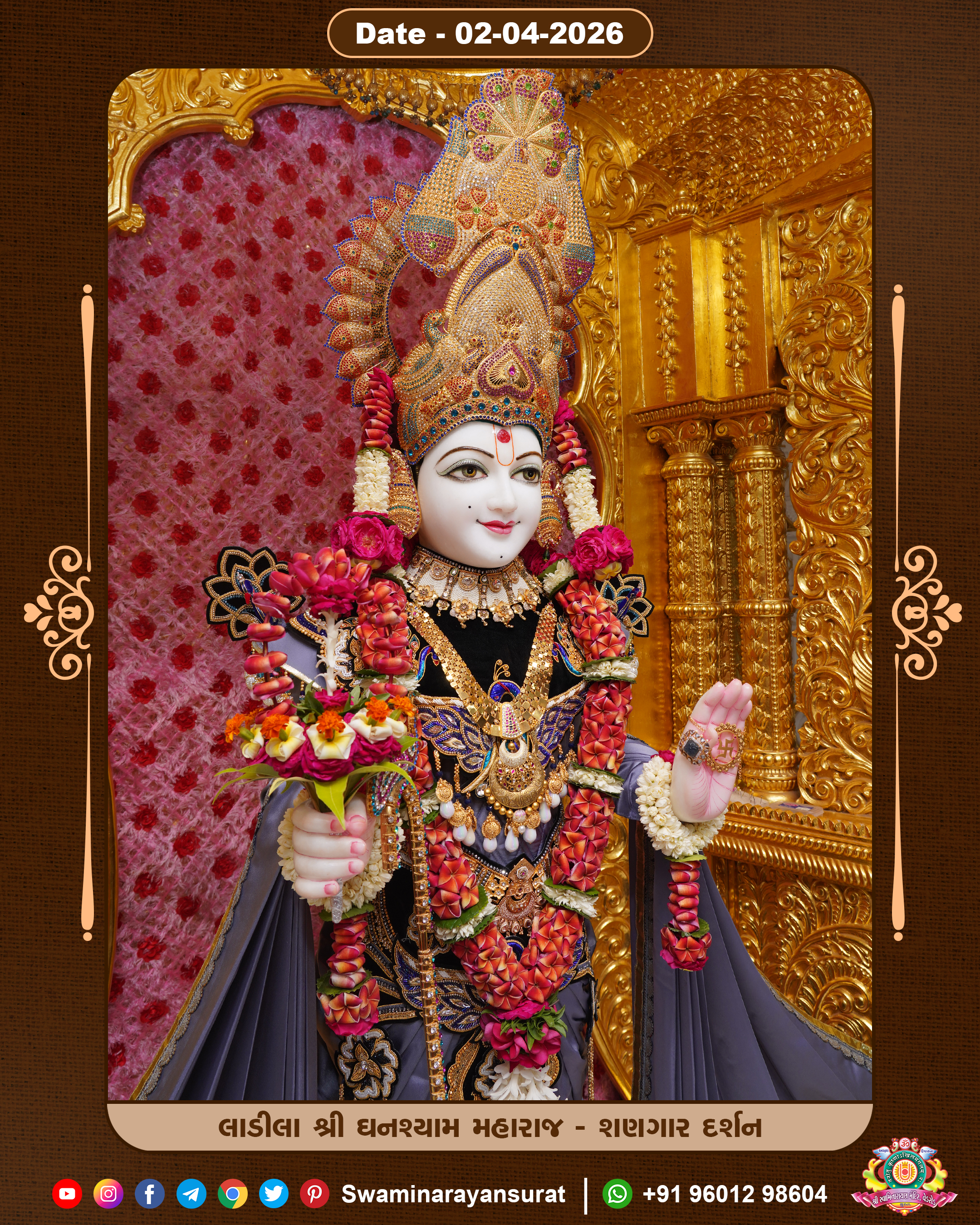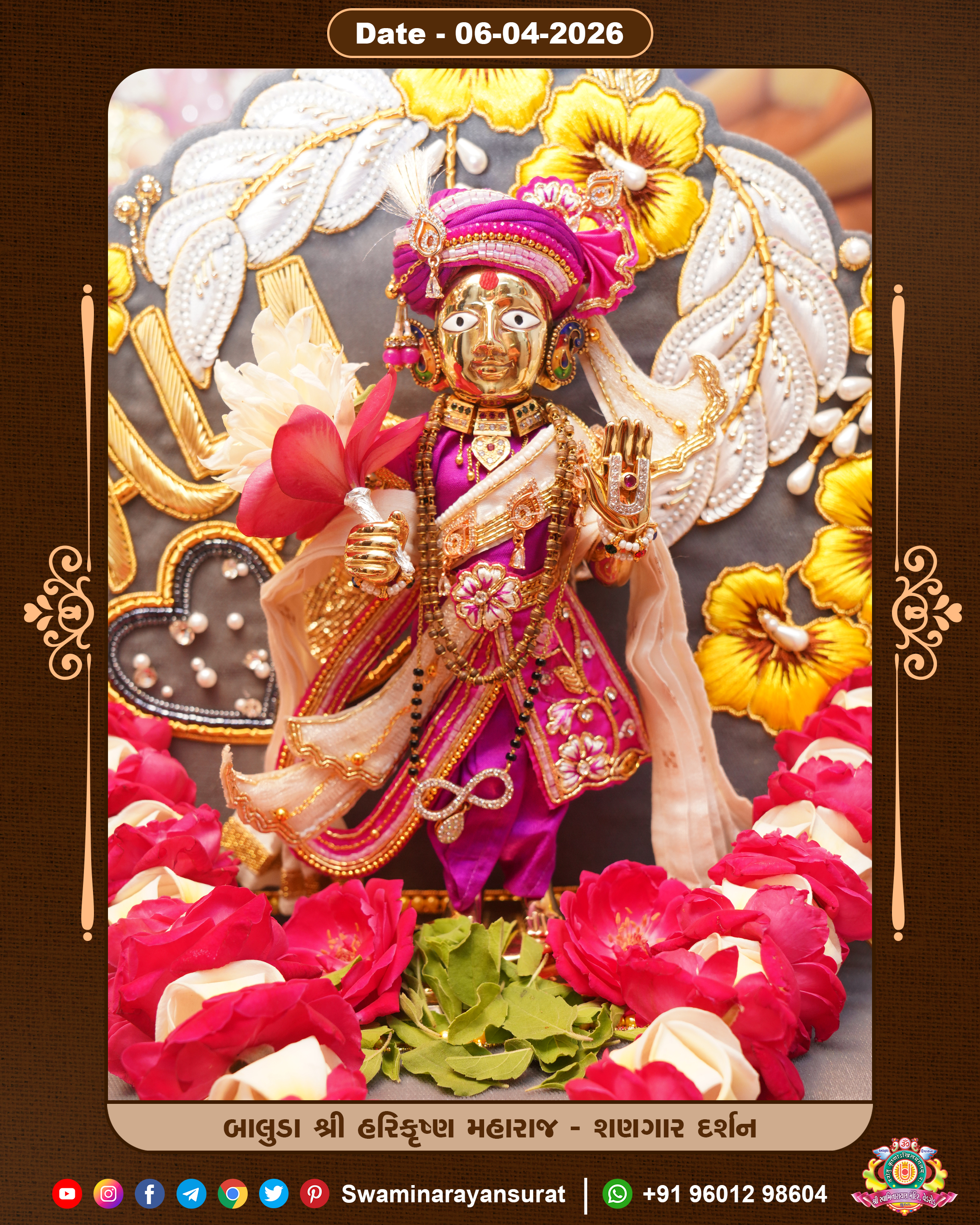 Shree Swaminarayan Temple, VedRoad is a Spiritual Organization Which falls under the region Of Vadtal Temple (The Headquarter Of Laxminarayan Dev Gadi). It is the First Organization Which is Constructed By Pink Stone With Beautiful and Marvellous Carving in Surat Of Swaminarayan Sampraday, Vadtal desh Which is increasing Pride & Prestige of Surat City, This temple contains One Main Shrine under which the idol of Ladila Shree Ghanshyam Maharaj is installed. P. Pu. Sadguru Shree Prabhucharandasji Swami is the Creator of this divine Organization. By the Several Activities & appearance Many devotees feels Easy in difficult Circumstances. He with his approx. 15 Saints & Devotees does Several Social & Spiritual Activities to fulfill the goal of Swaminarayan Sampraday, to do Worship with religious practices.