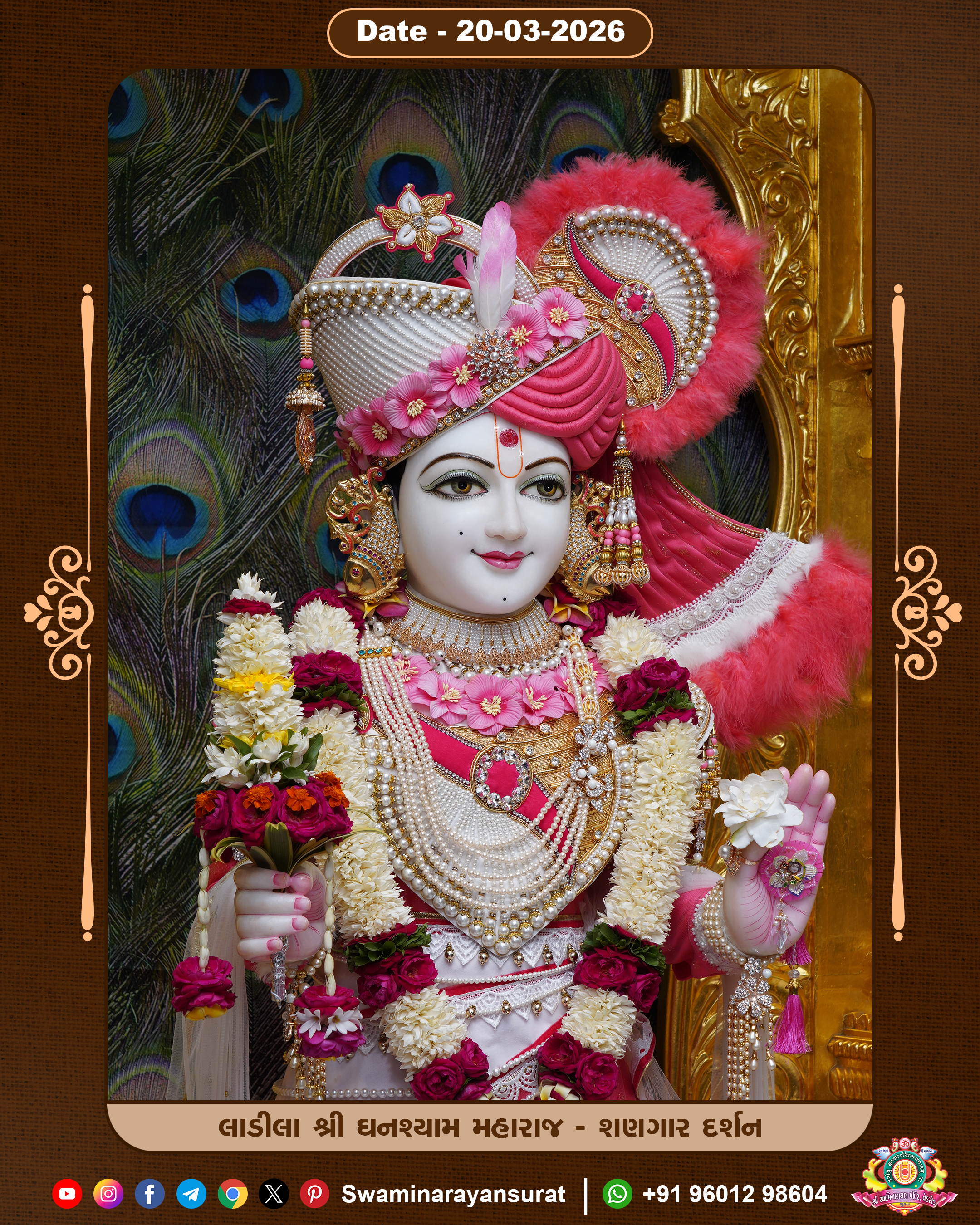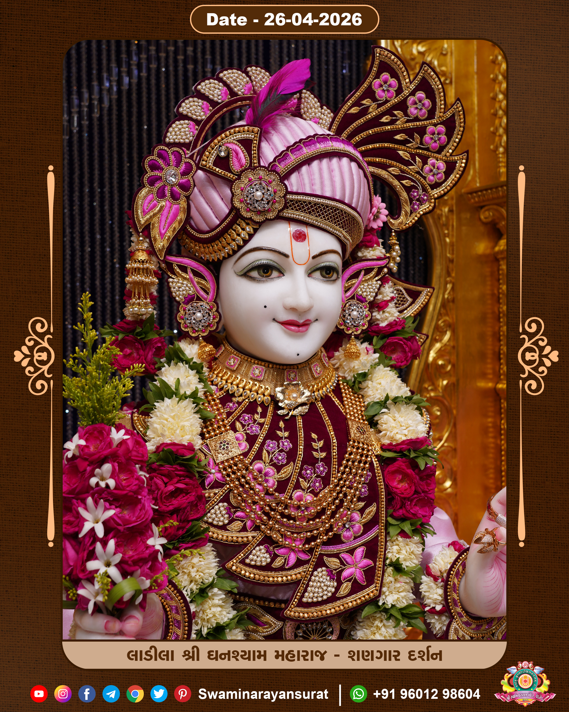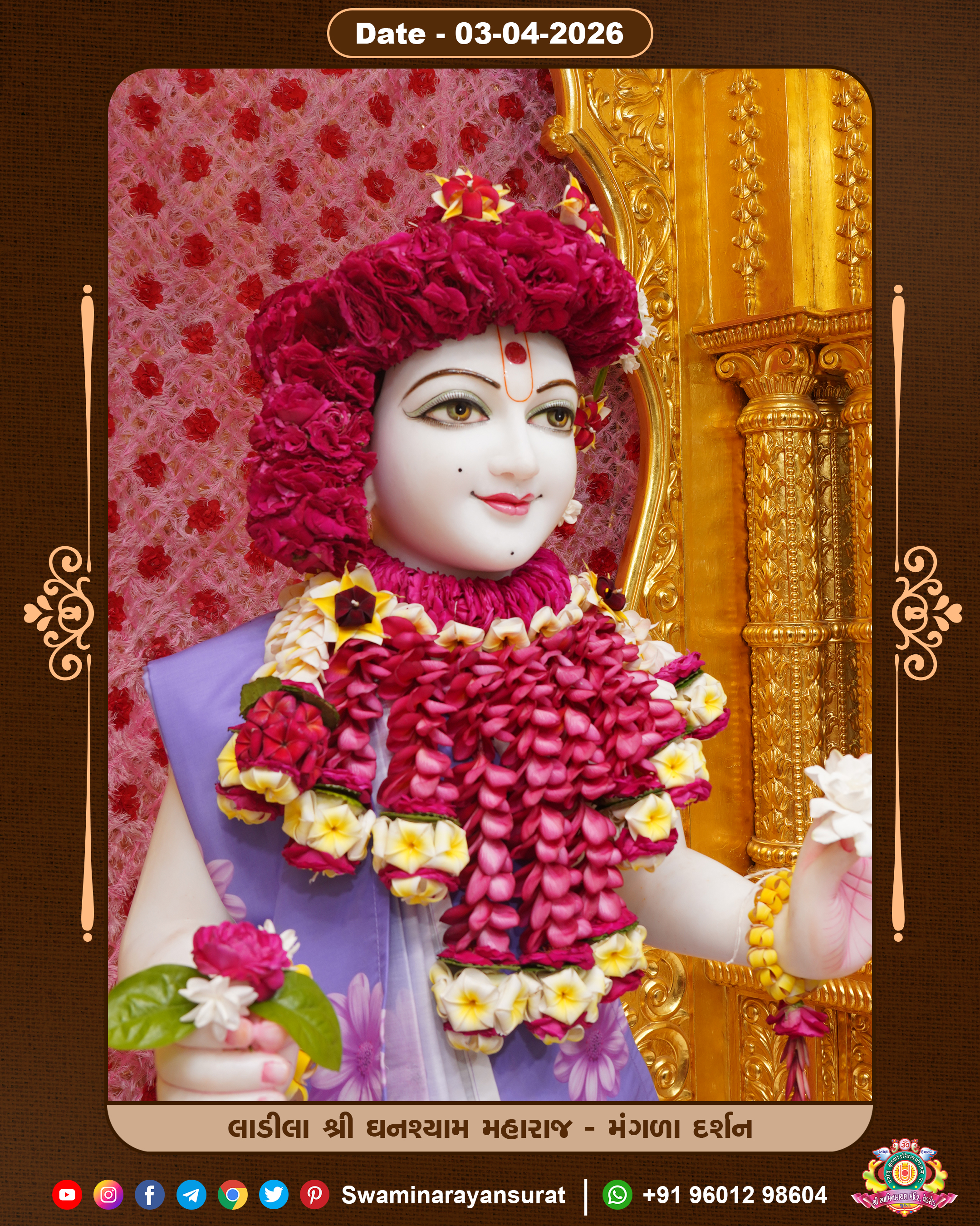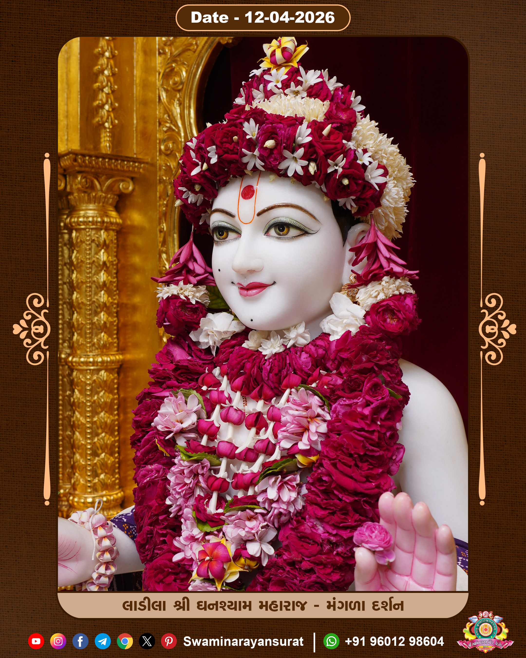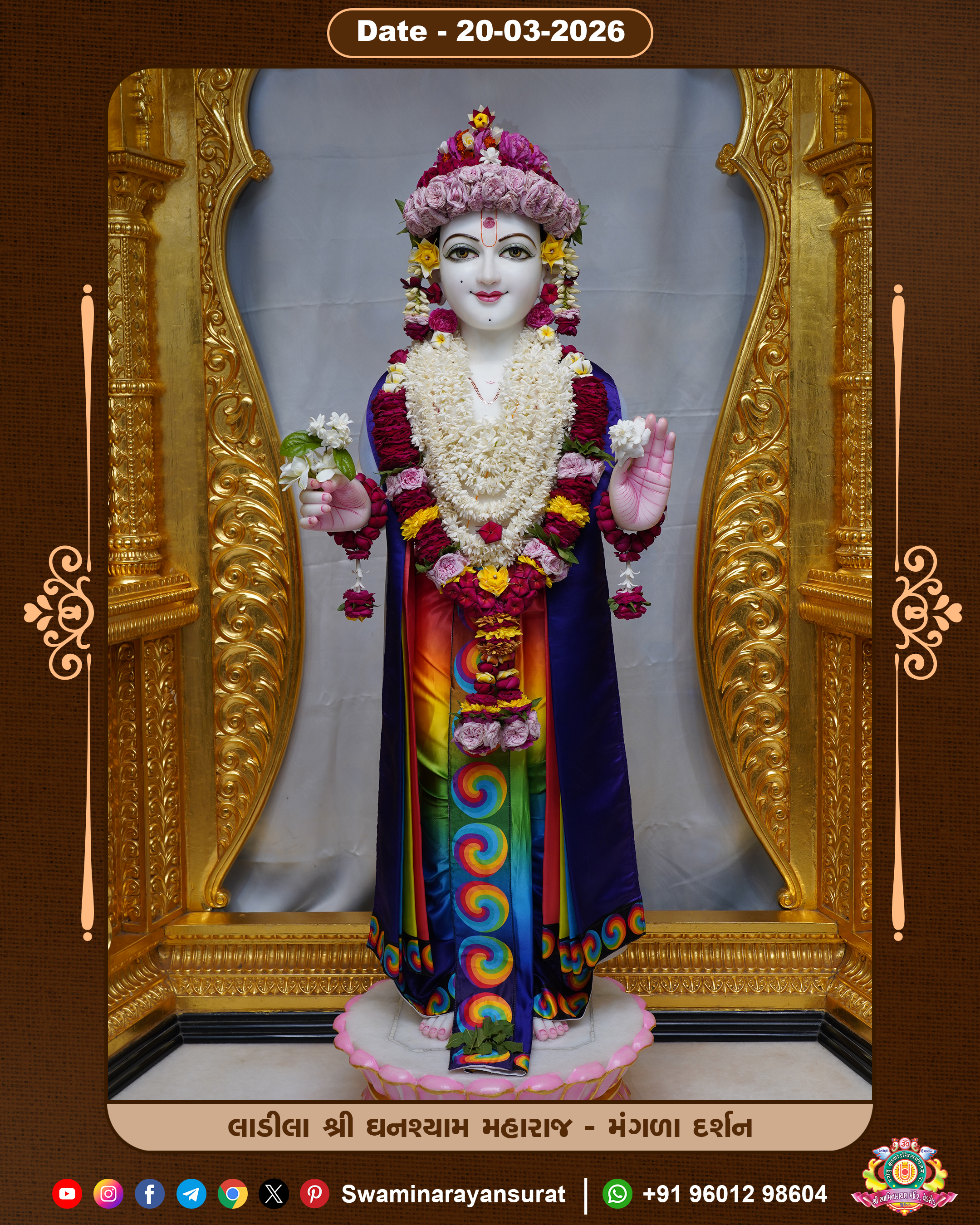 Shree Swaminarayan Temple, VedRoad is a Spiritual Organization Which falls under the region Of Vadtal Temple (The Headquarter Of Laxminarayan Dev Gadi). It is the First Organization Which is Constructed By Pink Stone With Beautiful and Marvellous Carving in Surat Of Swaminarayan Sampraday, Vadtal desh Which is increasing Pride & Prestige of Surat City, This temple contains One Main Shrine under which the idol of Ladila Shree Ghanshyam Maharaj is installed. P. Pu. Sadguru Shree Prabhucharandasji Swami is the Creator of this divine Organization. By the Several Activities & appearance Many devotees feels Easy in difficult Circumstances. He with his approx. 15 Saints & Devotees does Several Social & Spiritual Activities to fulfill the goal of Swaminarayan Sampraday, to do Worship with religious practices.