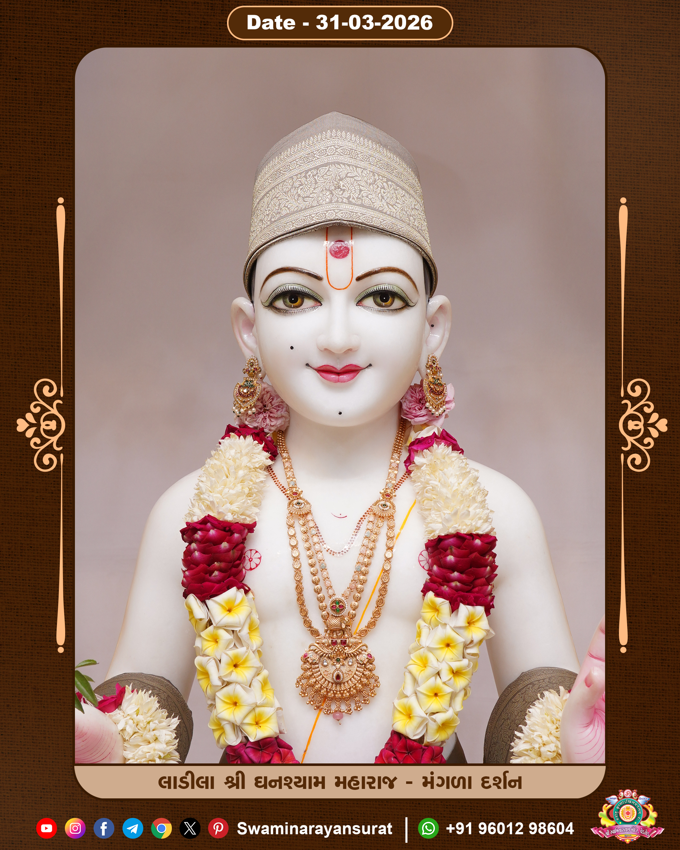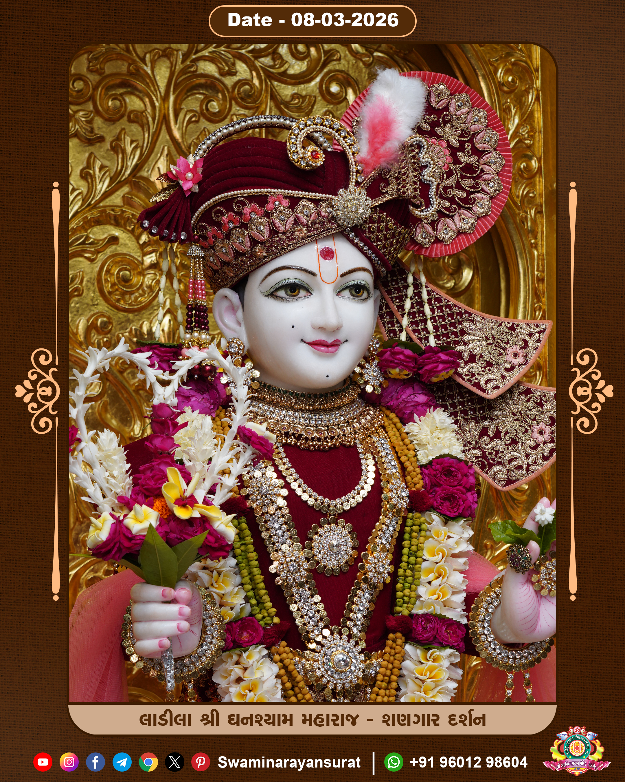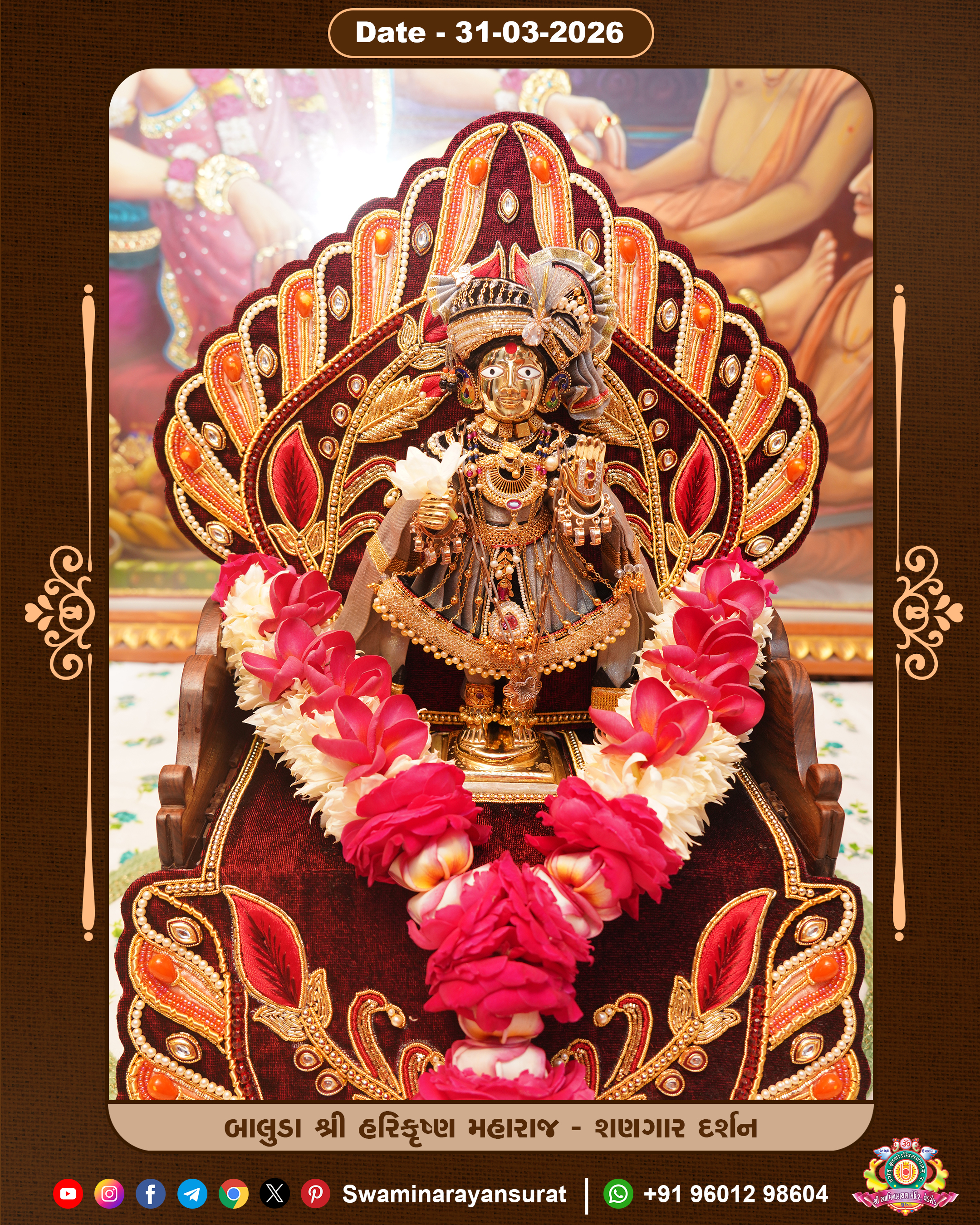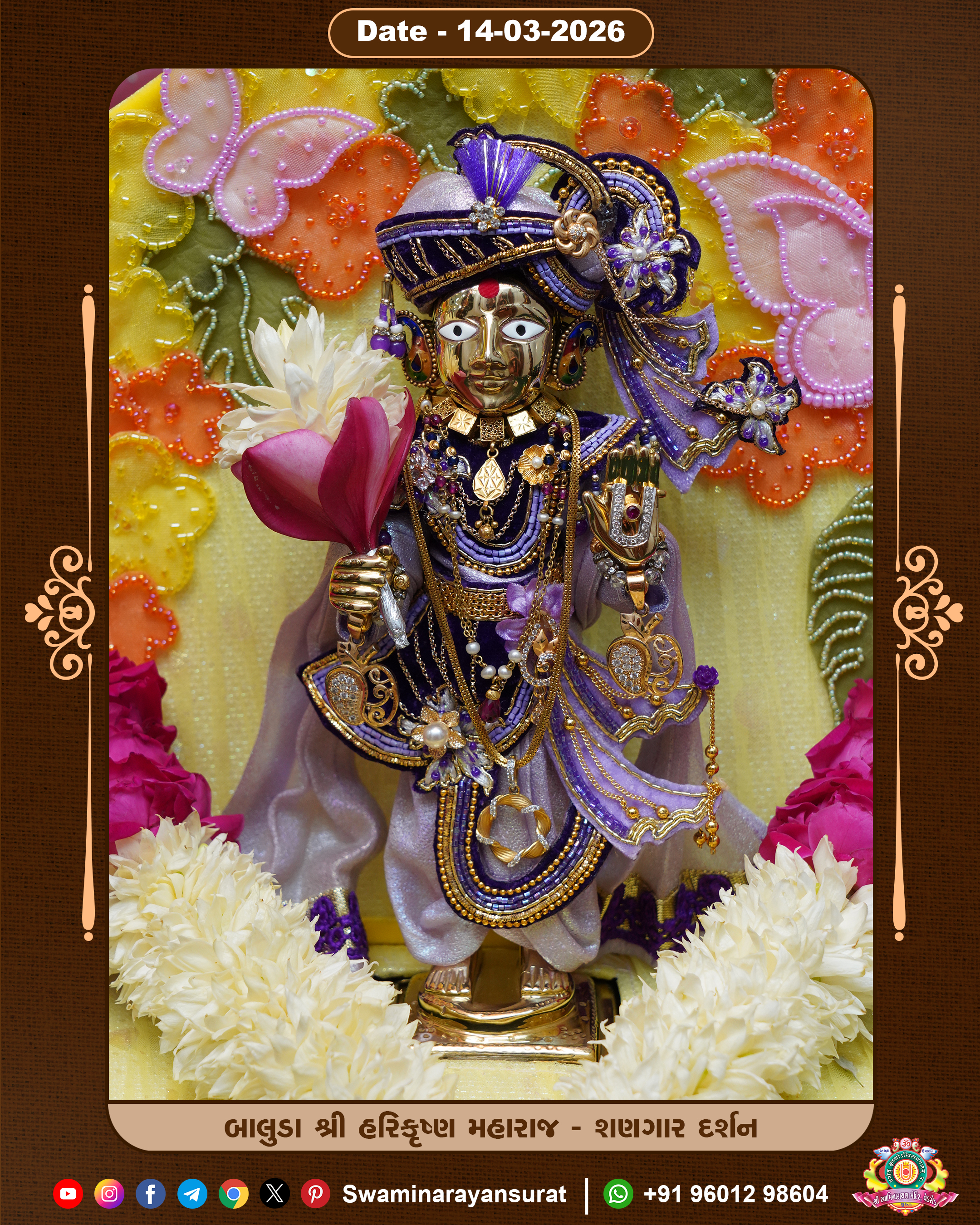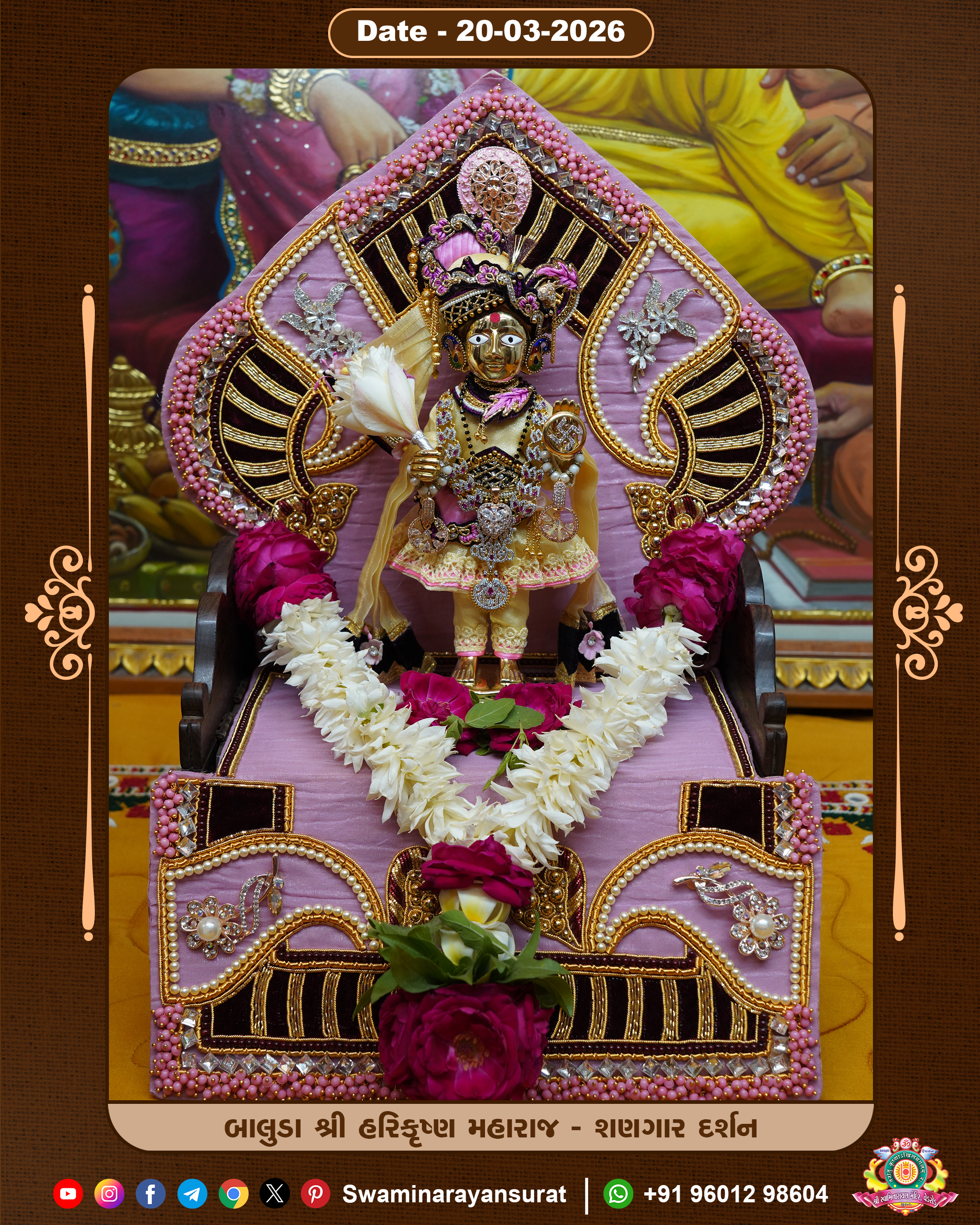 Shree Swaminarayan Temple, VedRoad is a Spiritual Organization Which falls under the region Of Vadtal Temple (The Headquarter Of Laxminarayan Dev Gadi). It is the First Organization Which is Constructed By Pink Stone With Beautiful and Marvellous Carving in Surat Of Swaminarayan Sampraday, Vadtal desh Which is increasing Pride & Prestige of Surat City, This temple contains One Main Shrine under which the idol of Ladila Shree Ghanshyam Maharaj is installed. P. Pu. Sadguru Shree Prabhucharandasji Swami is the Creator of this divine Organization. By the Several Activities & appearance Many devotees feels Easy in difficult Circumstances. He with his approx. 15 Saints & Devotees does Several Social & Spiritual Activities to fulfill the goal of Swaminarayan Sampraday, to do Worship with religious practices.