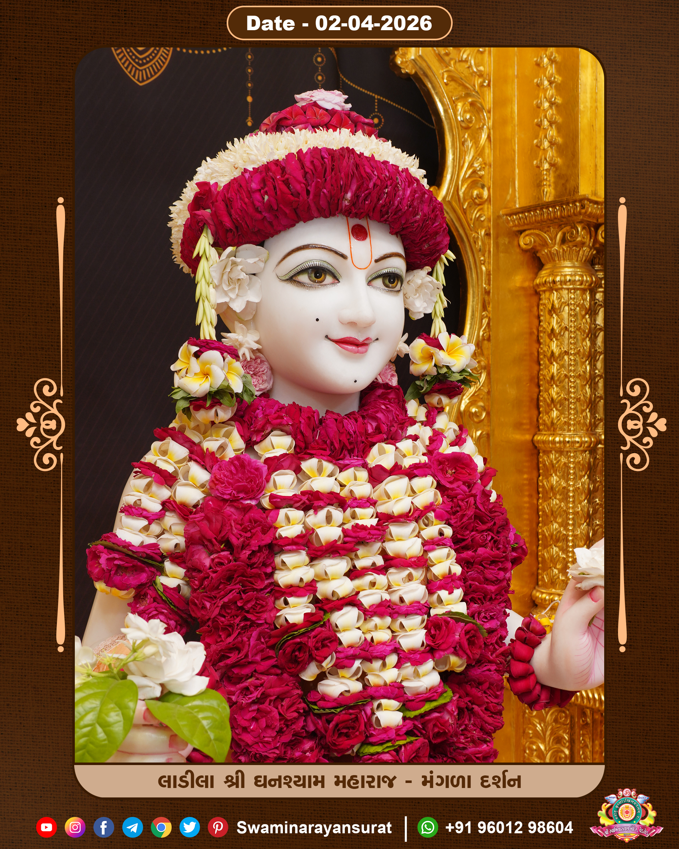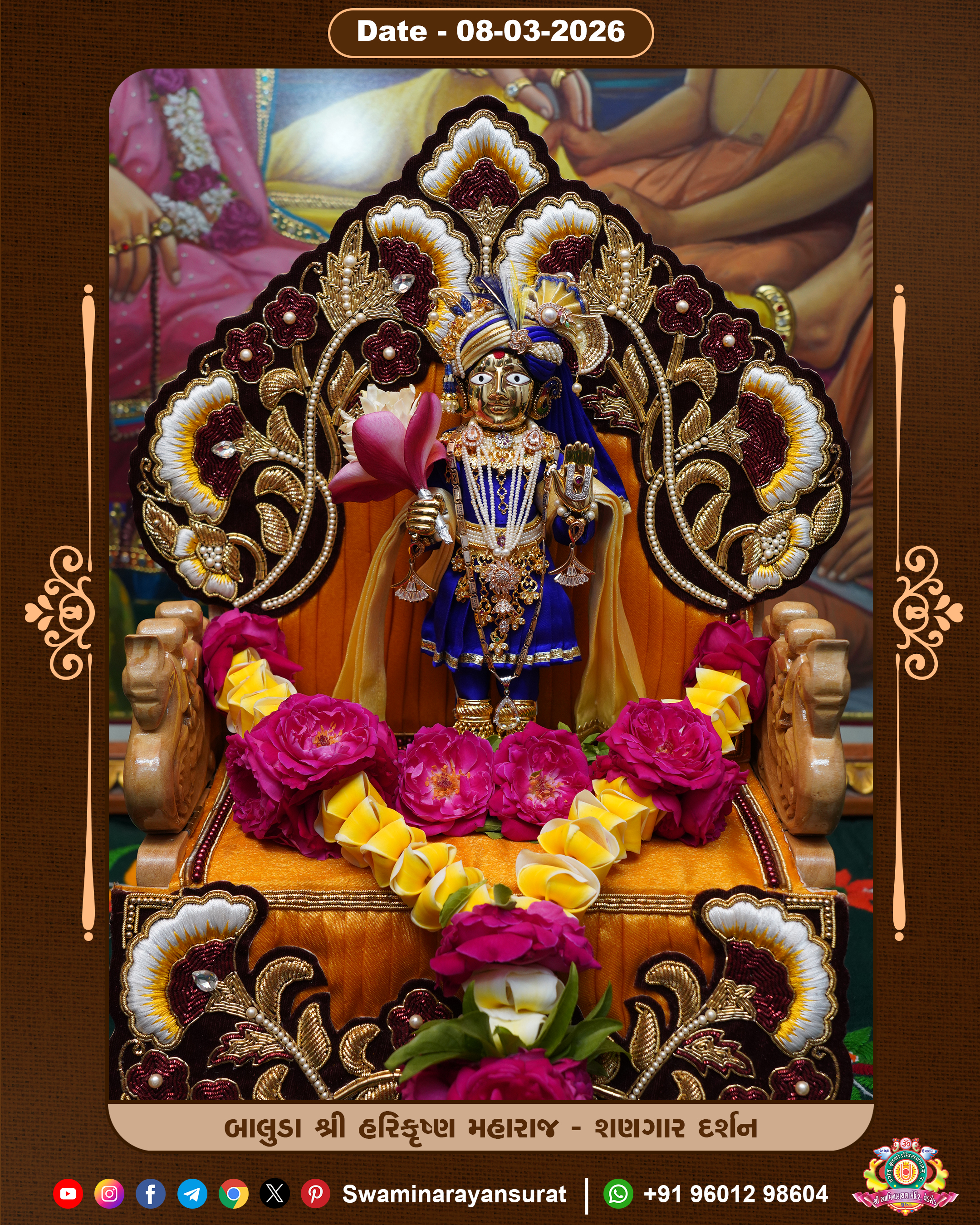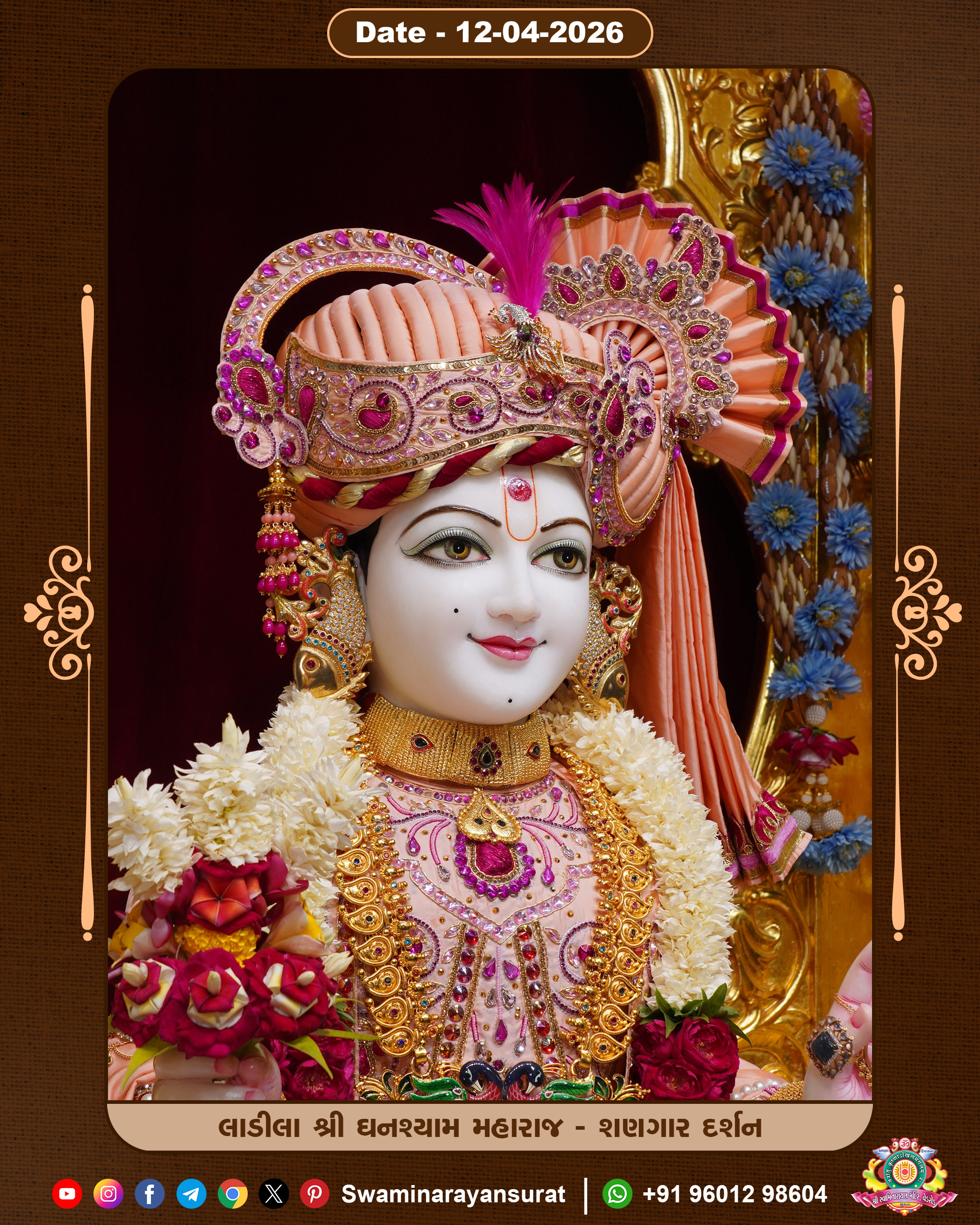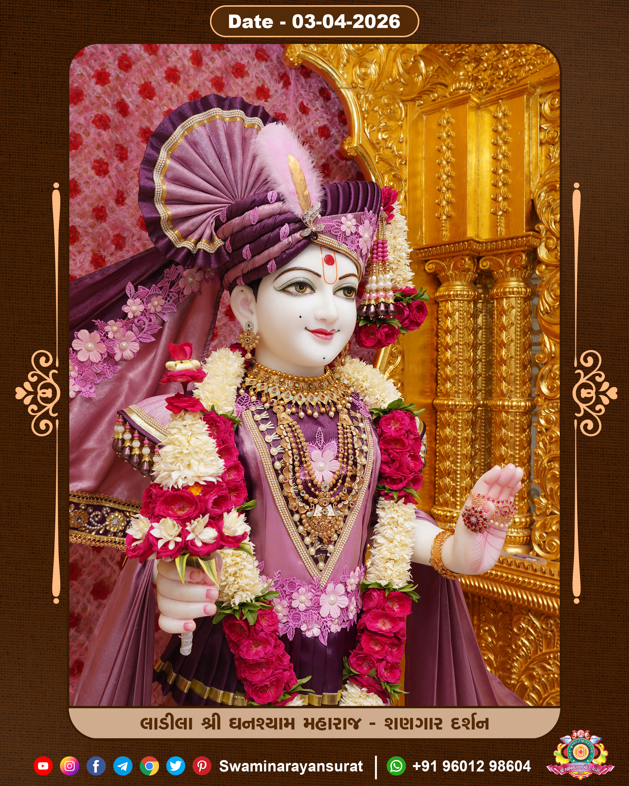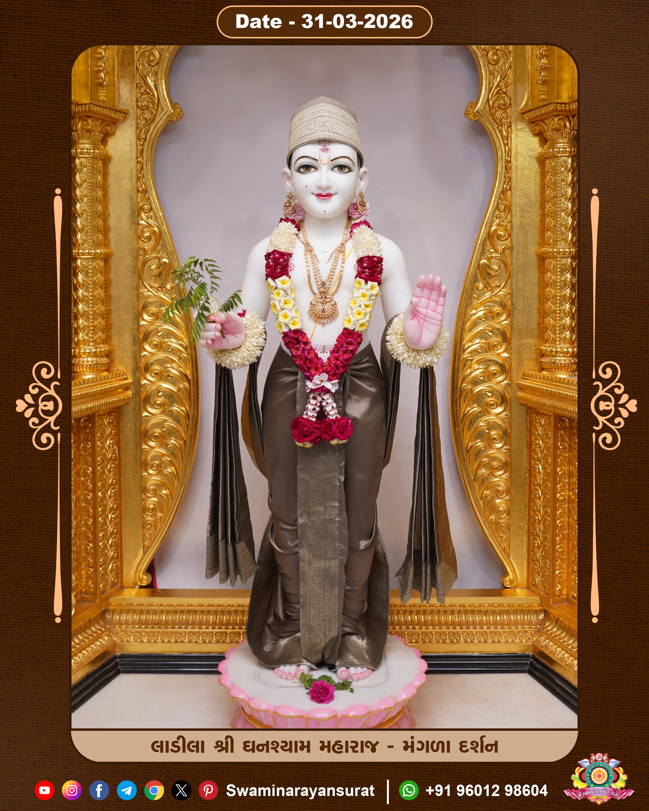 Shree Swaminarayan Temple, VedRoad is a Spiritual Organization Which falls under the region Of Vadtal Temple (The Headquarter Of Laxminarayan Dev Gadi). It is the First Organization Which is Constructed By Pink Stone With Beautiful and Marvellous Carving in Surat Of Swaminarayan Sampraday, Vadtal desh Which is increasing Pride & Prestige of Surat City, This temple contains One Main Shrine under which the idol of Ladila Shree Ghanshyam Maharaj is installed. P. Pu. Sadguru Shree Prabhucharandasji Swami is the Creator of this divine Organization. By the Several Activities & appearance Many devotees feels Easy in difficult Circumstances. He with his approx. 15 Saints & Devotees does Several Social & Spiritual Activities to fulfill the goal of Swaminarayan Sampraday, to do Worship with religious practices.
