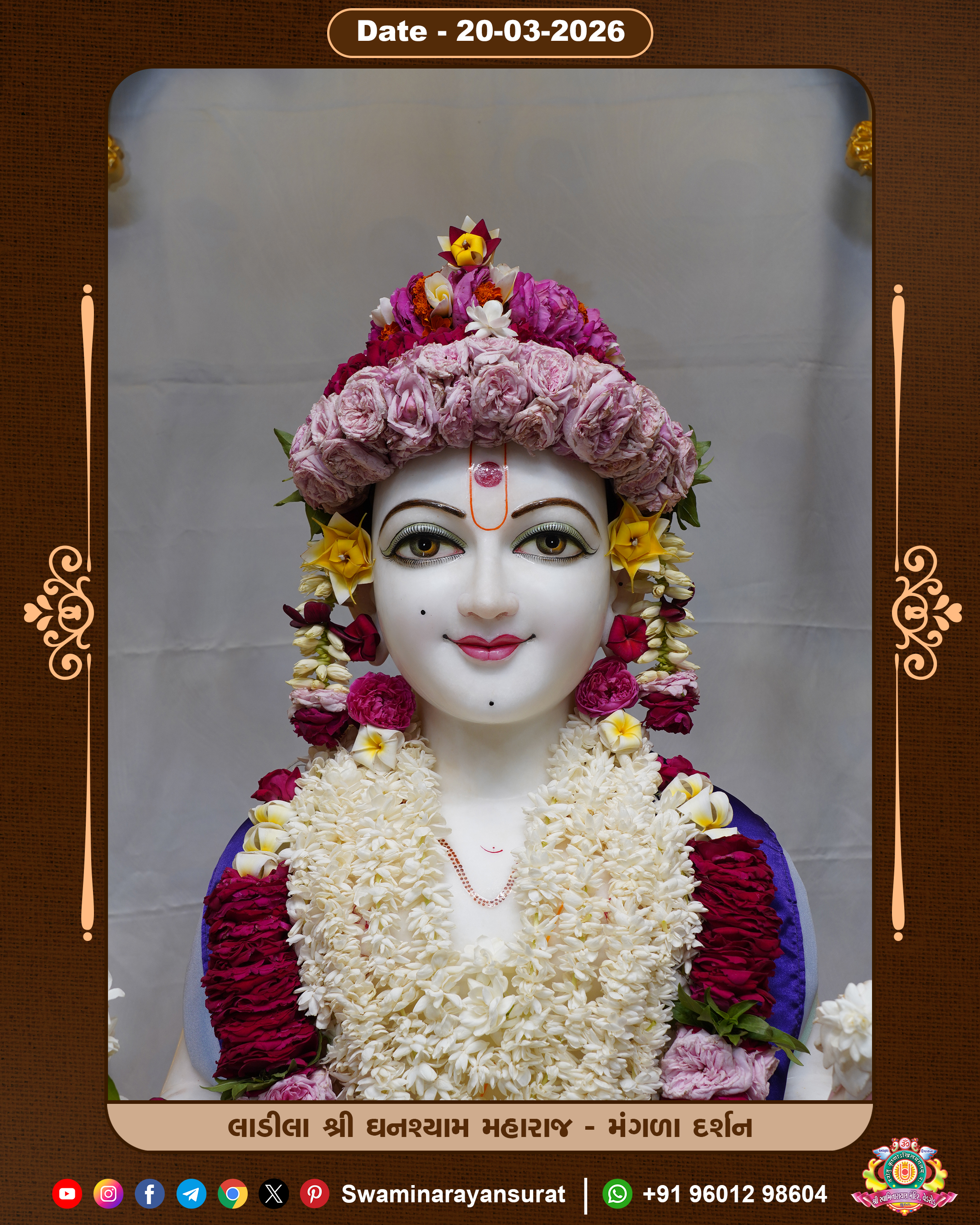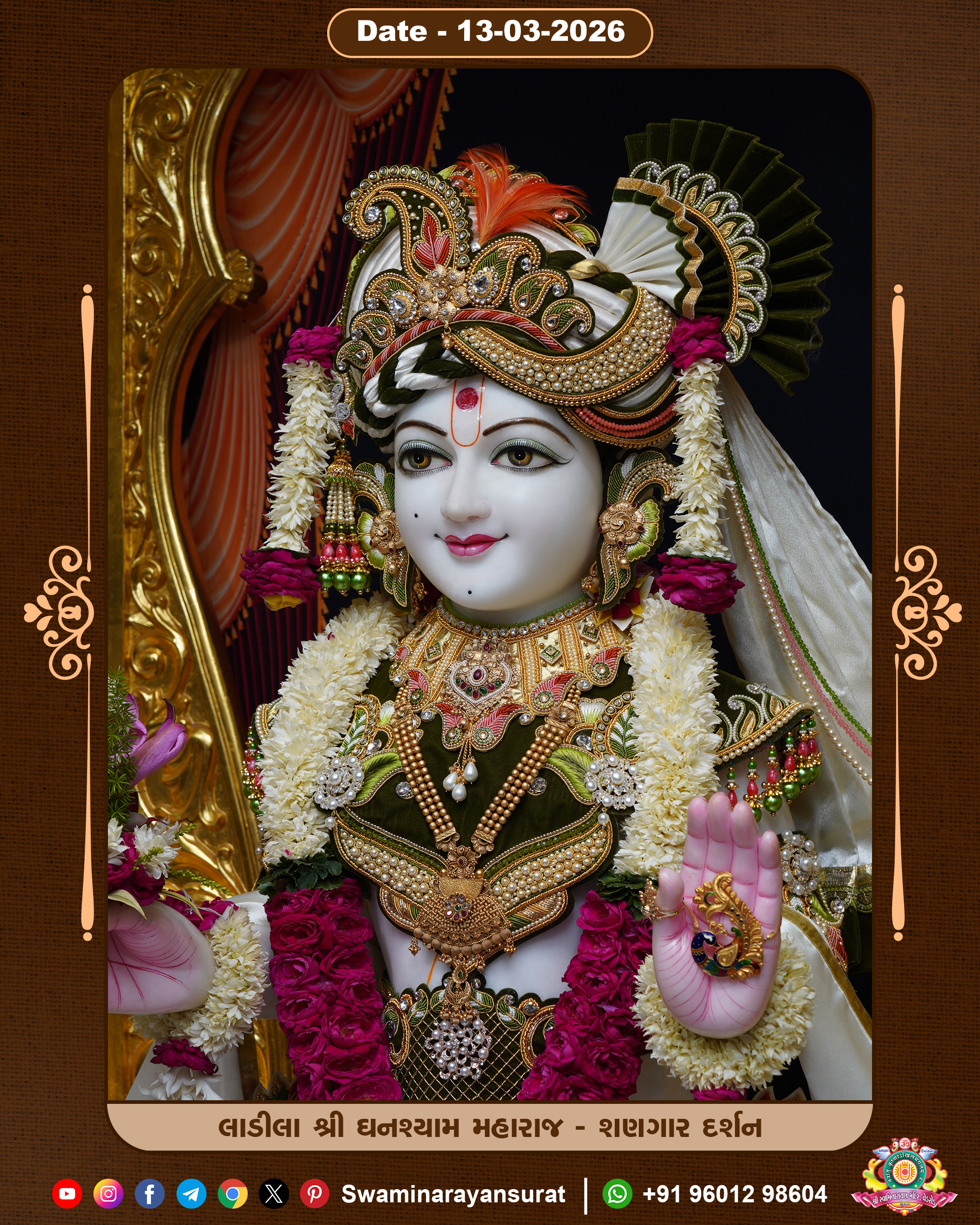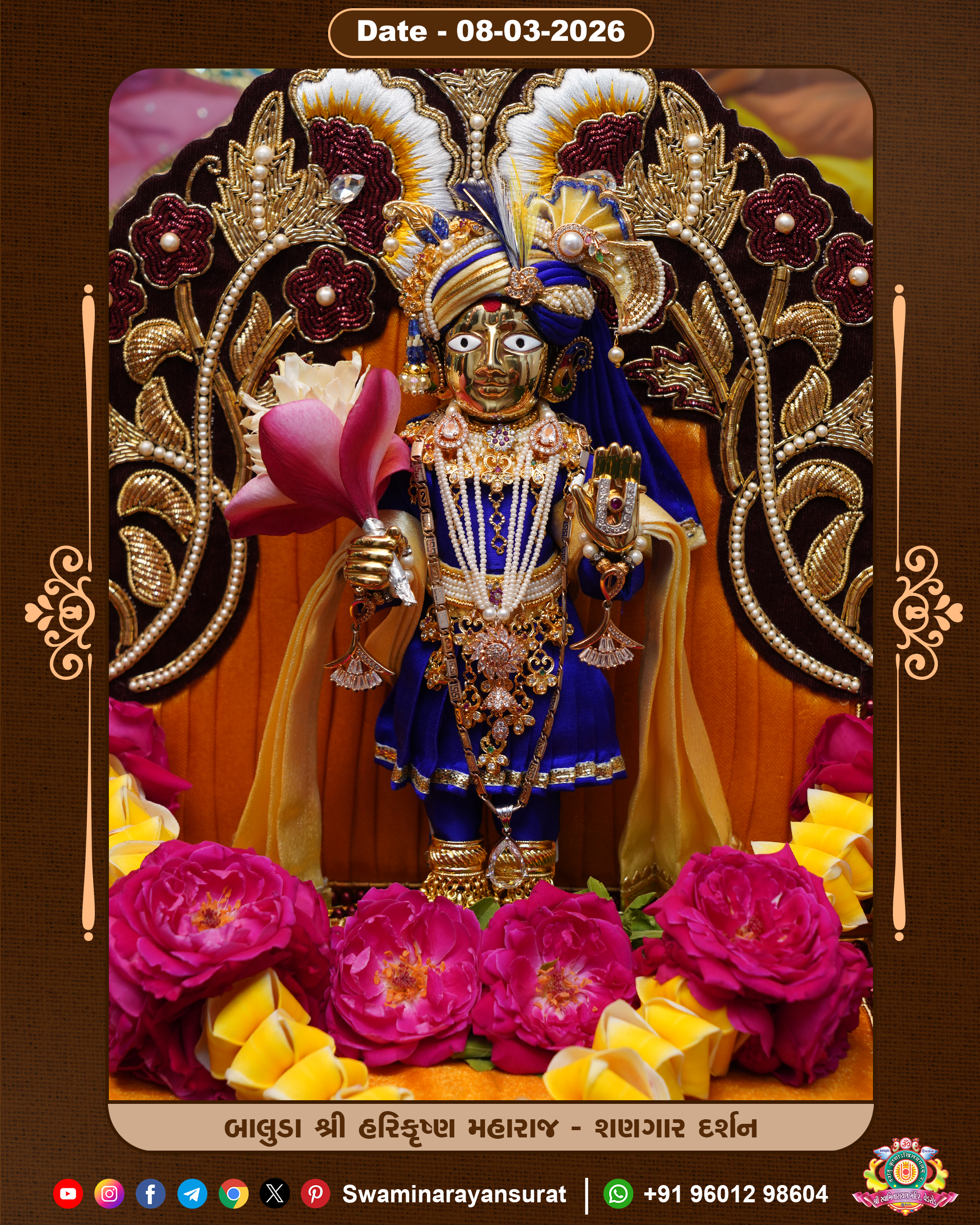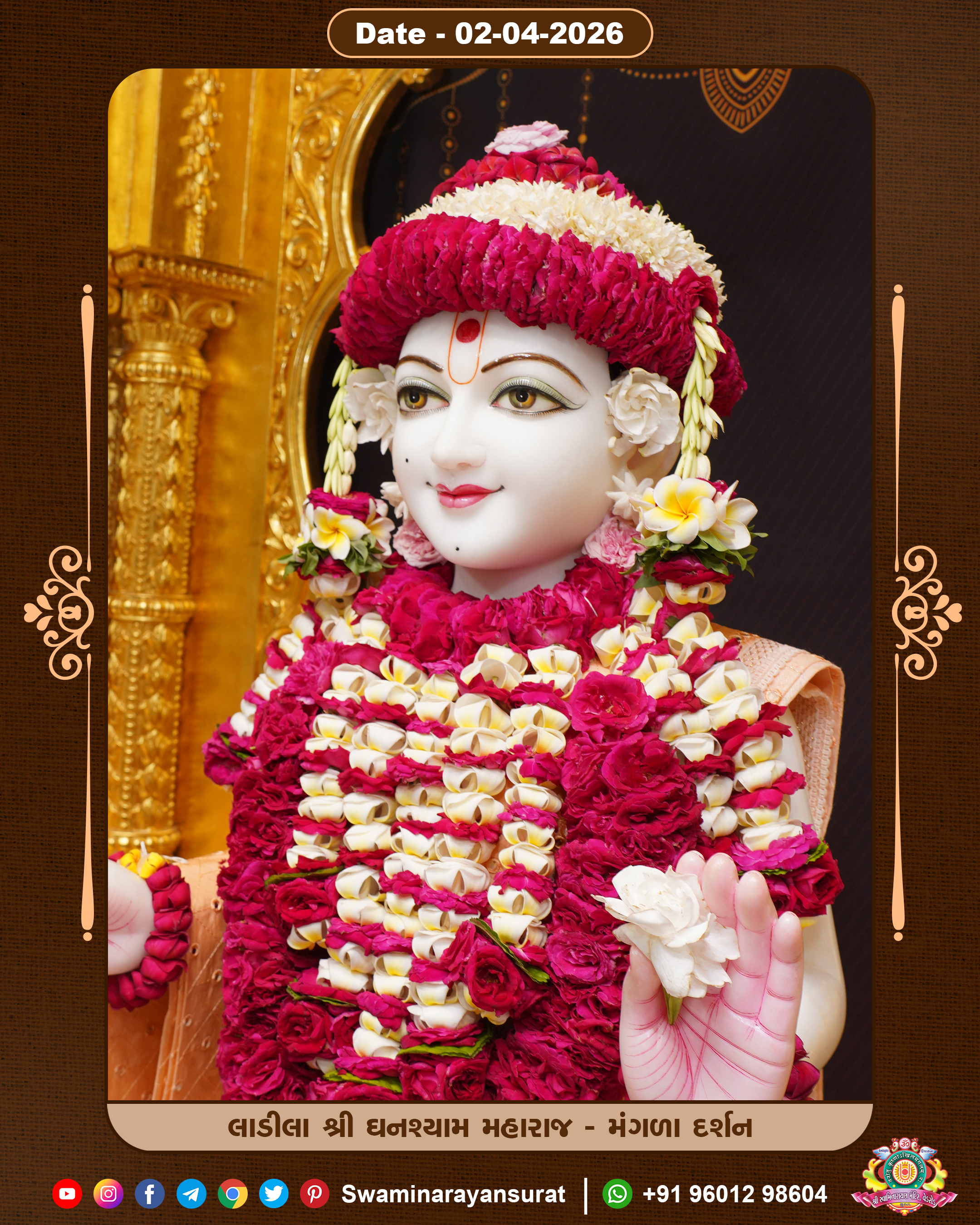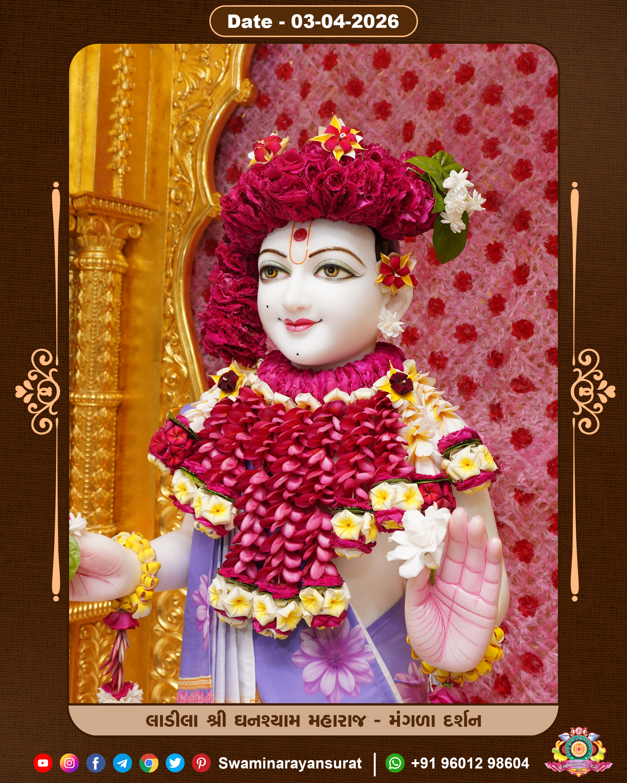 Shree Swaminarayan Temple, VedRoad is a Spiritual Organization Which falls under the region Of Vadtal Temple (The Headquarter Of Laxminarayan Dev Gadi). It is the First Organization Which is Constructed By Pink Stone With Beautiful and Marvellous Carving in Surat Of Swaminarayan Sampraday, Vadtal desh Which is increasing Pride & Prestige of Surat City, This temple contains One Main Shrine under which the idol of Ladila Shree Ghanshyam Maharaj is installed. P. Pu. Sadguru Shree Prabhucharandasji Swami is the Creator of this divine Organization. By the Several Activities & appearance Many devotees feels Easy in difficult Circumstances. He with his approx. 15 Saints & Devotees does Several Social & Spiritual Activities to fulfill the goal of Swaminarayan Sampraday, to do Worship with religious practices.