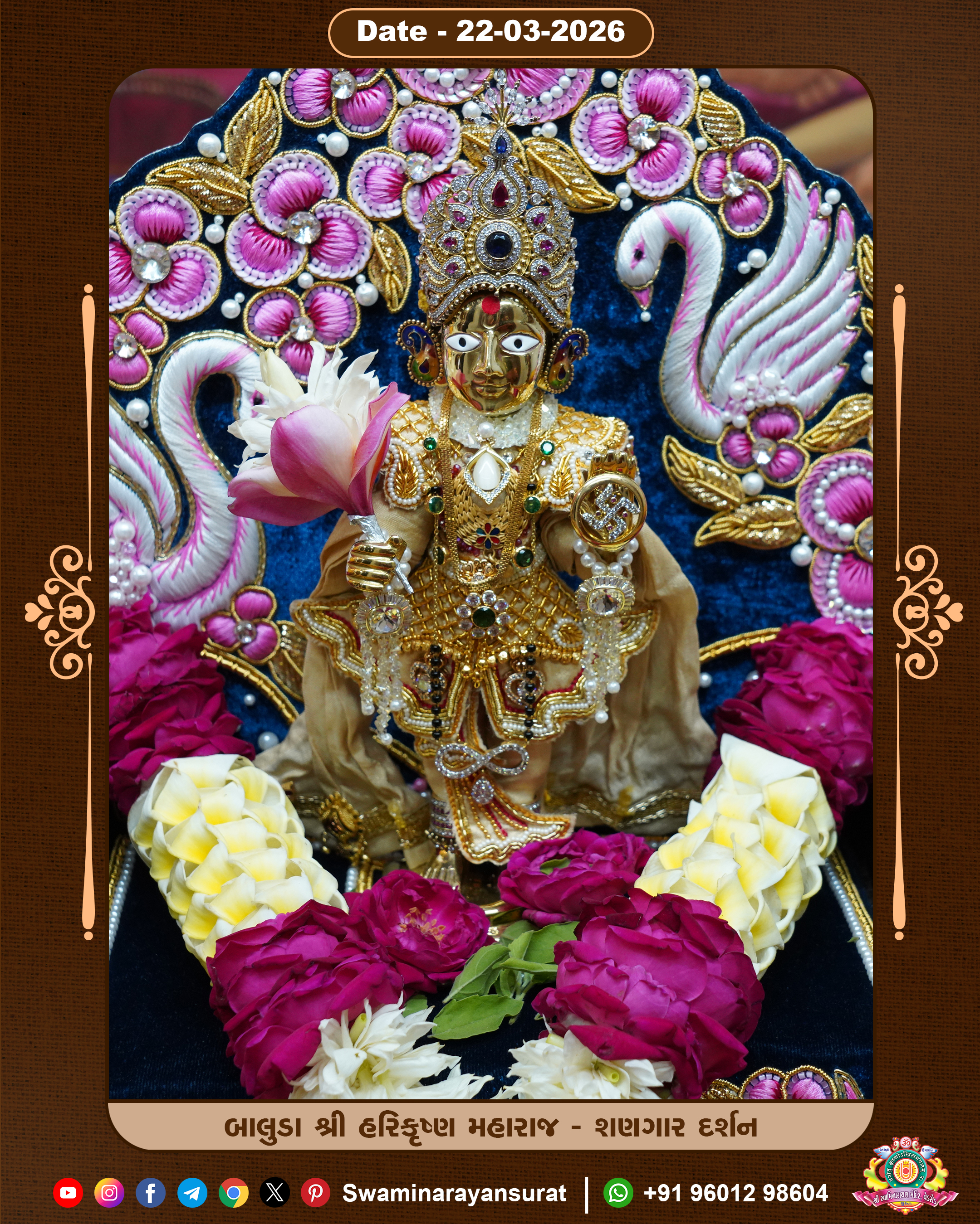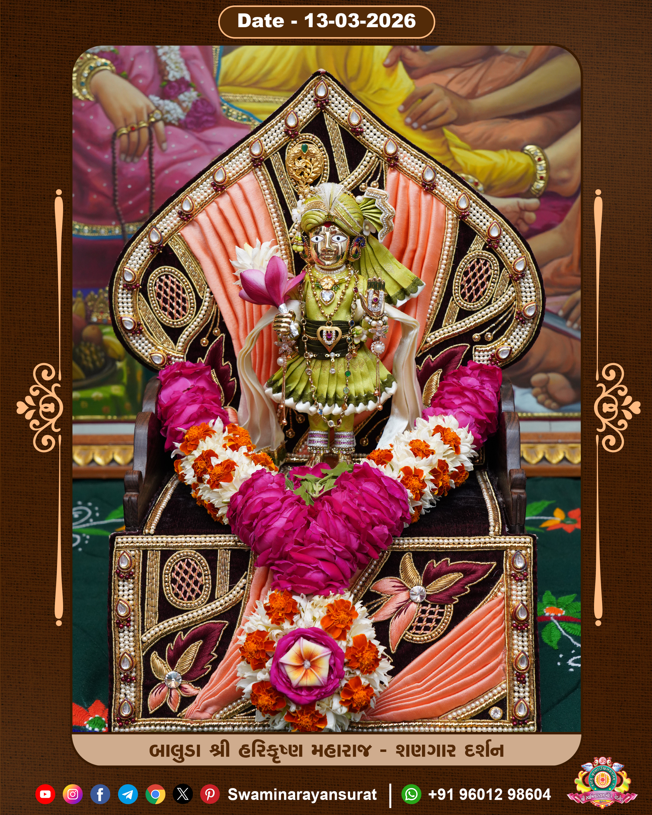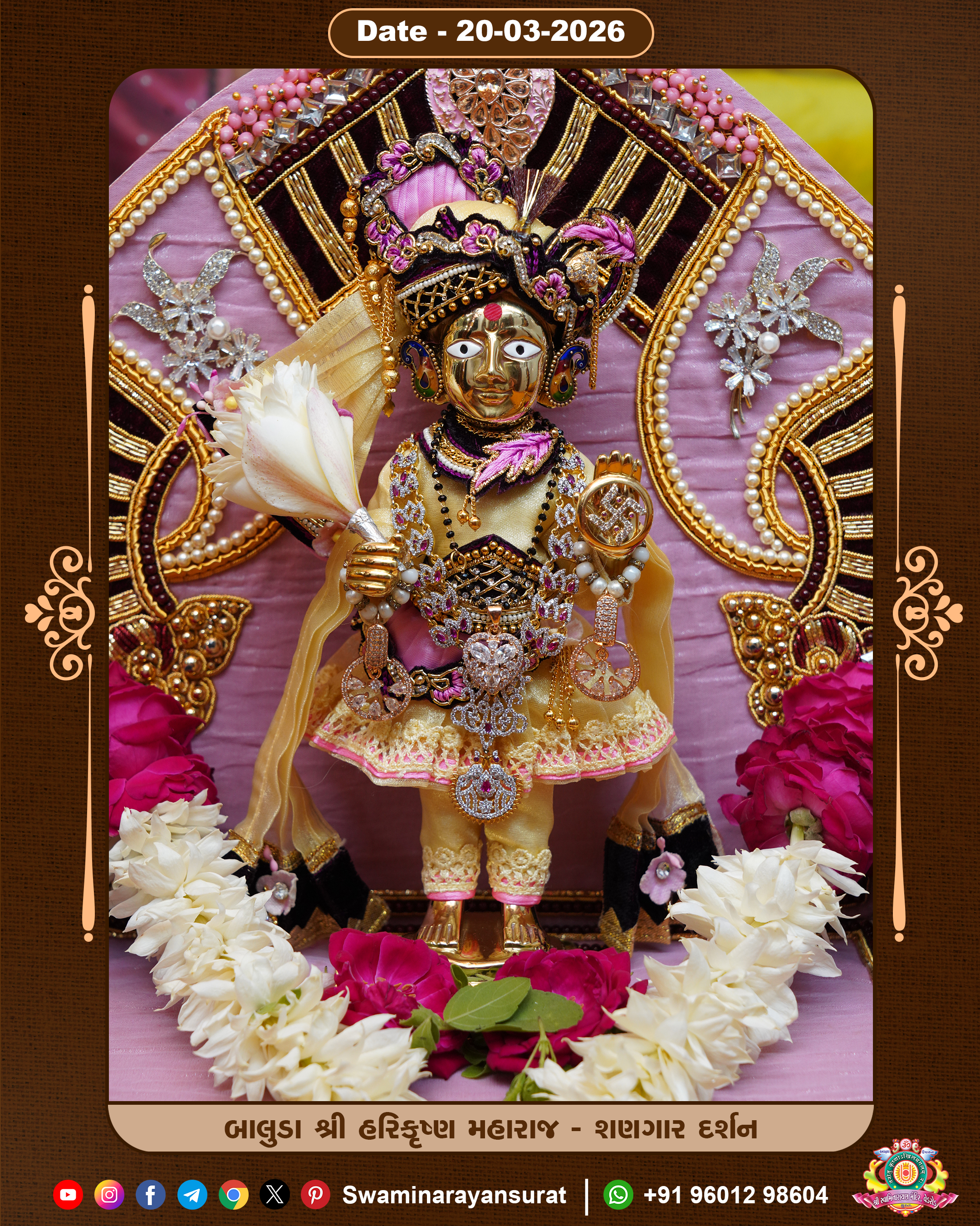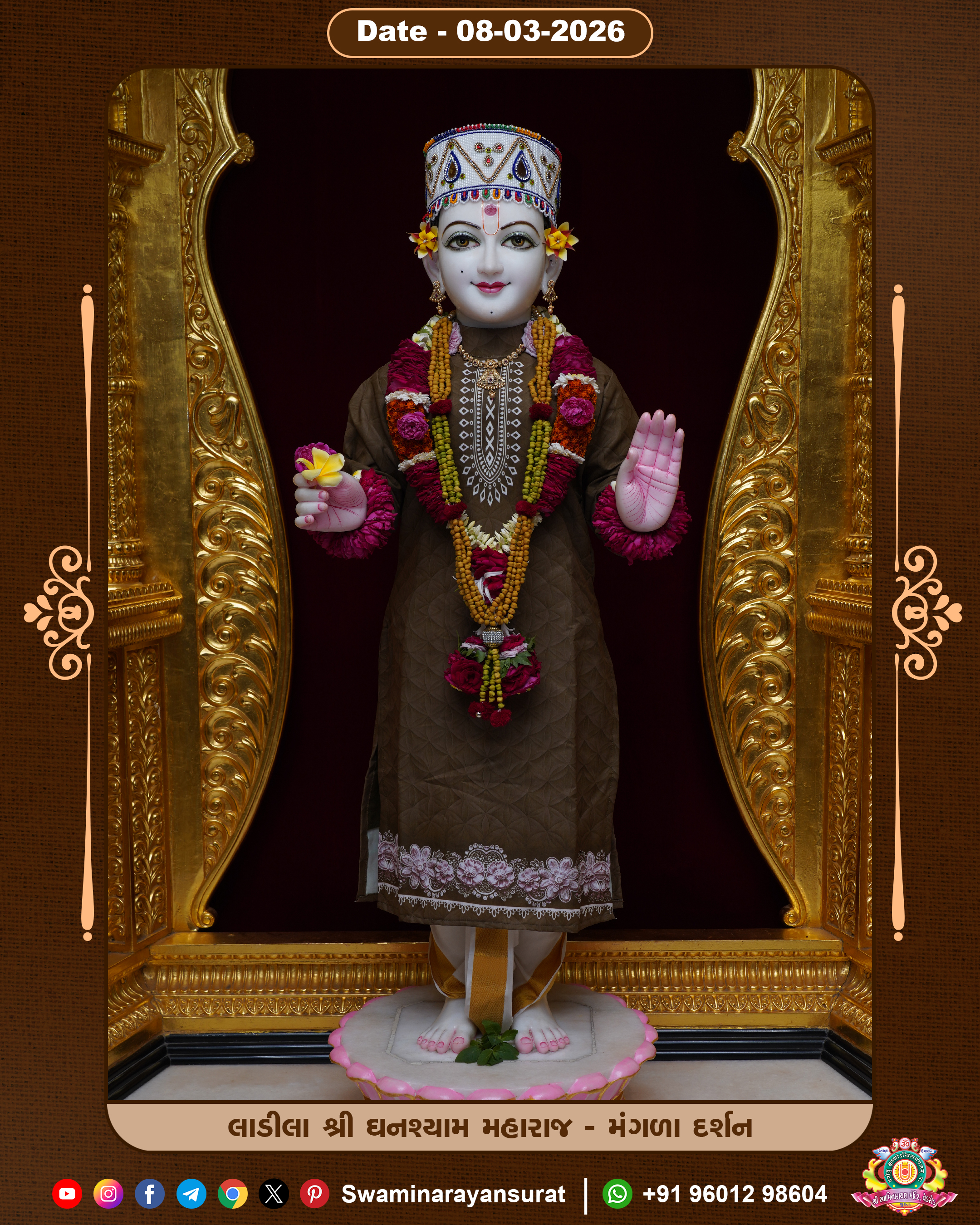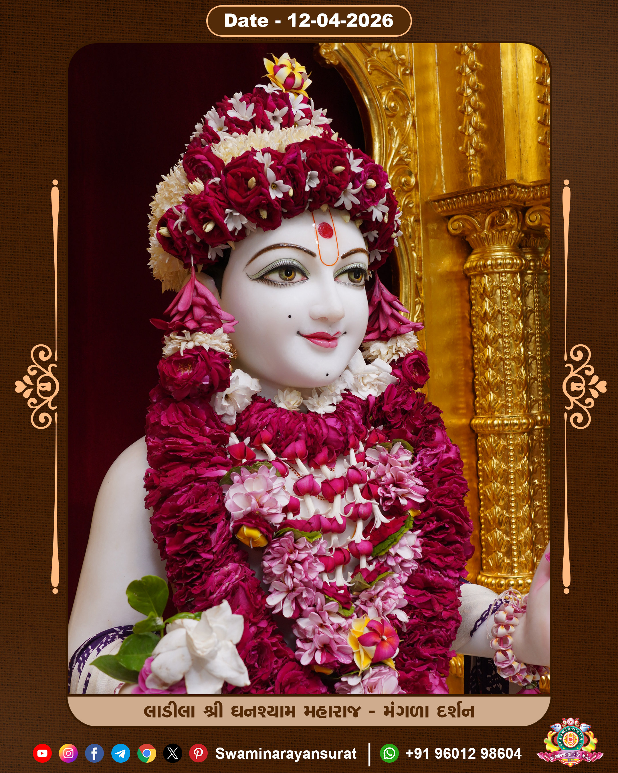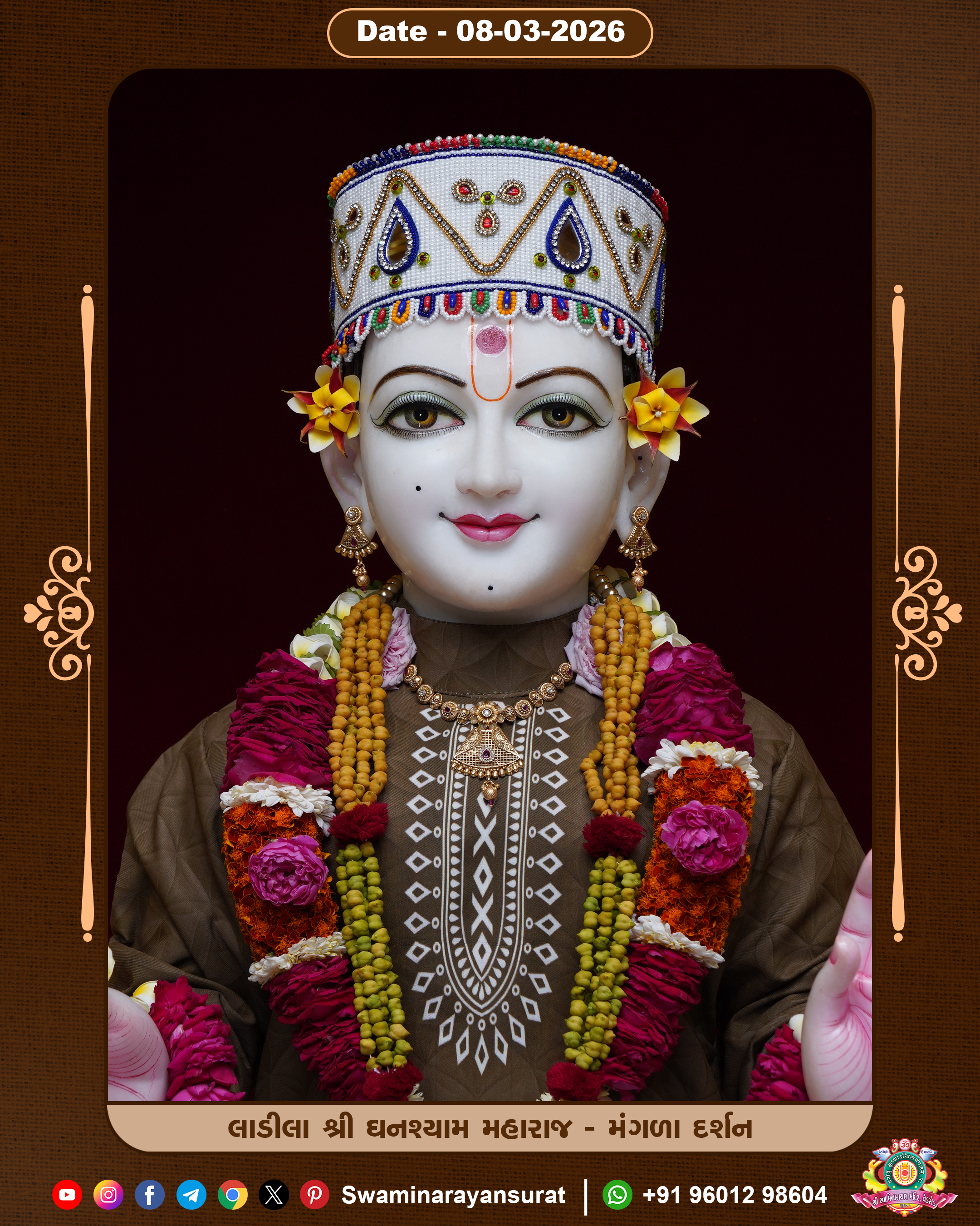 Shree Swaminarayan Temple, VedRoad is a Spiritual Organization Which falls under the region Of Vadtal Temple (The Headquarter Of Laxminarayan Dev Gadi). It is the First Organization Which is Constructed By Pink Stone With Beautiful and Marvellous Carving in Surat Of Swaminarayan Sampraday, Vadtal desh Which is increasing Pride & Prestige of Surat City, This temple contains One Main Shrine under which the idol of Ladila Shree Ghanshyam Maharaj is installed. P. Pu. Sadguru Shree Prabhucharandasji Swami is the Creator of this divine Organization. By the Several Activities & appearance Many devotees feels Easy in difficult Circumstances. He with his approx. 15 Saints & Devotees does Several Social & Spiritual Activities to fulfill the goal of Swaminarayan Sampraday, to do Worship with religious practices.