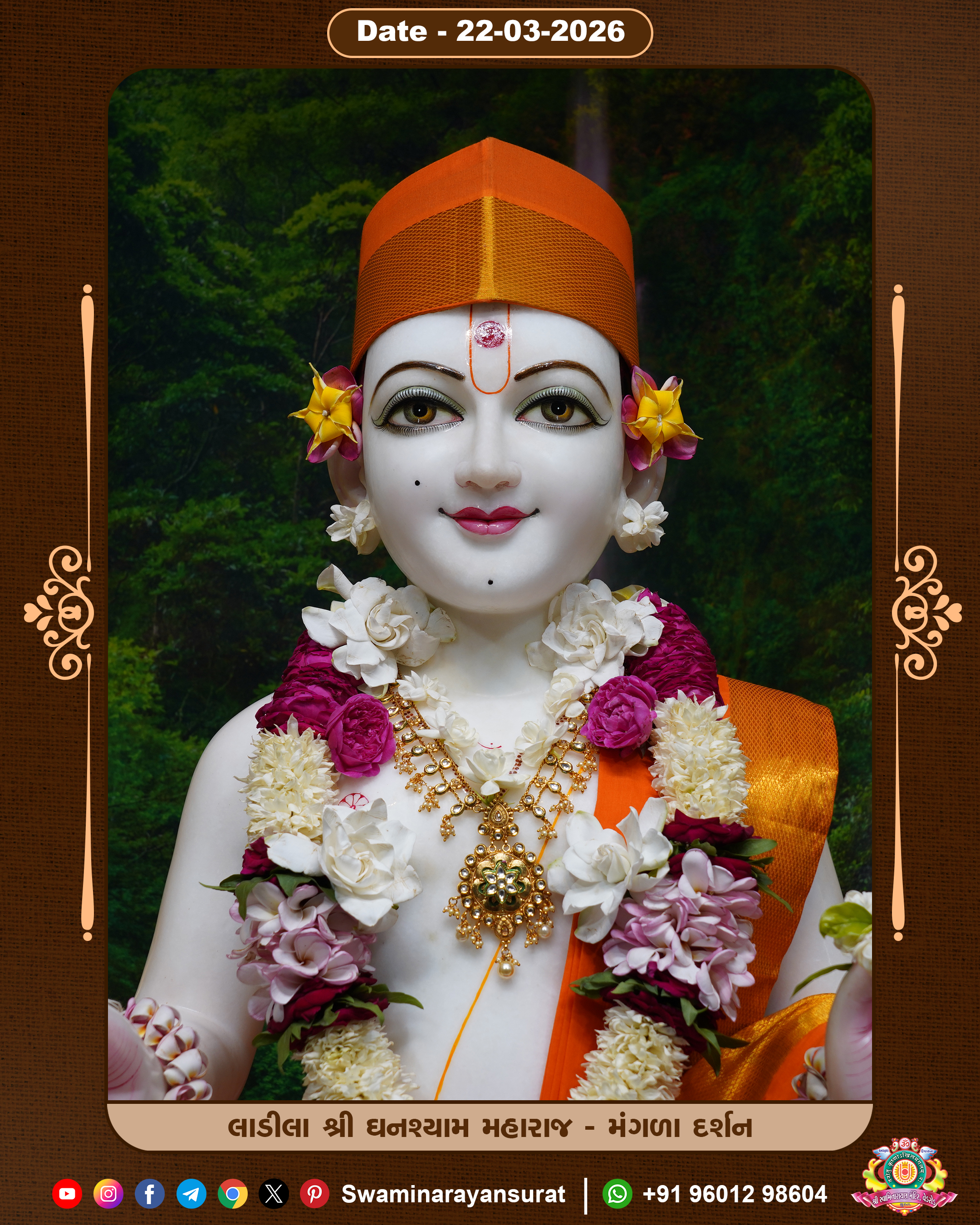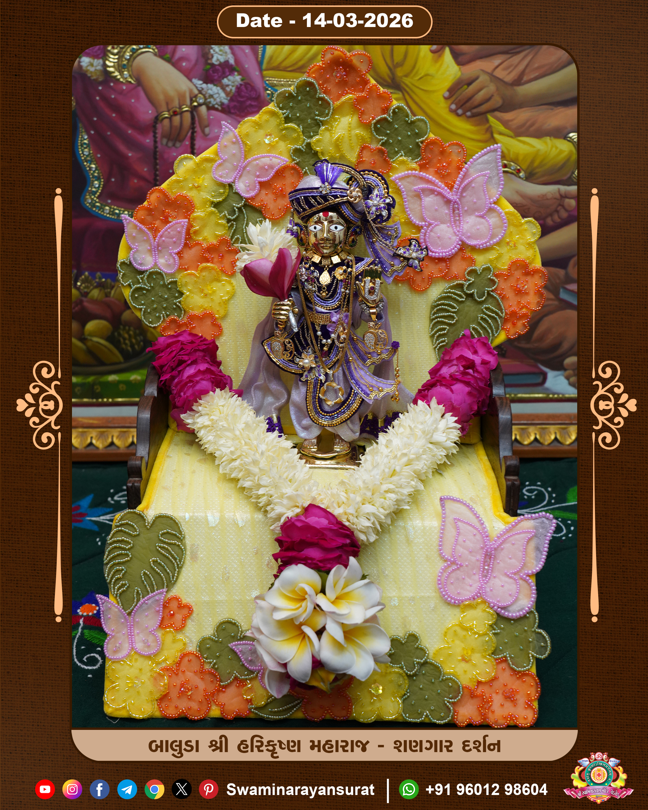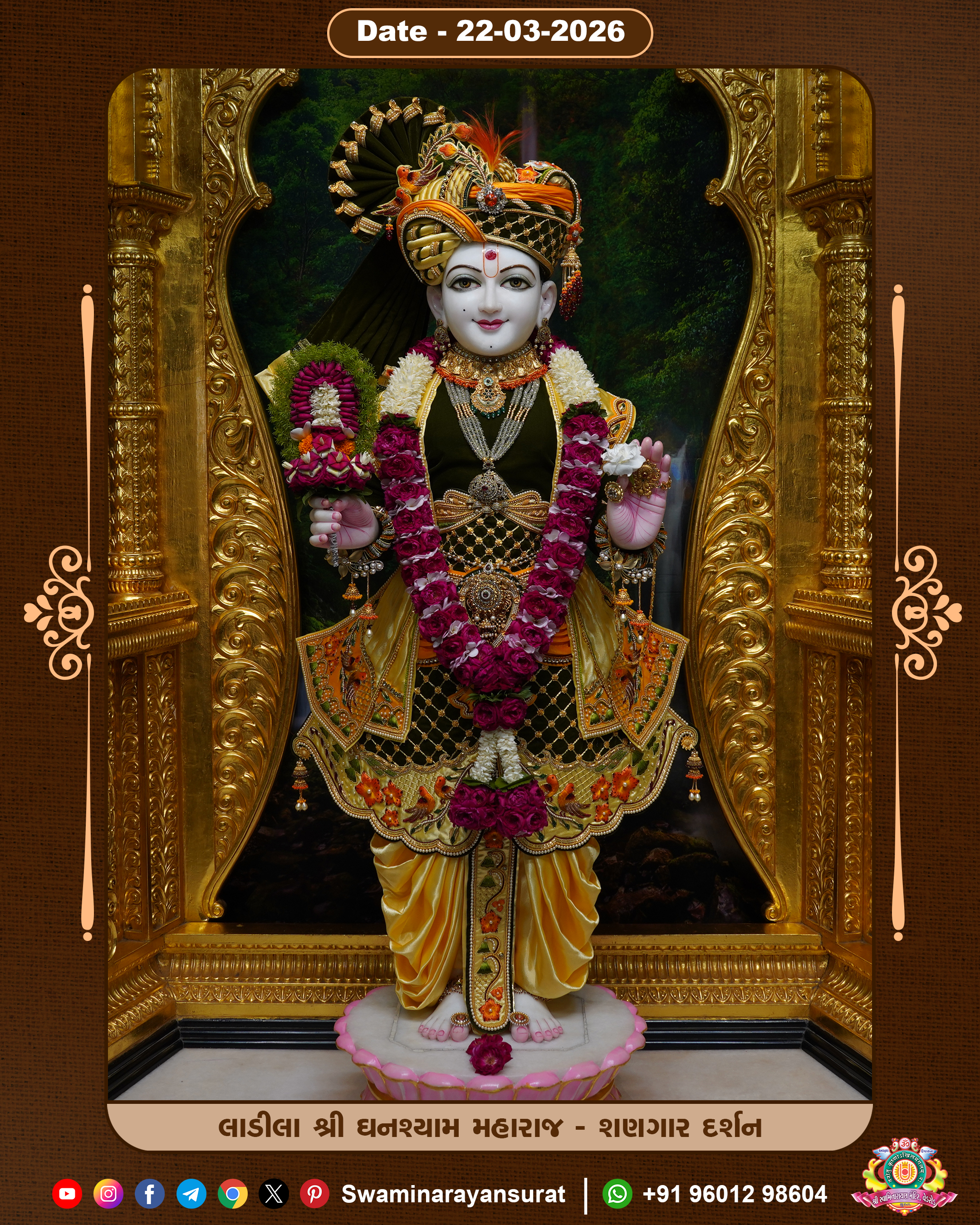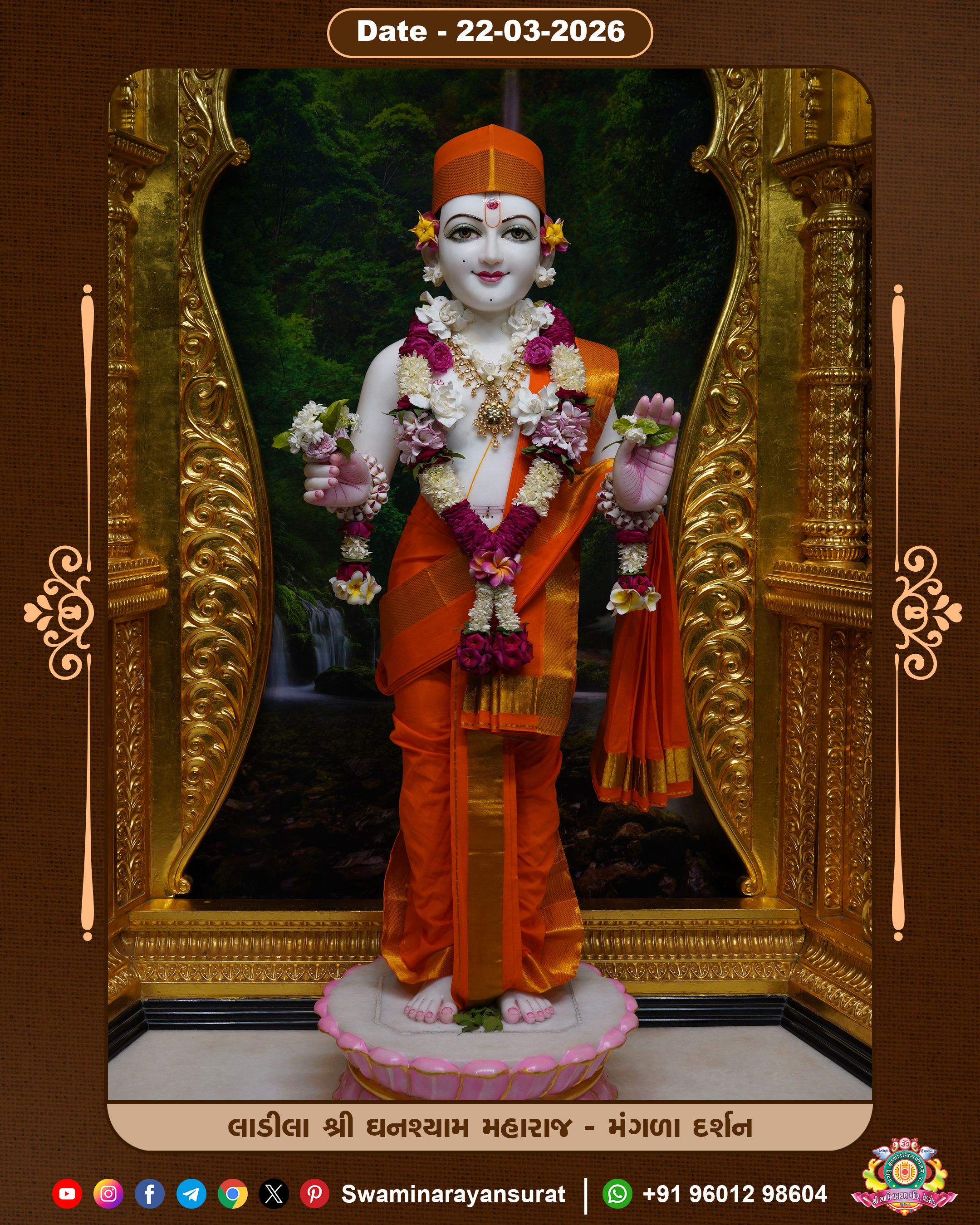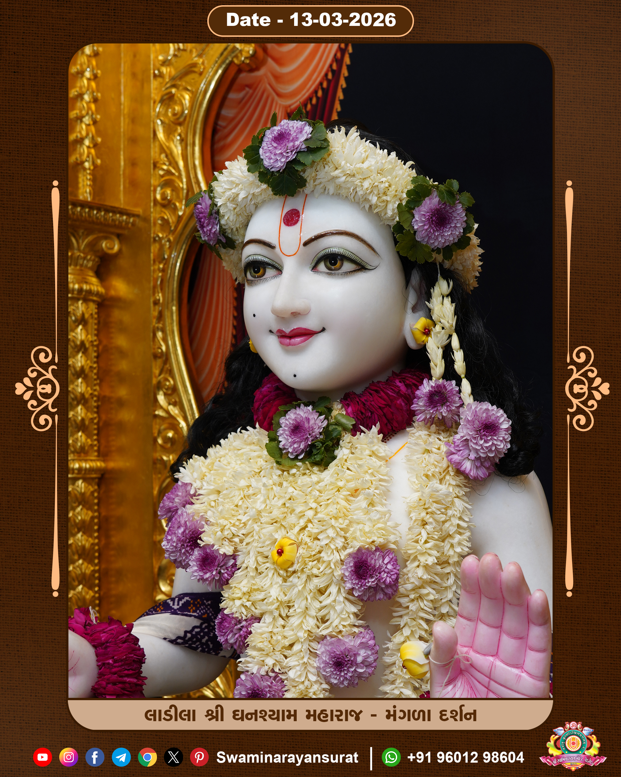 Shree Swaminarayan Temple, VedRoad is a Spiritual Organization Which falls under the region Of Vadtal Temple (The Headquarter Of Laxminarayan Dev Gadi). It is the First Organization Which is Constructed By Pink Stone With Beautiful and Marvellous Carving in Surat Of Swaminarayan Sampraday, Vadtal desh Which is increasing Pride & Prestige of Surat City, This temple contains One Main Shrine under which the idol of Ladila Shree Ghanshyam Maharaj is installed. P. Pu. Sadguru Shree Prabhucharandasji Swami is the Creator of this divine Organization. By the Several Activities & appearance Many devotees feels Easy in difficult Circumstances. He with his approx. 15 Saints & Devotees does Several Social & Spiritual Activities to fulfill the goal of Swaminarayan Sampraday, to do Worship with religious practices.