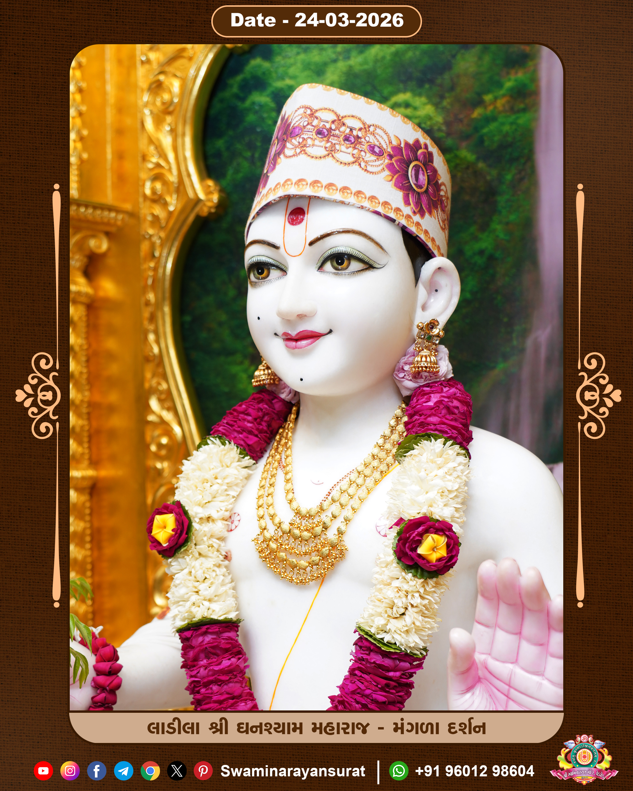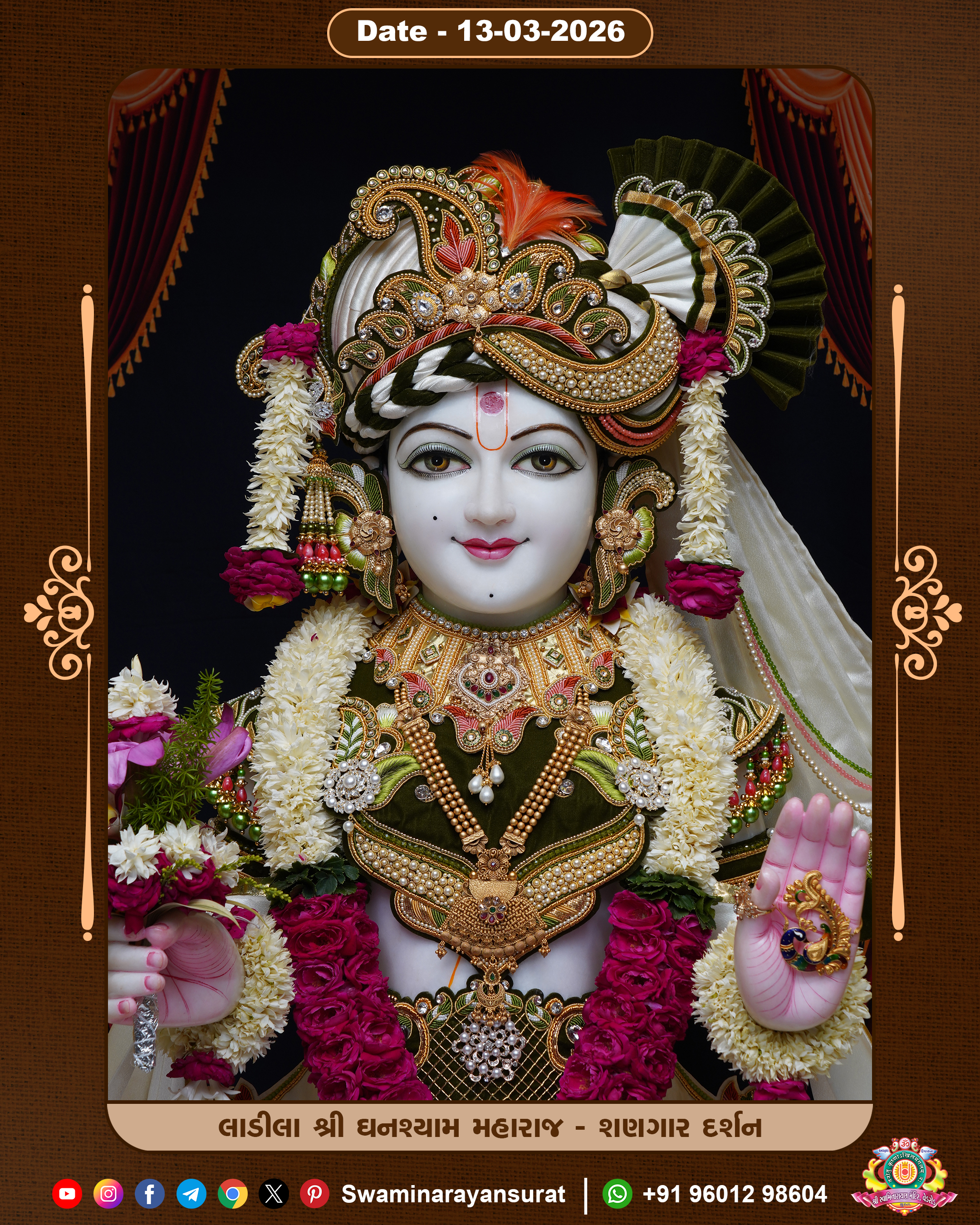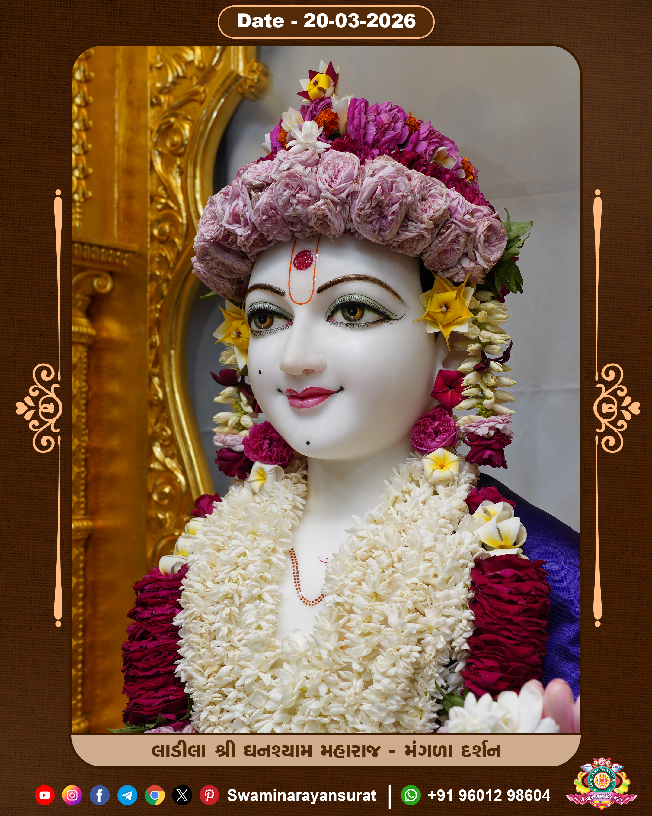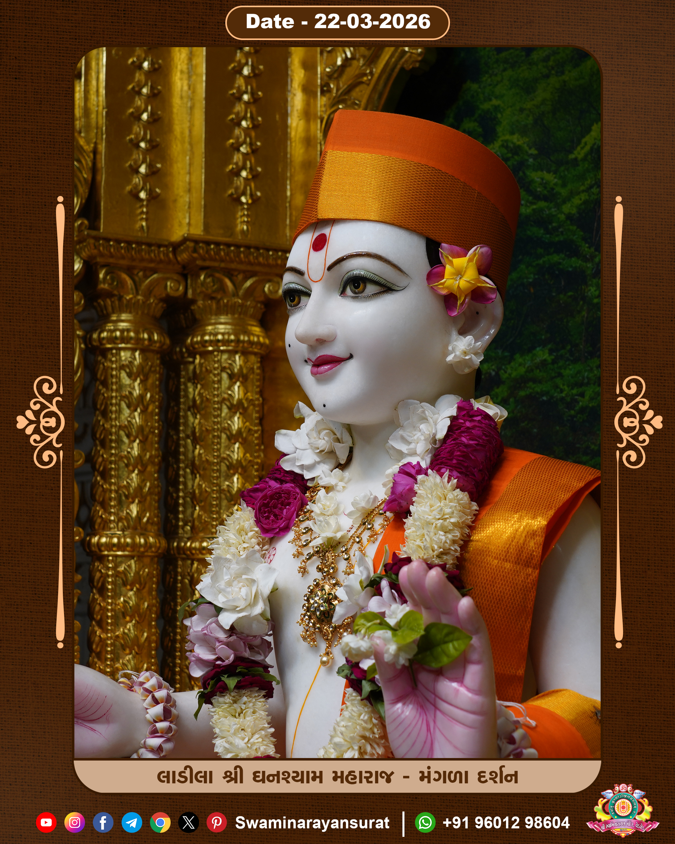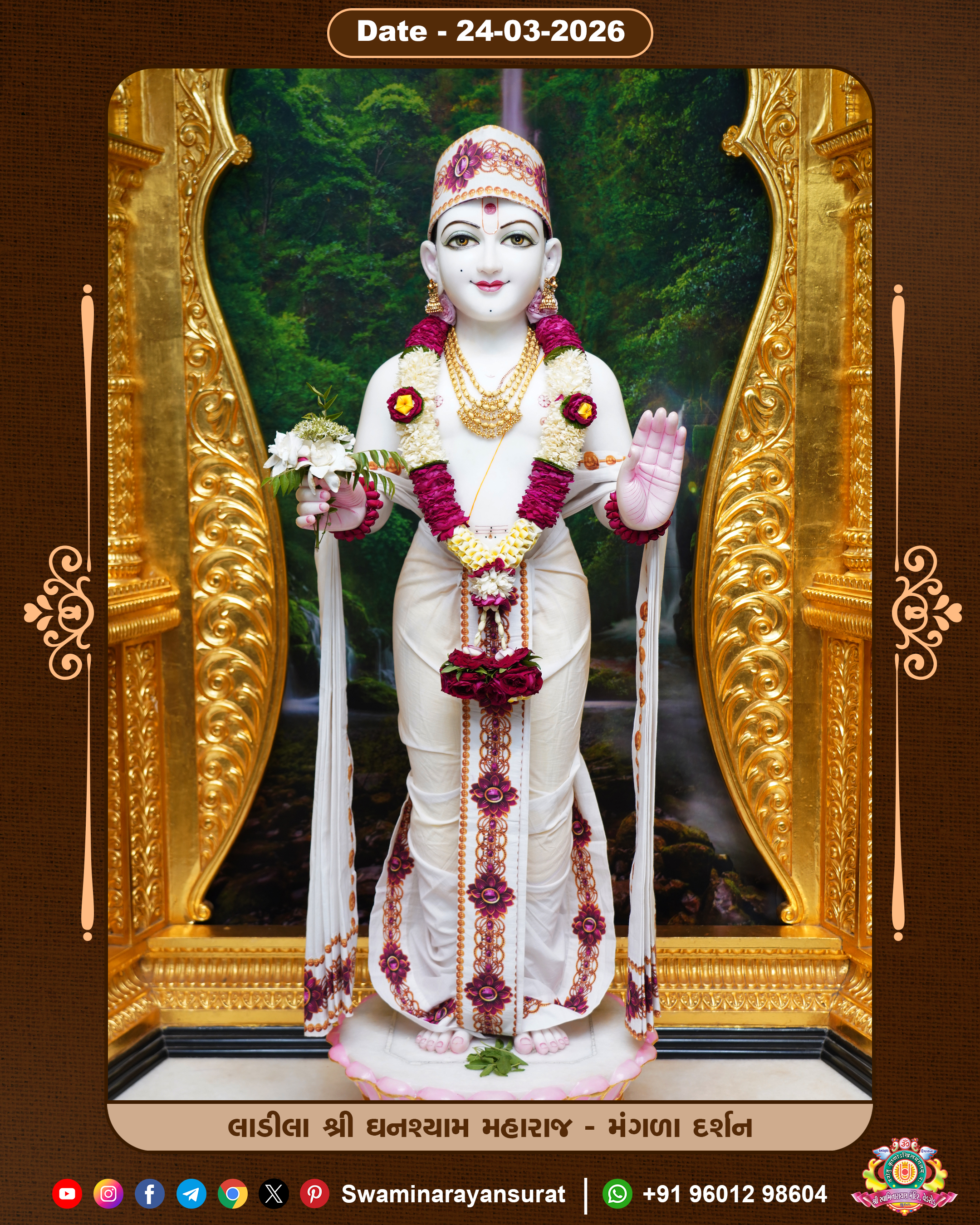 Shree Swaminarayan Temple, VedRoad is a Spiritual Organization Which falls under the region Of Vadtal Temple (The Headquarter Of Laxminarayan Dev Gadi). It is the First Organization Which is Constructed By Pink Stone With Beautiful and Marvellous Carving in Surat Of Swaminarayan Sampraday, Vadtal desh Which is increasing Pride & Prestige of Surat City, This temple contains One Main Shrine under which the idol of Ladila Shree Ghanshyam Maharaj is installed. P. Pu. Sadguru Shree Prabhucharandasji Swami is the Creator of this divine Organization. By the Several Activities & appearance Many devotees feels Easy in difficult Circumstances. He with his approx. 15 Saints & Devotees does Several Social & Spiritual Activities to fulfill the goal of Swaminarayan Sampraday, to do Worship with religious practices.