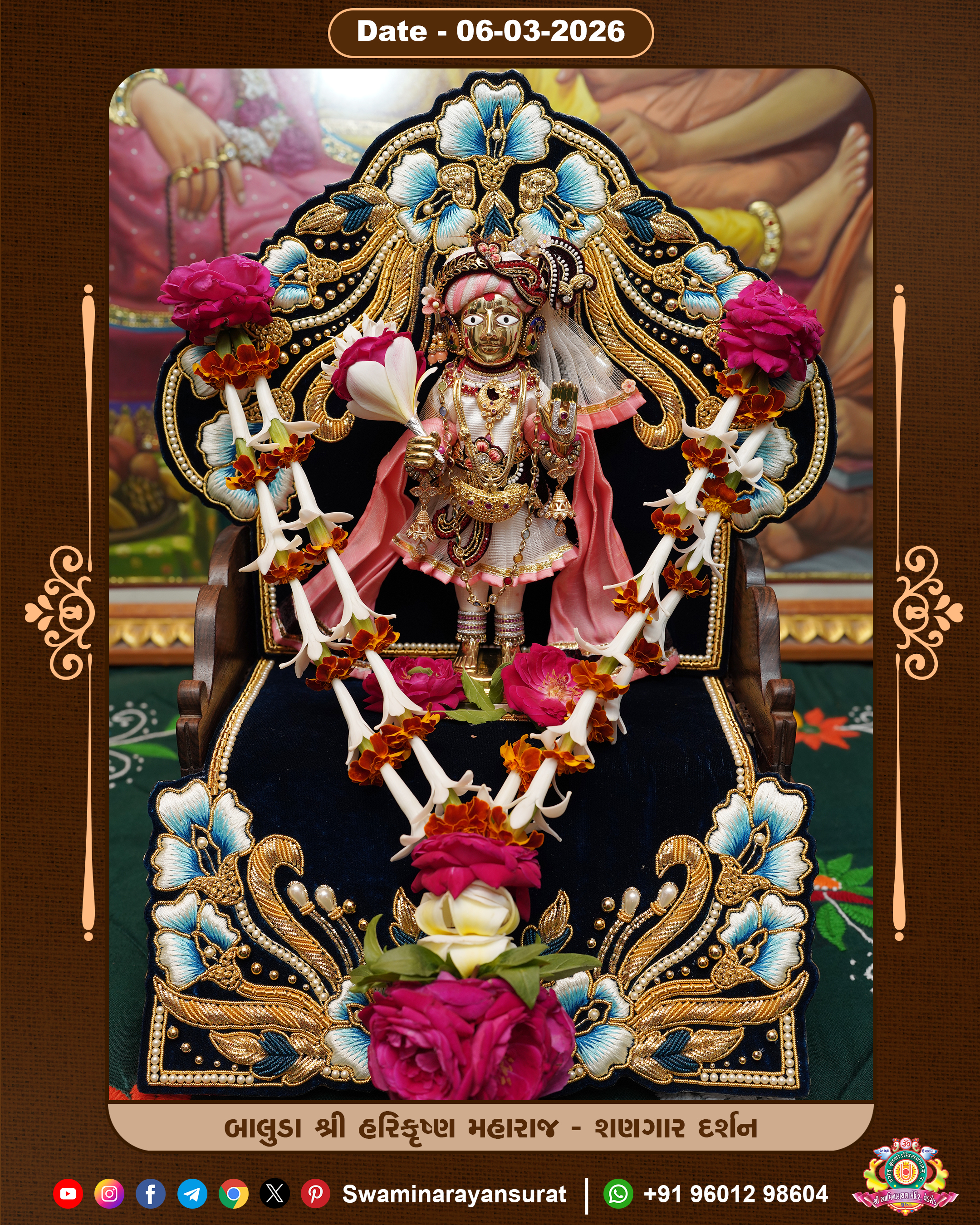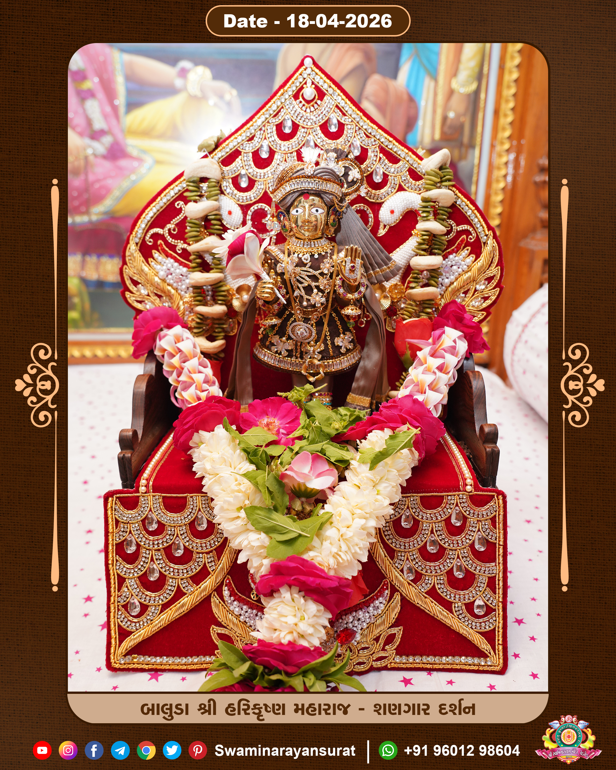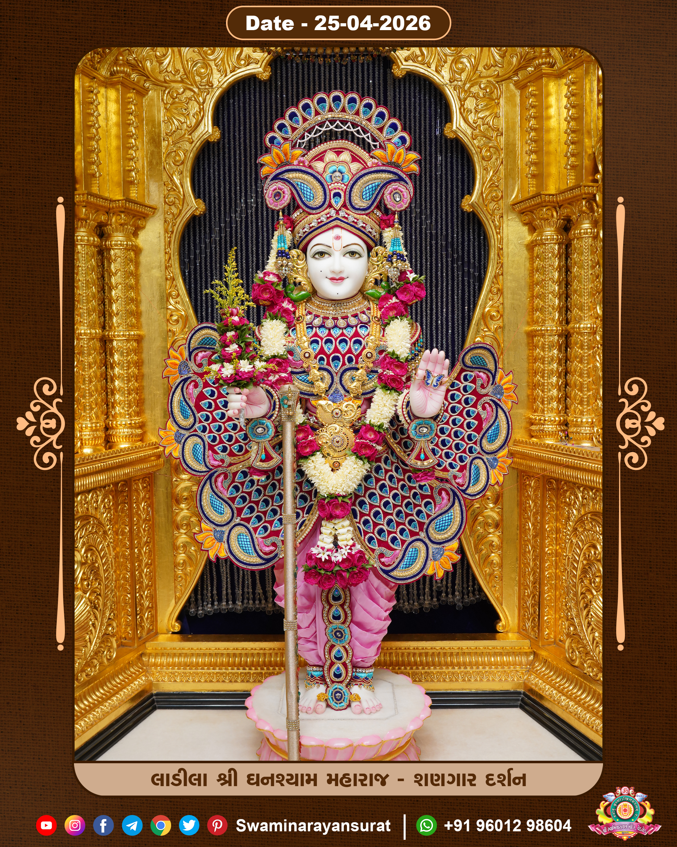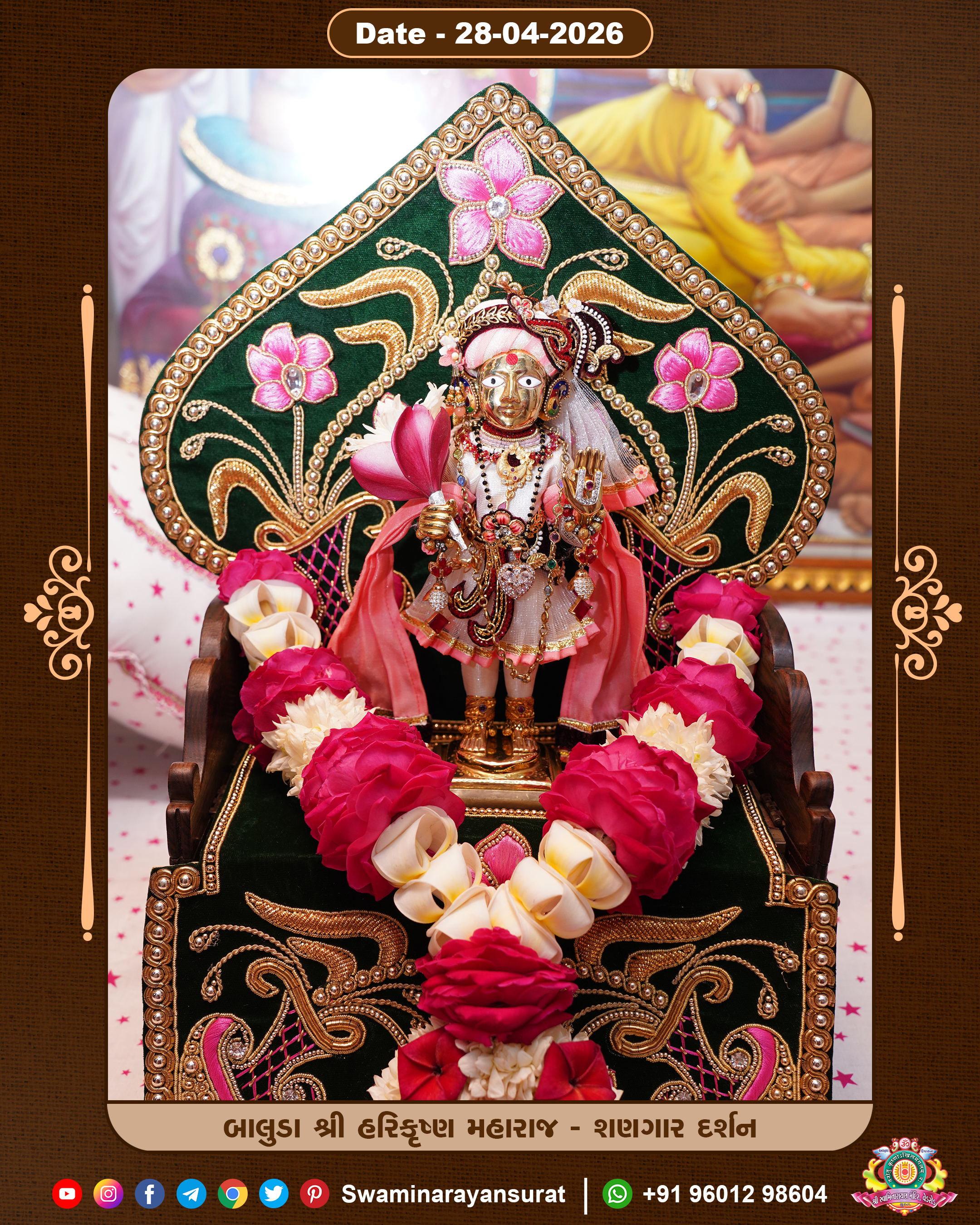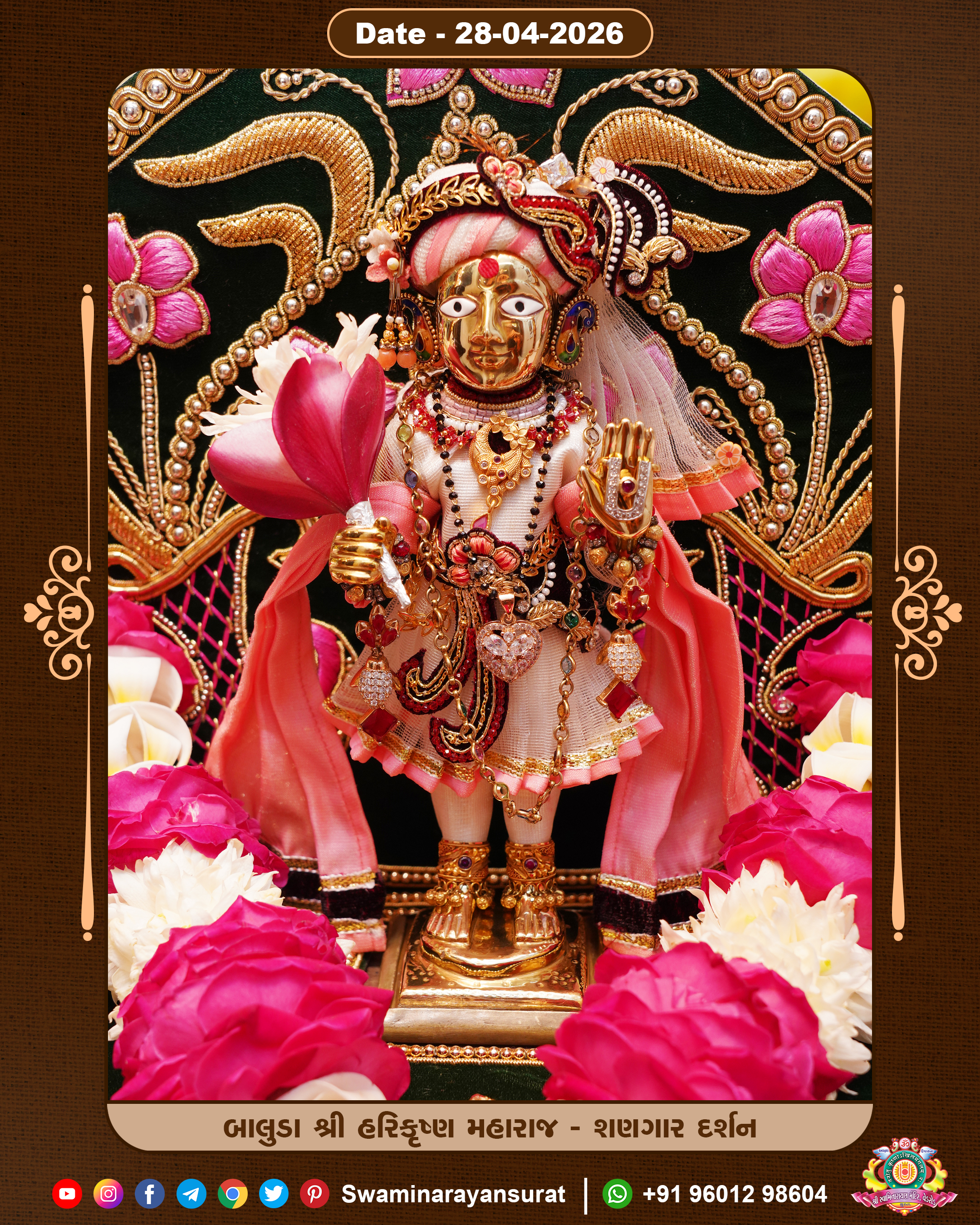 Shree Swaminarayan Temple, VedRoad is a Spiritual Organization Which falls under the region Of Vadtal Temple (The Headquarter Of Laxminarayan Dev Gadi). It is the First Organization Which is Constructed By Pink Stone With Beautiful and Marvellous Carving in Surat Of Swaminarayan Sampraday, Vadtal desh Which is increasing Pride & Prestige of Surat City, This temple contains One Main Shrine under which the idol of Ladila Shree Ghanshyam Maharaj is installed. P. Pu. Sadguru Shree Prabhucharandasji Swami is the Creator of this divine Organization. By the Several Activities & appearance Many devotees feels Easy in difficult Circumstances. He with his approx. 15 Saints & Devotees does Several Social & Spiritual Activities to fulfill the goal of Swaminarayan Sampraday, to do Worship with religious practices.
