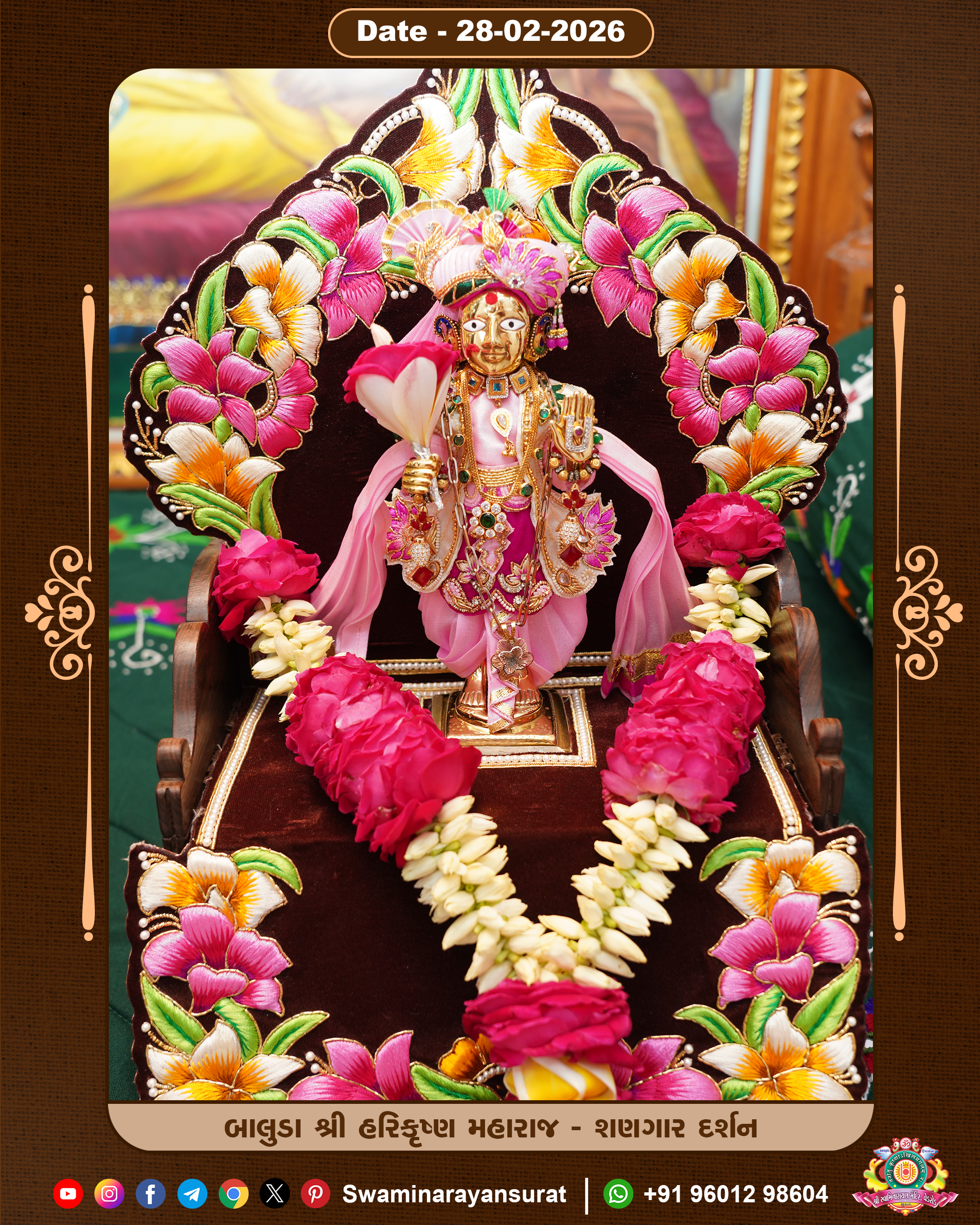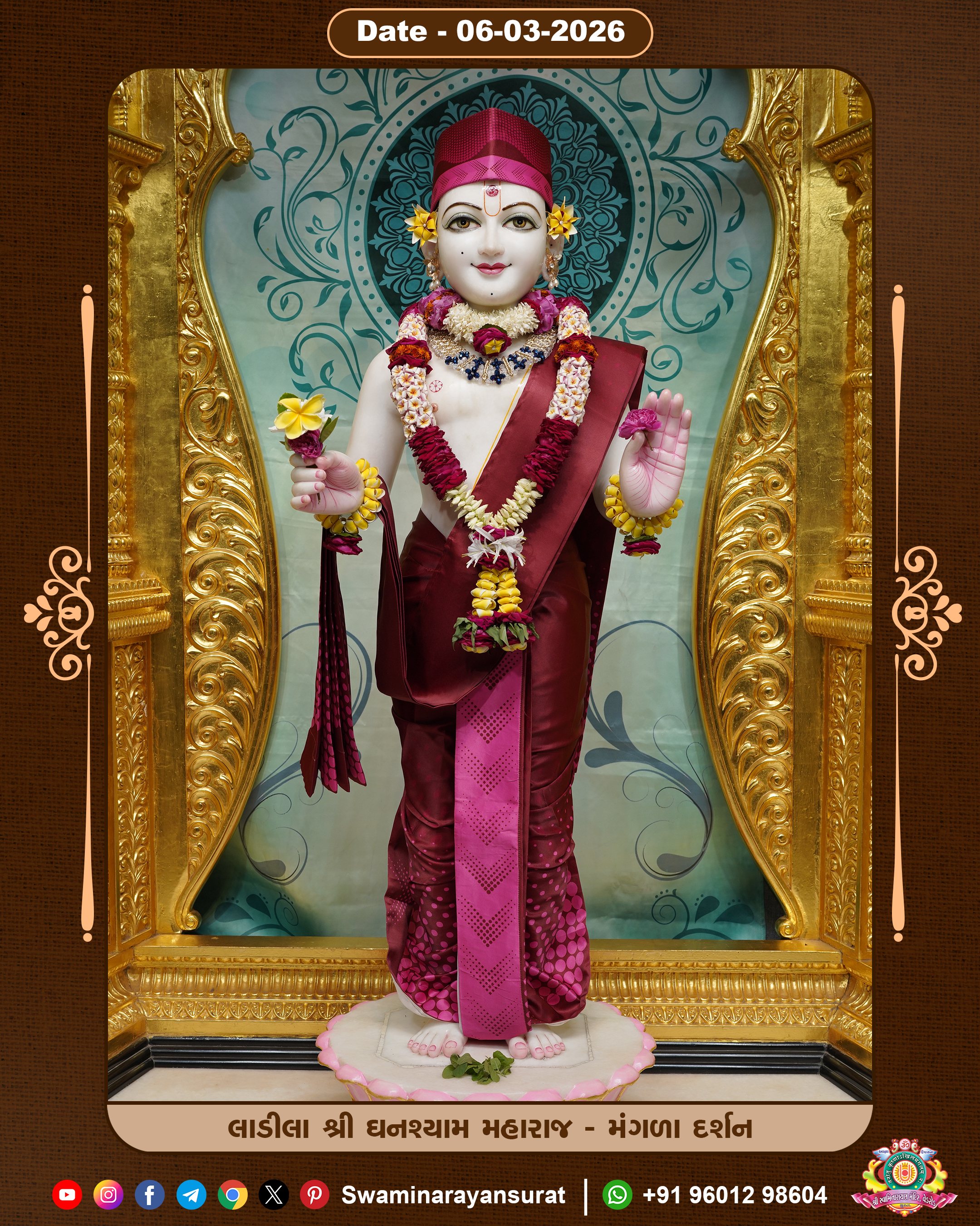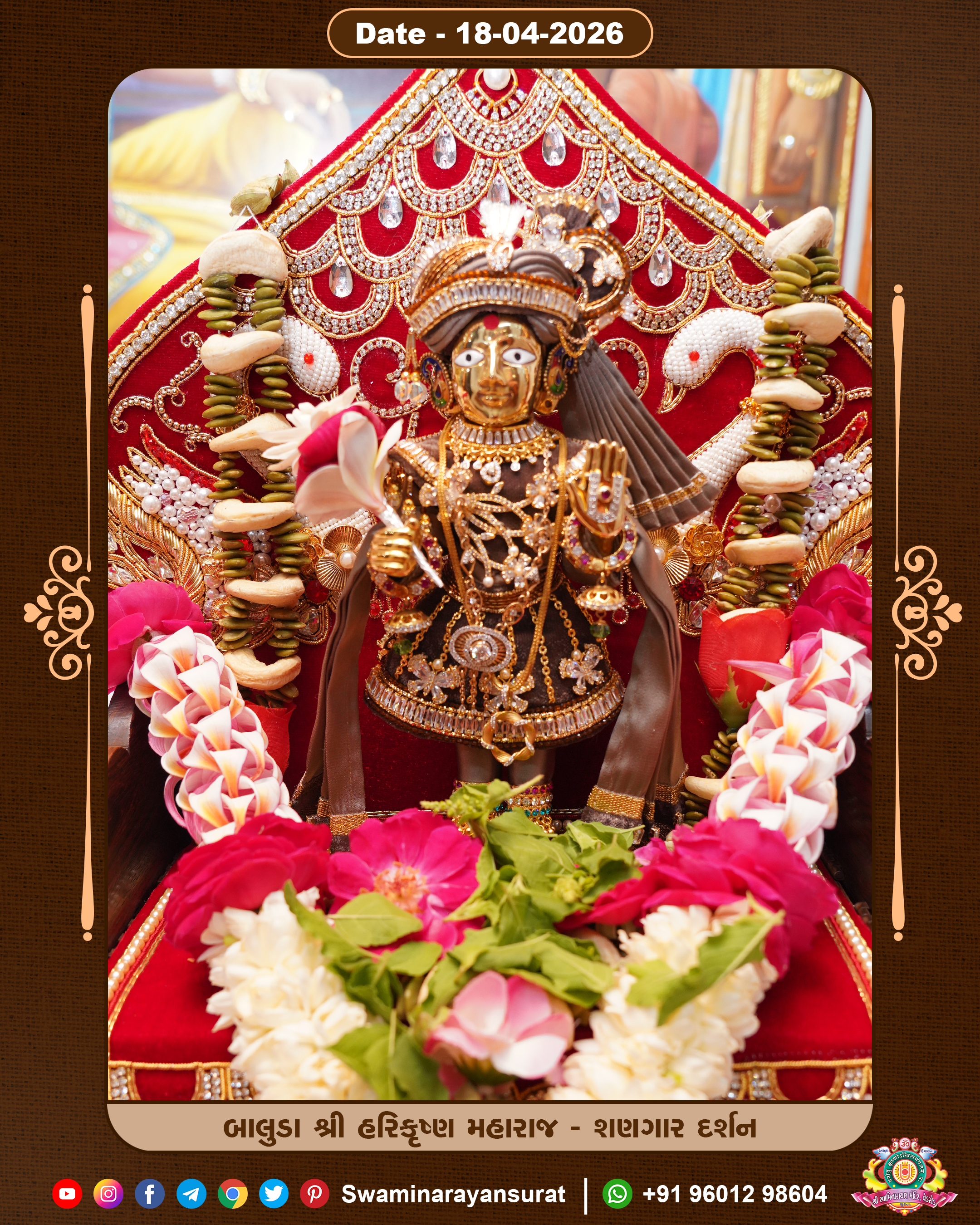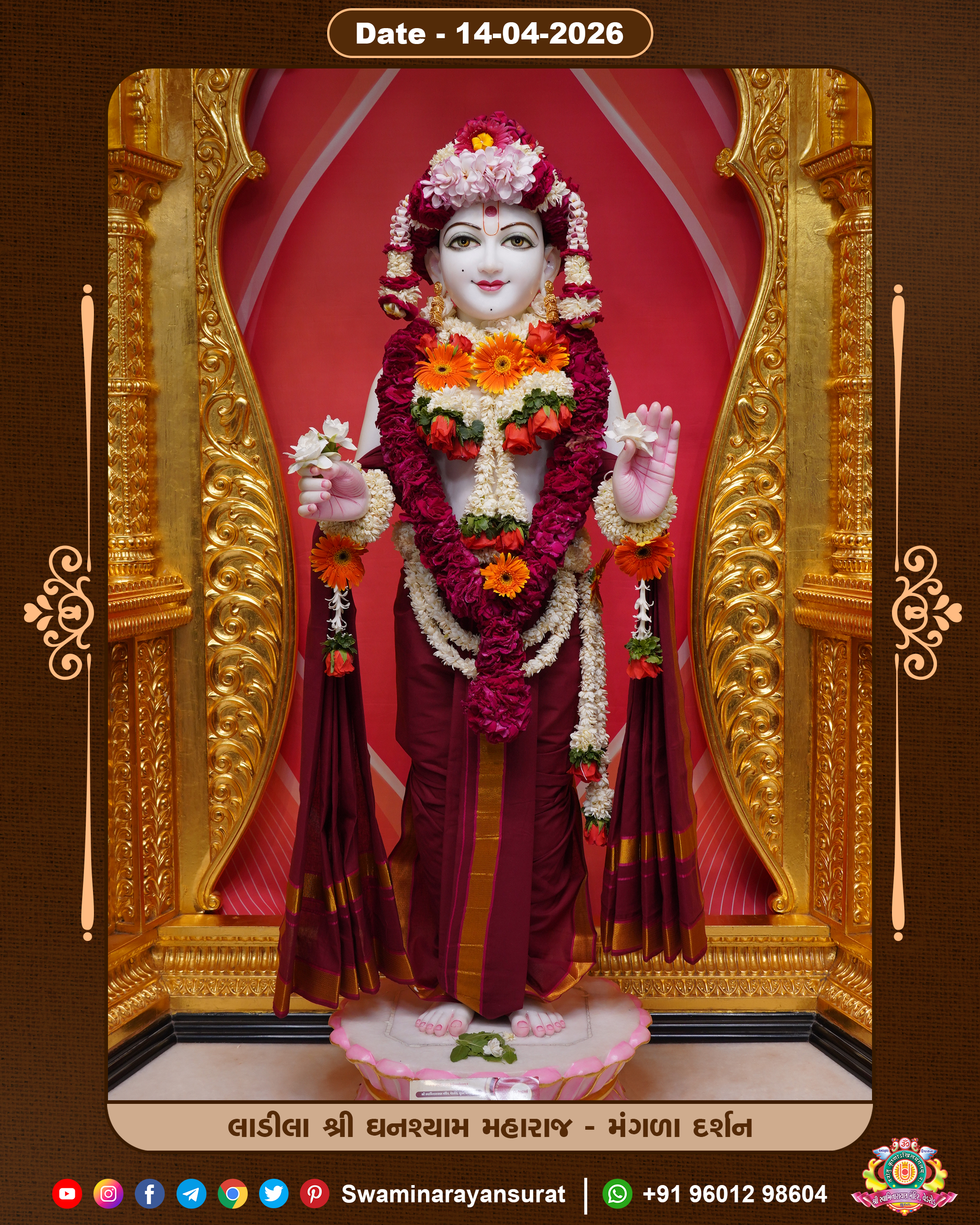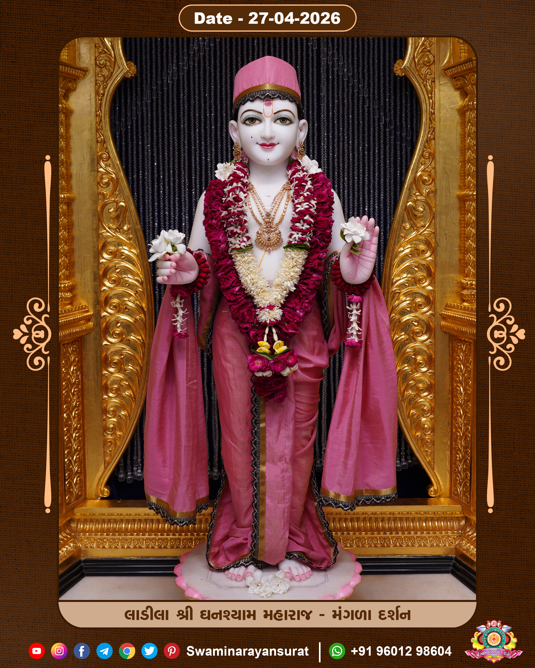 Shree Swaminarayan Temple, VedRoad is a Spiritual Organization Which falls under the region Of Vadtal Temple (The Headquarter Of Laxminarayan Dev Gadi). It is the First Organization Which is Constructed By Pink Stone With Beautiful and Marvellous Carving in Surat Of Swaminarayan Sampraday, Vadtal desh Which is increasing Pride & Prestige of Surat City, This temple contains One Main Shrine under which the idol of Ladila Shree Ghanshyam Maharaj is installed. P. Pu. Sadguru Shree Prabhucharandasji Swami is the Creator of this divine Organization. By the Several Activities & appearance Many devotees feels Easy in difficult Circumstances. He with his approx. 15 Saints & Devotees does Several Social & Spiritual Activities to fulfill the goal of Swaminarayan Sampraday, to do Worship with religious practices.