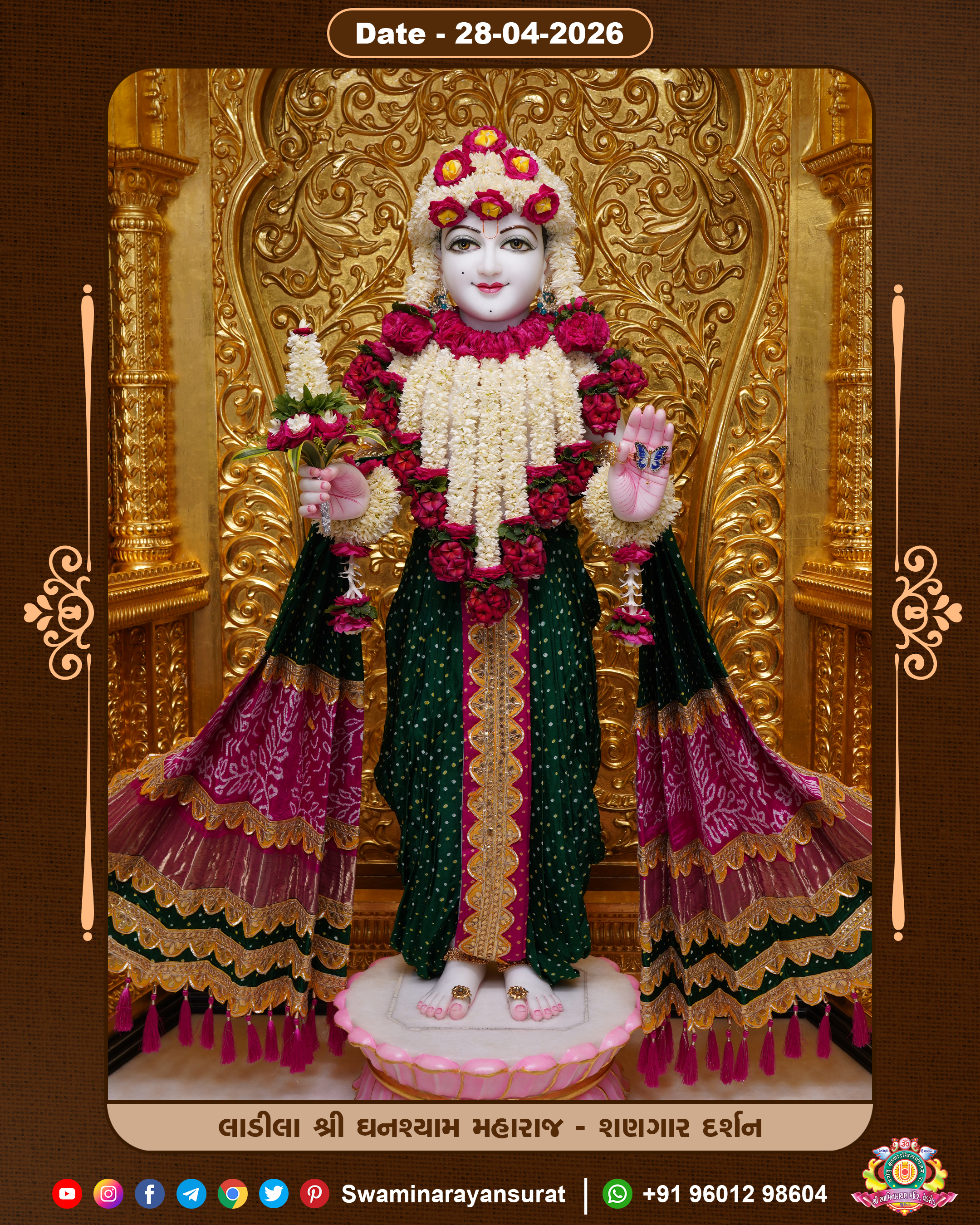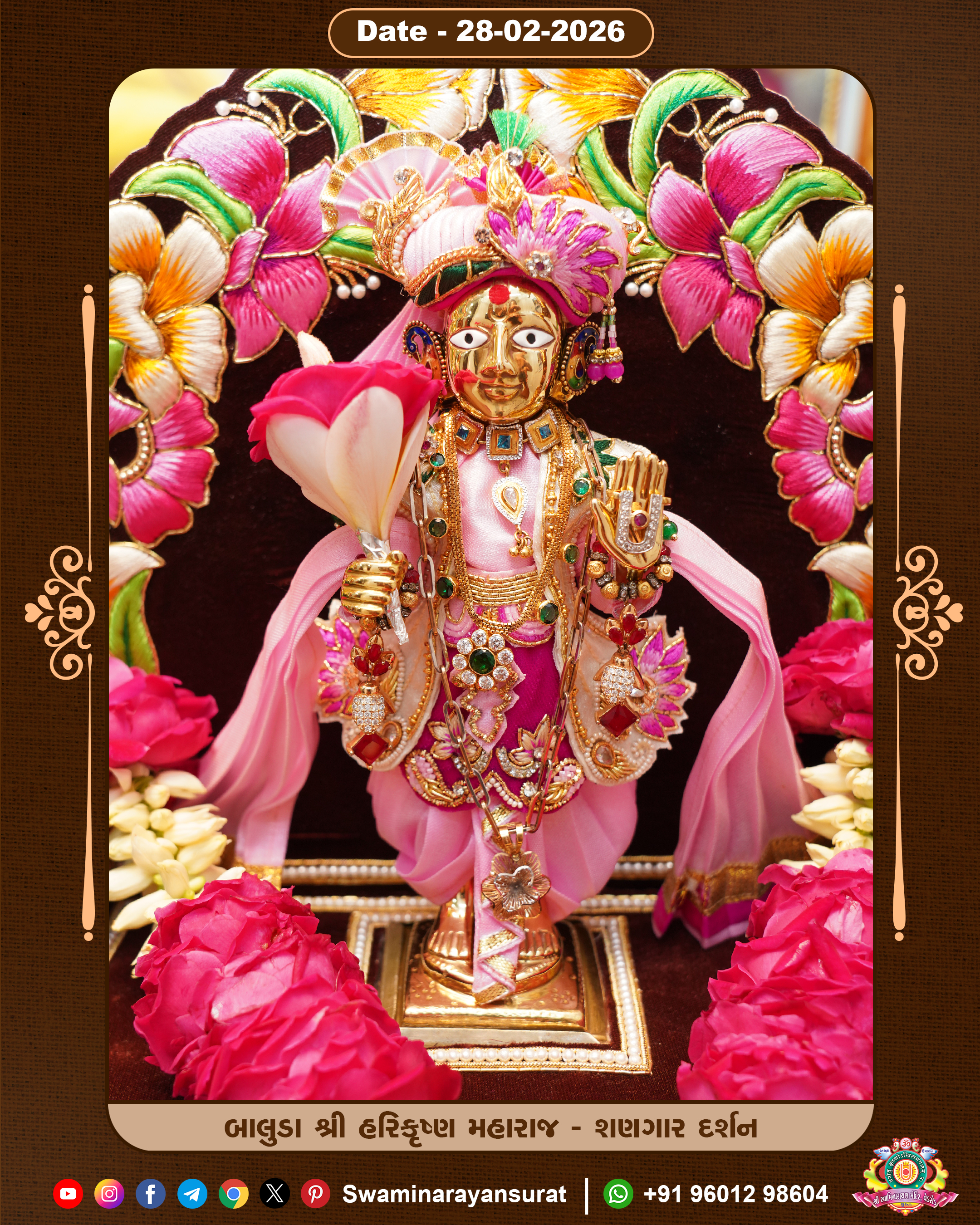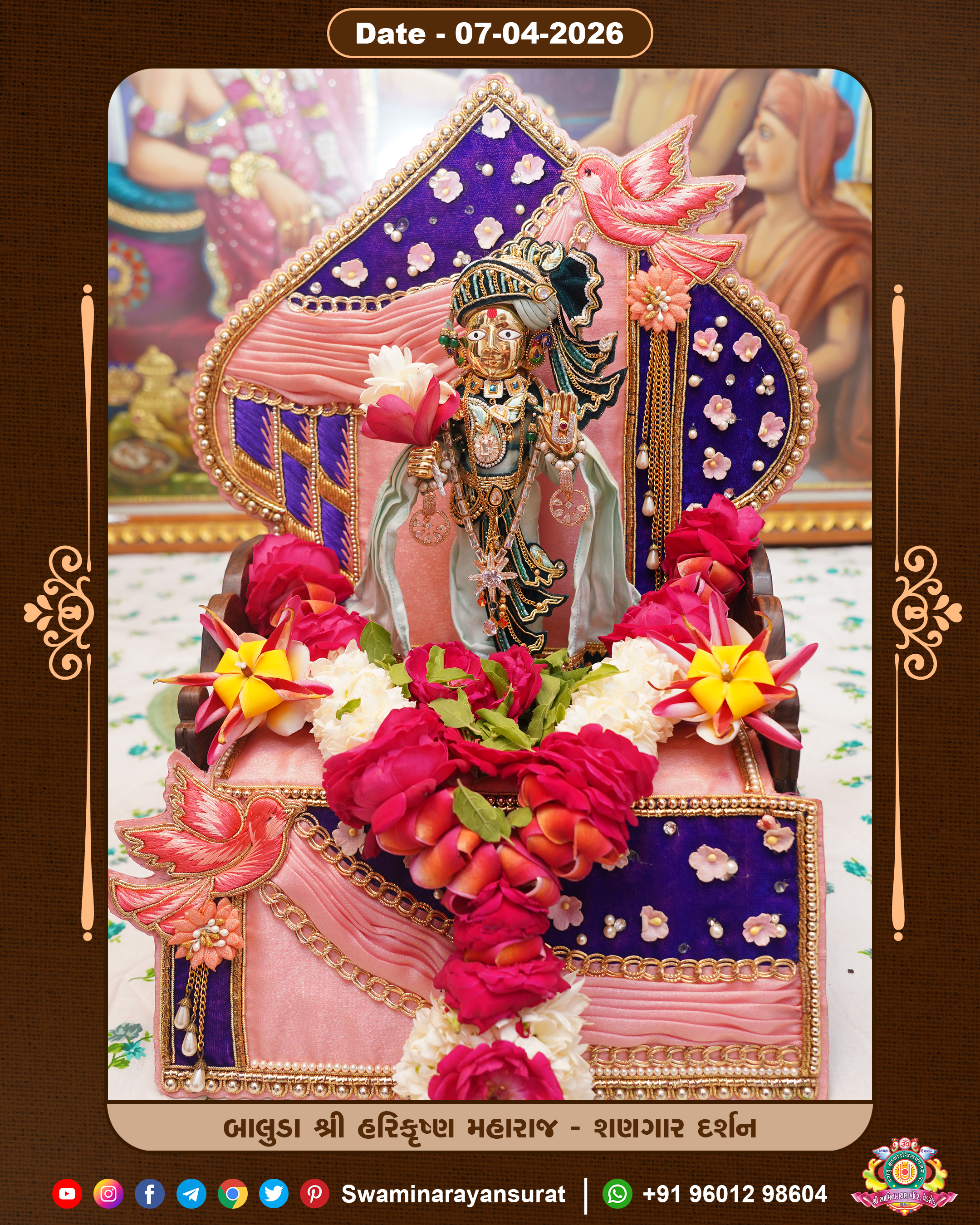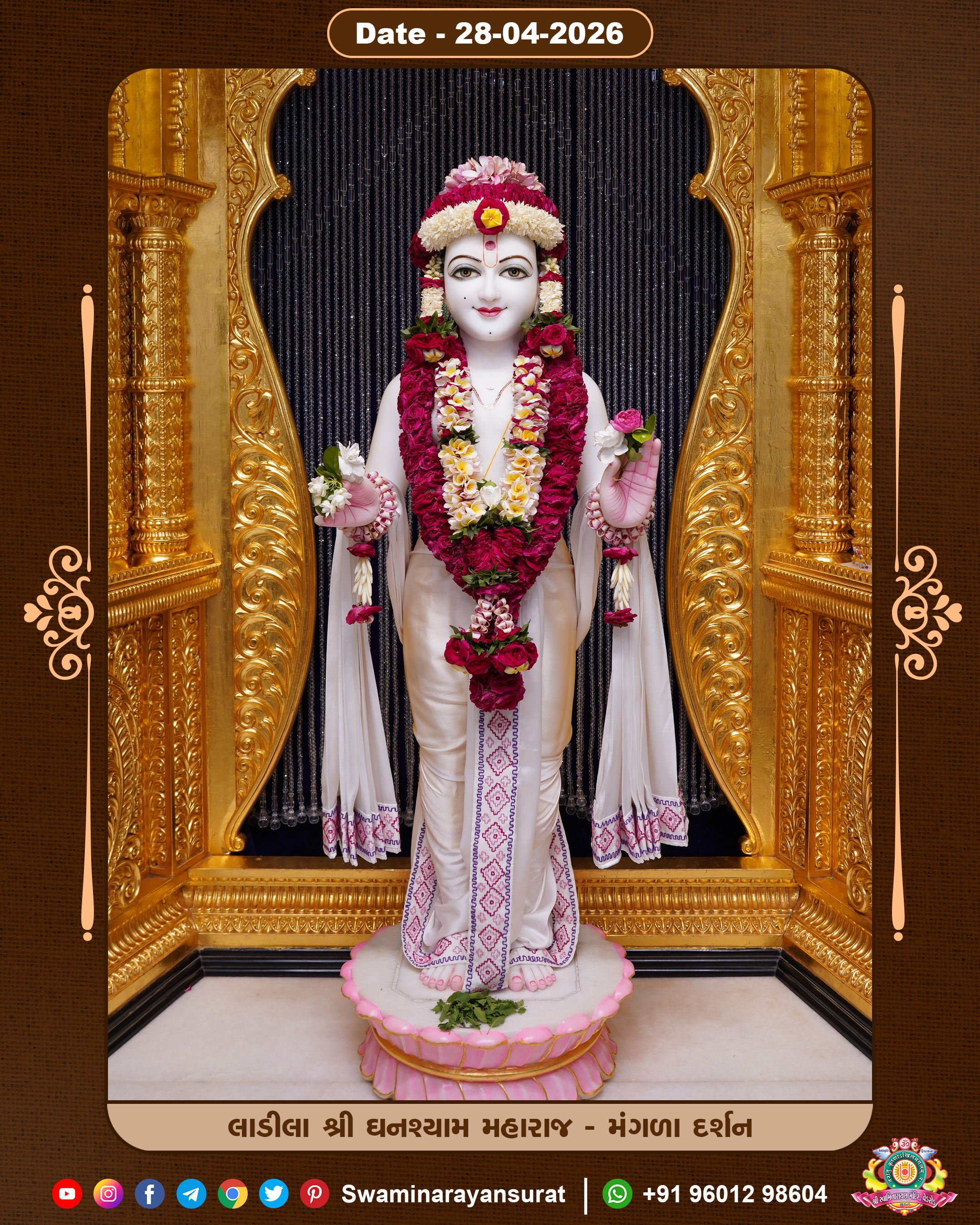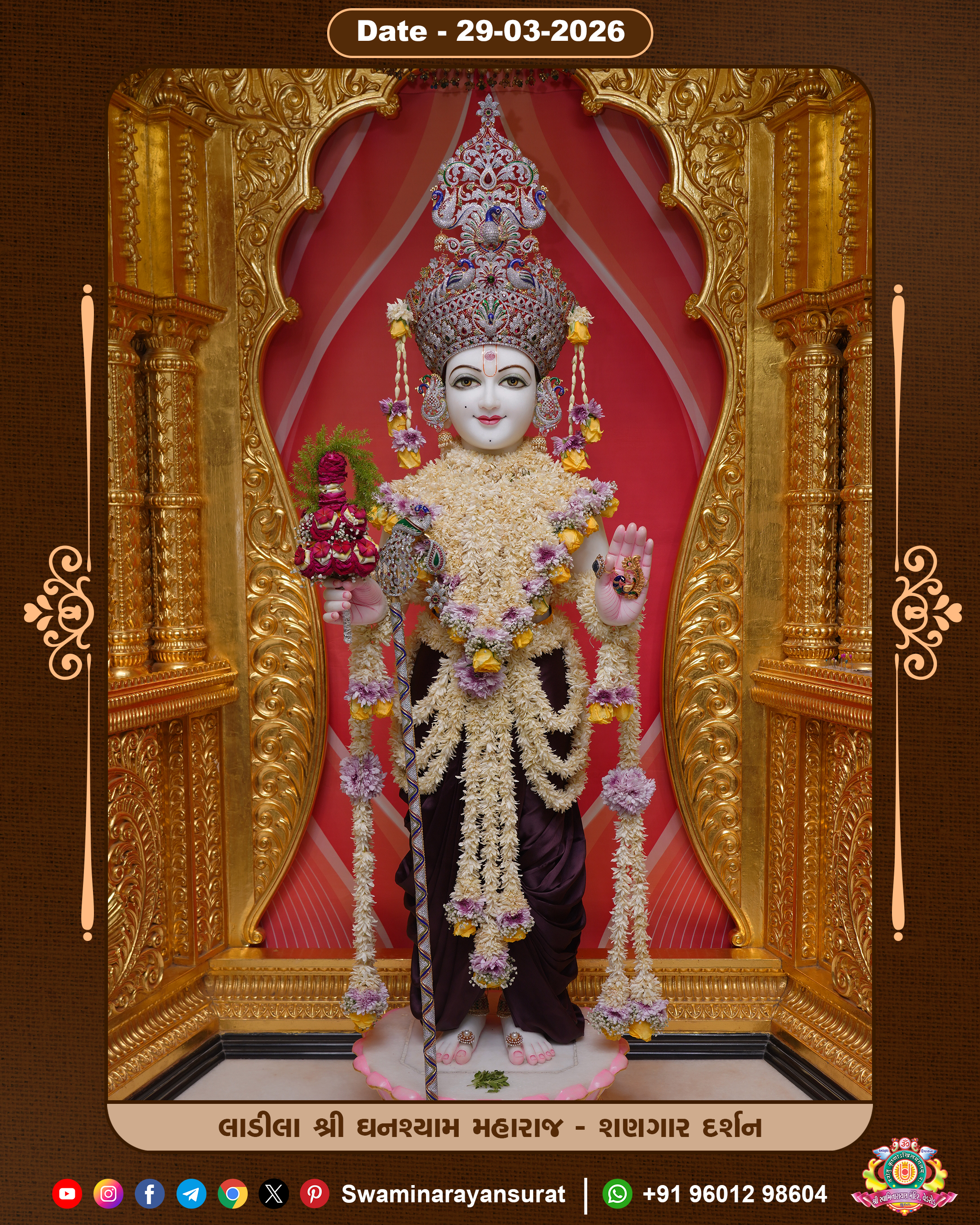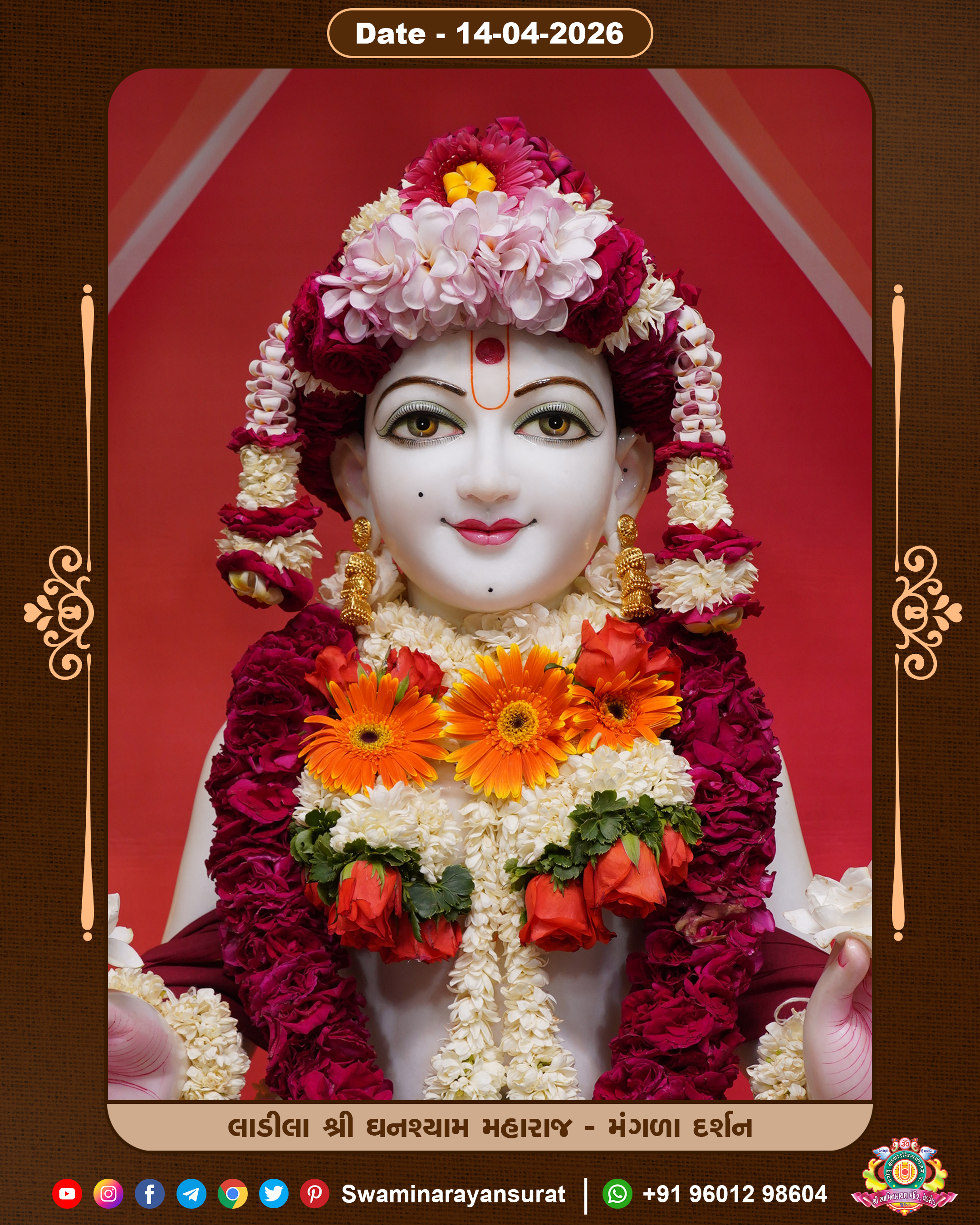 Shree Swaminarayan Temple, VedRoad is a Spiritual Organization Which falls under the region Of Vadtal Temple (The Headquarter Of Laxminarayan Dev Gadi). It is the First Organization Which is Constructed By Pink Stone With Beautiful and Marvellous Carving in Surat Of Swaminarayan Sampraday, Vadtal desh Which is increasing Pride & Prestige of Surat City, This temple contains One Main Shrine under which the idol of Ladila Shree Ghanshyam Maharaj is installed. P. Pu. Sadguru Shree Prabhucharandasji Swami is the Creator of this divine Organization. By the Several Activities & appearance Many devotees feels Easy in difficult Circumstances. He with his approx. 15 Saints & Devotees does Several Social & Spiritual Activities to fulfill the goal of Swaminarayan Sampraday, to do Worship with religious practices.