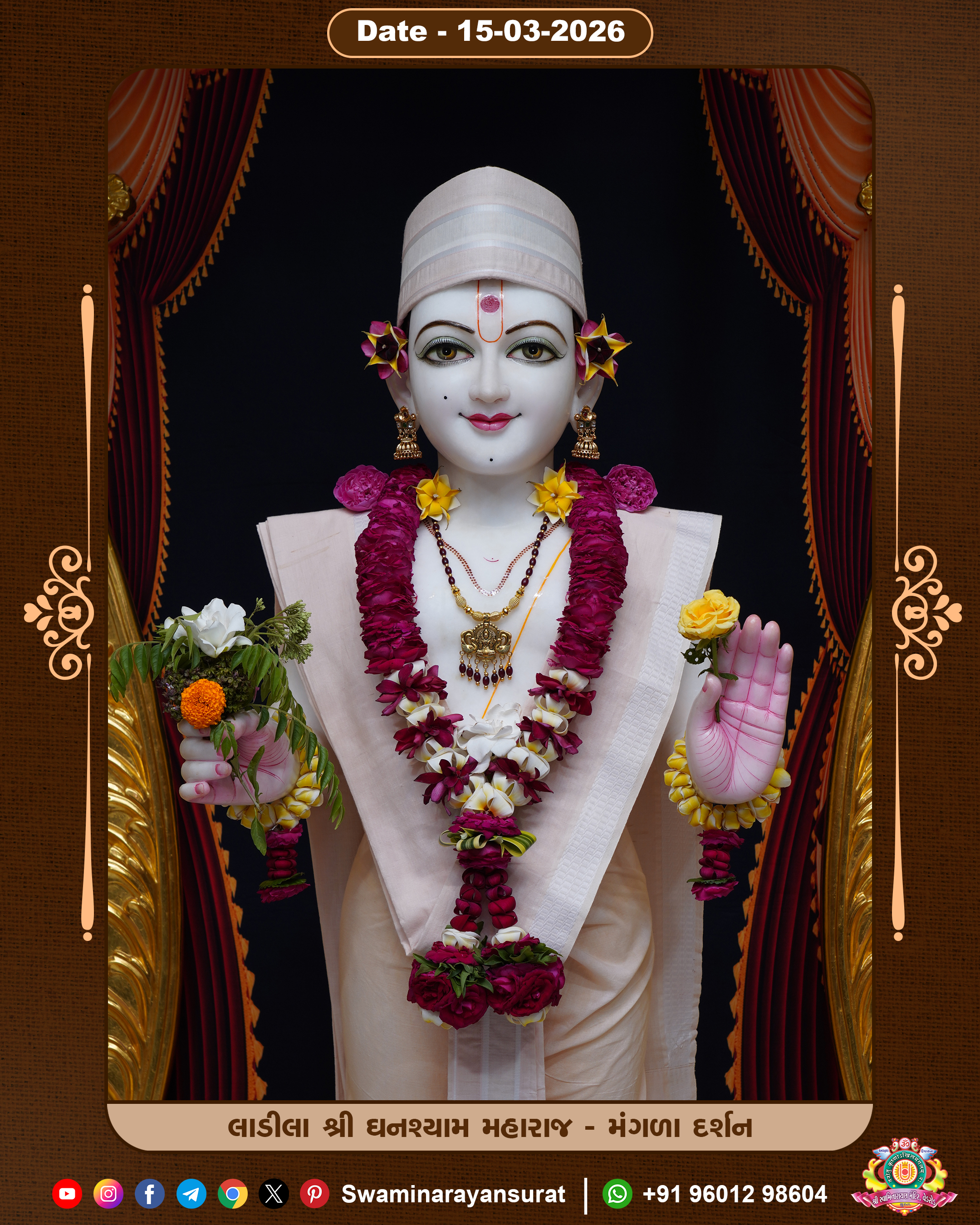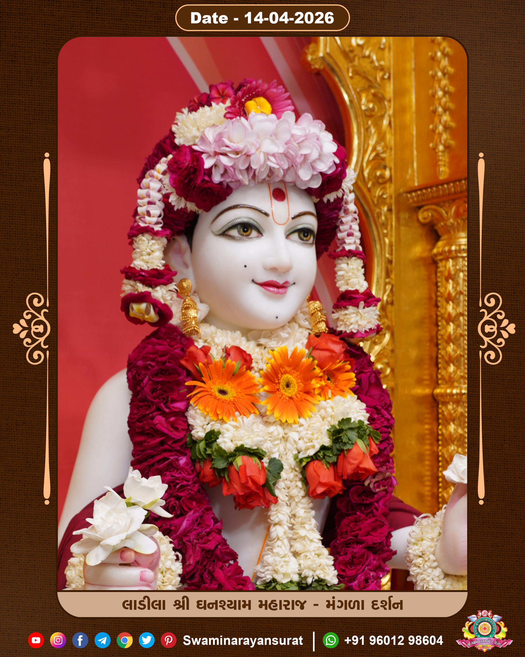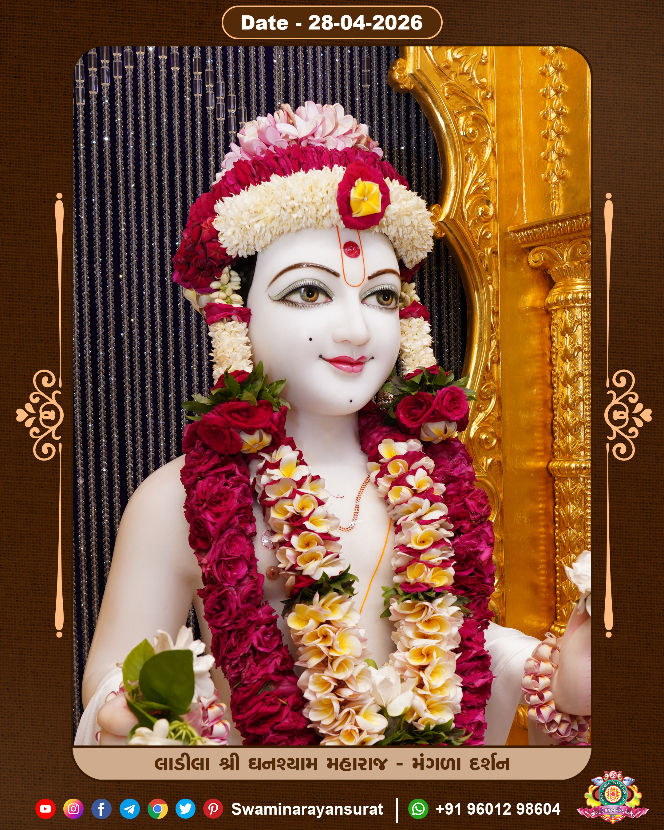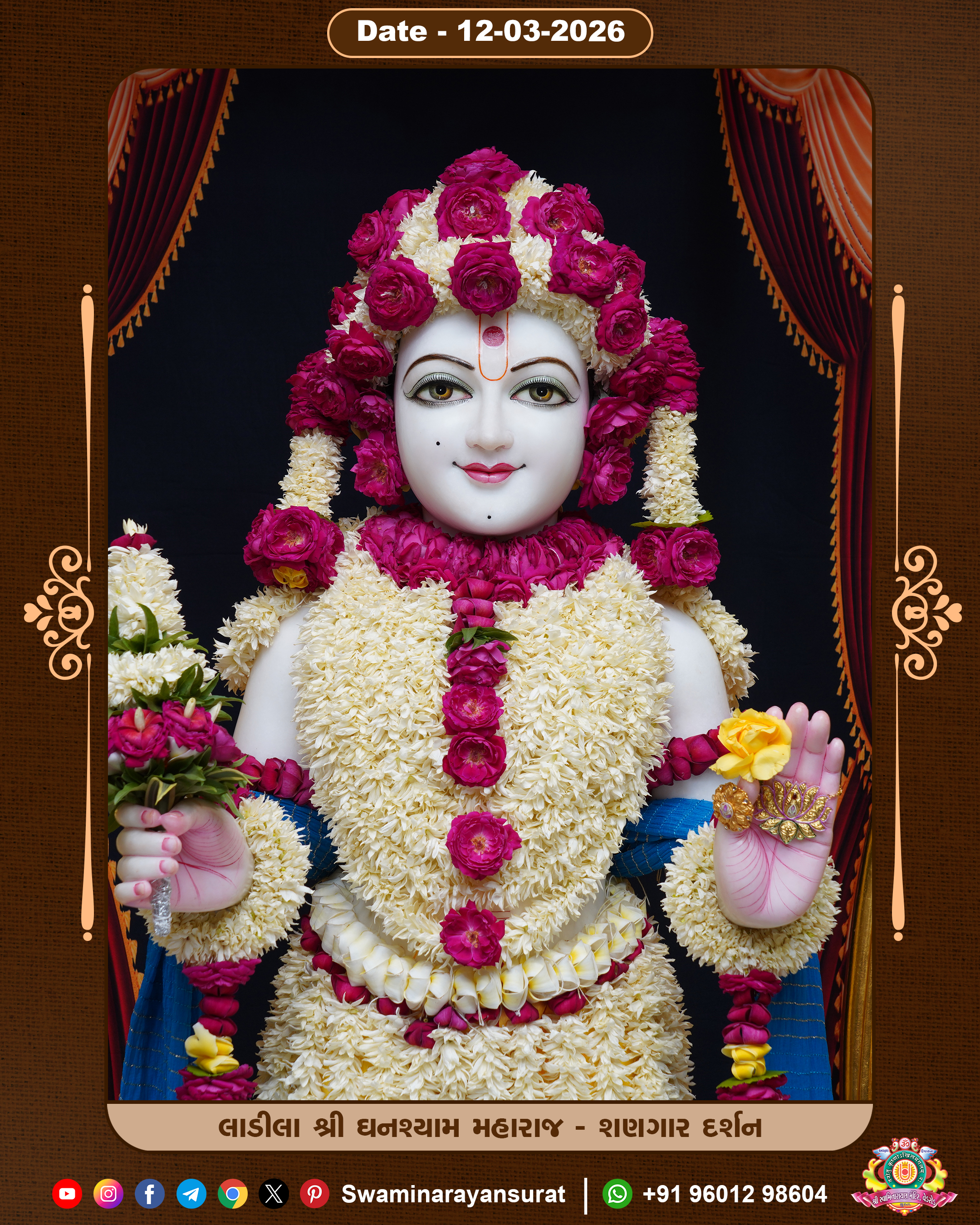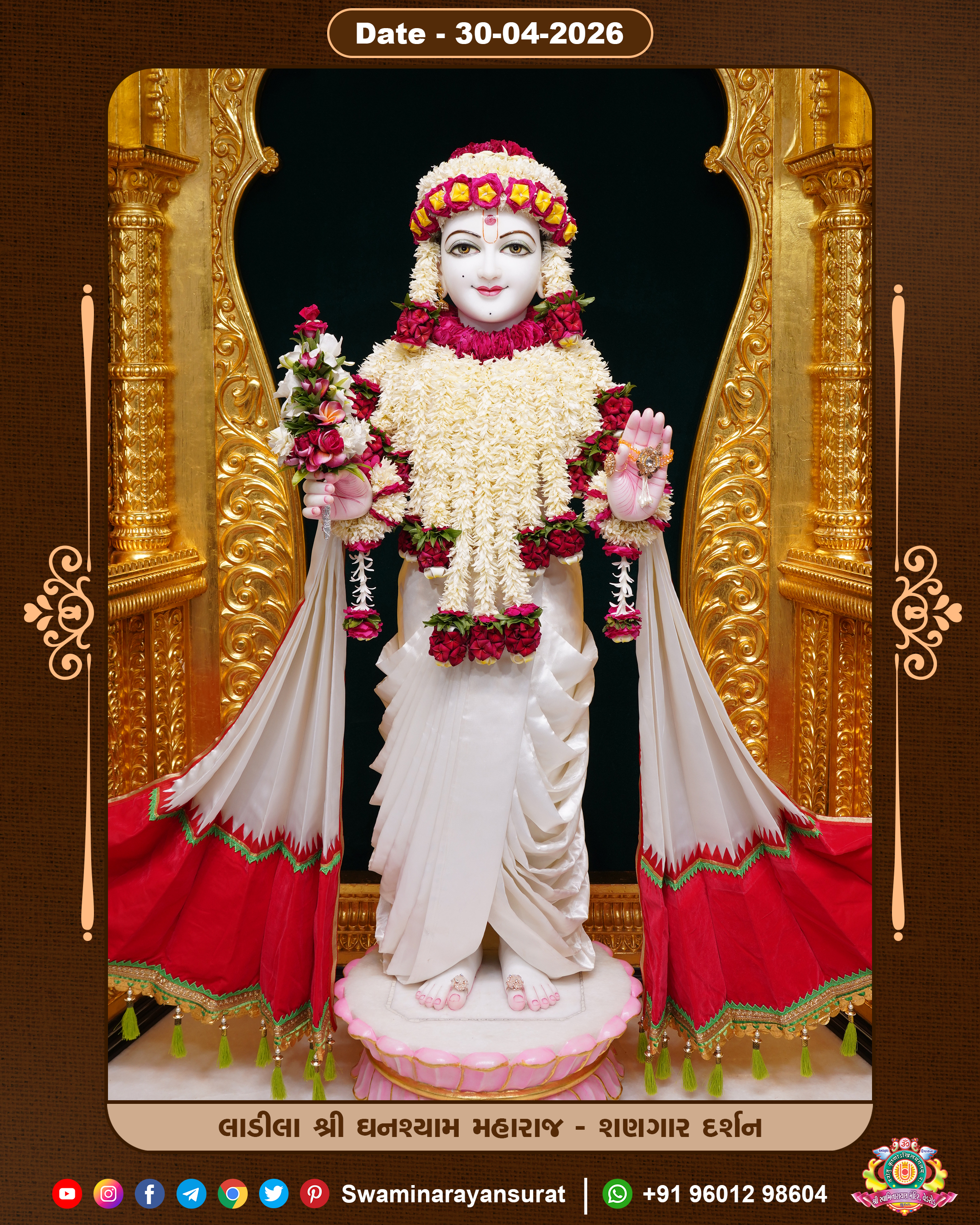 Shree Swaminarayan Temple, VedRoad is a Spiritual Organization Which falls under the region Of Vadtal Temple (The Headquarter Of Laxminarayan Dev Gadi). It is the First Organization Which is Constructed By Pink Stone With Beautiful and Marvellous Carving in Surat Of Swaminarayan Sampraday, Vadtal desh Which is increasing Pride & Prestige of Surat City, This temple contains One Main Shrine under which the idol of Ladila Shree Ghanshyam Maharaj is installed. P. Pu. Sadguru Shree Prabhucharandasji Swami is the Creator of this divine Organization. By the Several Activities & appearance Many devotees feels Easy in difficult Circumstances. He with his approx. 15 Saints & Devotees does Several Social & Spiritual Activities to fulfill the goal of Swaminarayan Sampraday, to do Worship with religious practices.