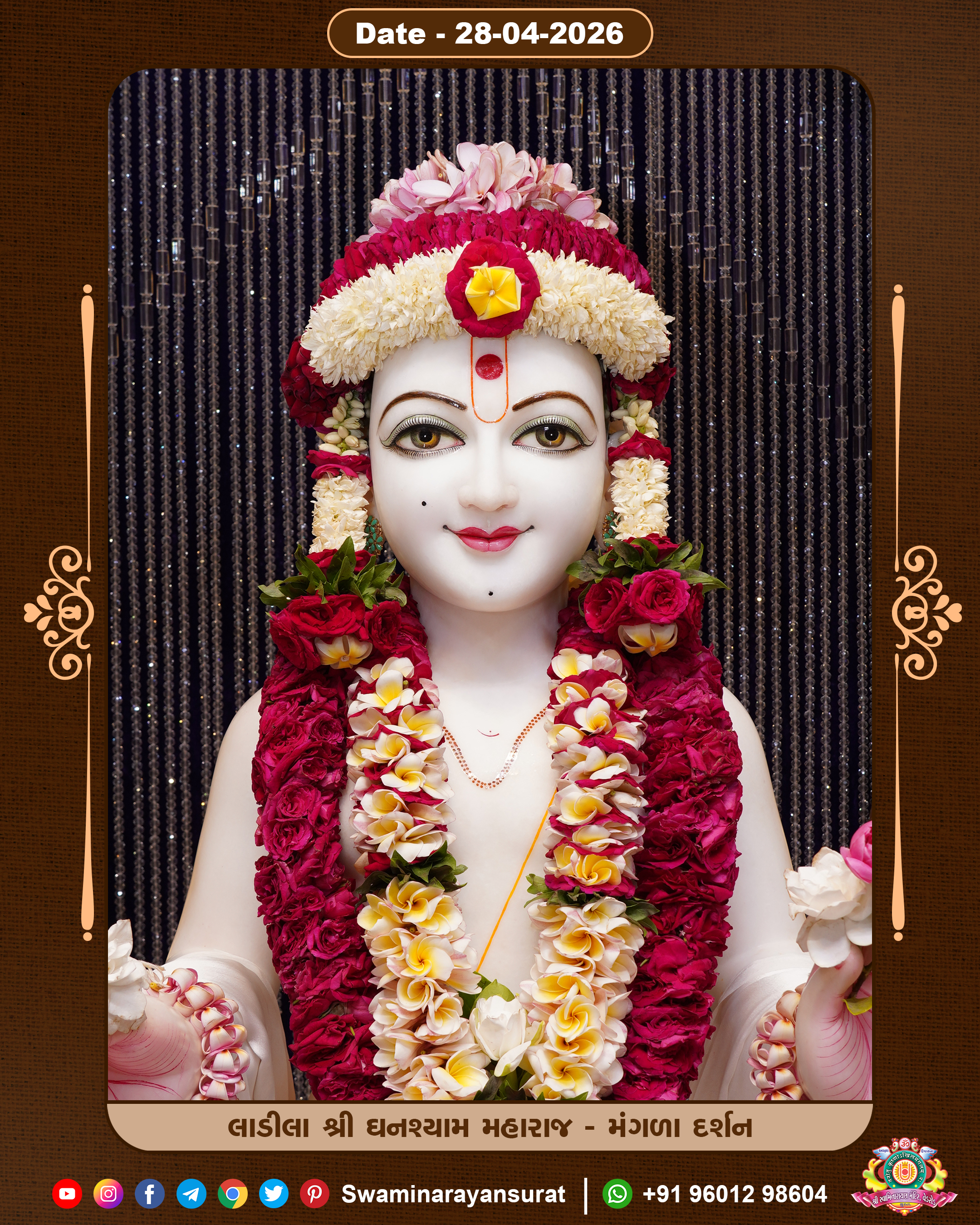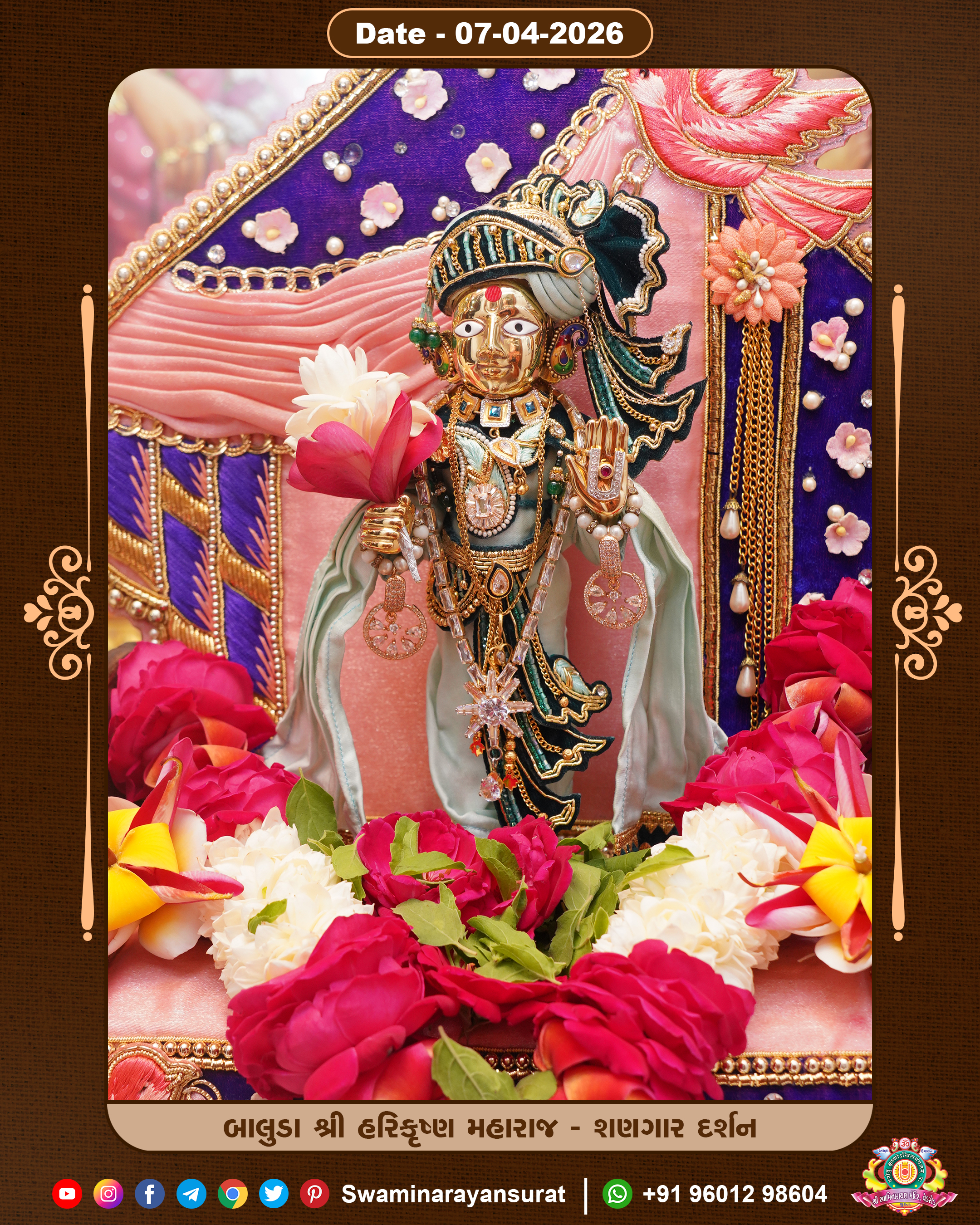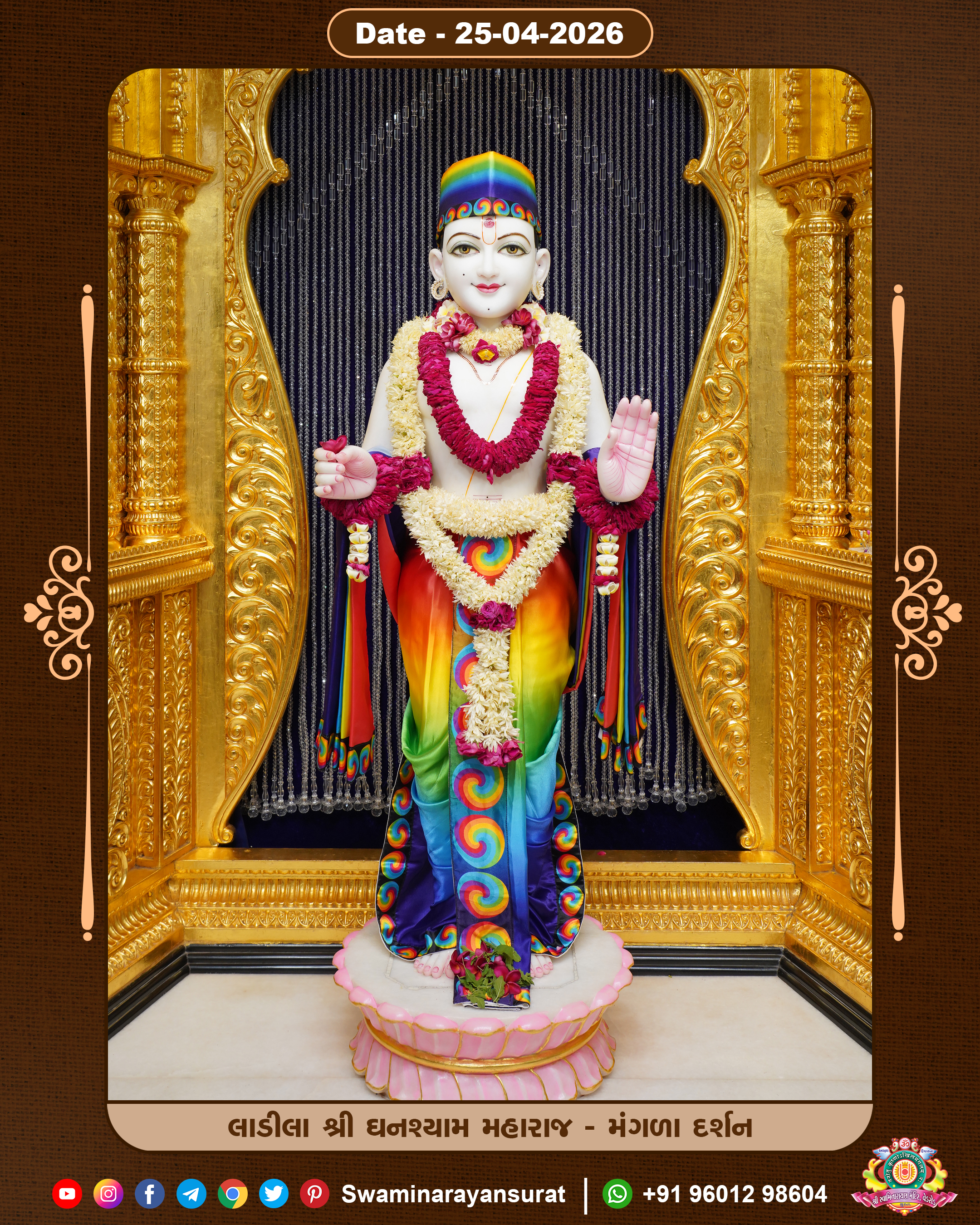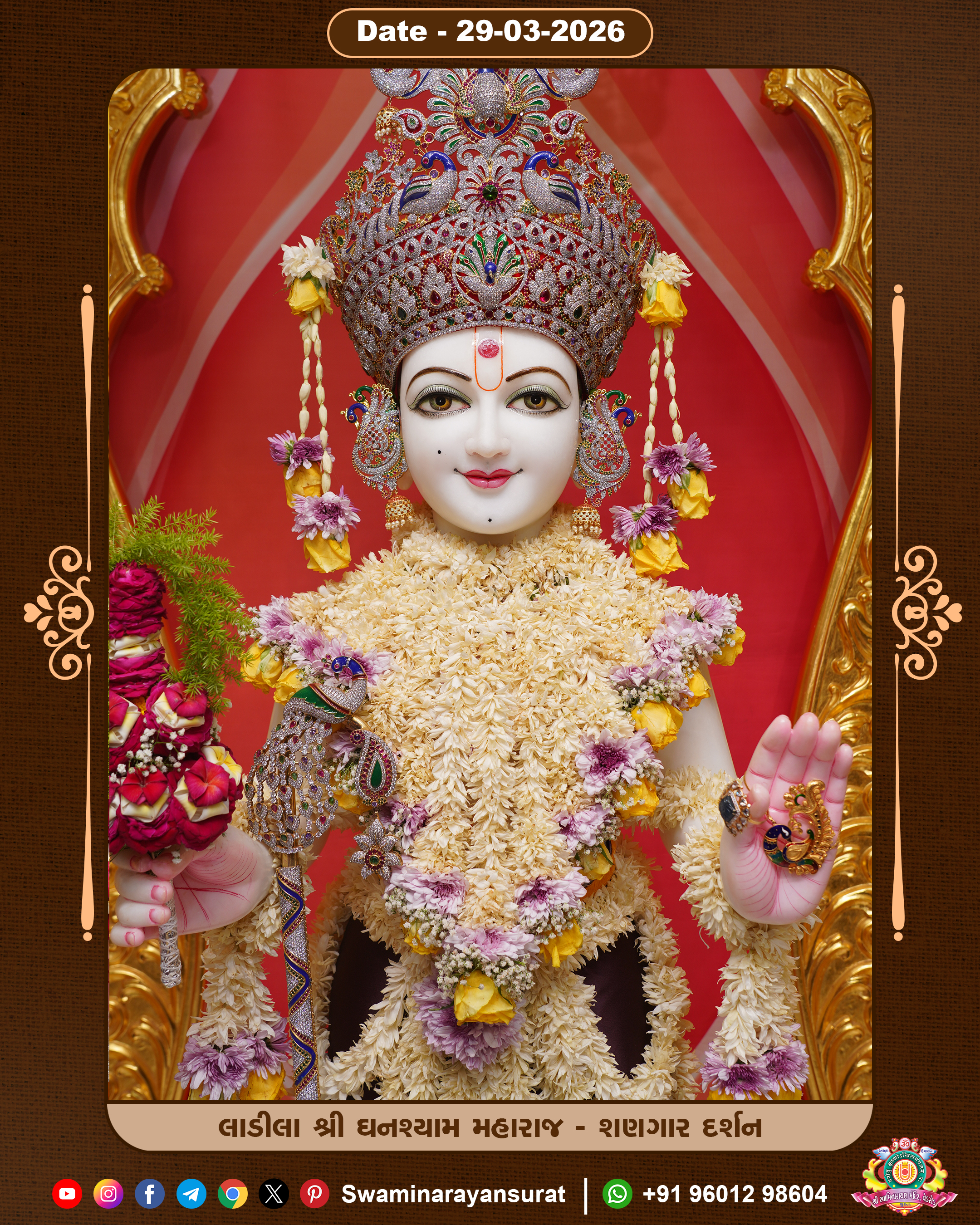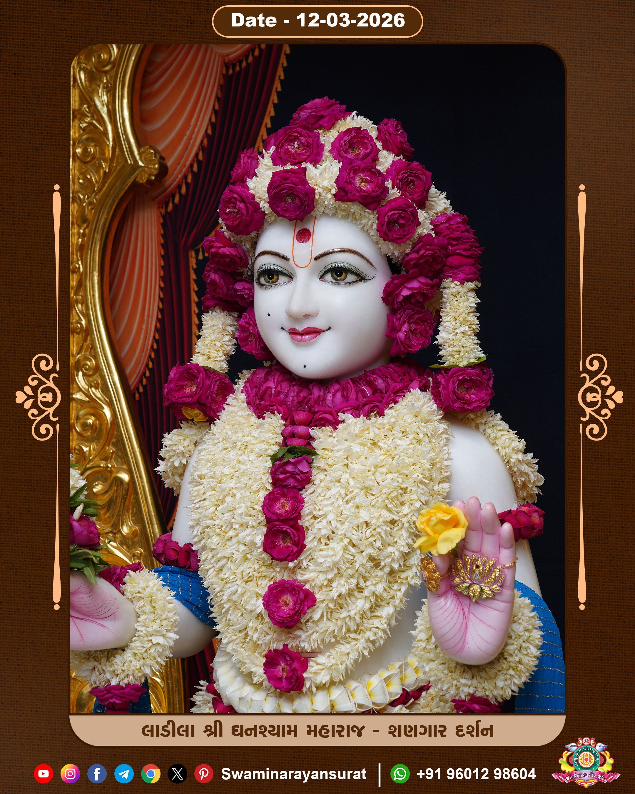Shree Swaminarayan Temple, VedRoad is a Spiritual Organization Which falls under the region Of Vadtal Temple (The Headquarter Of Laxminarayan Dev Gadi). It is the First Organization Which is Constructed By Pink Stone With Beautiful and Marvellous Carving in Surat Of Swaminarayan Sampraday, Vadtal desh Which is increasing Pride & Prestige of Surat City, This temple contains One Main Shrine under which the idol of Ladila Shree Ghanshyam Maharaj is installed. P. Pu. Sadguru Shree Prabhucharandasji Swami is the Creator of this divine Organization. By the Several Activities & appearance Many devotees feels Easy in difficult Circumstances. He with his approx. 15 Saints & Devotees does Several Social & Spiritual Activities to fulfill the goal of Swaminarayan Sampraday, to do Worship with religious practices.