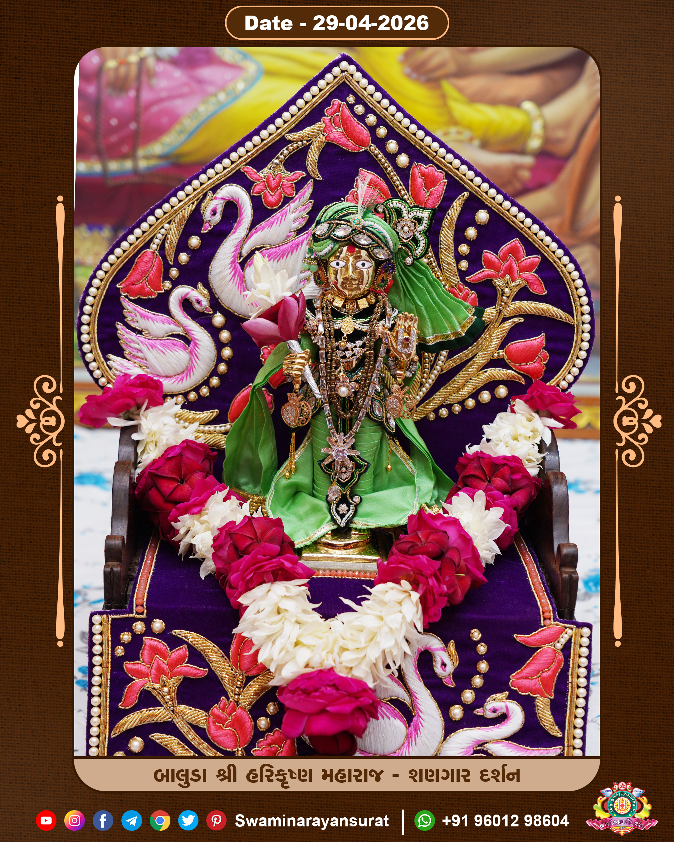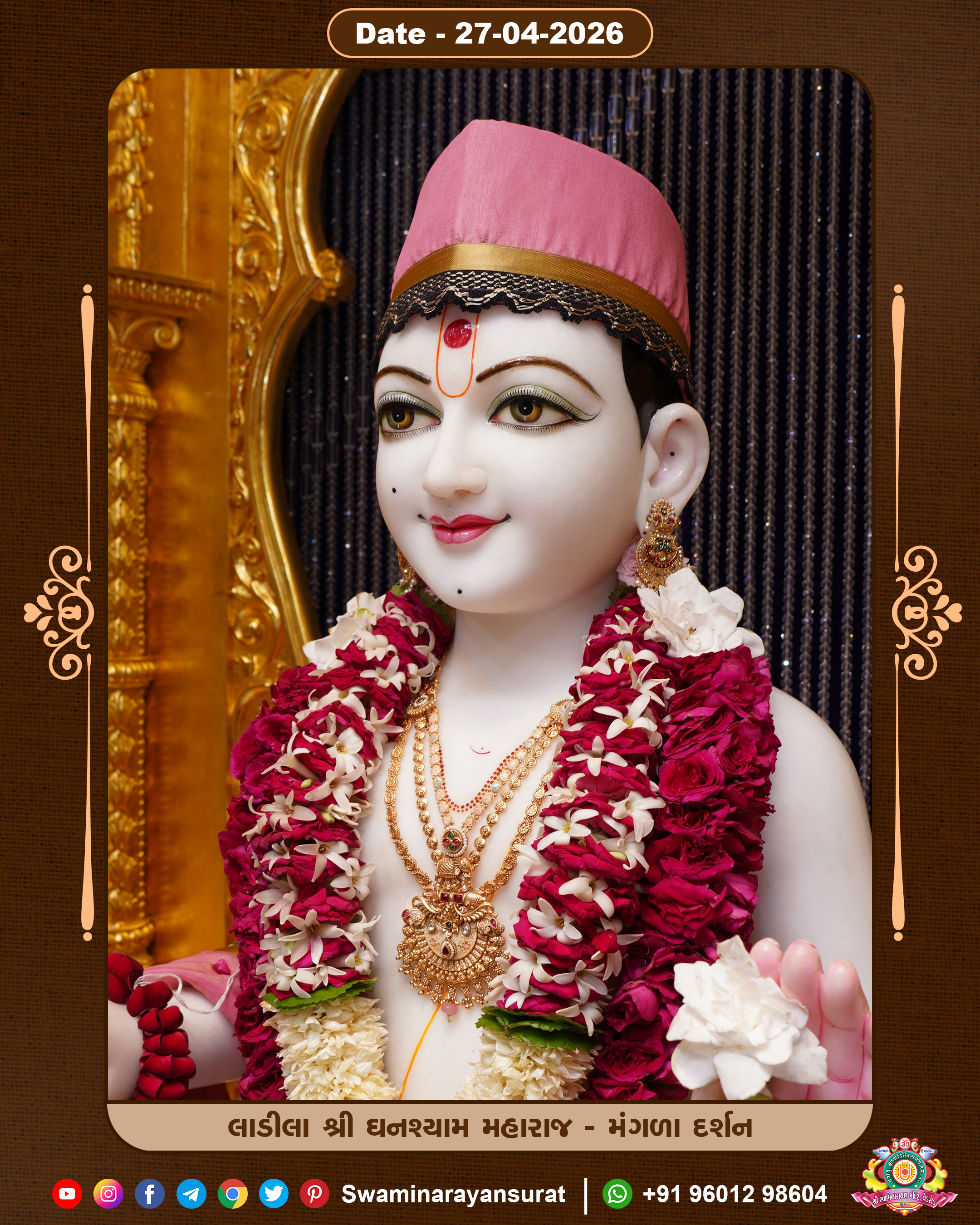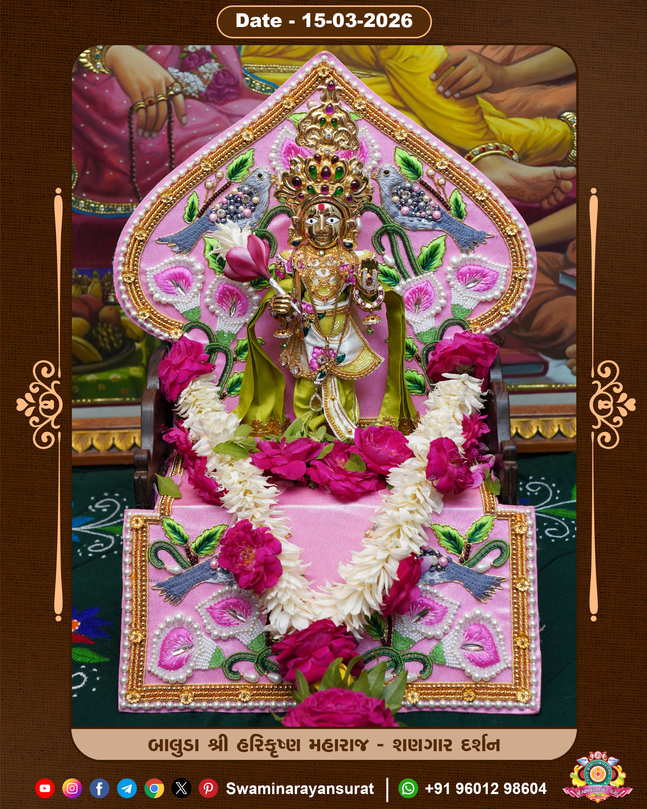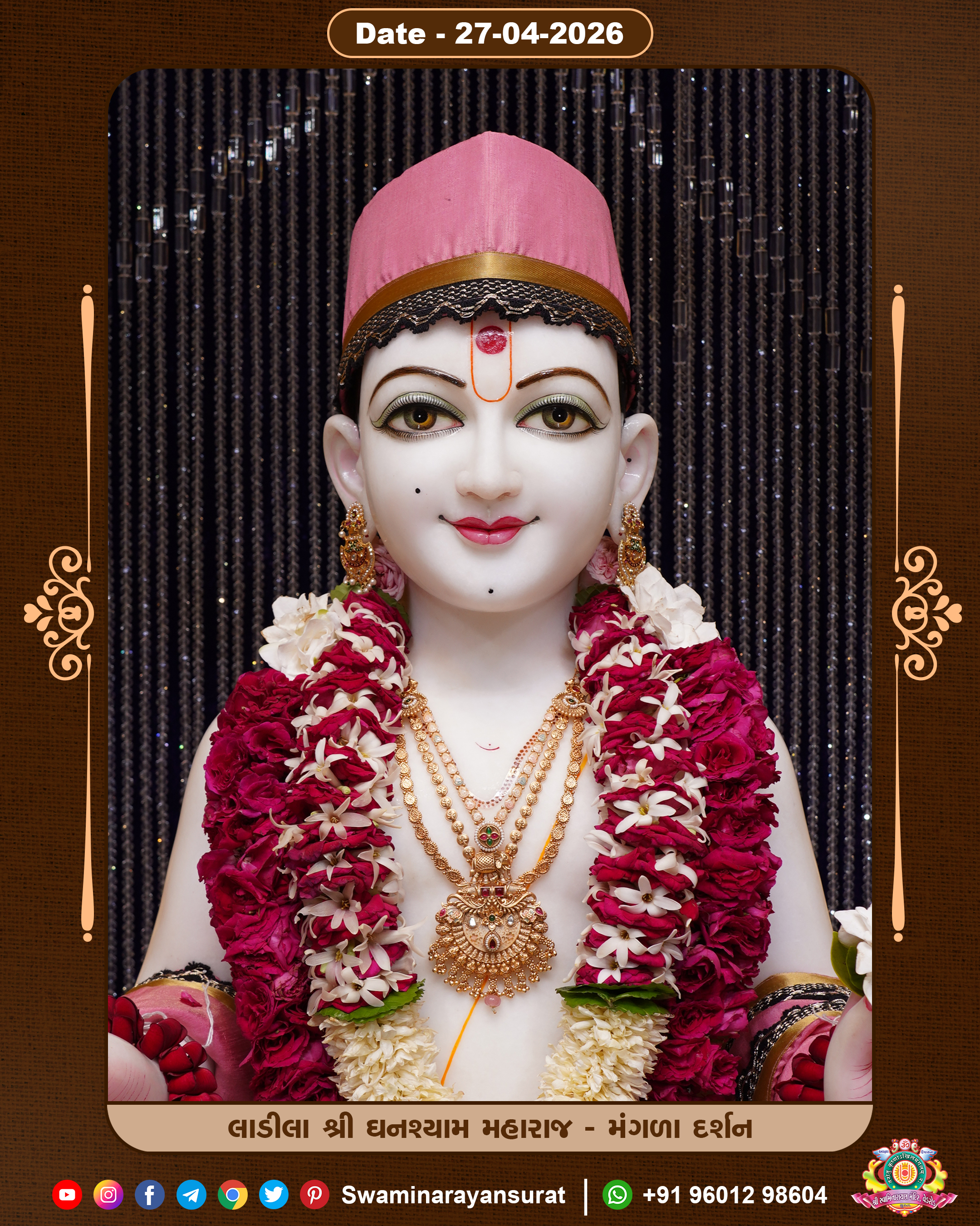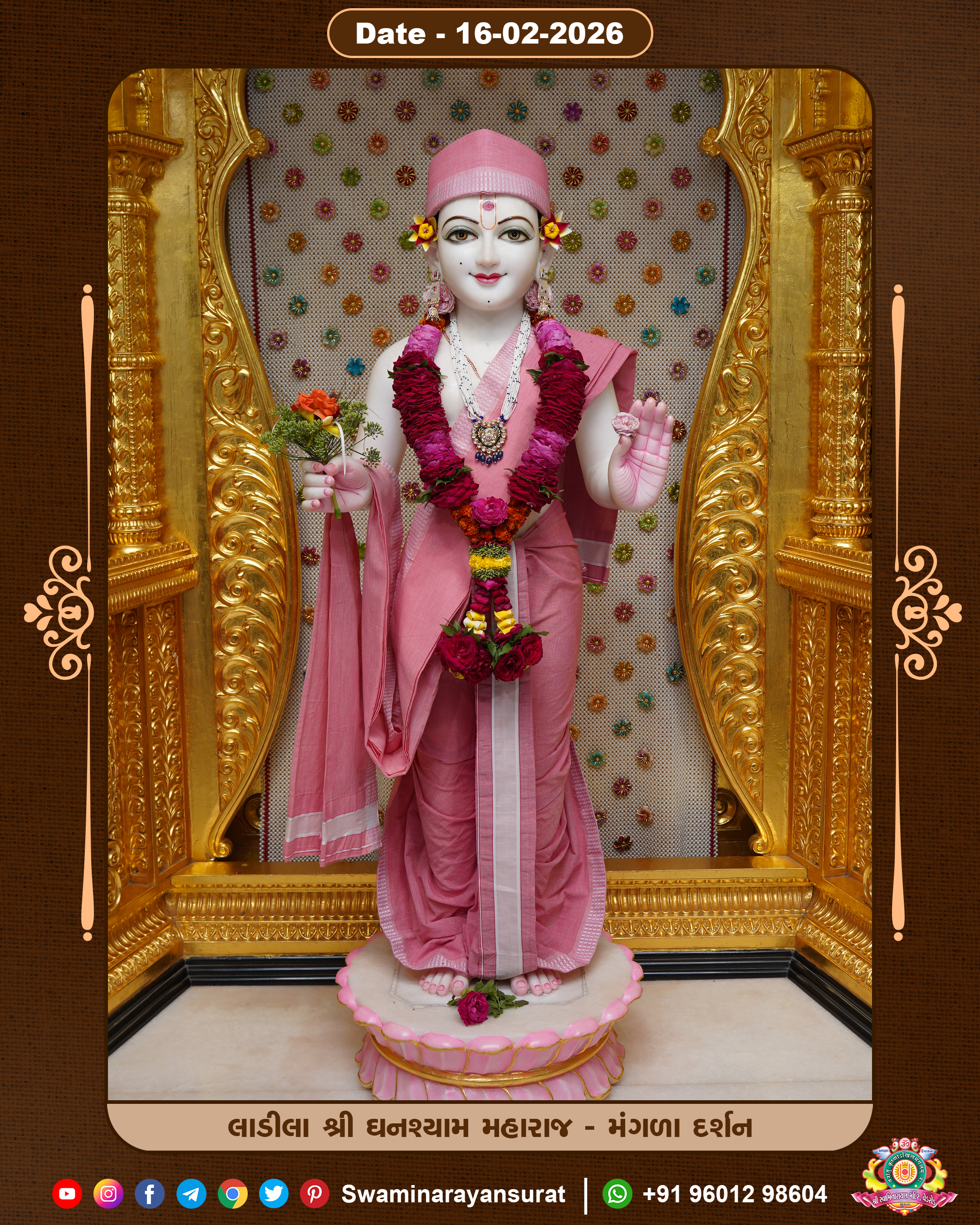 Shree Swaminarayan Temple, VedRoad is a Spiritual Organization Which falls under the region Of Vadtal Temple (The Headquarter Of Laxminarayan Dev Gadi). It is the First Organization Which is Constructed By Pink Stone With Beautiful and Marvellous Carving in Surat Of Swaminarayan Sampraday, Vadtal desh Which is increasing Pride & Prestige of Surat City, This temple contains One Main Shrine under which the idol of Ladila Shree Ghanshyam Maharaj is installed. P. Pu. Sadguru Shree Prabhucharandasji Swami is the Creator of this divine Organization. By the Several Activities & appearance Many devotees feels Easy in difficult Circumstances. He with his approx. 15 Saints & Devotees does Several Social & Spiritual Activities to fulfill the goal of Swaminarayan Sampraday, to do Worship with religious practices.