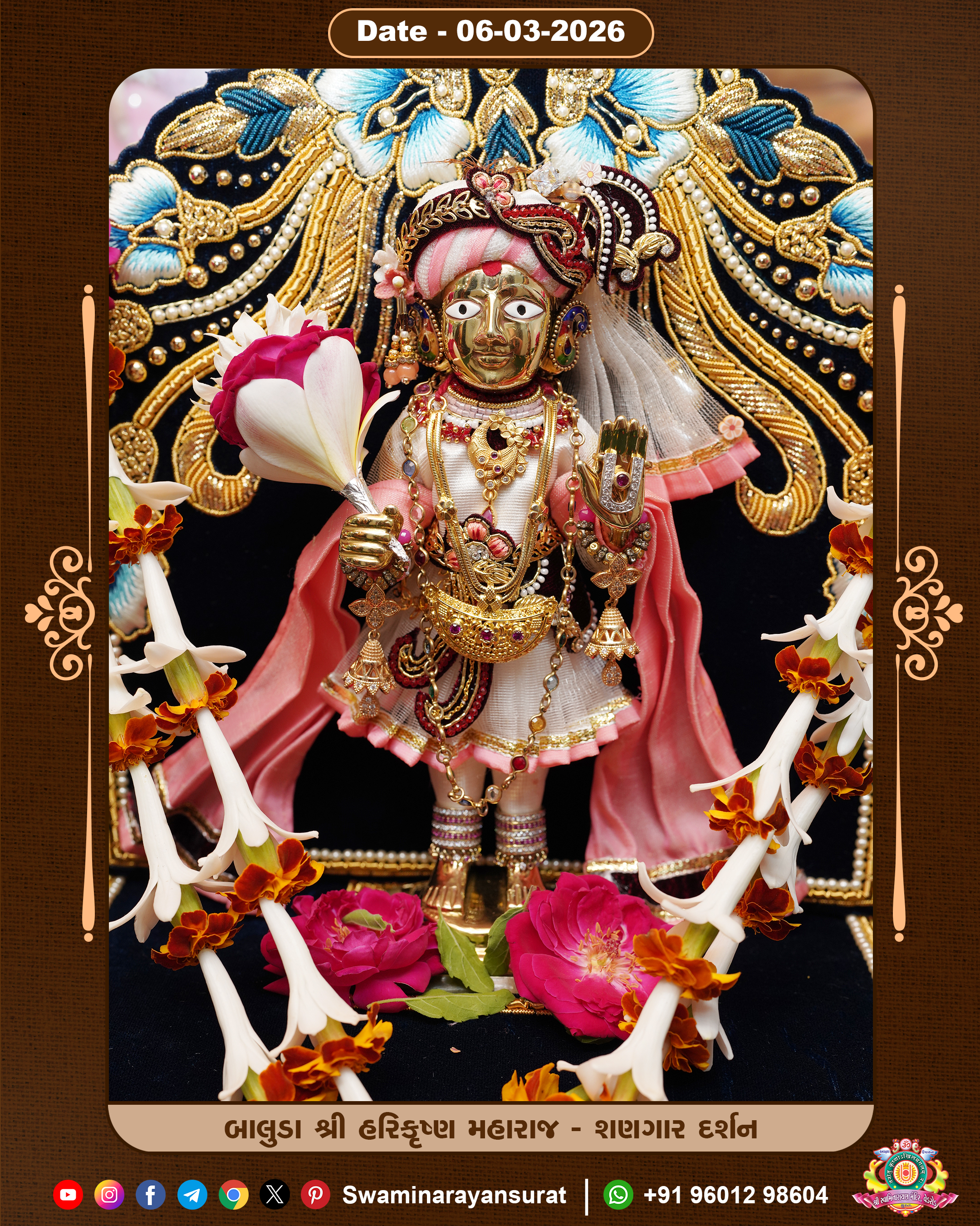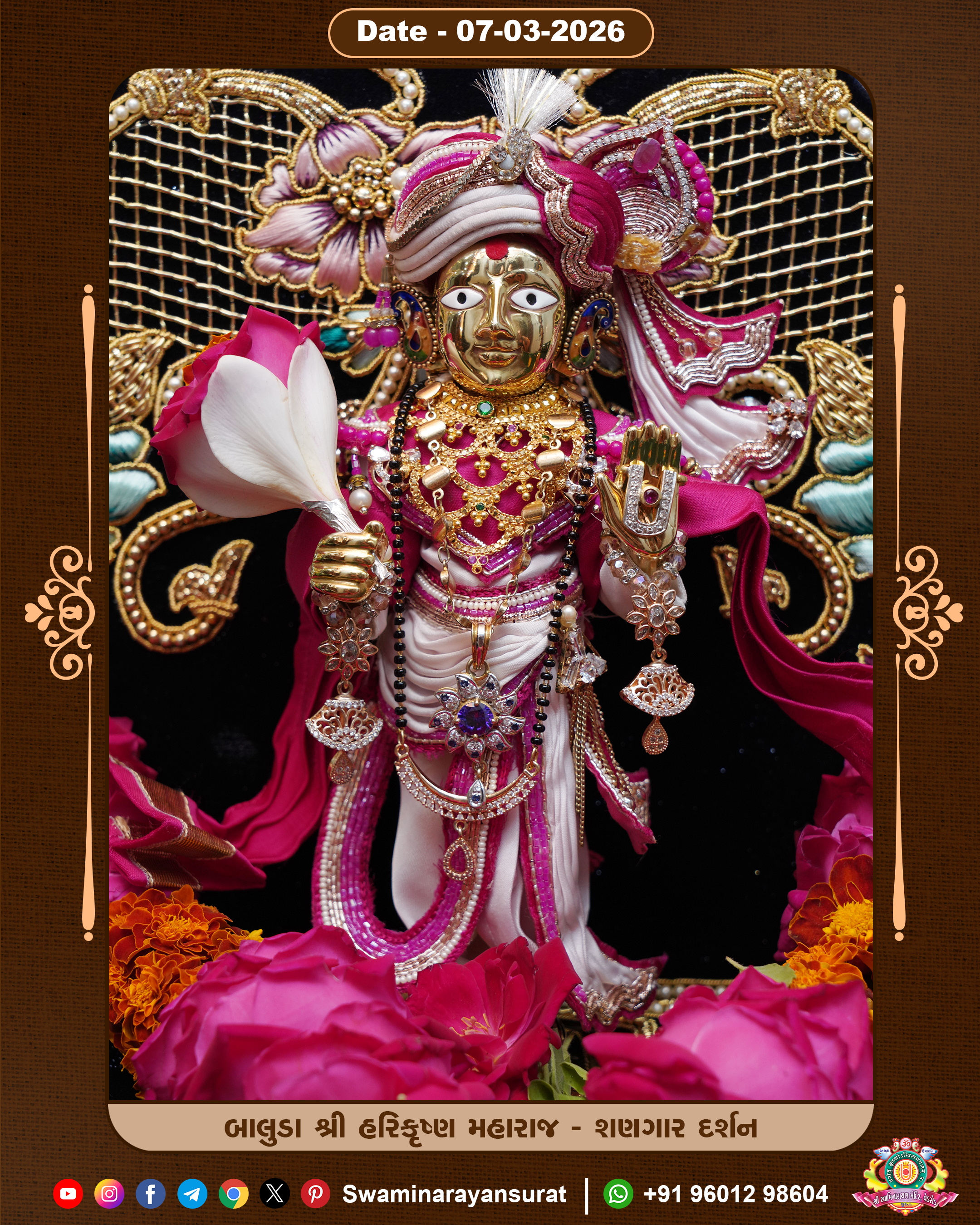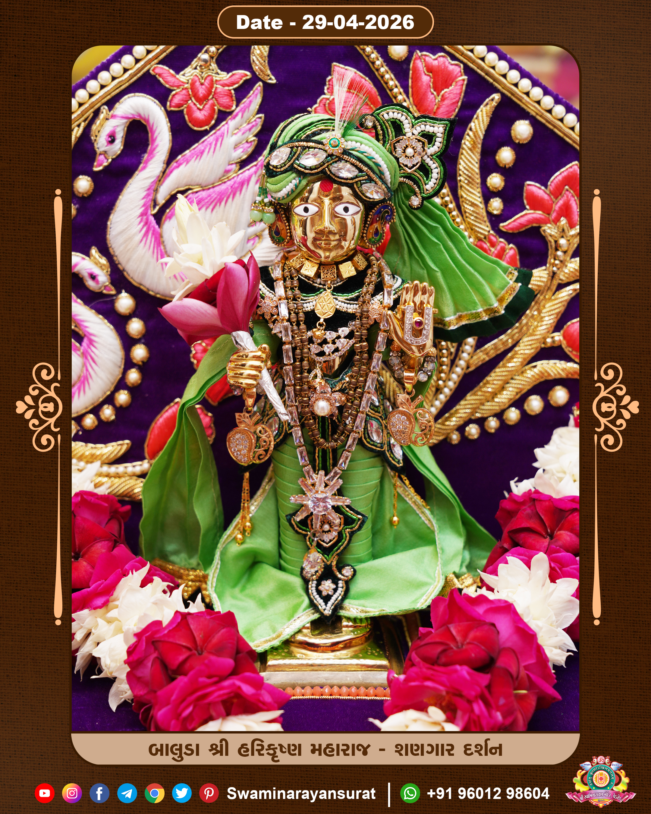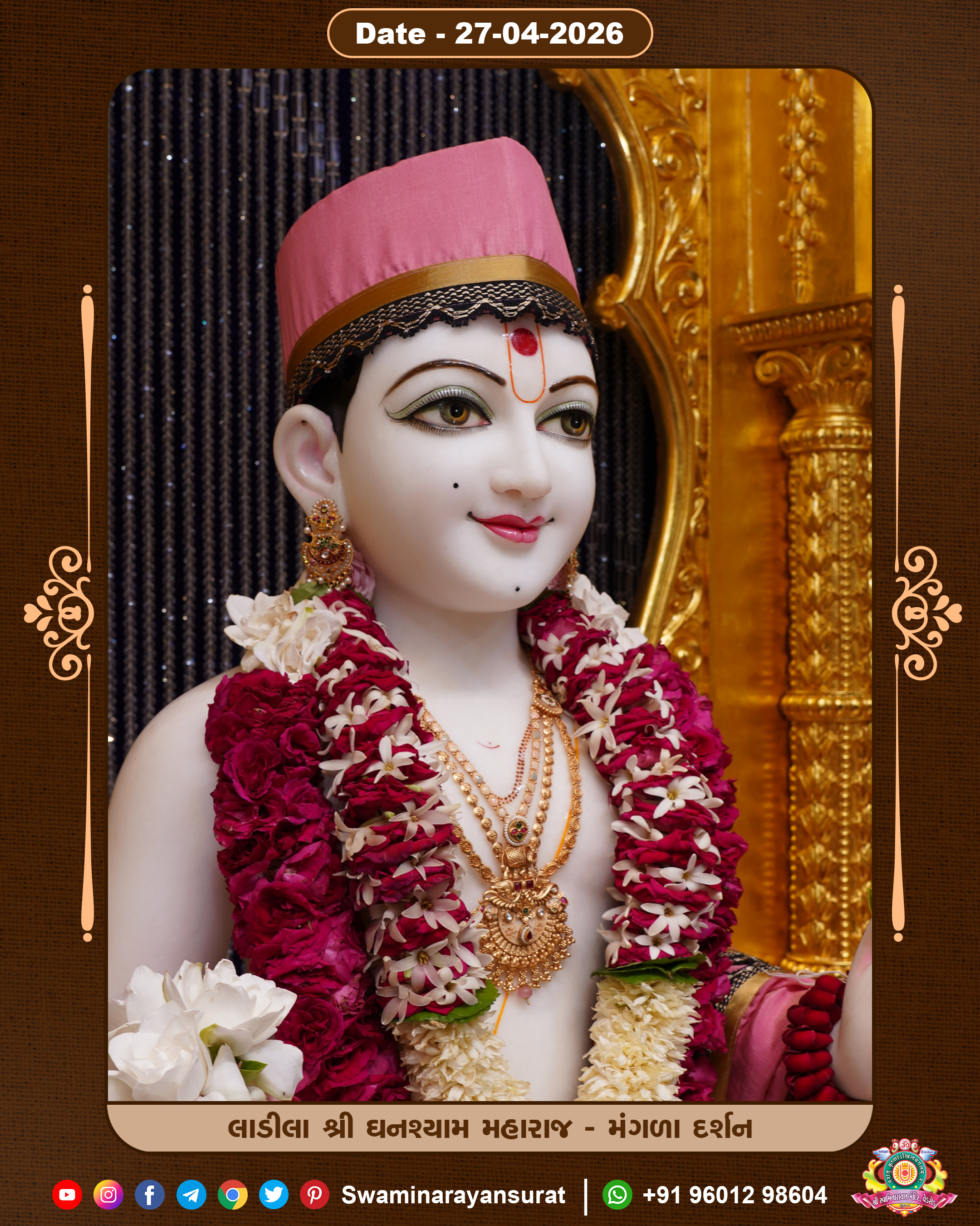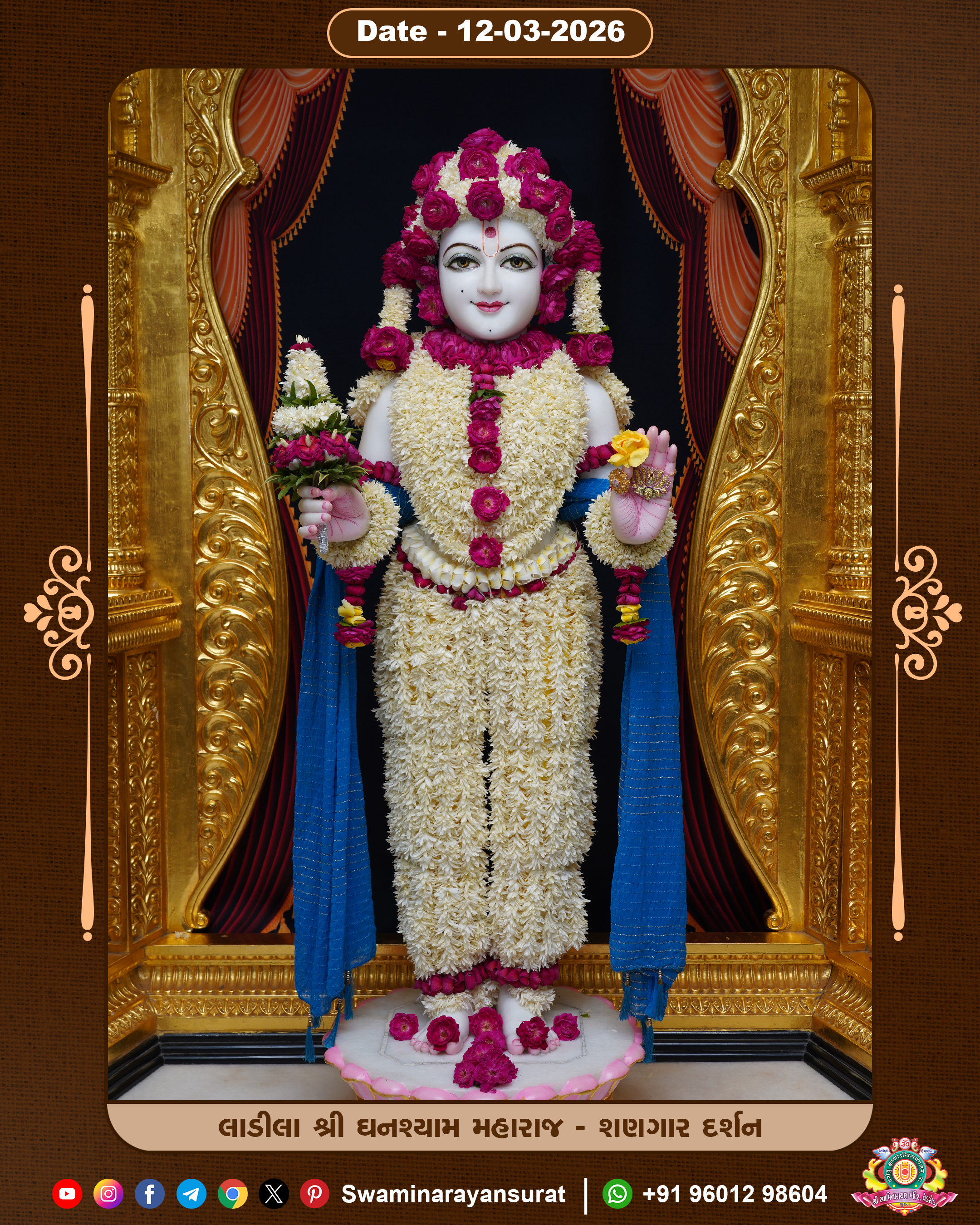 Shree Swaminarayan Temple, VedRoad is a Spiritual Organization Which falls under the region Of Vadtal Temple (The Headquarter Of Laxminarayan Dev Gadi). It is the First Organization Which is Constructed By Pink Stone With Beautiful and Marvellous Carving in Surat Of Swaminarayan Sampraday, Vadtal desh Which is increasing Pride & Prestige of Surat City, This temple contains One Main Shrine under which the idol of Ladila Shree Ghanshyam Maharaj is installed. P. Pu. Sadguru Shree Prabhucharandasji Swami is the Creator of this divine Organization. By the Several Activities & appearance Many devotees feels Easy in difficult Circumstances. He with his approx. 15 Saints & Devotees does Several Social & Spiritual Activities to fulfill the goal of Swaminarayan Sampraday, to do Worship with religious practices.