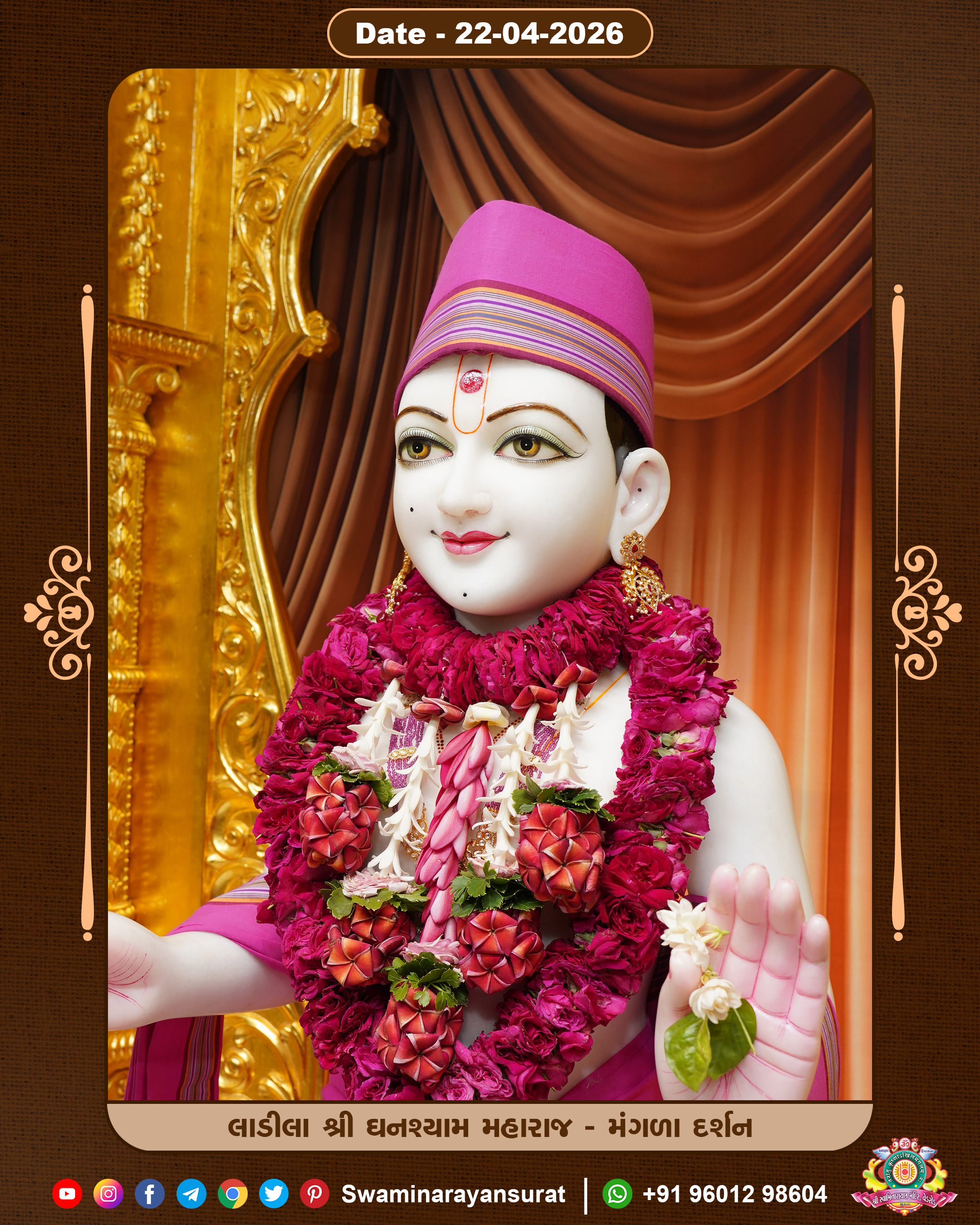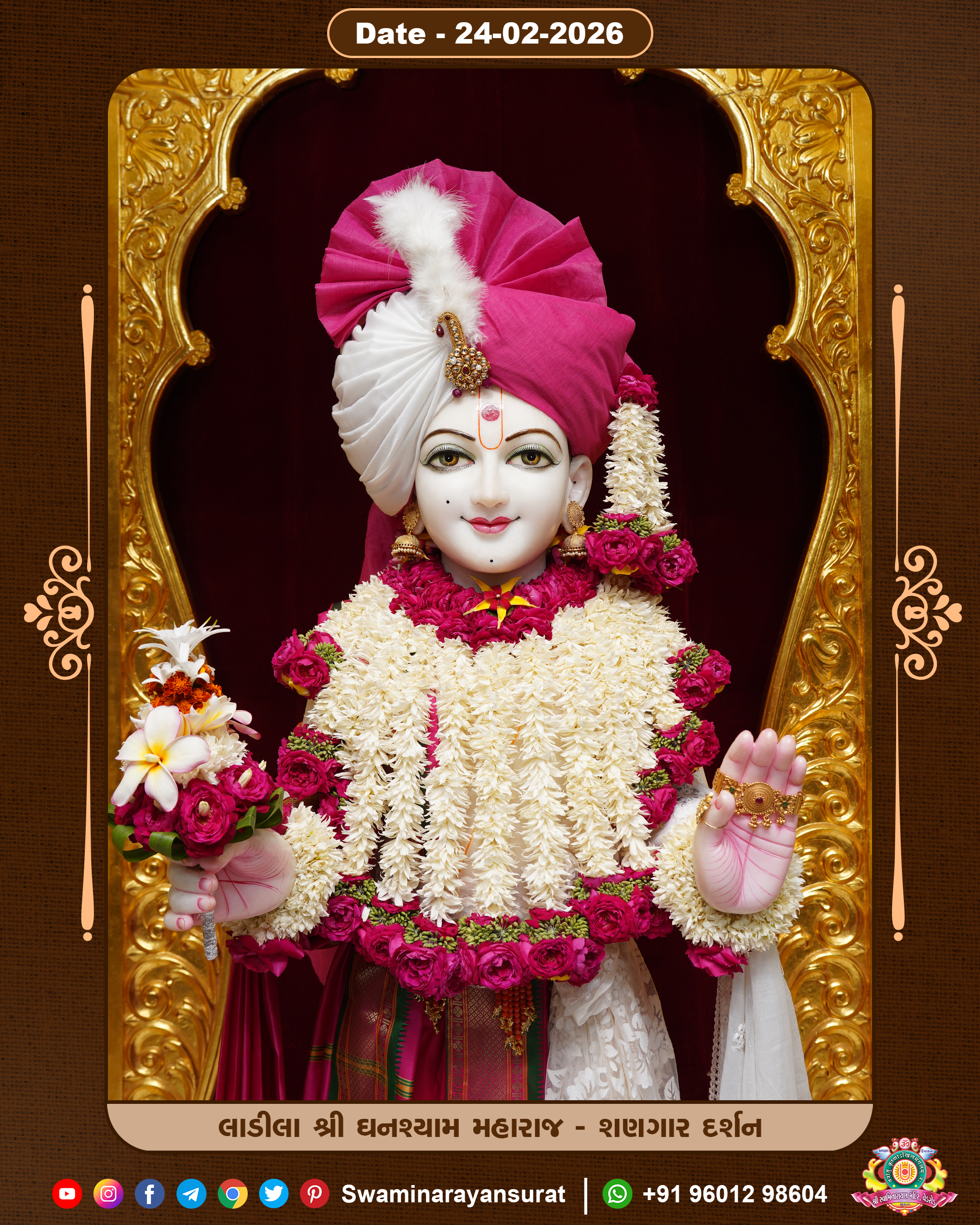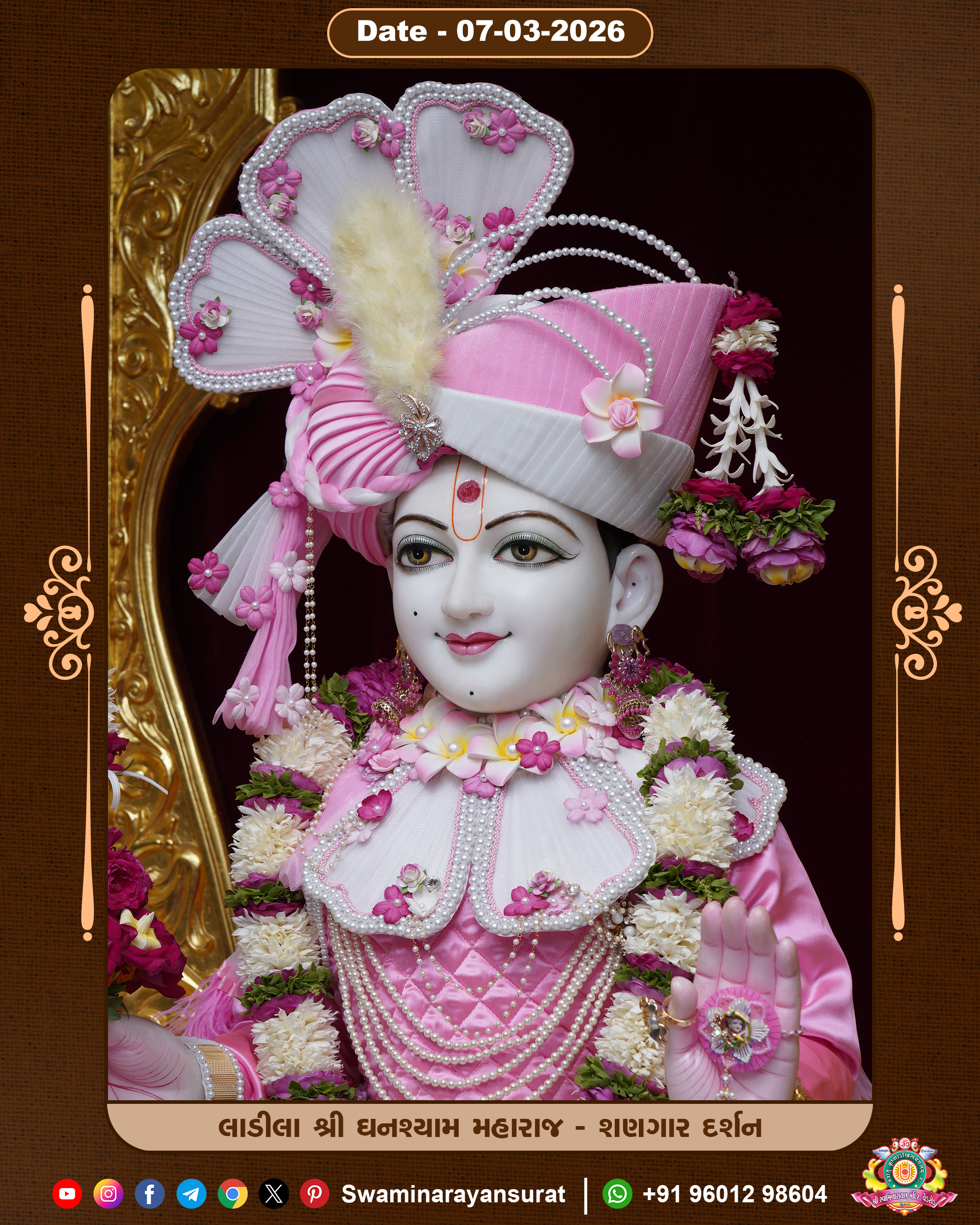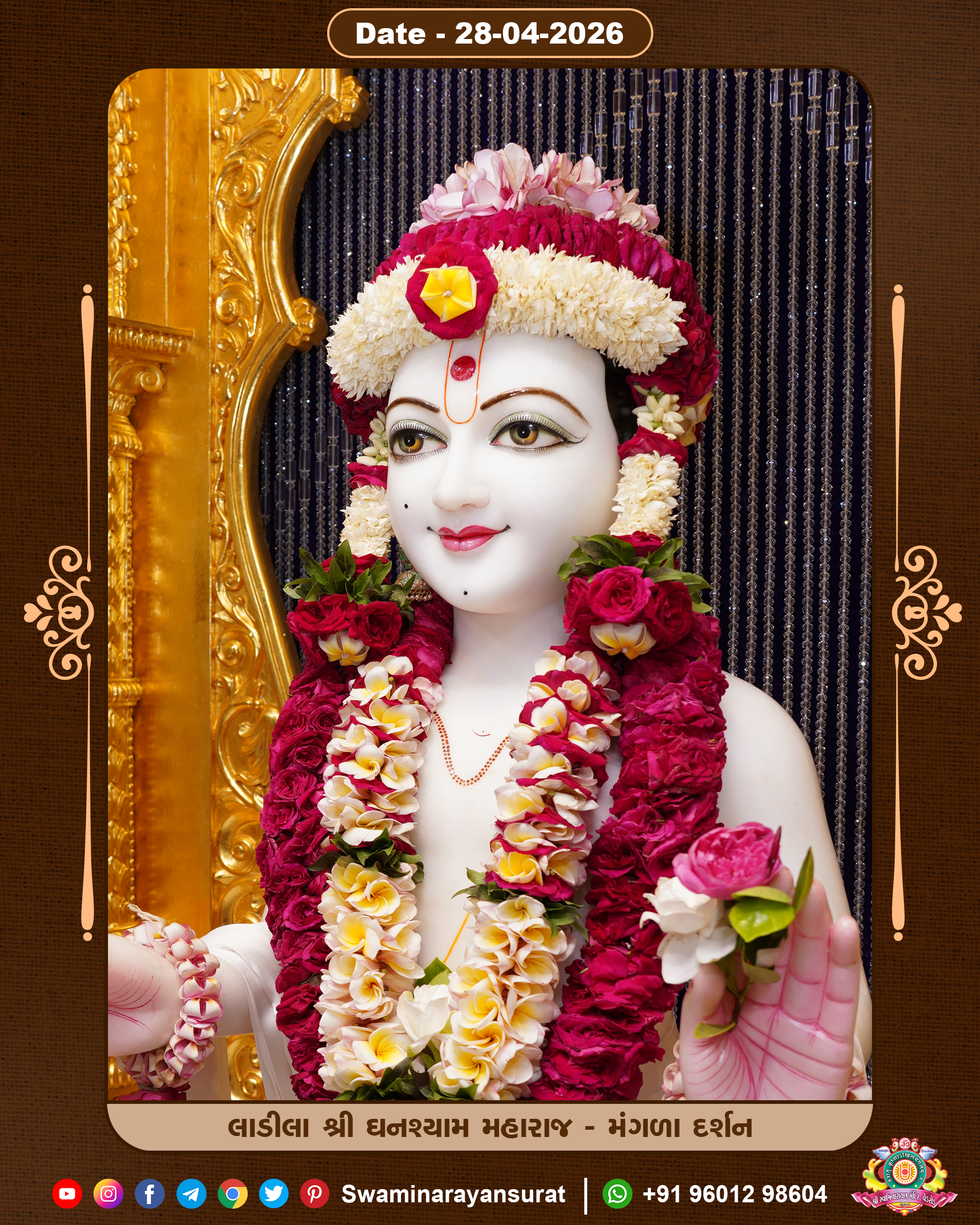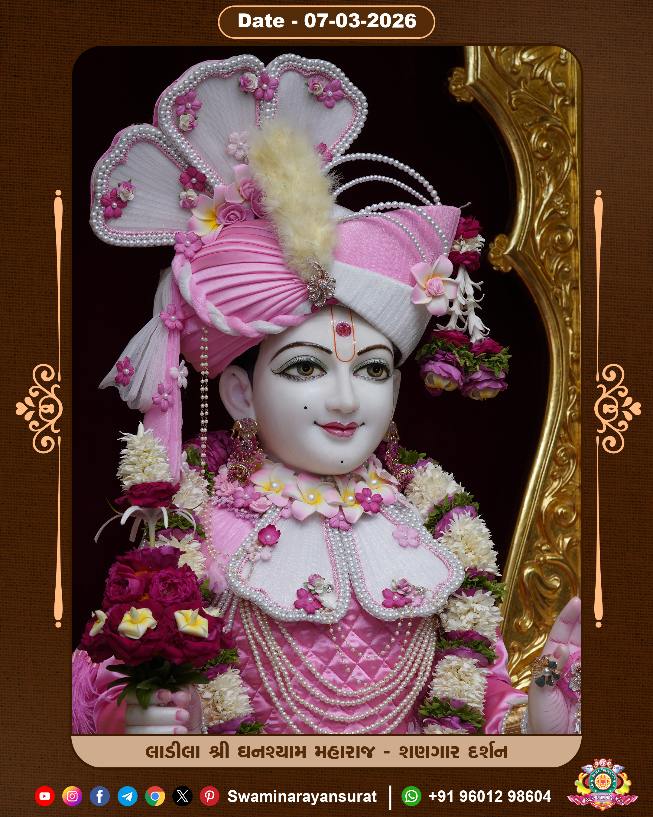 Shree Swaminarayan Temple, VedRoad is a Spiritual Organization Which falls under the region Of Vadtal Temple (The Headquarter Of Laxminarayan Dev Gadi). It is the First Organization Which is Constructed By Pink Stone With Beautiful and Marvellous Carving in Surat Of Swaminarayan Sampraday, Vadtal desh Which is increasing Pride & Prestige of Surat City, This temple contains One Main Shrine under which the idol of Ladila Shree Ghanshyam Maharaj is installed. P. Pu. Sadguru Shree Prabhucharandasji Swami is the Creator of this divine Organization. By the Several Activities & appearance Many devotees feels Easy in difficult Circumstances. He with his approx. 15 Saints & Devotees does Several Social & Spiritual Activities to fulfill the goal of Swaminarayan Sampraday, to do Worship with religious practices.