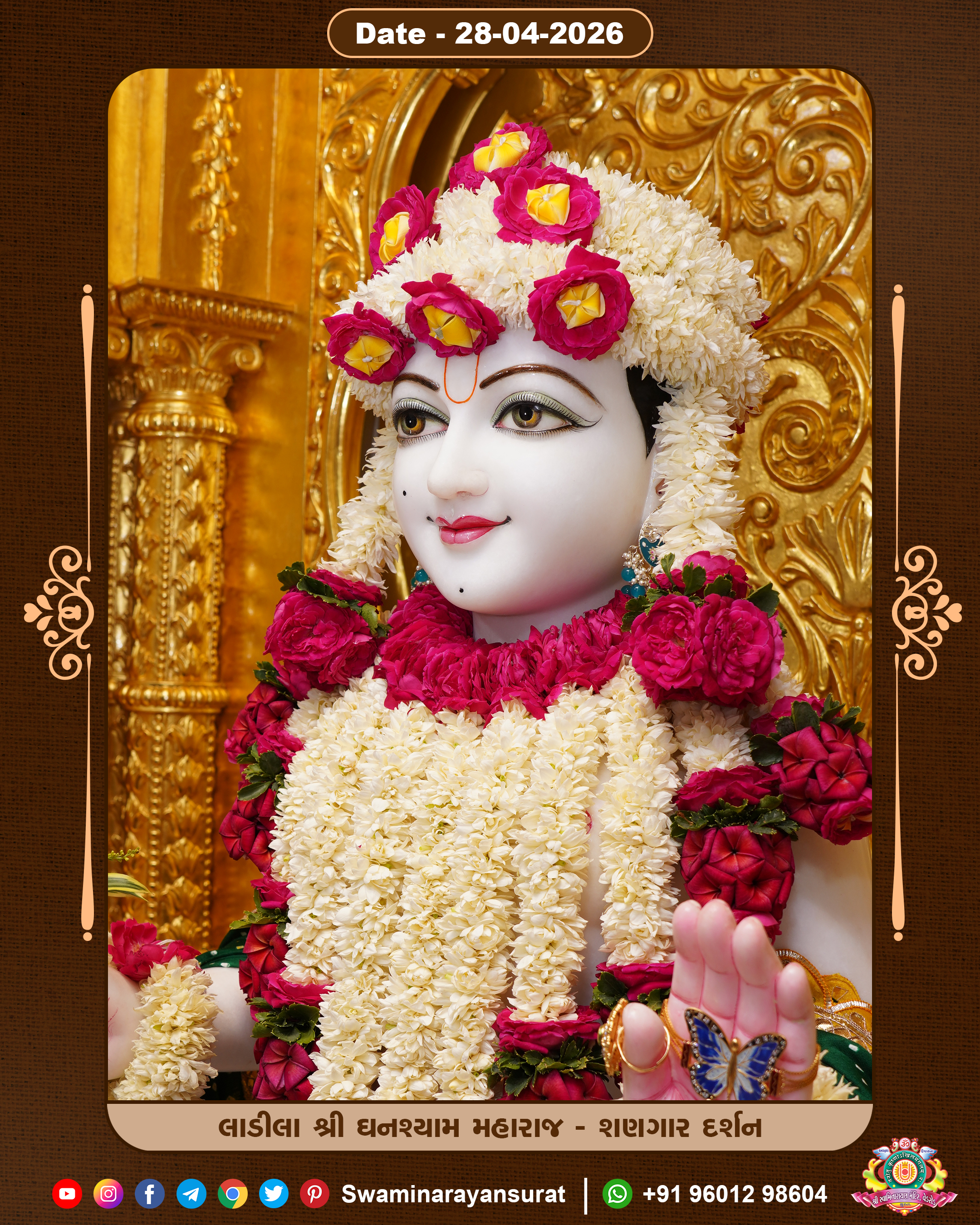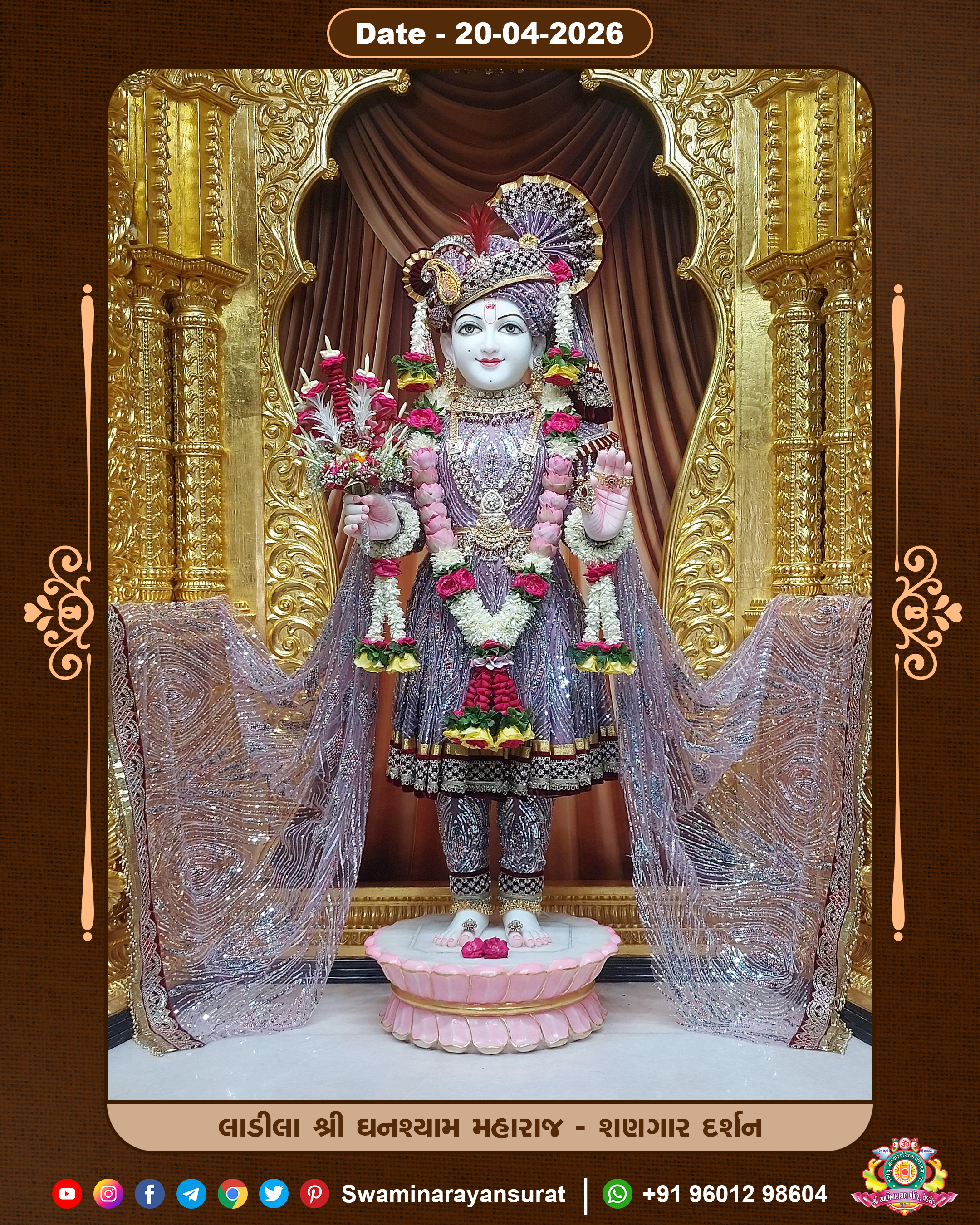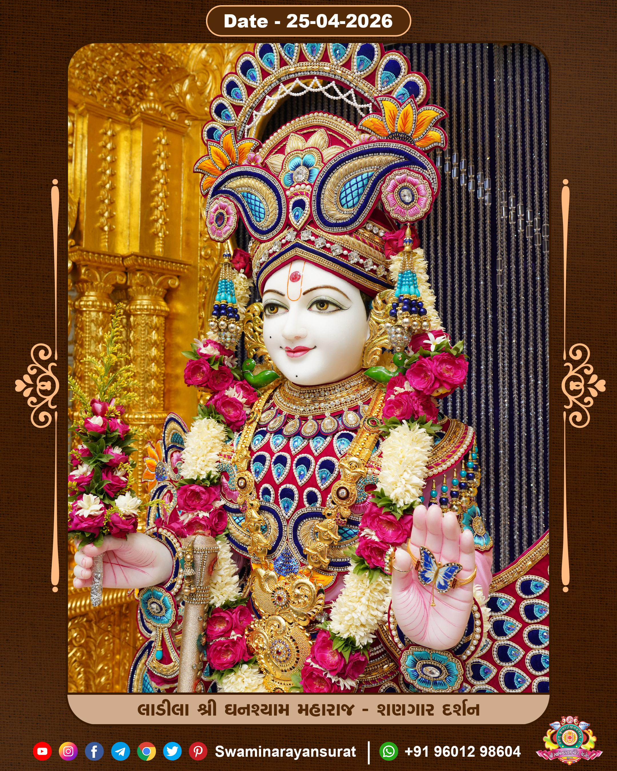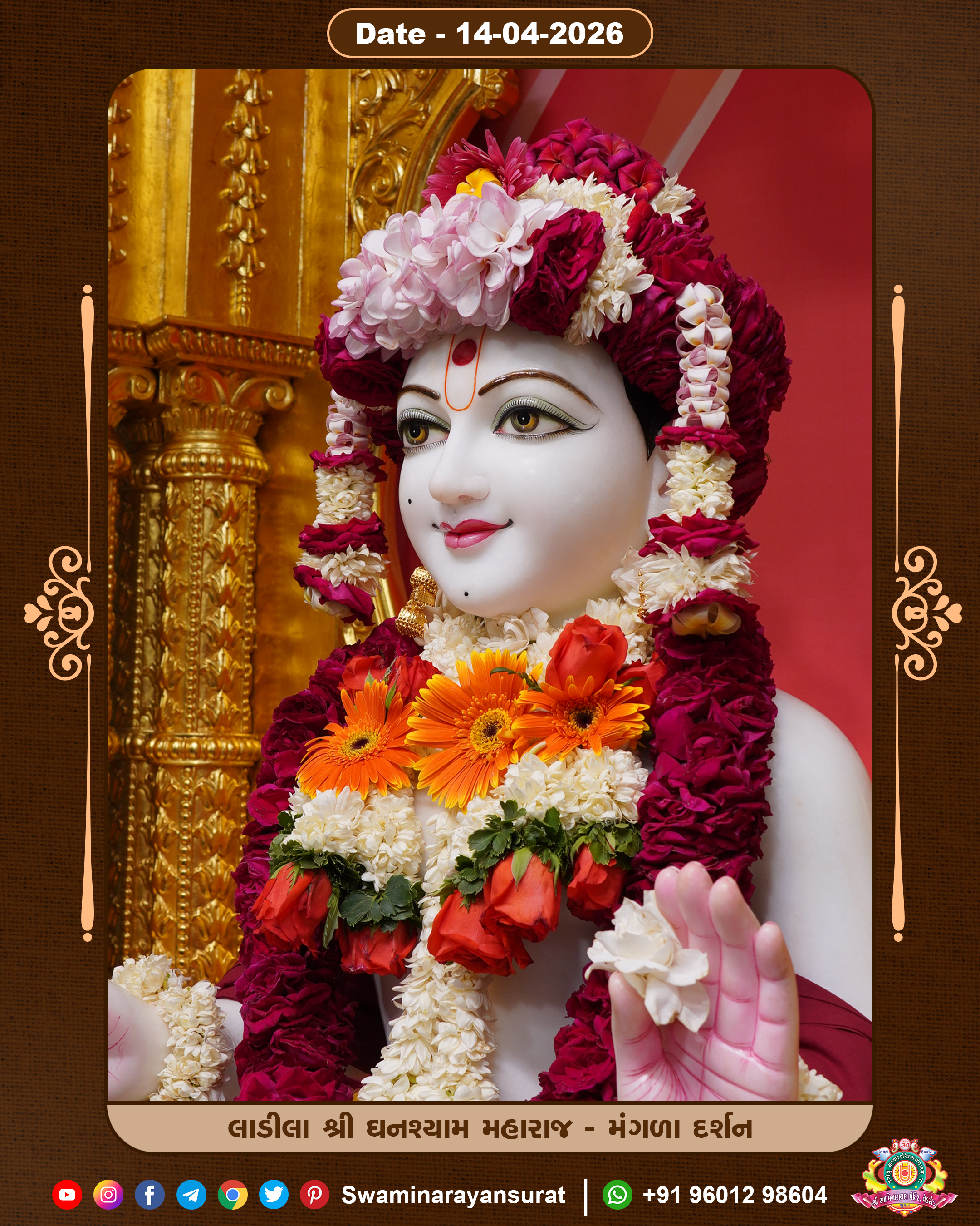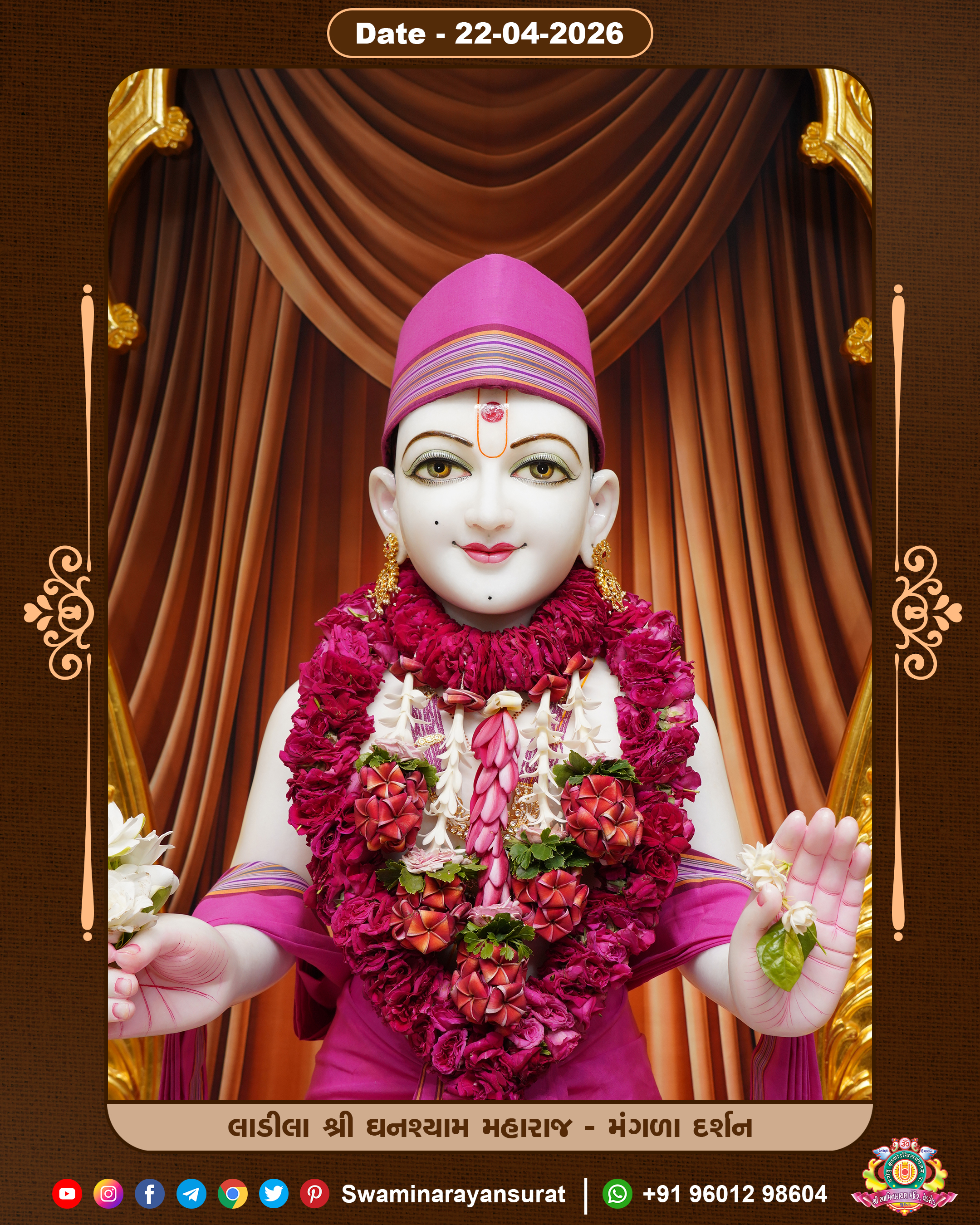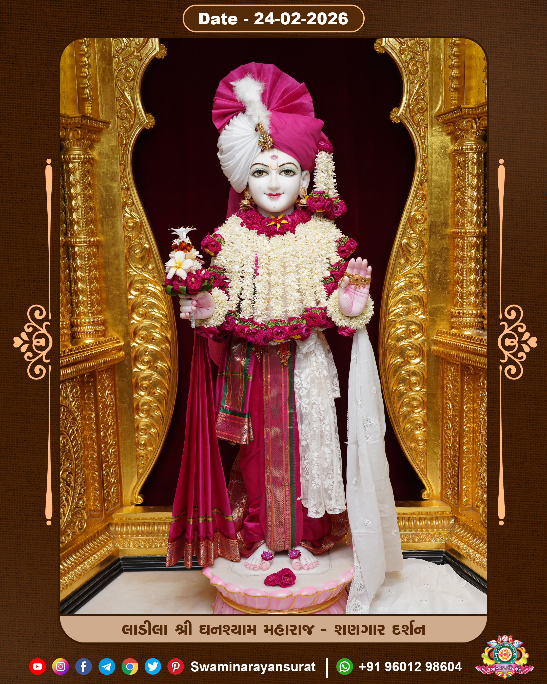 Shree Swaminarayan Temple, VedRoad is a Spiritual Organization Which falls under the region Of Vadtal Temple (The Headquarter Of Laxminarayan Dev Gadi). It is the First Organization Which is Constructed By Pink Stone With Beautiful and Marvellous Carving in Surat Of Swaminarayan Sampraday, Vadtal desh Which is increasing Pride & Prestige of Surat City, This temple contains One Main Shrine under which the idol of Ladila Shree Ghanshyam Maharaj is installed. P. Pu. Sadguru Shree Prabhucharandasji Swami is the Creator of this divine Organization. By the Several Activities & appearance Many devotees feels Easy in difficult Circumstances. He with his approx. 15 Saints & Devotees does Several Social & Spiritual Activities to fulfill the goal of Swaminarayan Sampraday, to do Worship with religious practices.