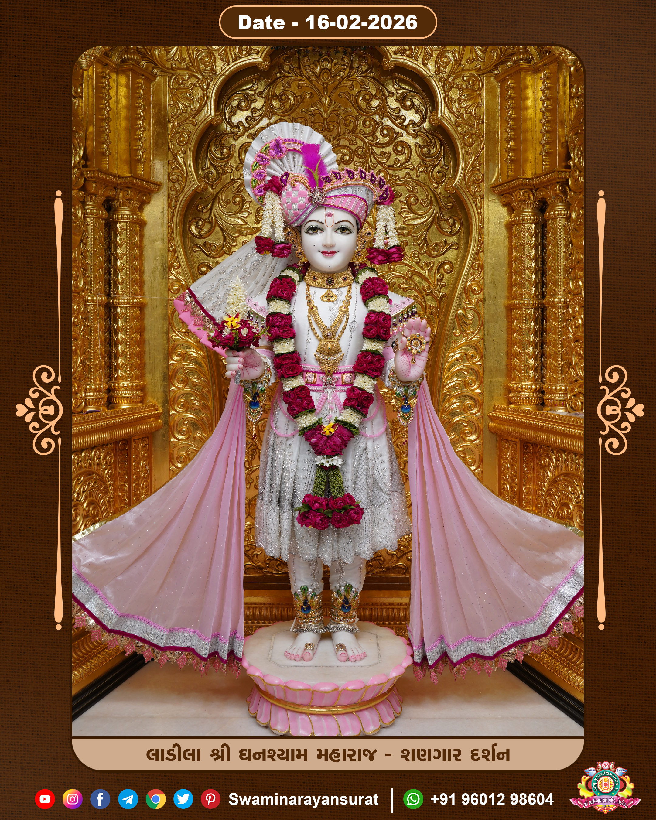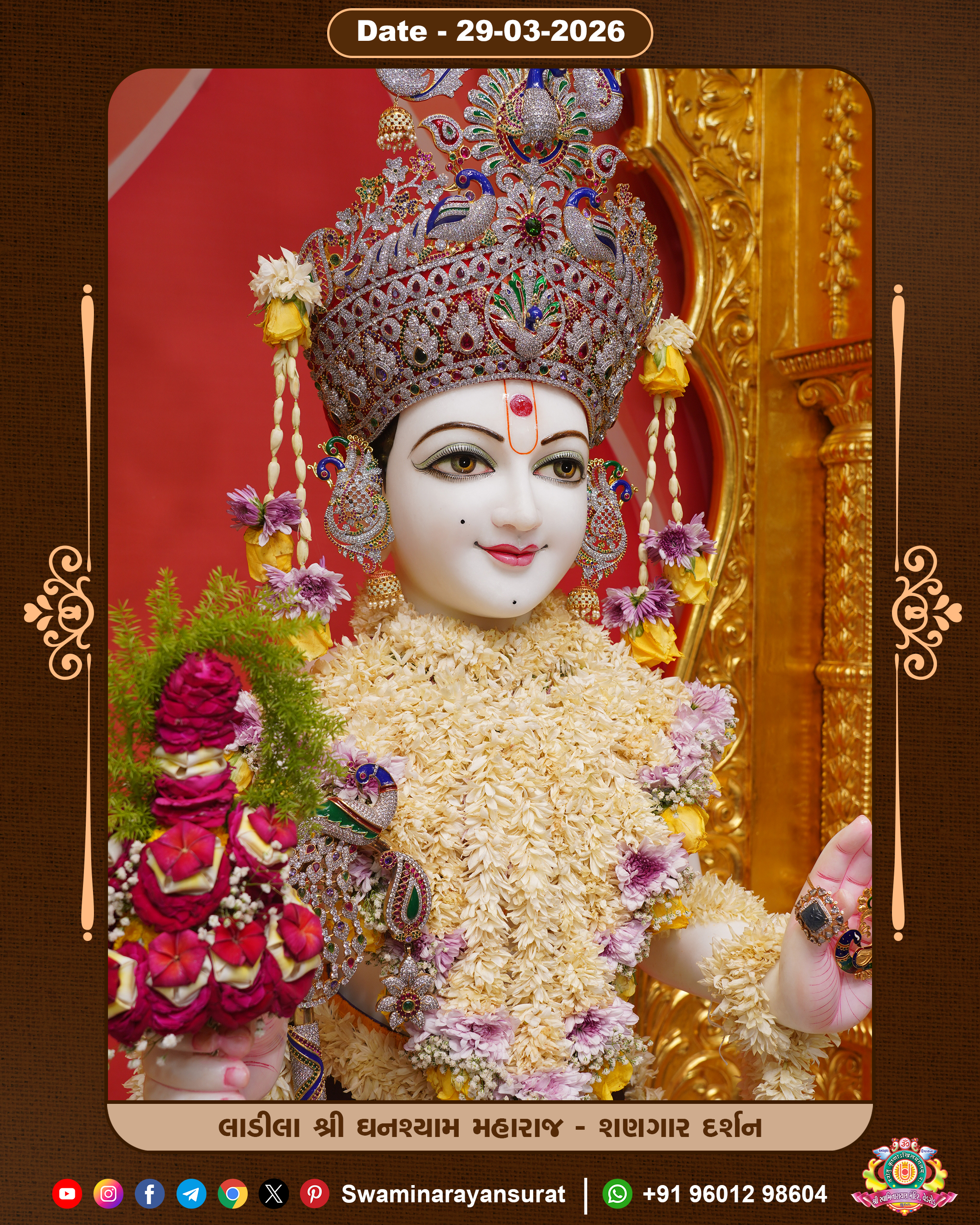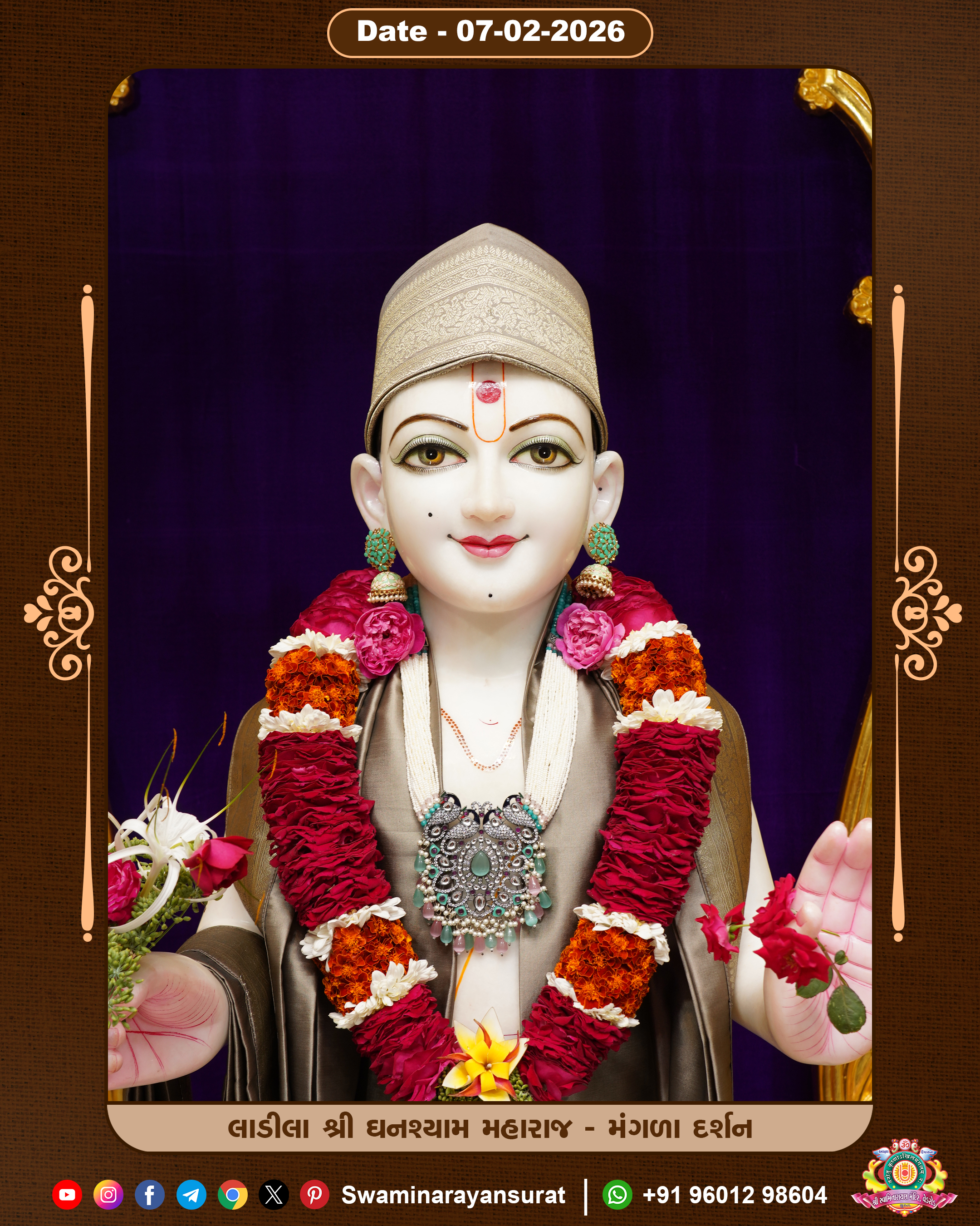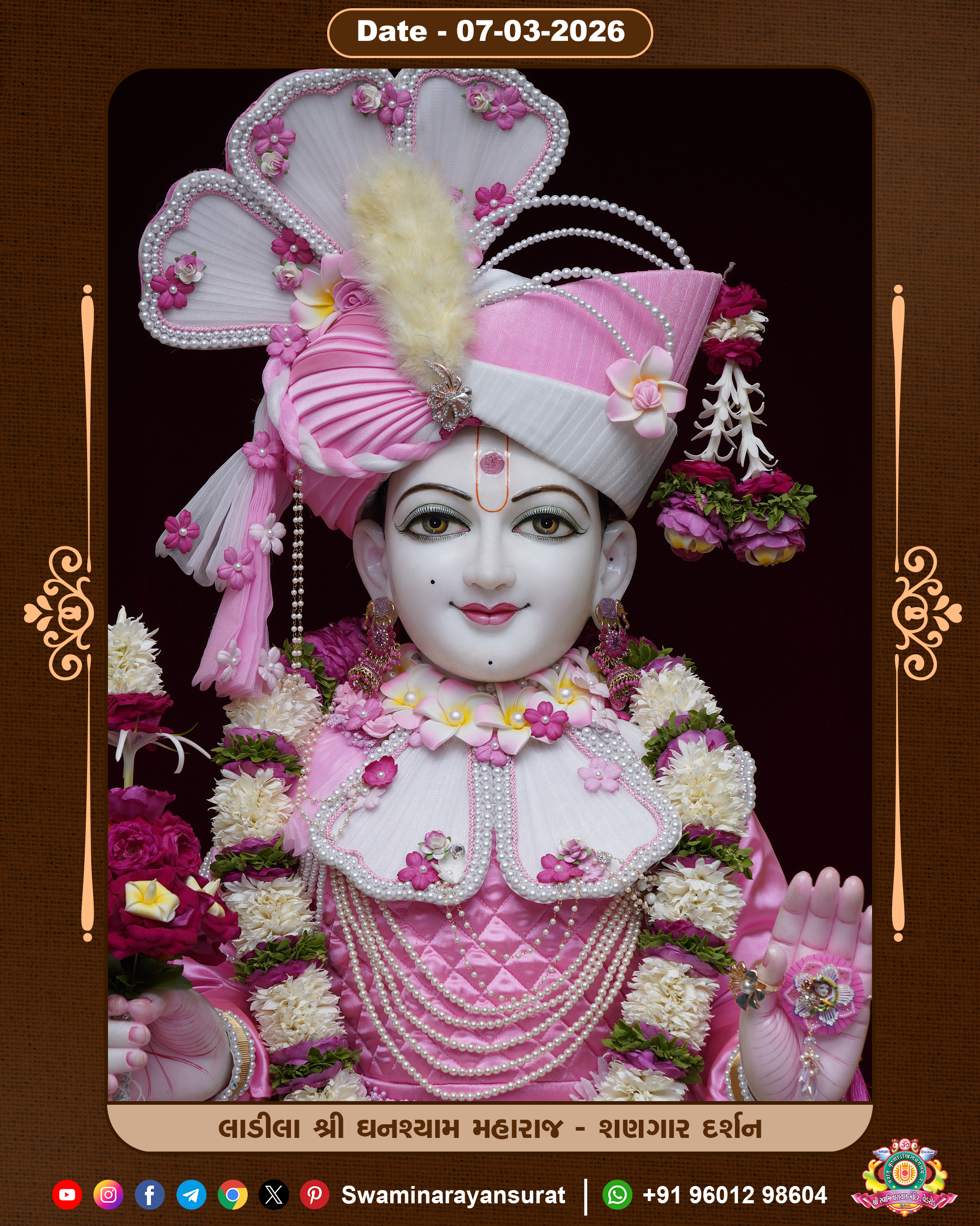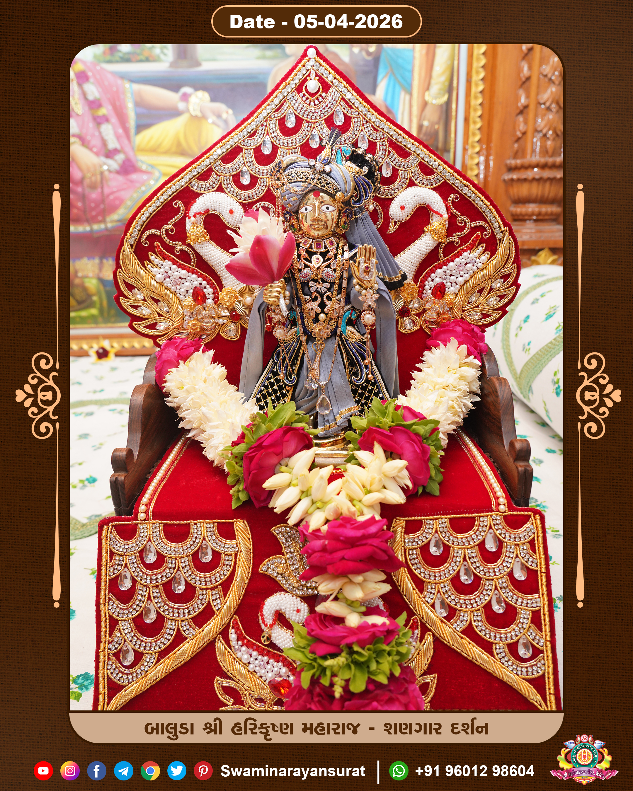 Shree Swaminarayan Temple, VedRoad is a Spiritual Organization Which falls under the region Of Vadtal Temple (The Headquarter Of Laxminarayan Dev Gadi). It is the First Organization Which is Constructed By Pink Stone With Beautiful and Marvellous Carving in Surat Of Swaminarayan Sampraday, Vadtal desh Which is increasing Pride & Prestige of Surat City, This temple contains One Main Shrine under which the idol of Ladila Shree Ghanshyam Maharaj is installed. P. Pu. Sadguru Shree Prabhucharandasji Swami is the Creator of this divine Organization. By the Several Activities & appearance Many devotees feels Easy in difficult Circumstances. He with his approx. 15 Saints & Devotees does Several Social & Spiritual Activities to fulfill the goal of Swaminarayan Sampraday, to do Worship with religious practices.