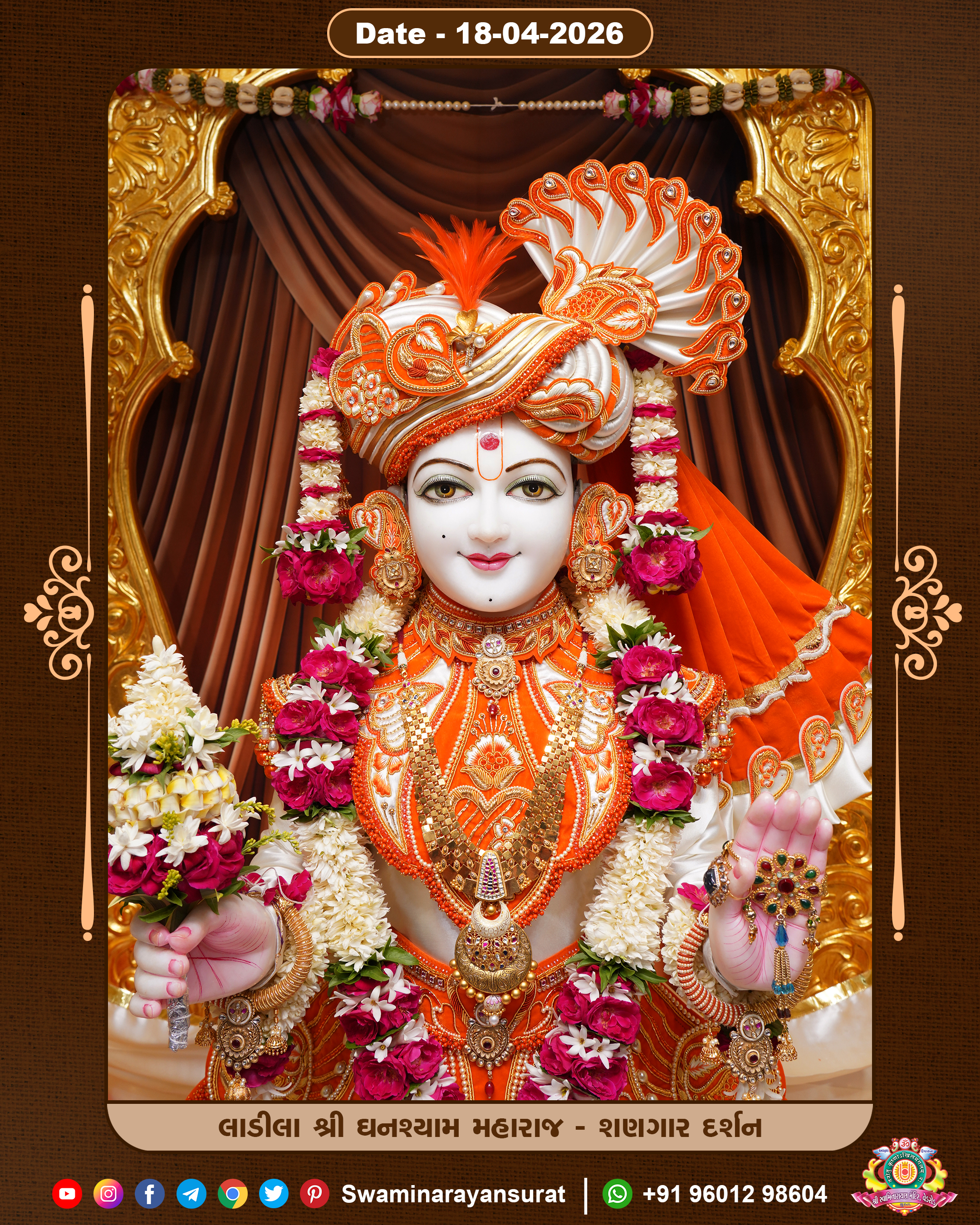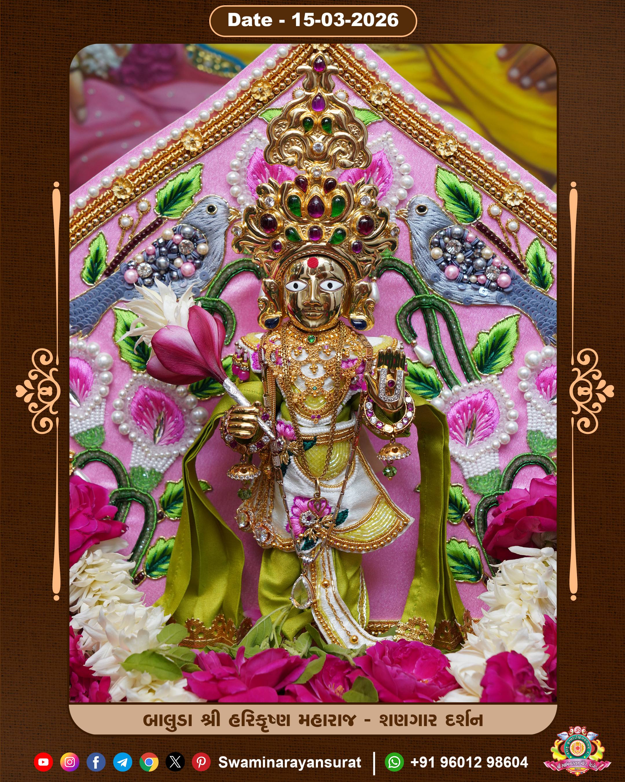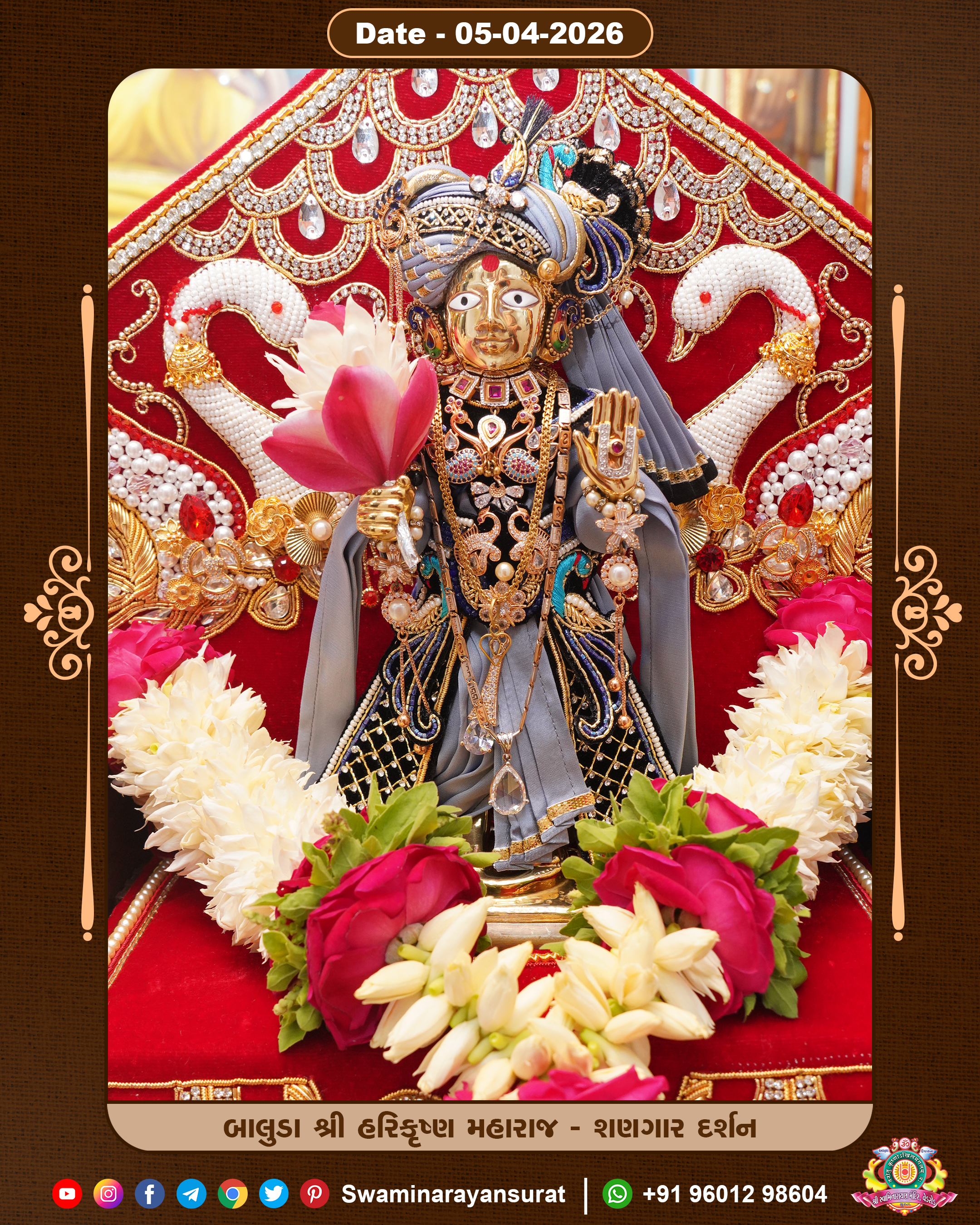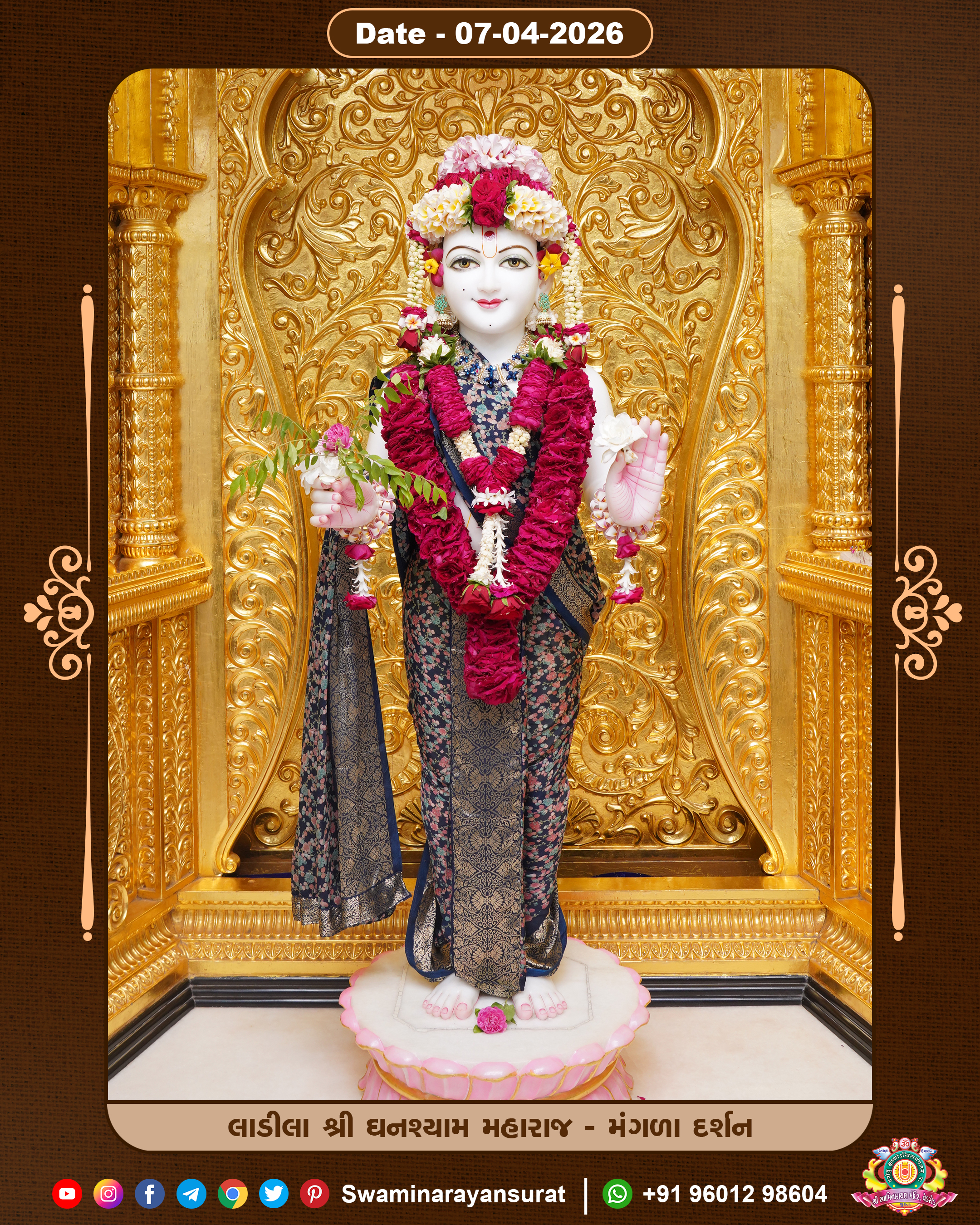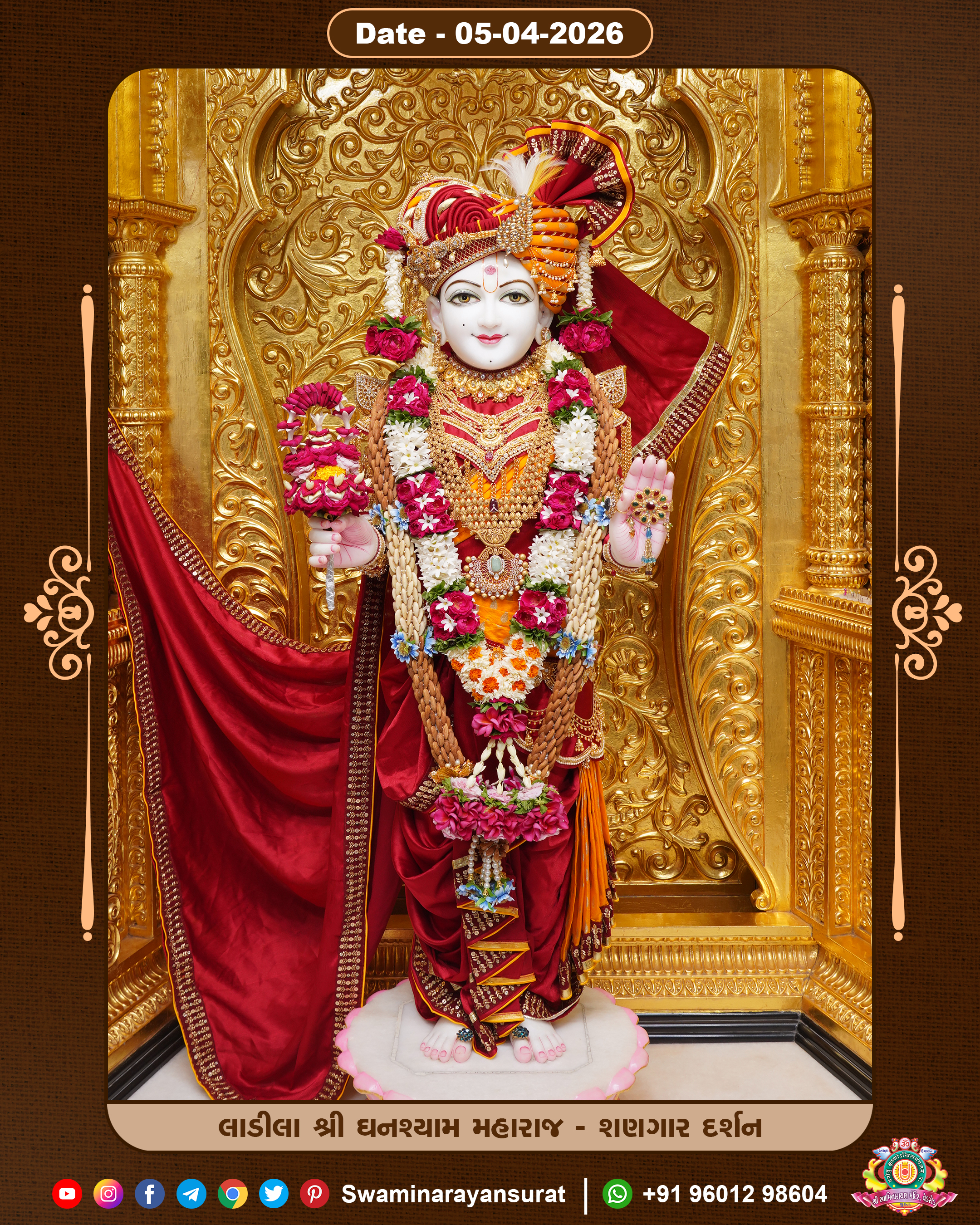 Shree Swaminarayan Temple, VedRoad is a Spiritual Organization Which falls under the region Of Vadtal Temple (The Headquarter Of Laxminarayan Dev Gadi). It is the First Organization Which is Constructed By Pink Stone With Beautiful and Marvellous Carving in Surat Of Swaminarayan Sampraday, Vadtal desh Which is increasing Pride & Prestige of Surat City, This temple contains One Main Shrine under which the idol of Ladila Shree Ghanshyam Maharaj is installed. P. Pu. Sadguru Shree Prabhucharandasji Swami is the Creator of this divine Organization. By the Several Activities & appearance Many devotees feels Easy in difficult Circumstances. He with his approx. 15 Saints & Devotees does Several Social & Spiritual Activities to fulfill the goal of Swaminarayan Sampraday, to do Worship with religious practices.
