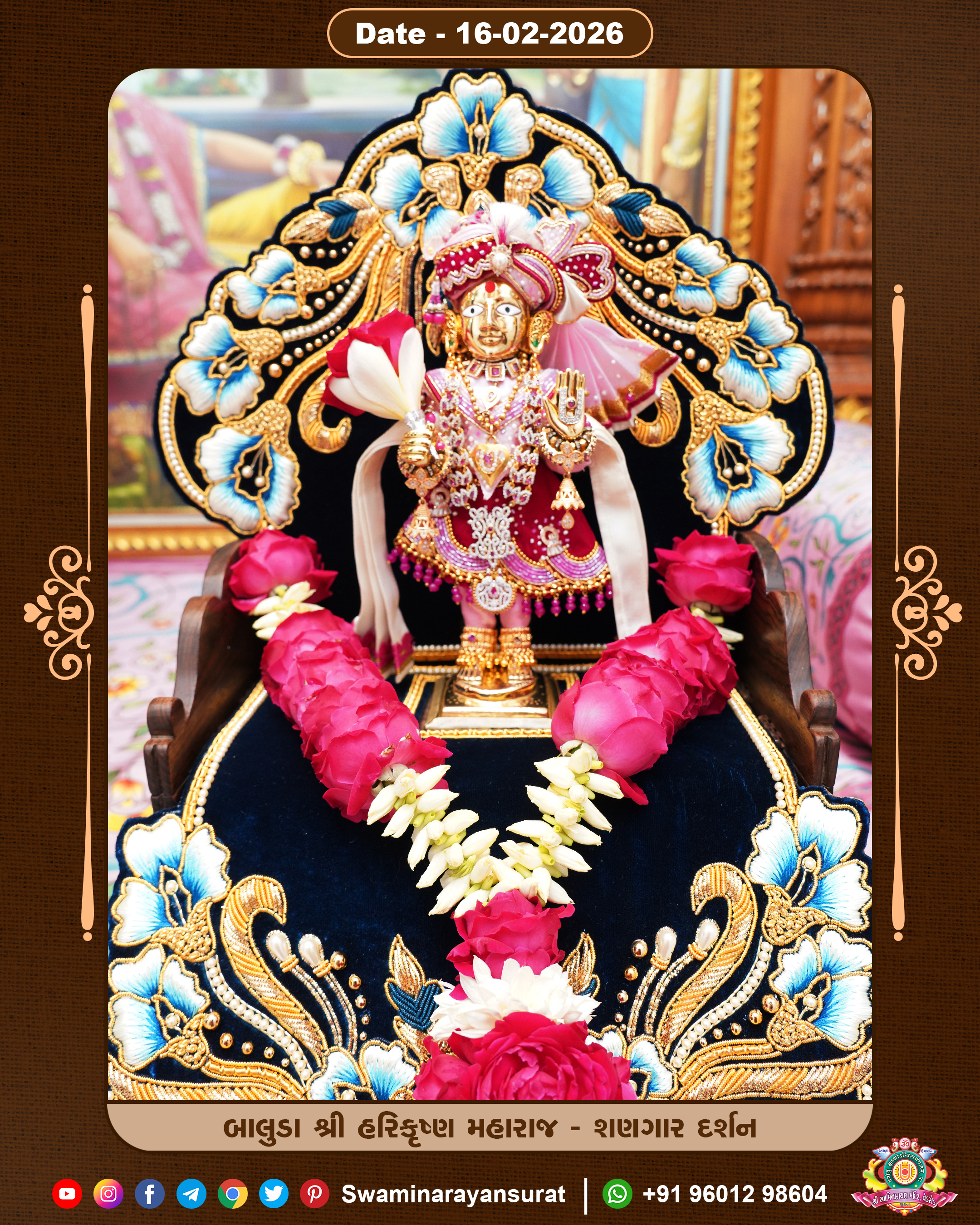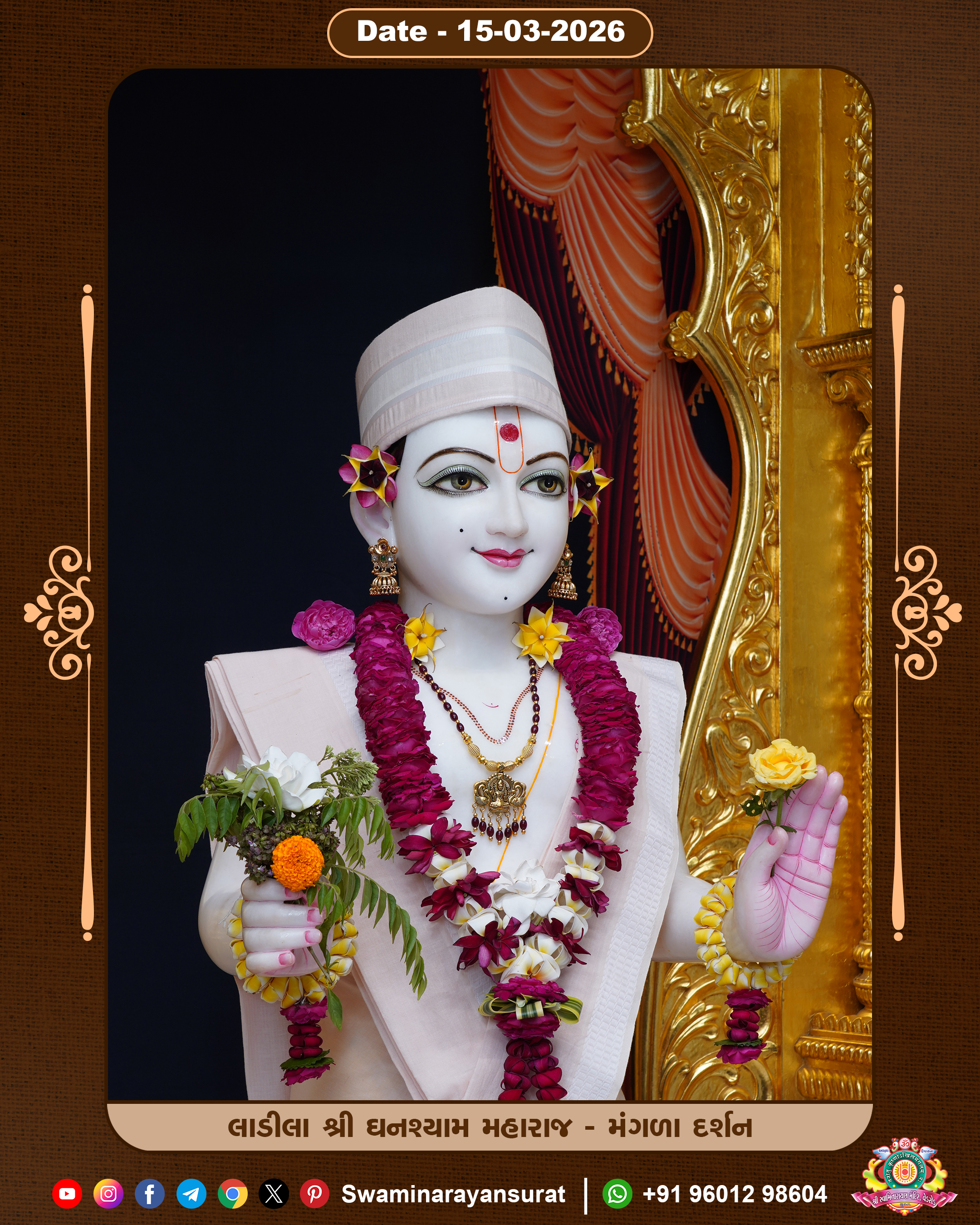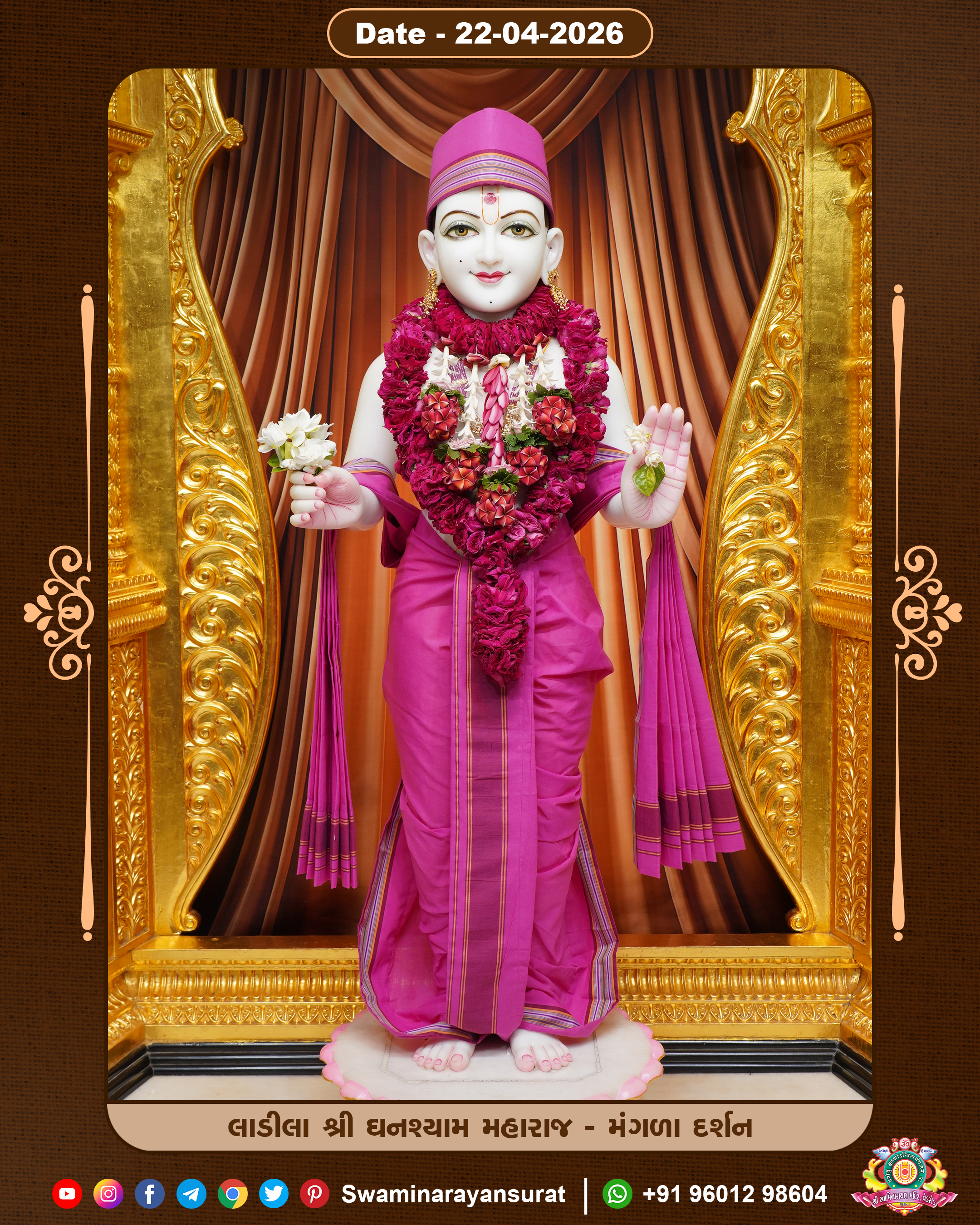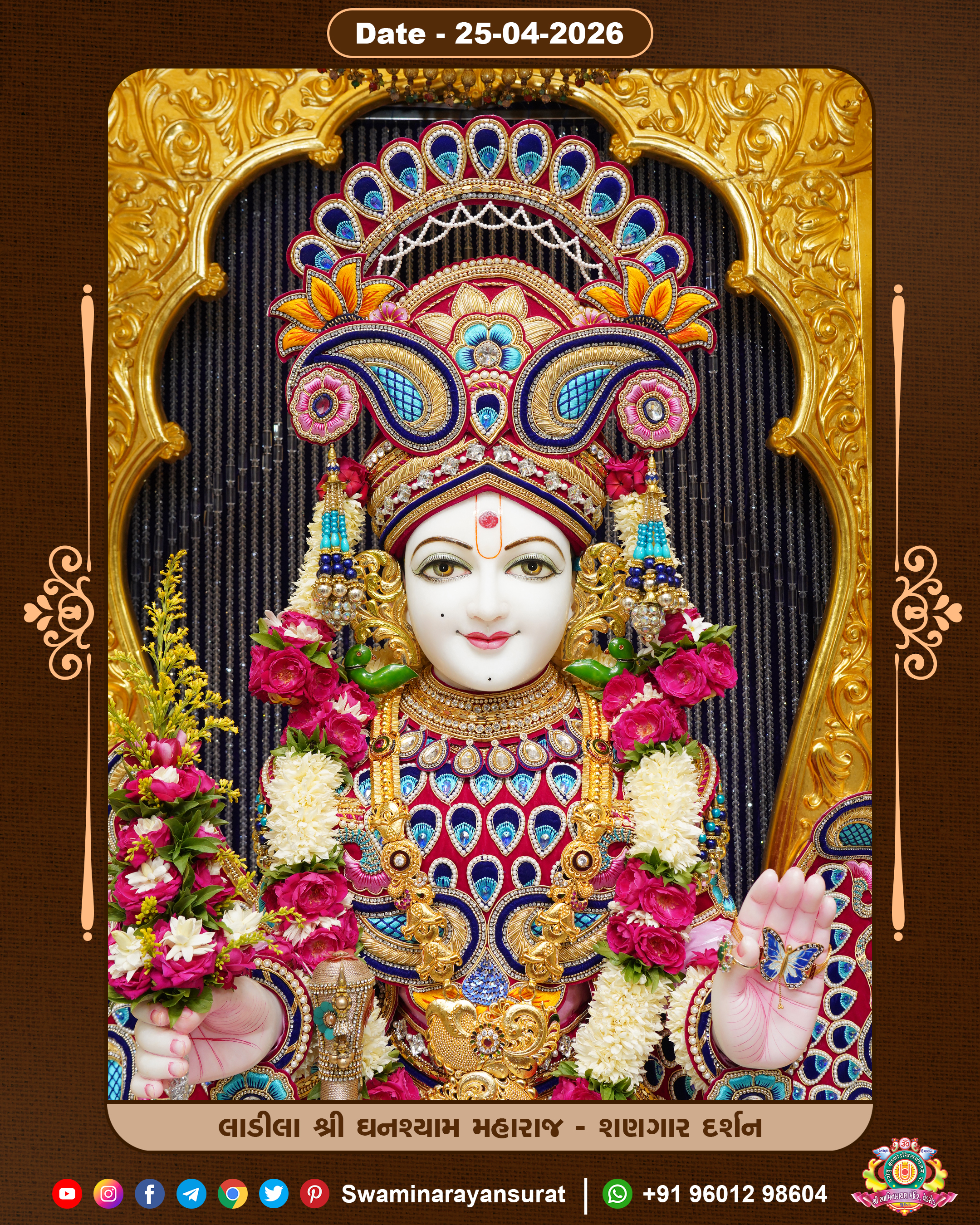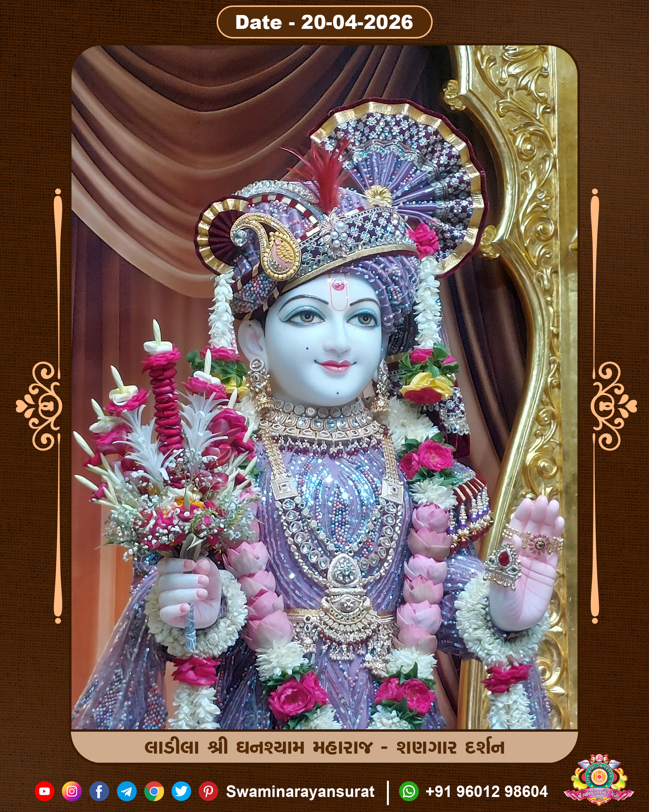 Shree Swaminarayan Temple, VedRoad is a Spiritual Organization Which falls under the region Of Vadtal Temple (The Headquarter Of Laxminarayan Dev Gadi). It is the First Organization Which is Constructed By Pink Stone With Beautiful and Marvellous Carving in Surat Of Swaminarayan Sampraday, Vadtal desh Which is increasing Pride & Prestige of Surat City, This temple contains One Main Shrine under which the idol of Ladila Shree Ghanshyam Maharaj is installed. P. Pu. Sadguru Shree Prabhucharandasji Swami is the Creator of this divine Organization. By the Several Activities & appearance Many devotees feels Easy in difficult Circumstances. He with his approx. 15 Saints & Devotees does Several Social & Spiritual Activities to fulfill the goal of Swaminarayan Sampraday, to do Worship with religious practices.