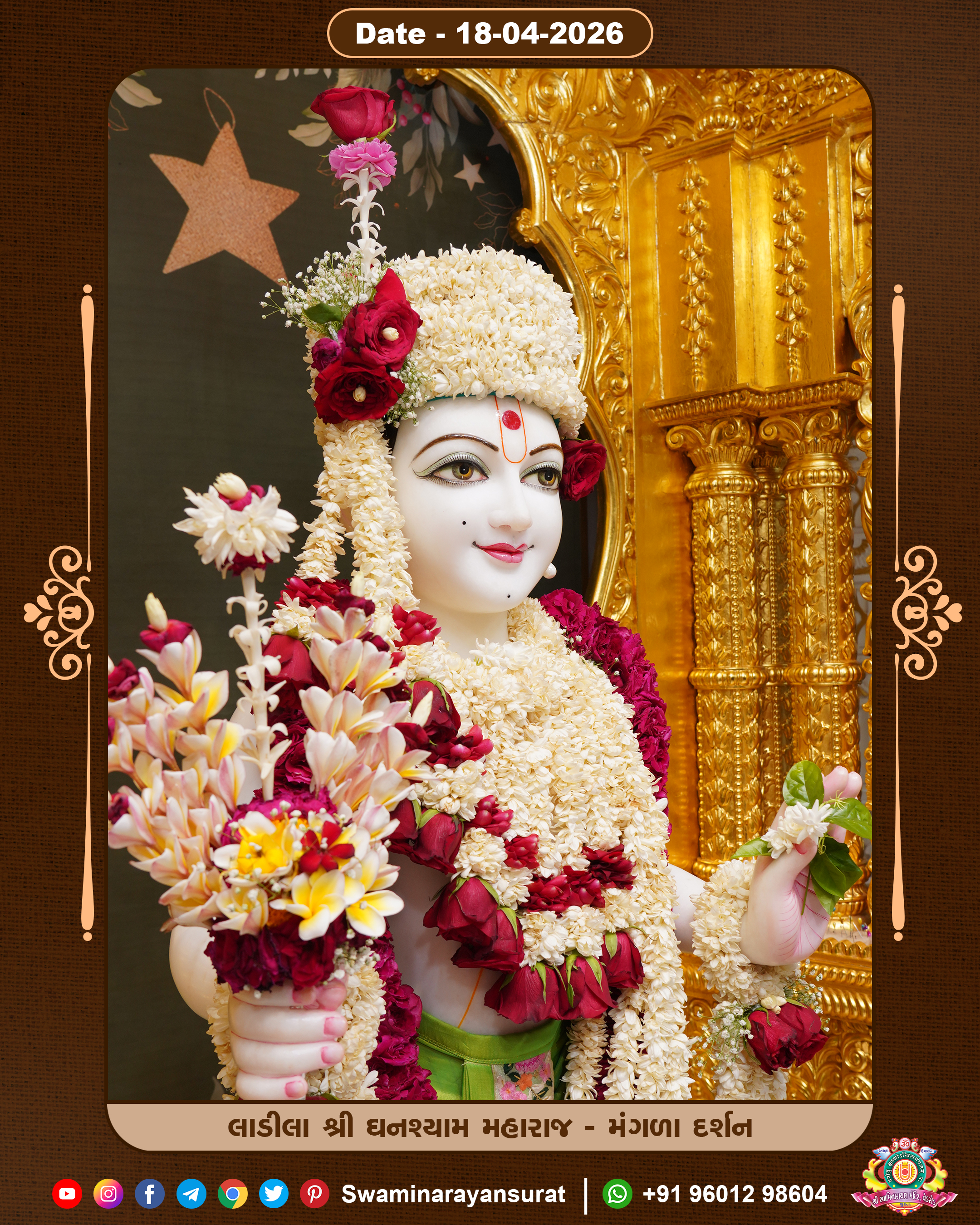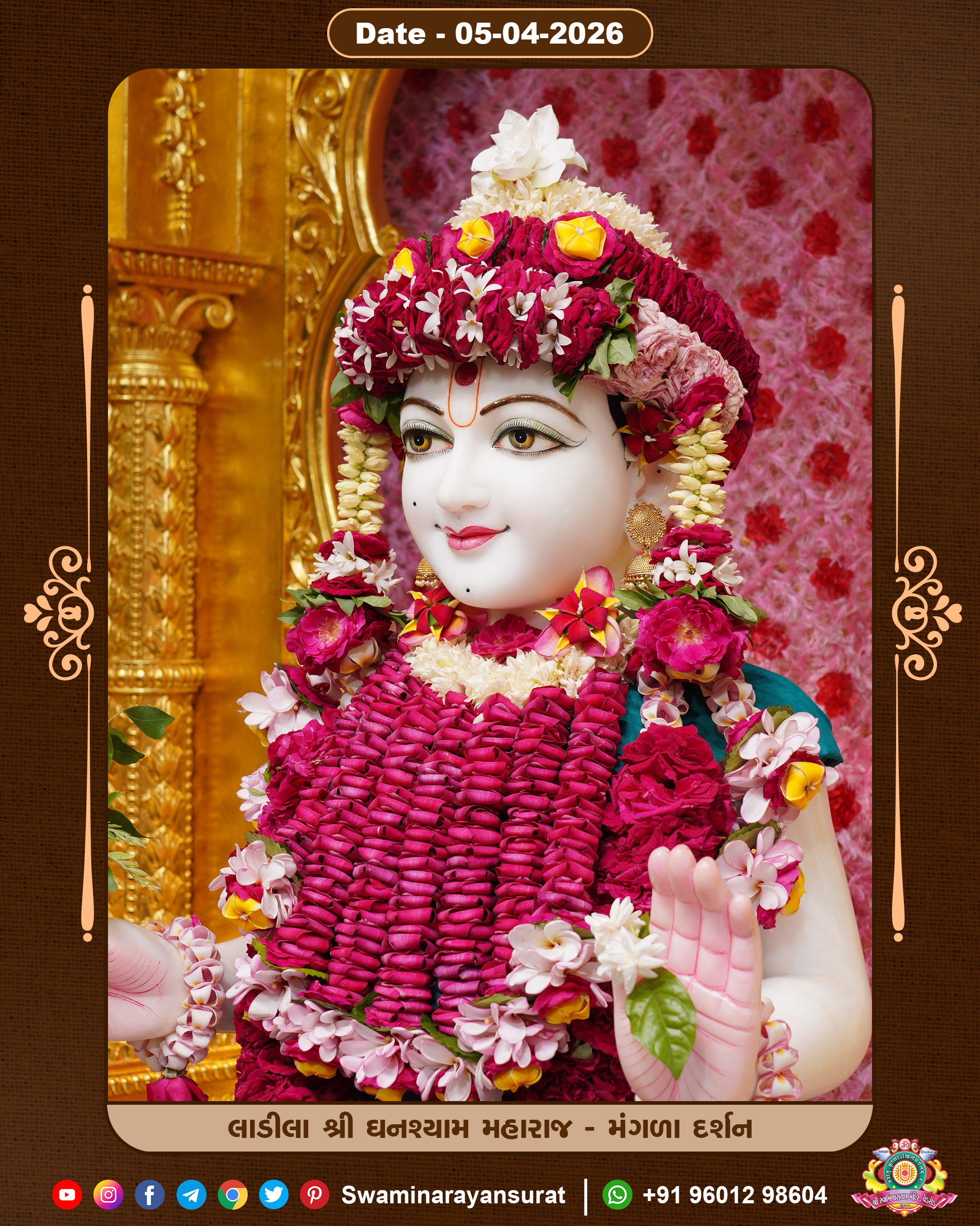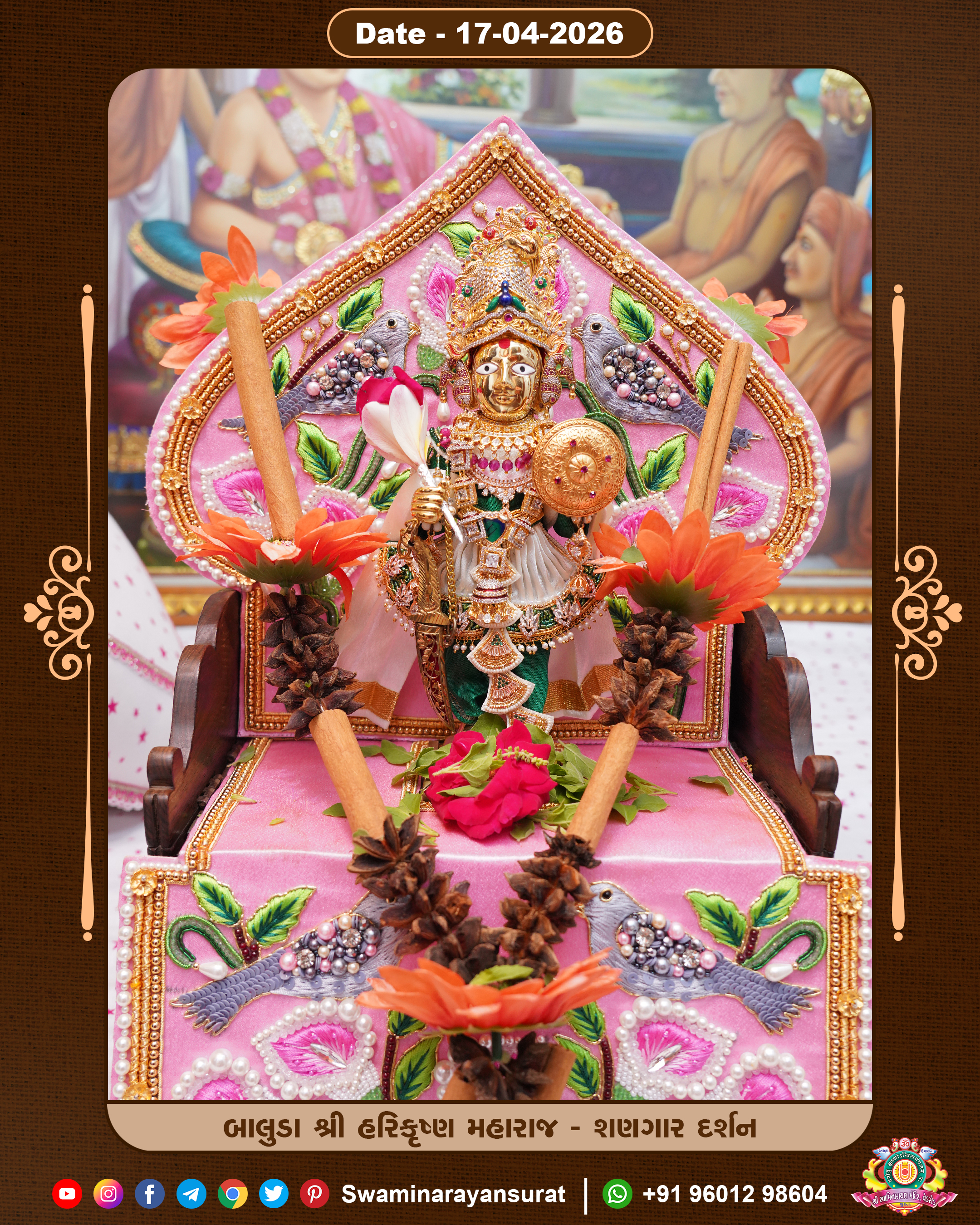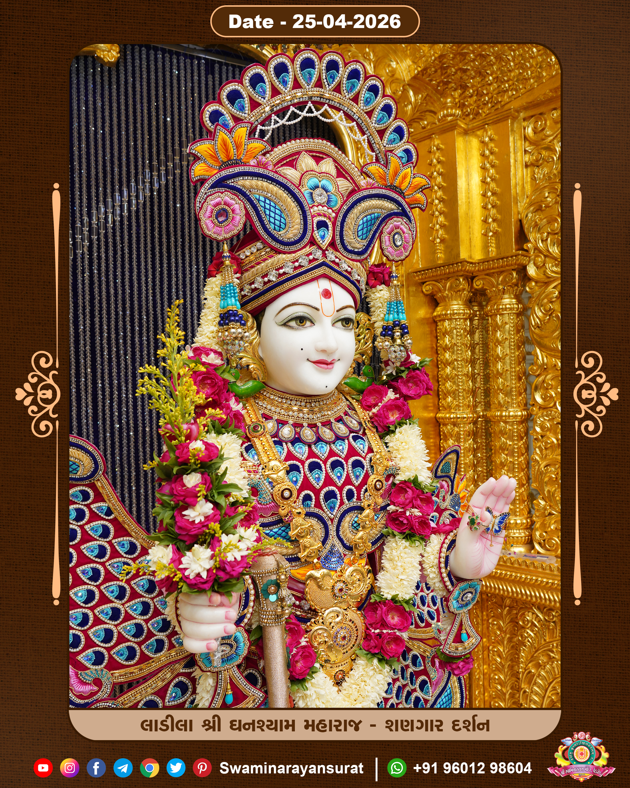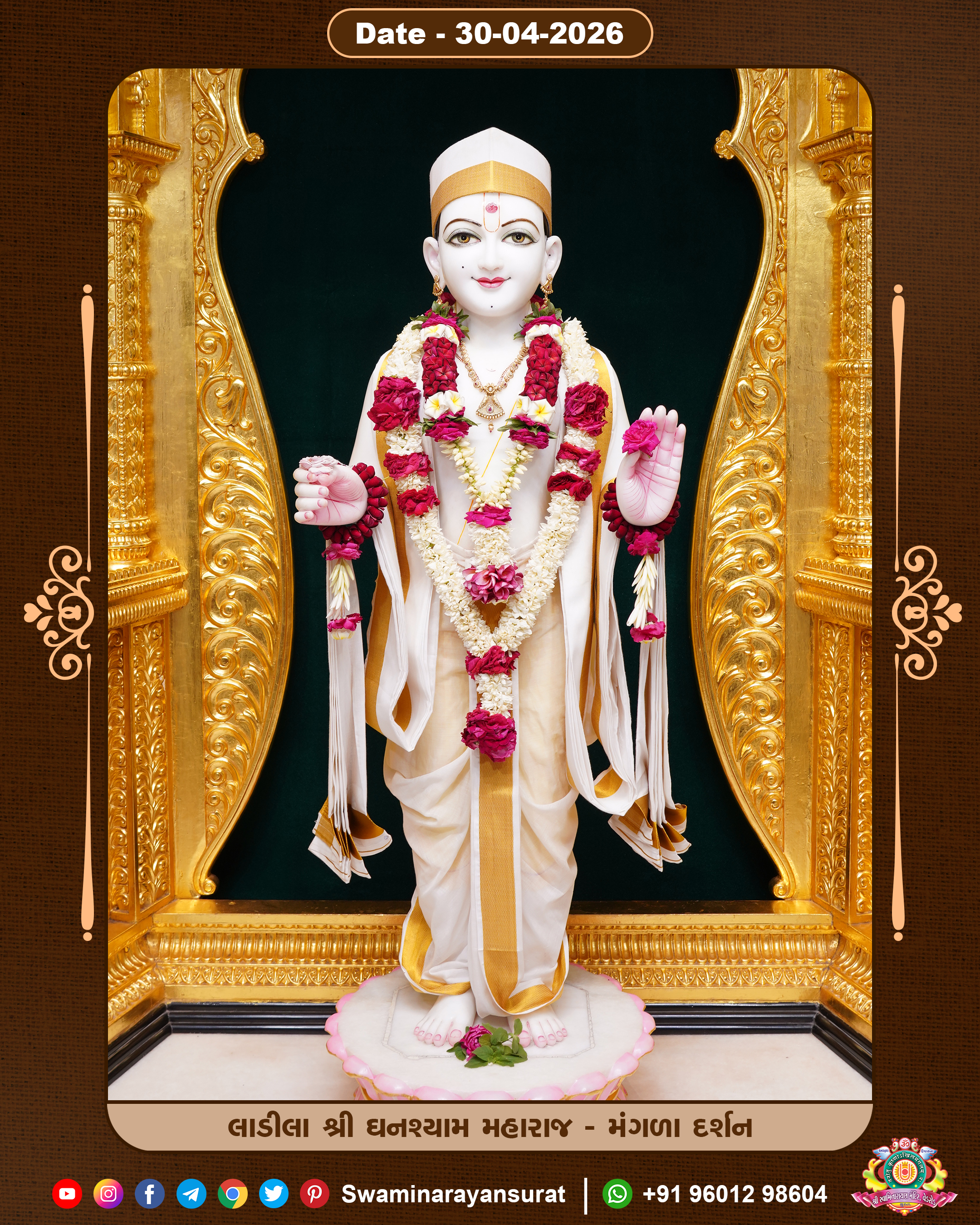 Shree Swaminarayan Temple, VedRoad is a Spiritual Organization Which falls under the region Of Vadtal Temple (The Headquarter Of Laxminarayan Dev Gadi). It is the First Organization Which is Constructed By Pink Stone With Beautiful and Marvellous Carving in Surat Of Swaminarayan Sampraday, Vadtal desh Which is increasing Pride & Prestige of Surat City, This temple contains One Main Shrine under which the idol of Ladila Shree Ghanshyam Maharaj is installed. P. Pu. Sadguru Shree Prabhucharandasji Swami is the Creator of this divine Organization. By the Several Activities & appearance Many devotees feels Easy in difficult Circumstances. He with his approx. 15 Saints & Devotees does Several Social & Spiritual Activities to fulfill the goal of Swaminarayan Sampraday, to do Worship with religious practices.