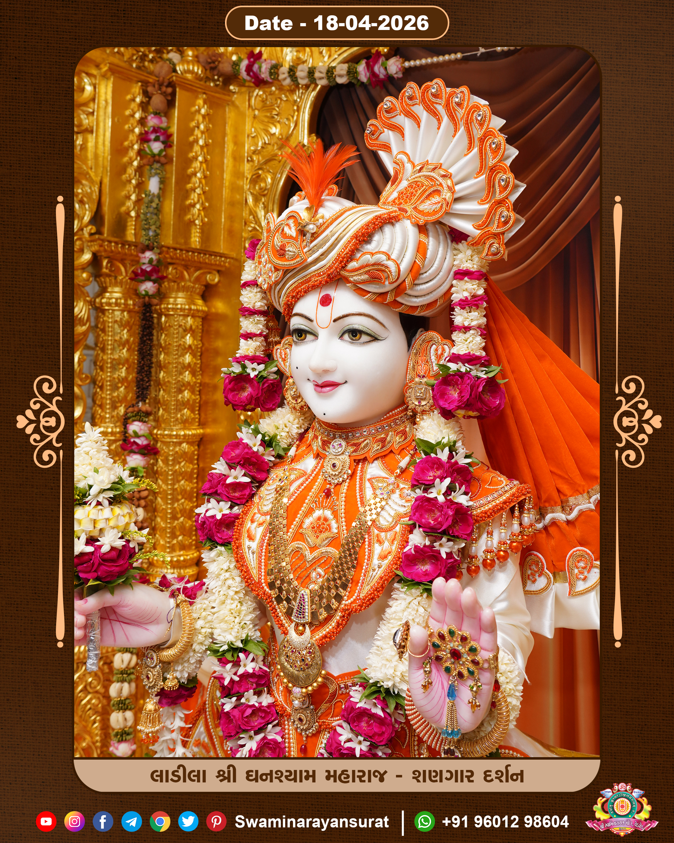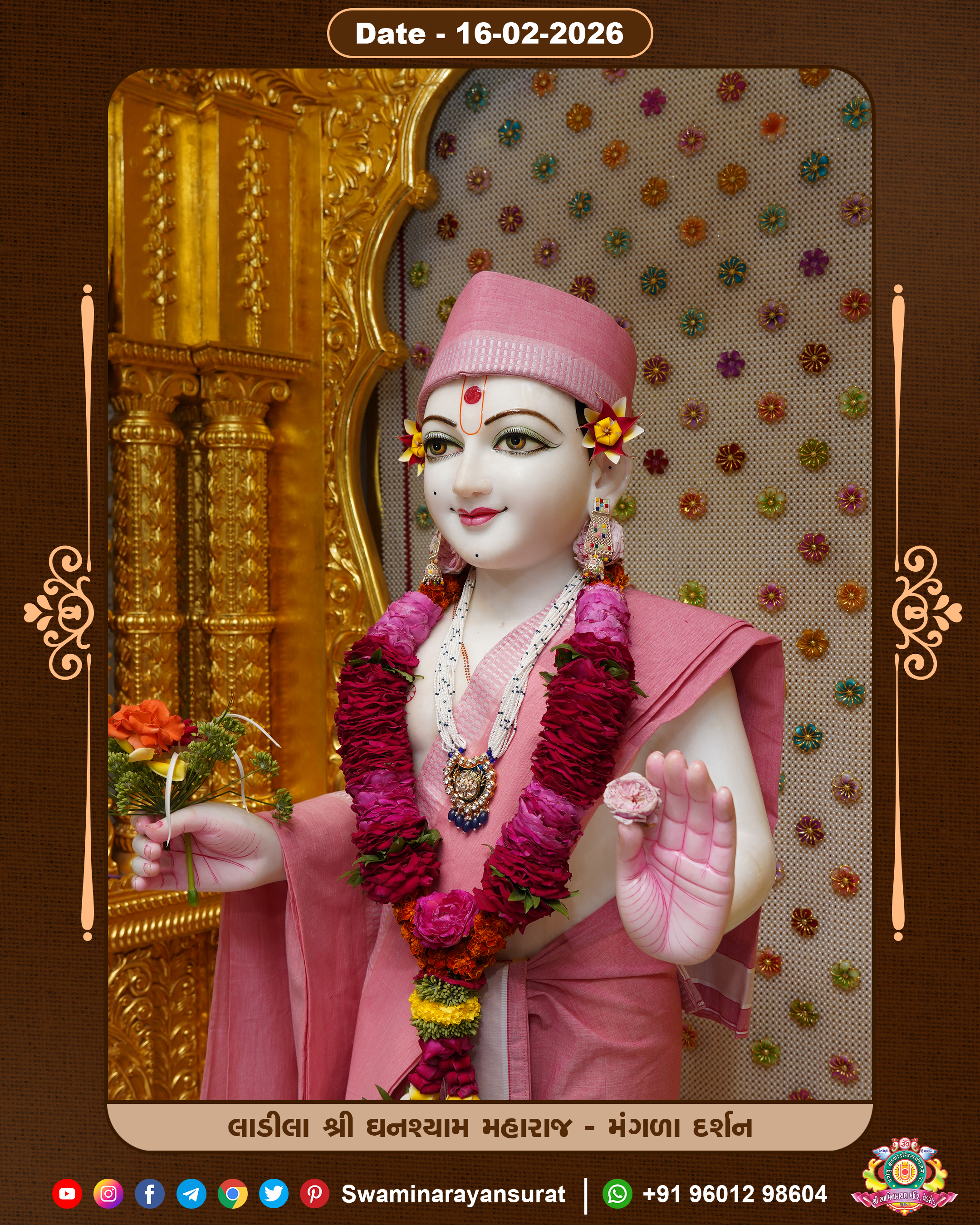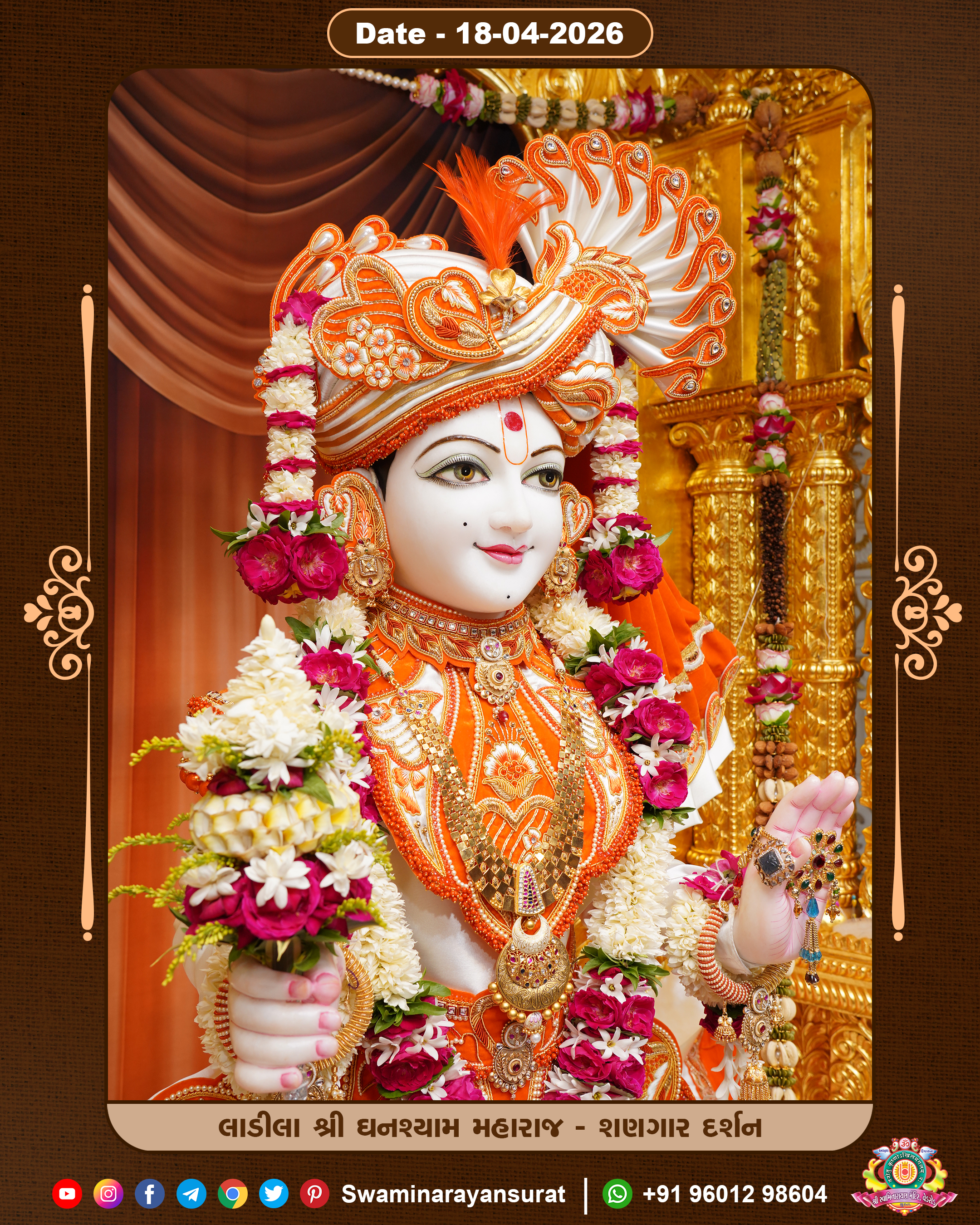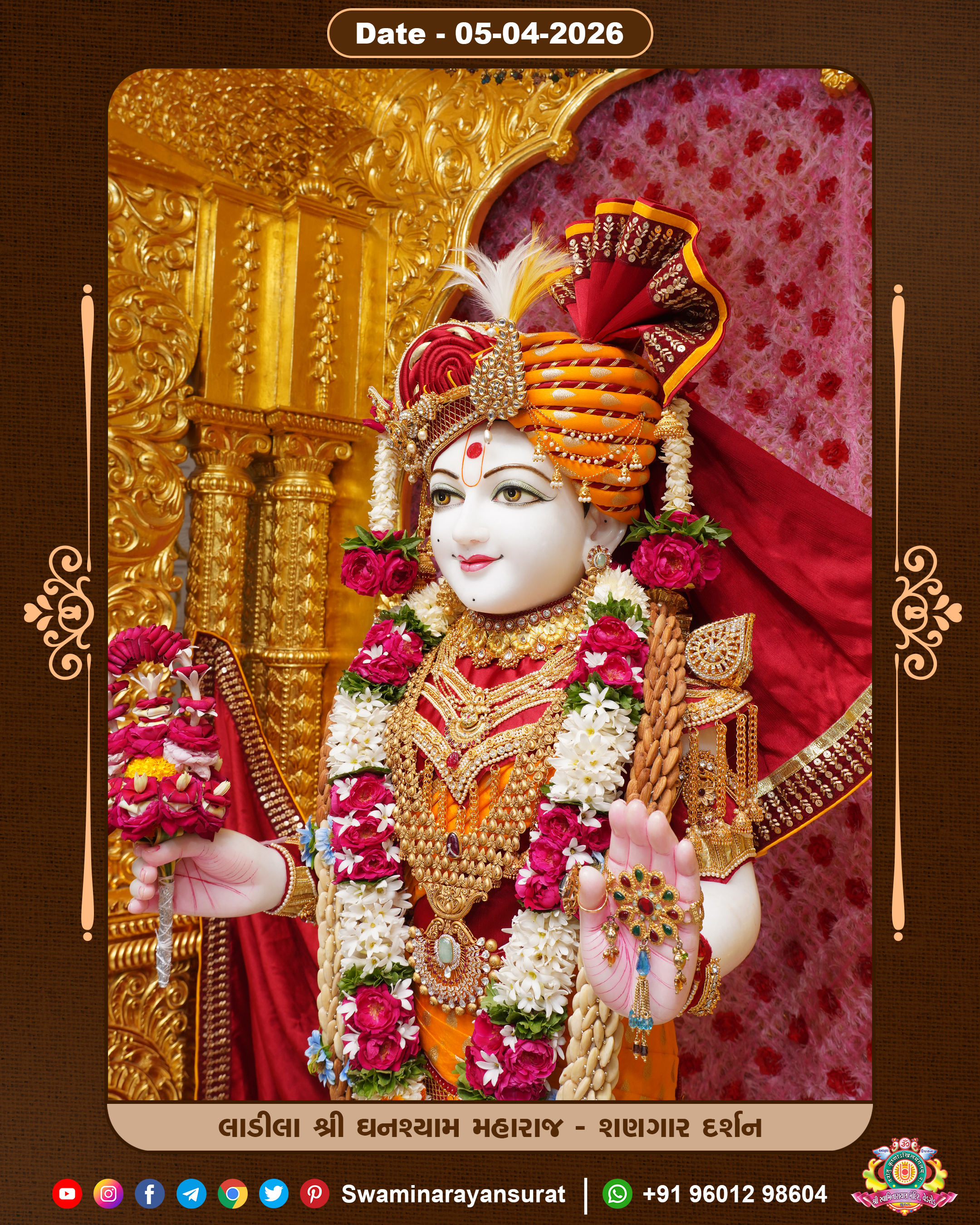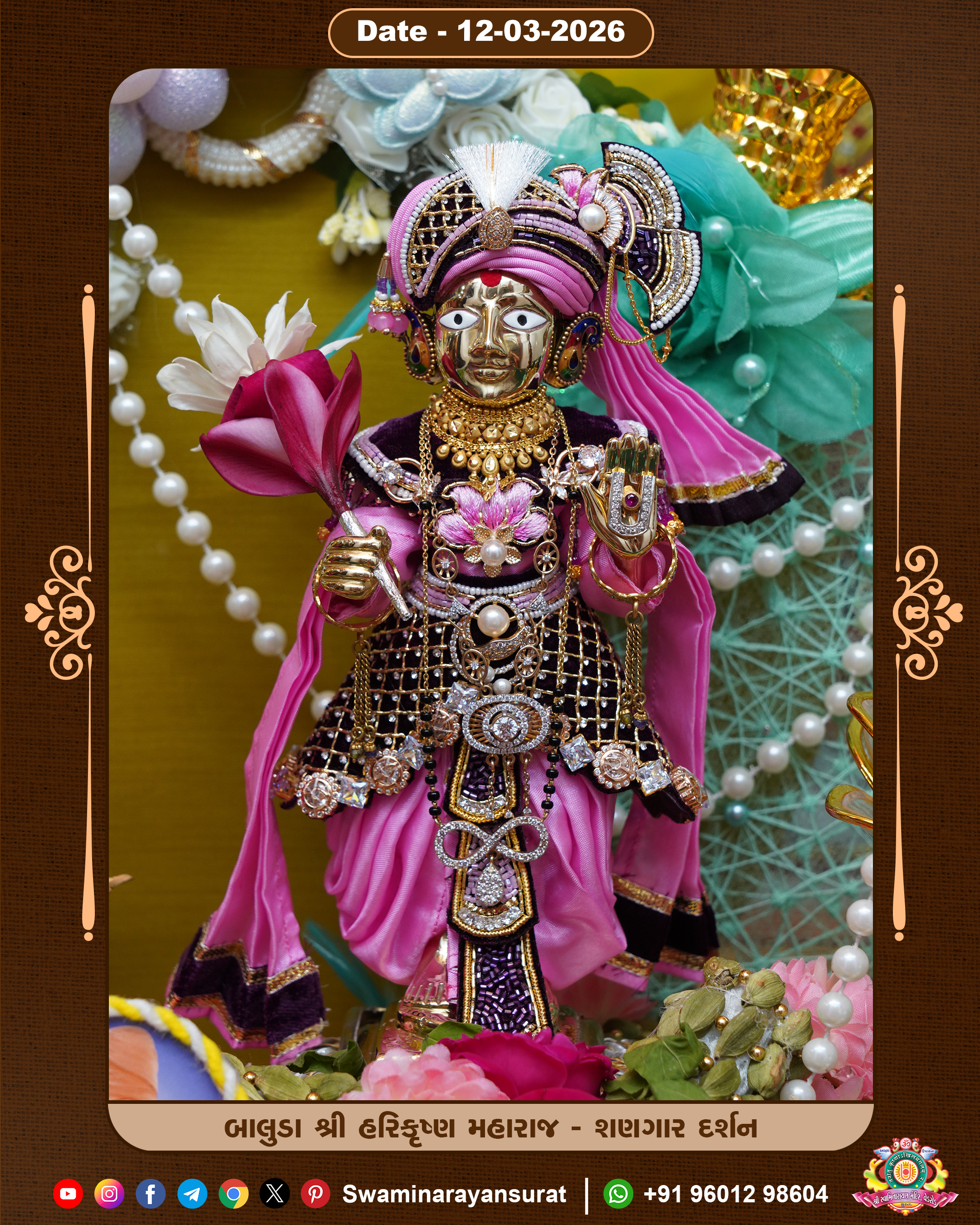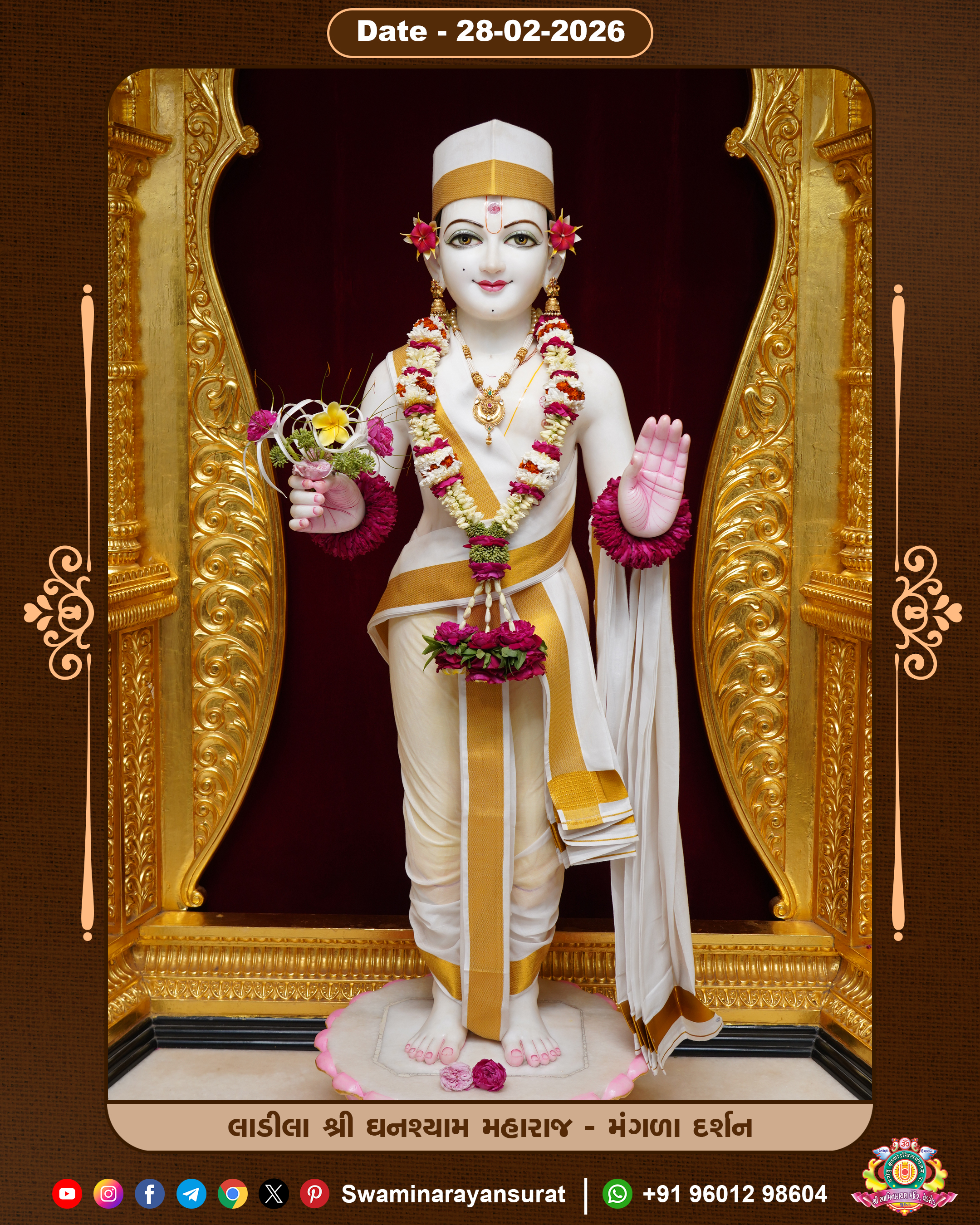 Shree Swaminarayan Temple, VedRoad is a Spiritual Organization Which falls under the region Of Vadtal Temple (The Headquarter Of Laxminarayan Dev Gadi). It is the First Organization Which is Constructed By Pink Stone With Beautiful and Marvellous Carving in Surat Of Swaminarayan Sampraday, Vadtal desh Which is increasing Pride & Prestige of Surat City, This temple contains One Main Shrine under which the idol of Ladila Shree Ghanshyam Maharaj is installed. P. Pu. Sadguru Shree Prabhucharandasji Swami is the Creator of this divine Organization. By the Several Activities & appearance Many devotees feels Easy in difficult Circumstances. He with his approx. 15 Saints & Devotees does Several Social & Spiritual Activities to fulfill the goal of Swaminarayan Sampraday, to do Worship with religious practices.
