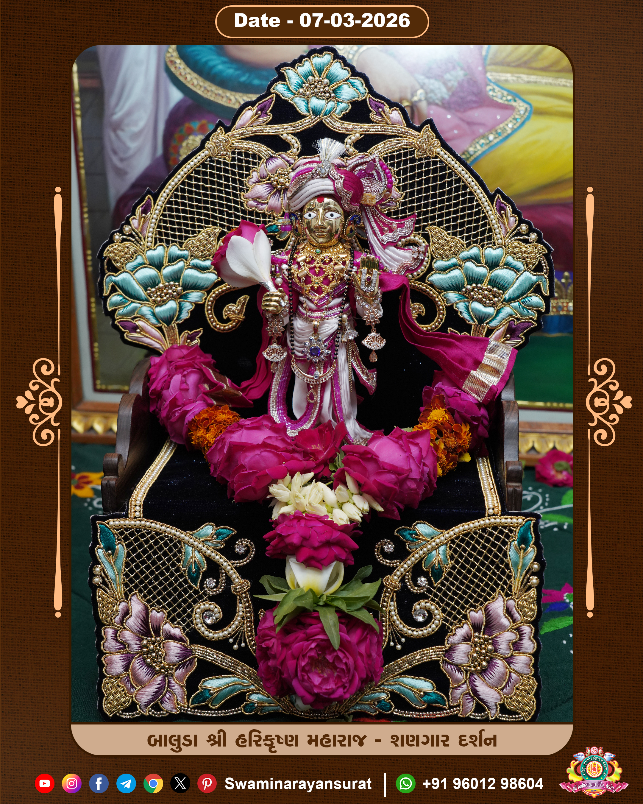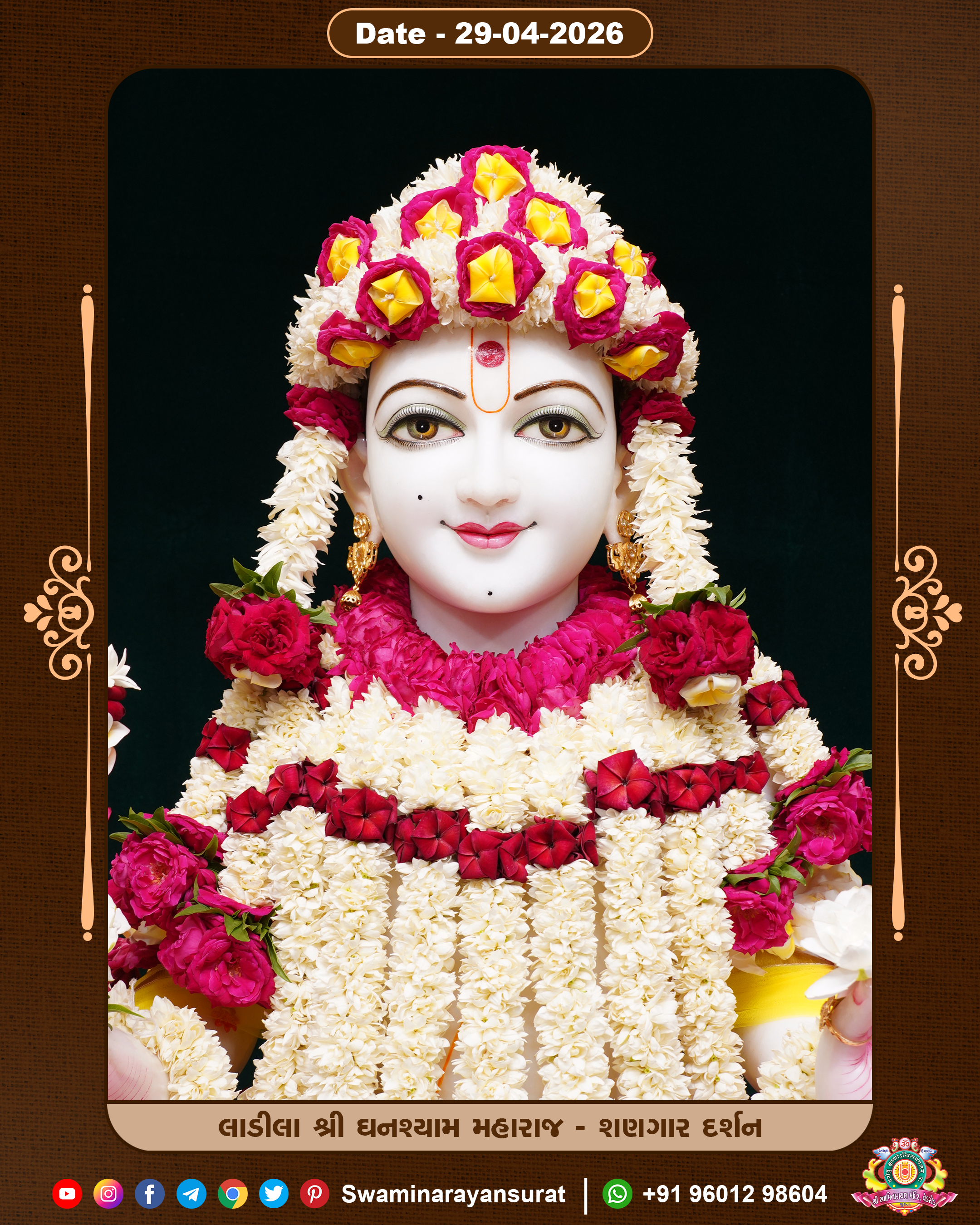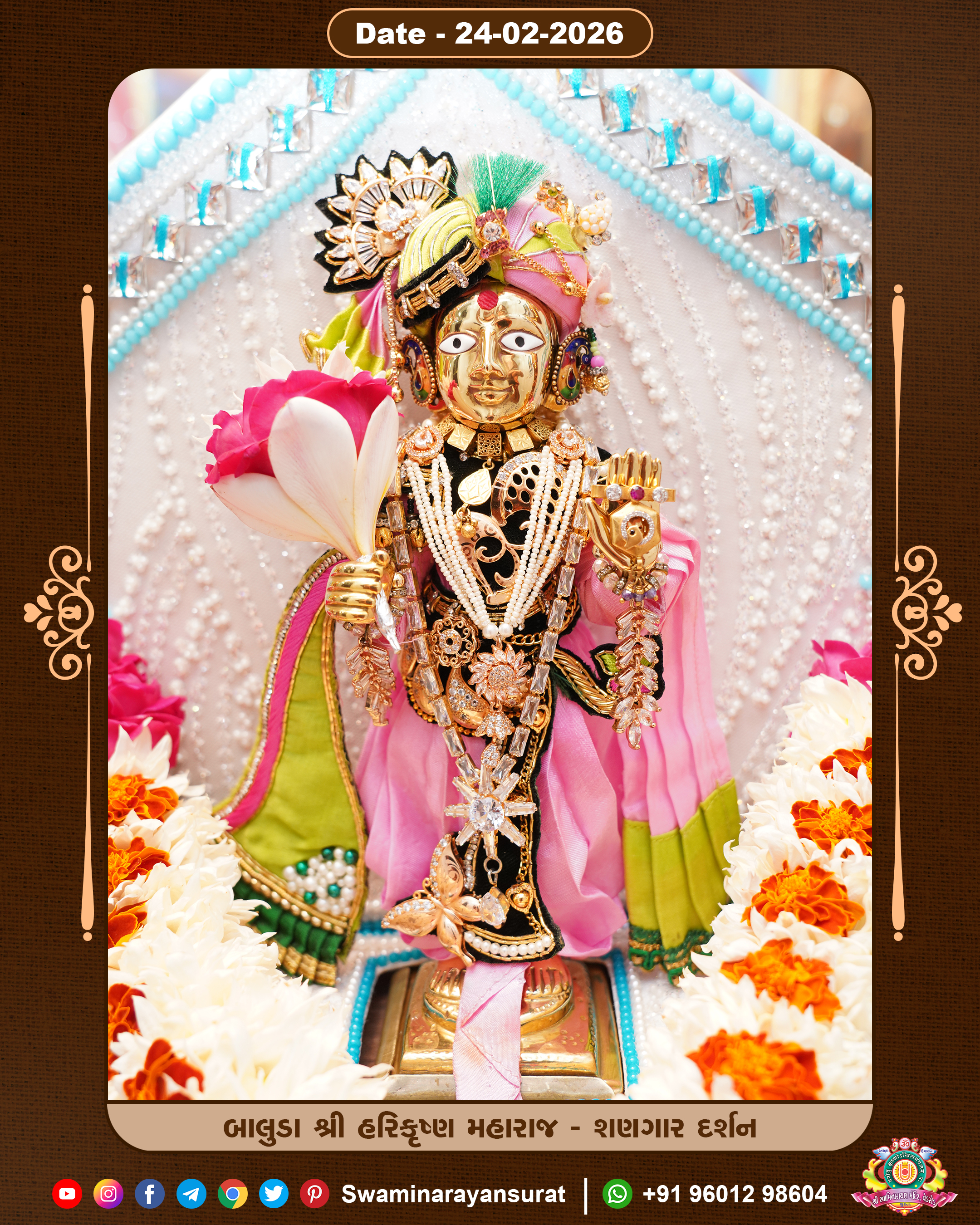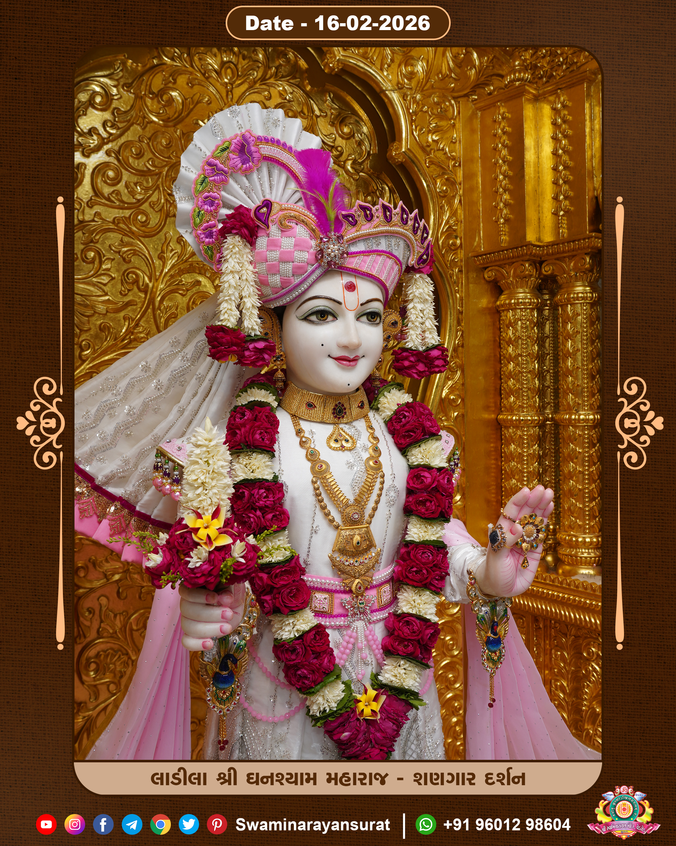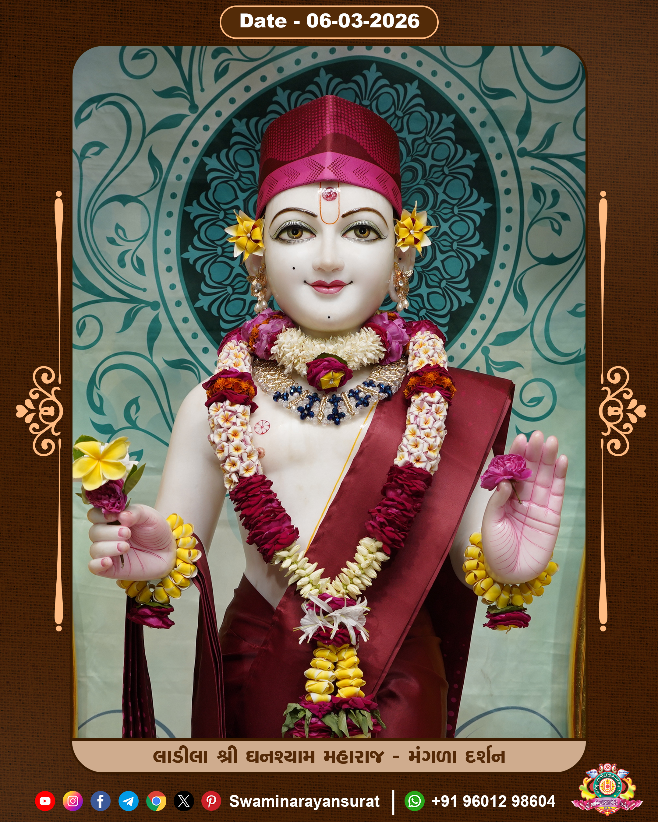 Shree Swaminarayan Temple, VedRoad is a Spiritual Organization Which falls under the region Of Vadtal Temple (The Headquarter Of Laxminarayan Dev Gadi). It is the First Organization Which is Constructed By Pink Stone With Beautiful and Marvellous Carving in Surat Of Swaminarayan Sampraday, Vadtal desh Which is increasing Pride & Prestige of Surat City, This temple contains One Main Shrine under which the idol of Ladila Shree Ghanshyam Maharaj is installed. P. Pu. Sadguru Shree Prabhucharandasji Swami is the Creator of this divine Organization. By the Several Activities & appearance Many devotees feels Easy in difficult Circumstances. He with his approx. 15 Saints & Devotees does Several Social & Spiritual Activities to fulfill the goal of Swaminarayan Sampraday, to do Worship with religious practices.