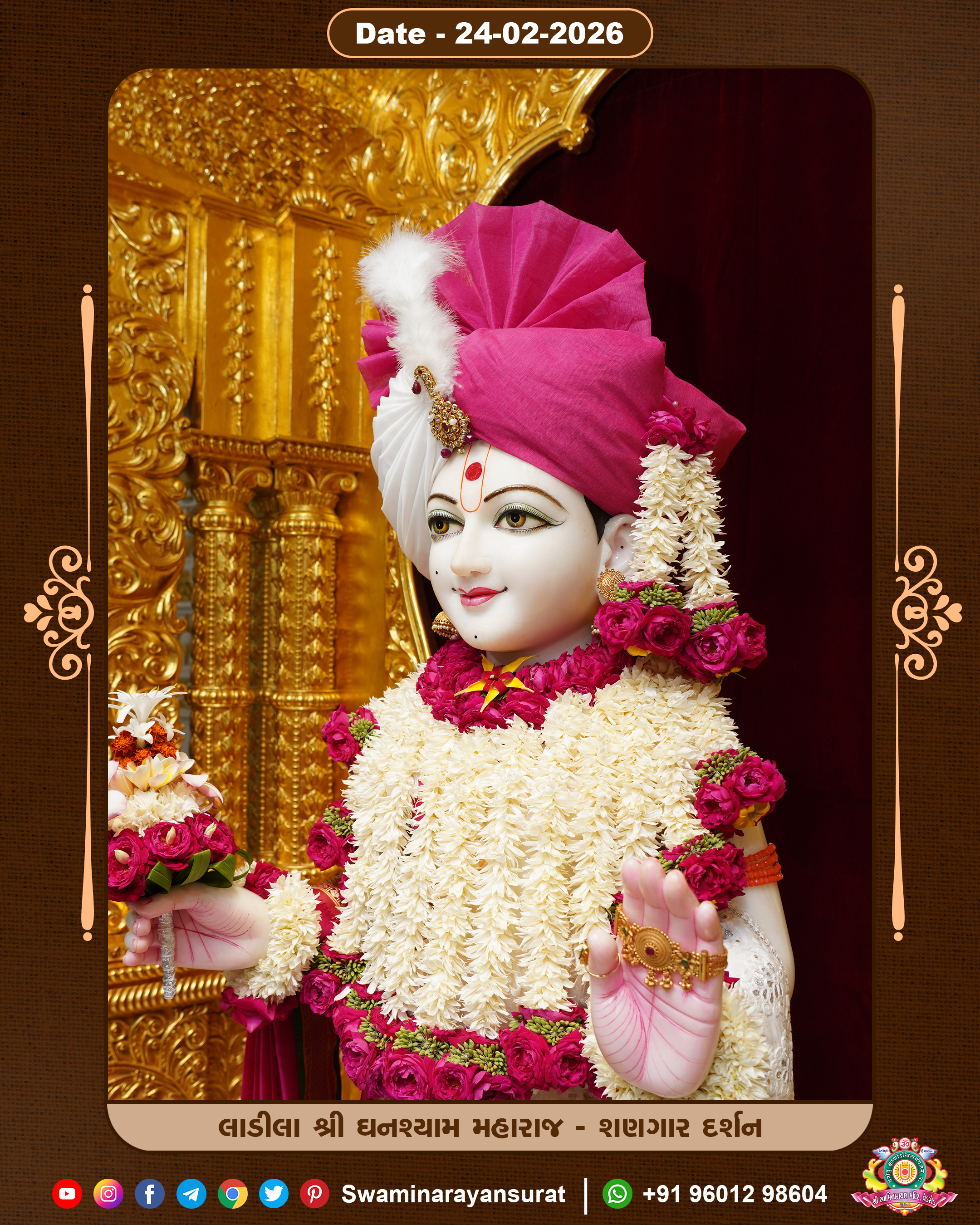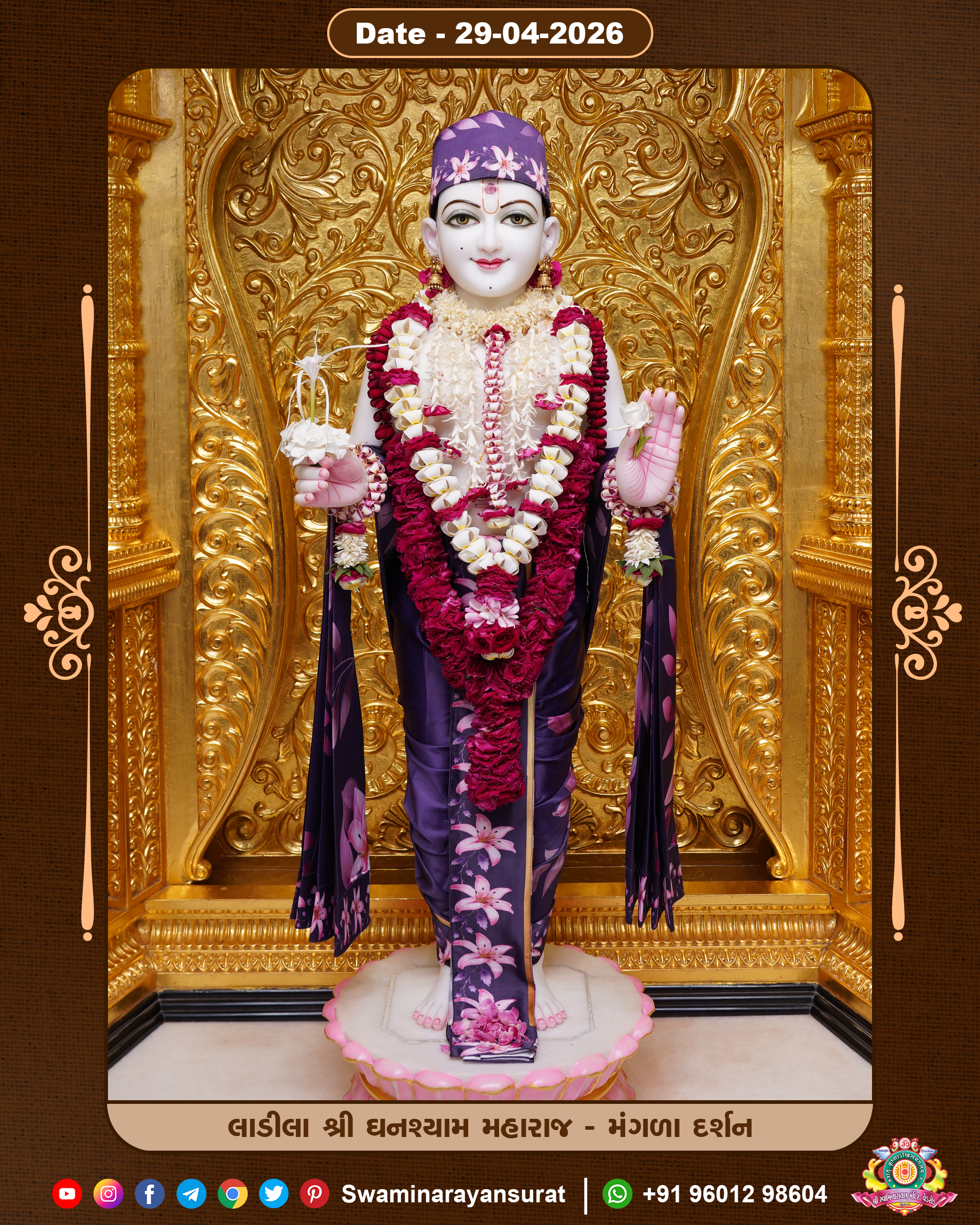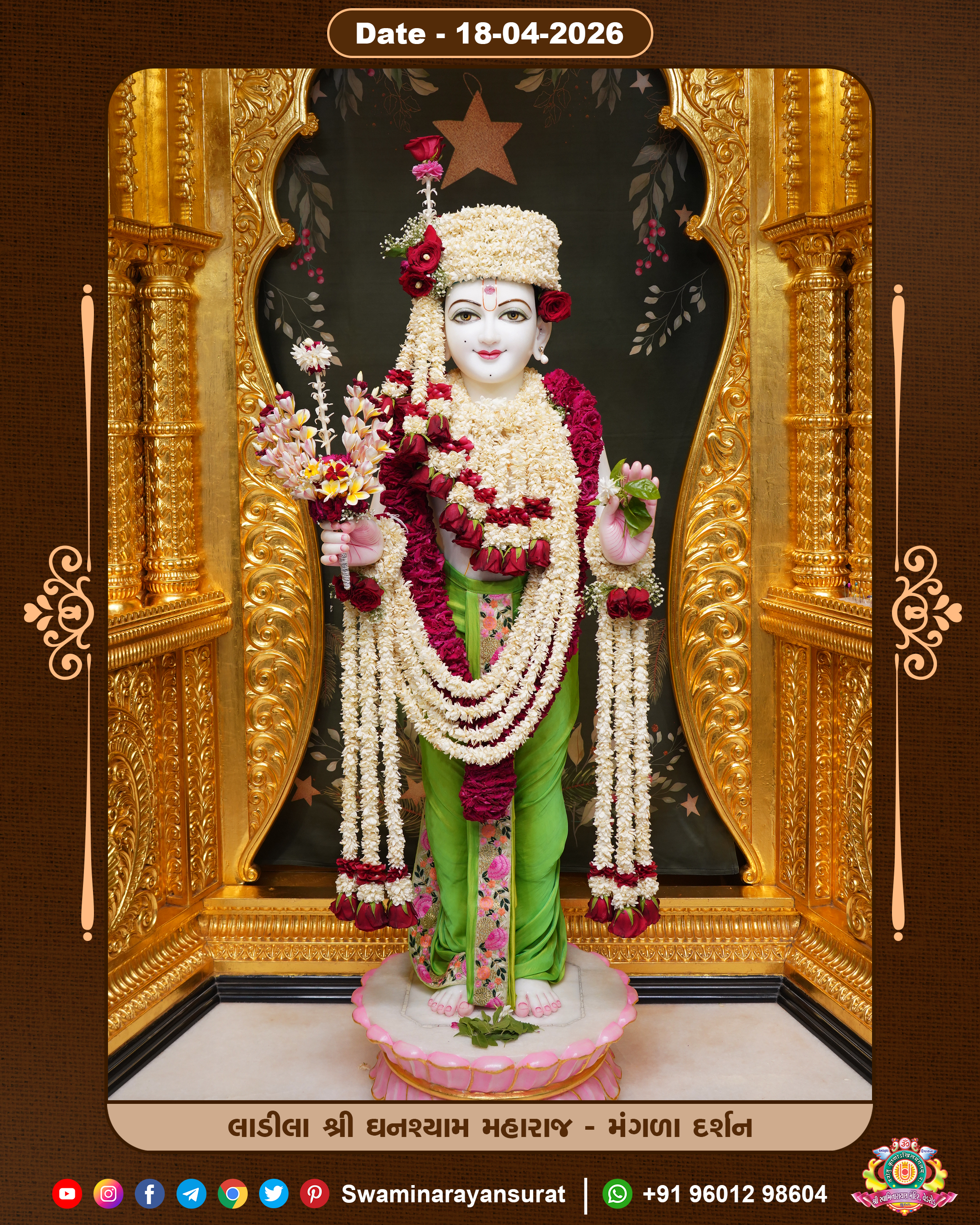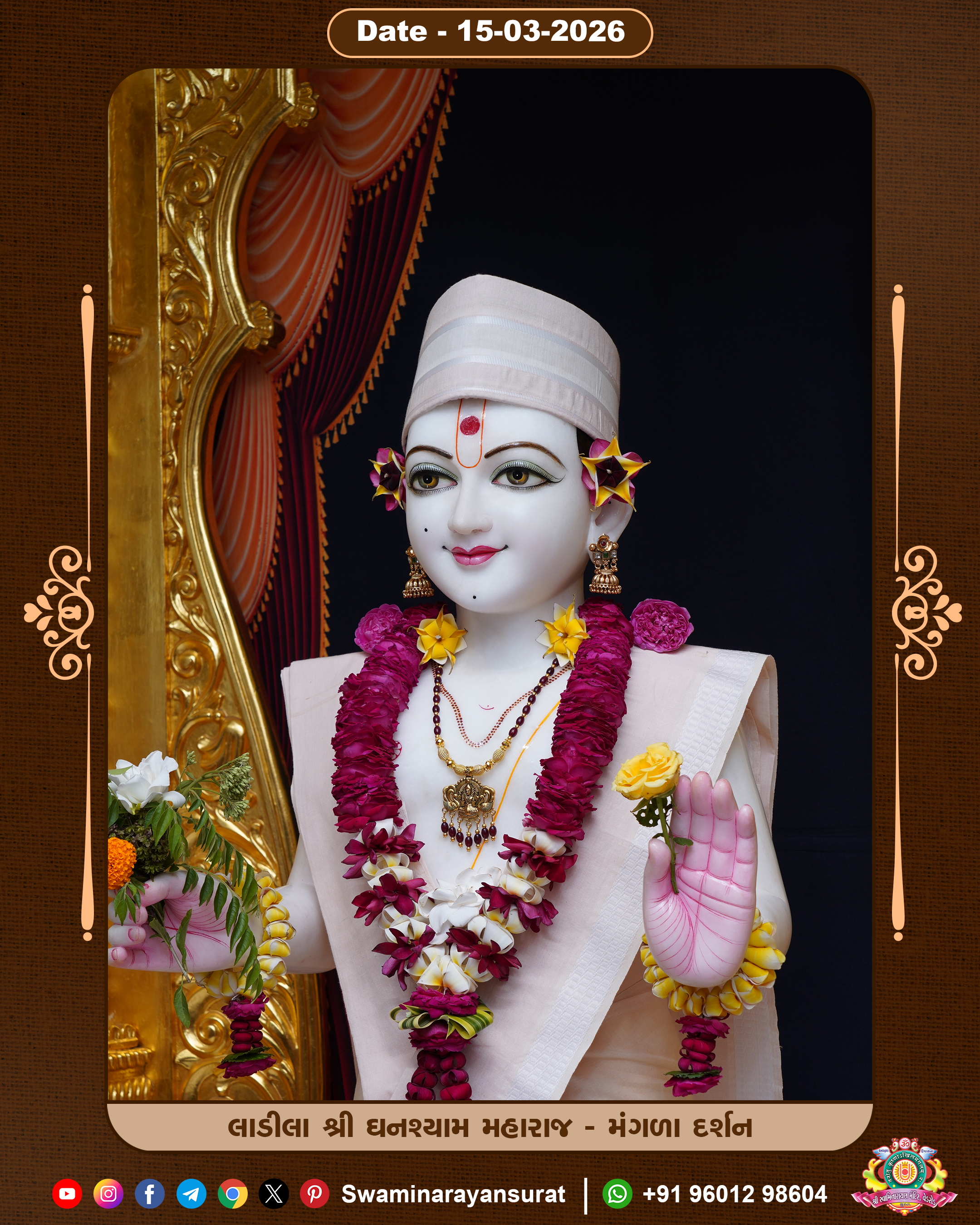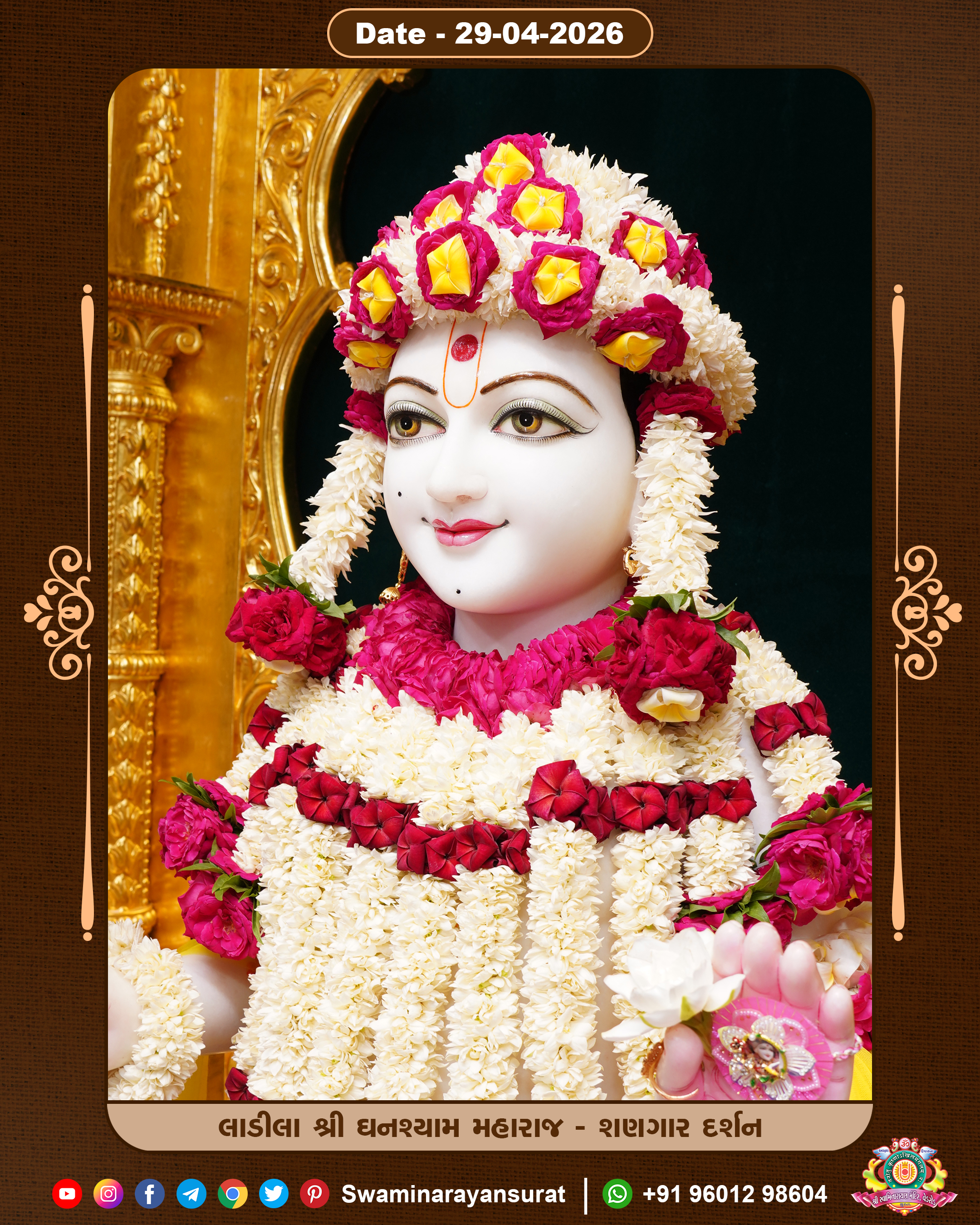 Shree Swaminarayan Temple, VedRoad is a Spiritual Organization Which falls under the region Of Vadtal Temple (The Headquarter Of Laxminarayan Dev Gadi). It is the First Organization Which is Constructed By Pink Stone With Beautiful and Marvellous Carving in Surat Of Swaminarayan Sampraday, Vadtal desh Which is increasing Pride & Prestige of Surat City, This temple contains One Main Shrine under which the idol of Ladila Shree Ghanshyam Maharaj is installed. P. Pu. Sadguru Shree Prabhucharandasji Swami is the Creator of this divine Organization. By the Several Activities & appearance Many devotees feels Easy in difficult Circumstances. He with his approx. 15 Saints & Devotees does Several Social & Spiritual Activities to fulfill the goal of Swaminarayan Sampraday, to do Worship with religious practices.