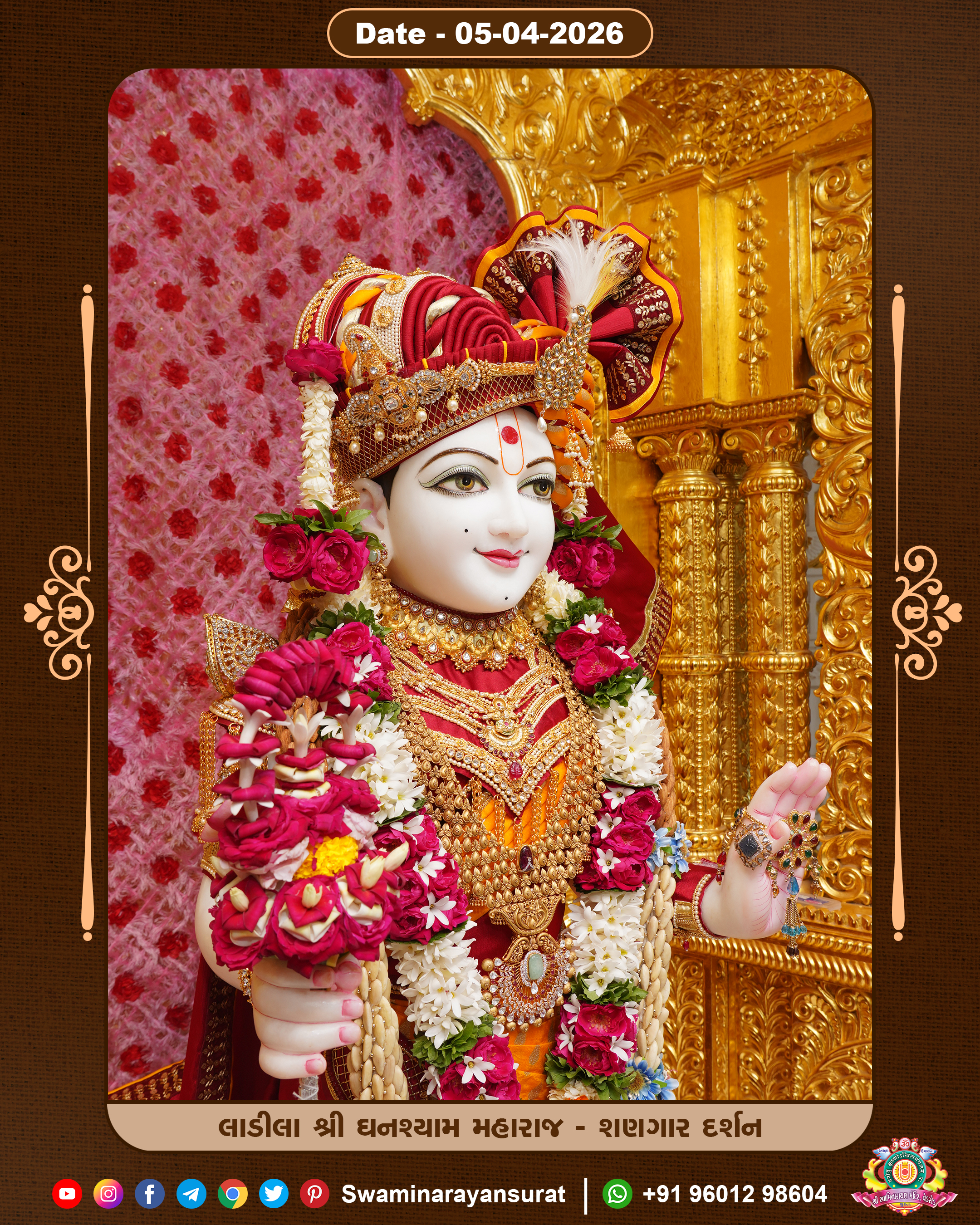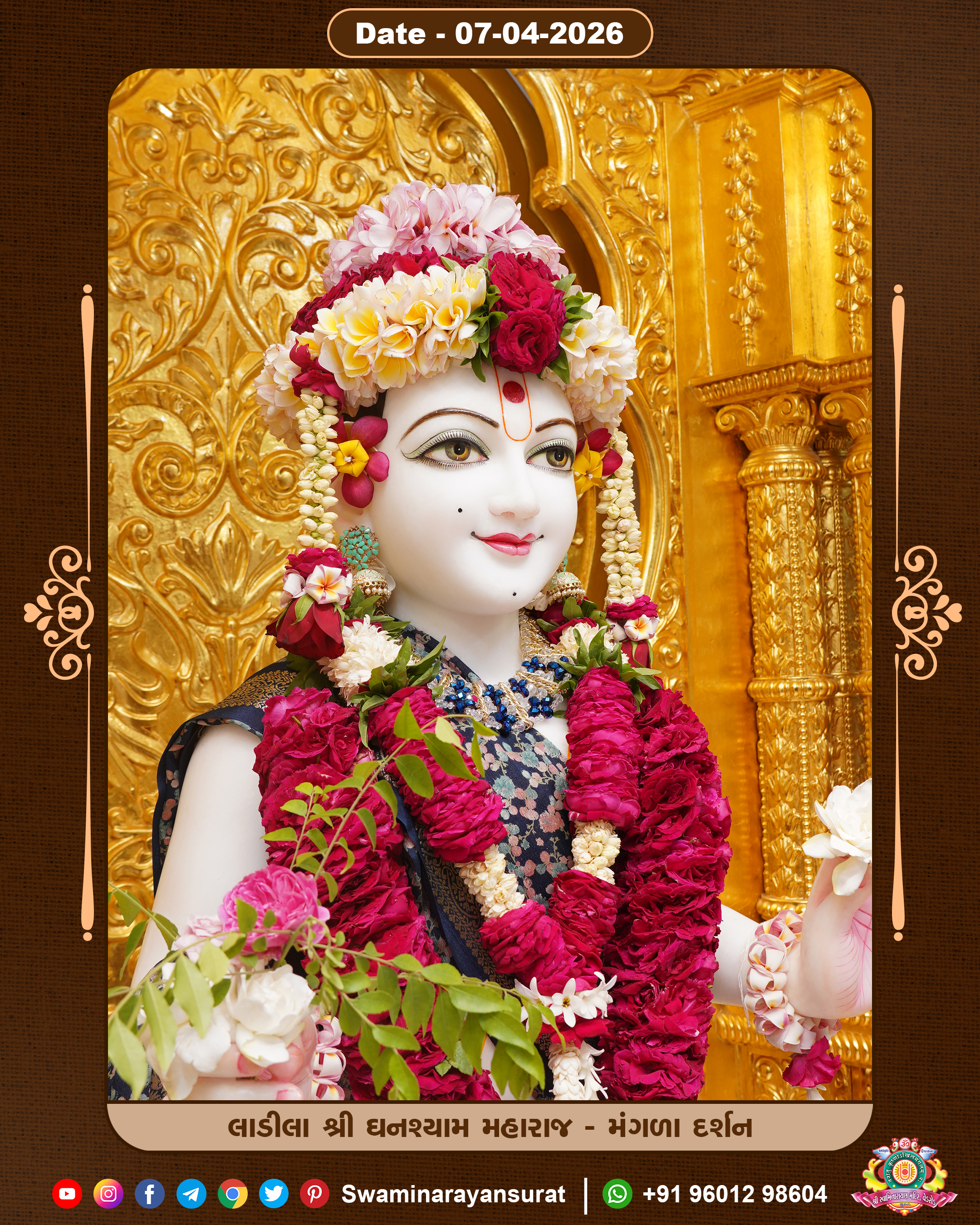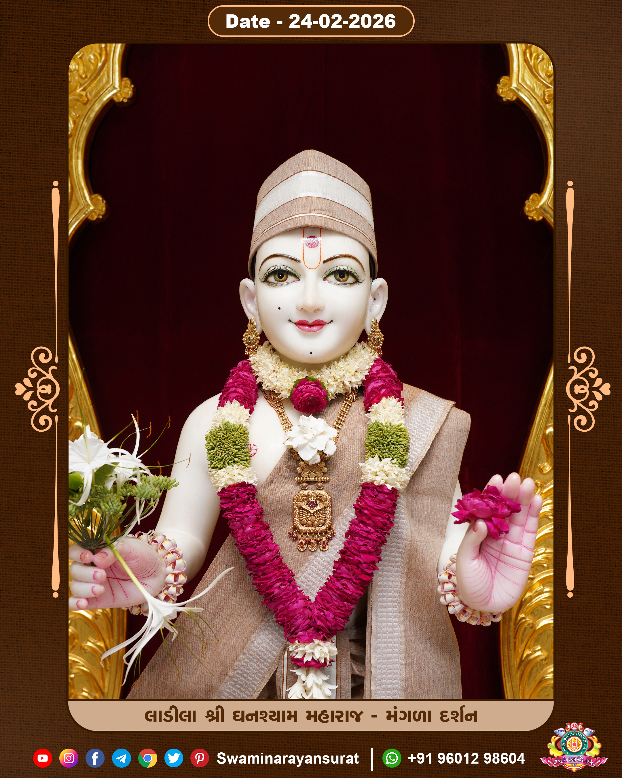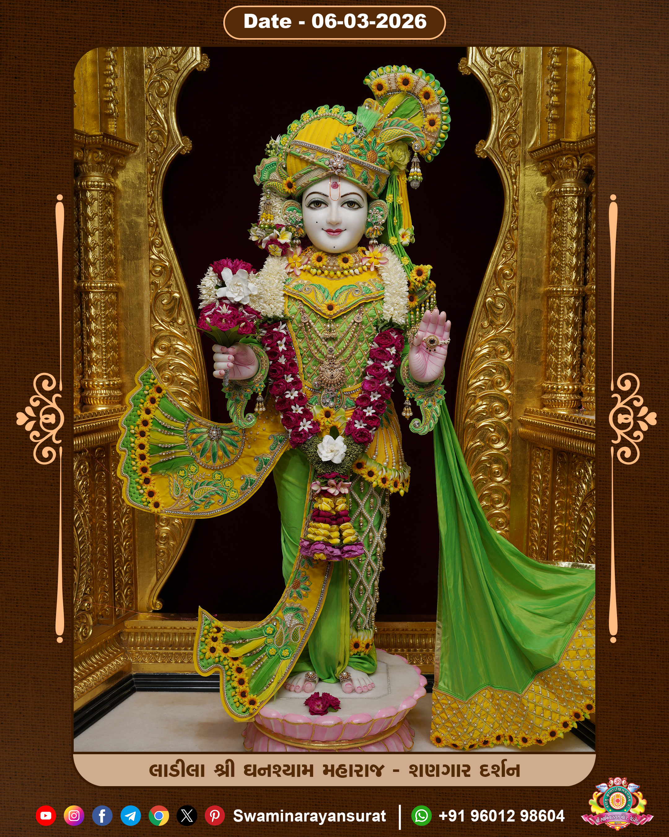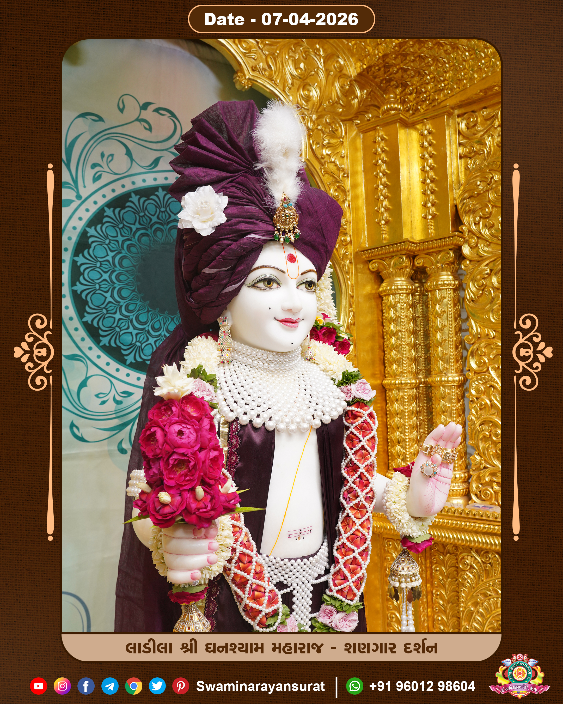 Shree Swaminarayan Temple, VedRoad is a Spiritual Organization Which falls under the region Of Vadtal Temple (The Headquarter Of Laxminarayan Dev Gadi). It is the First Organization Which is Constructed By Pink Stone With Beautiful and Marvellous Carving in Surat Of Swaminarayan Sampraday, Vadtal desh Which is increasing Pride & Prestige of Surat City, This temple contains One Main Shrine under which the idol of Ladila Shree Ghanshyam Maharaj is installed. P. Pu. Sadguru Shree Prabhucharandasji Swami is the Creator of this divine Organization. By the Several Activities & appearance Many devotees feels Easy in difficult Circumstances. He with his approx. 15 Saints & Devotees does Several Social & Spiritual Activities to fulfill the goal of Swaminarayan Sampraday, to do Worship with religious practices.