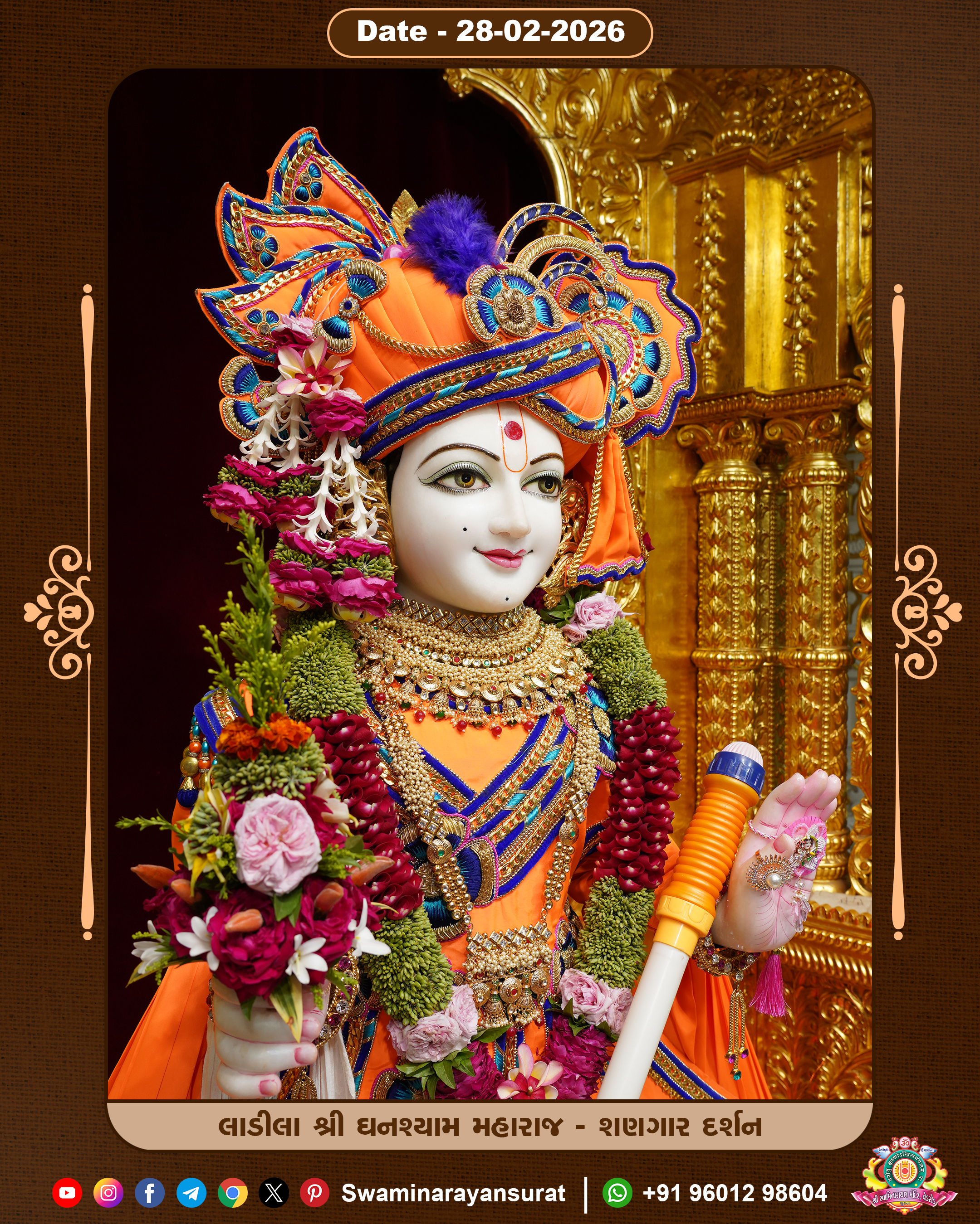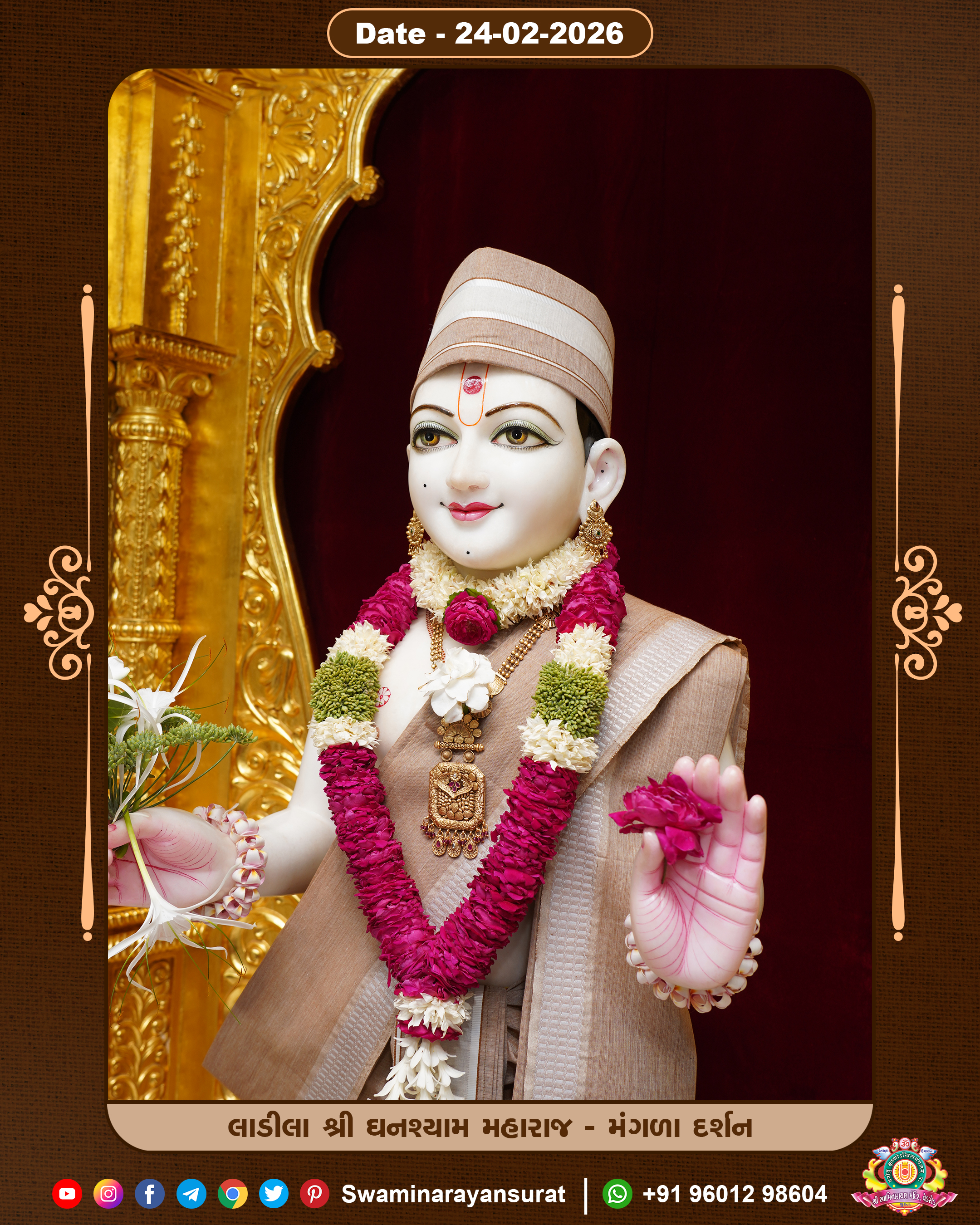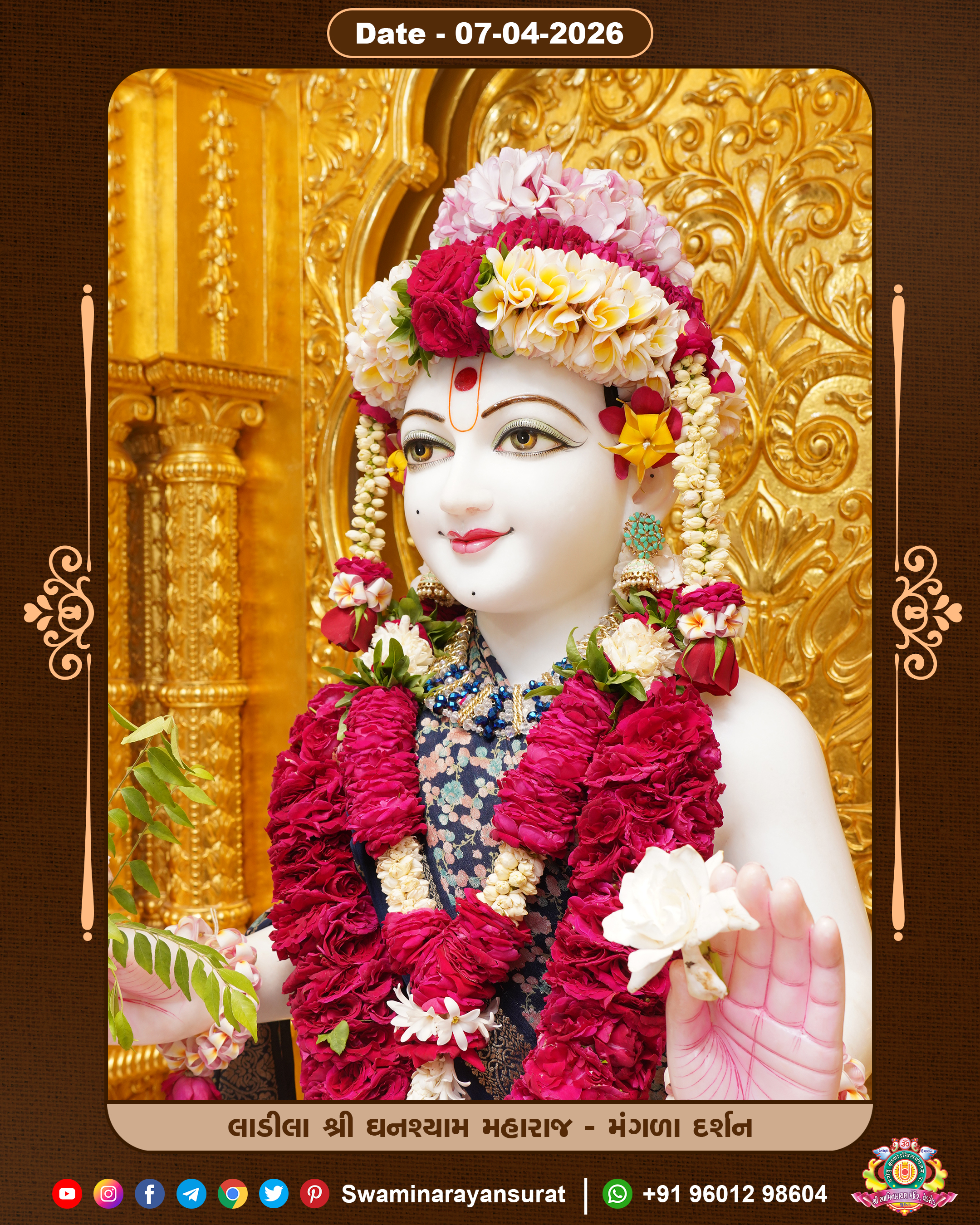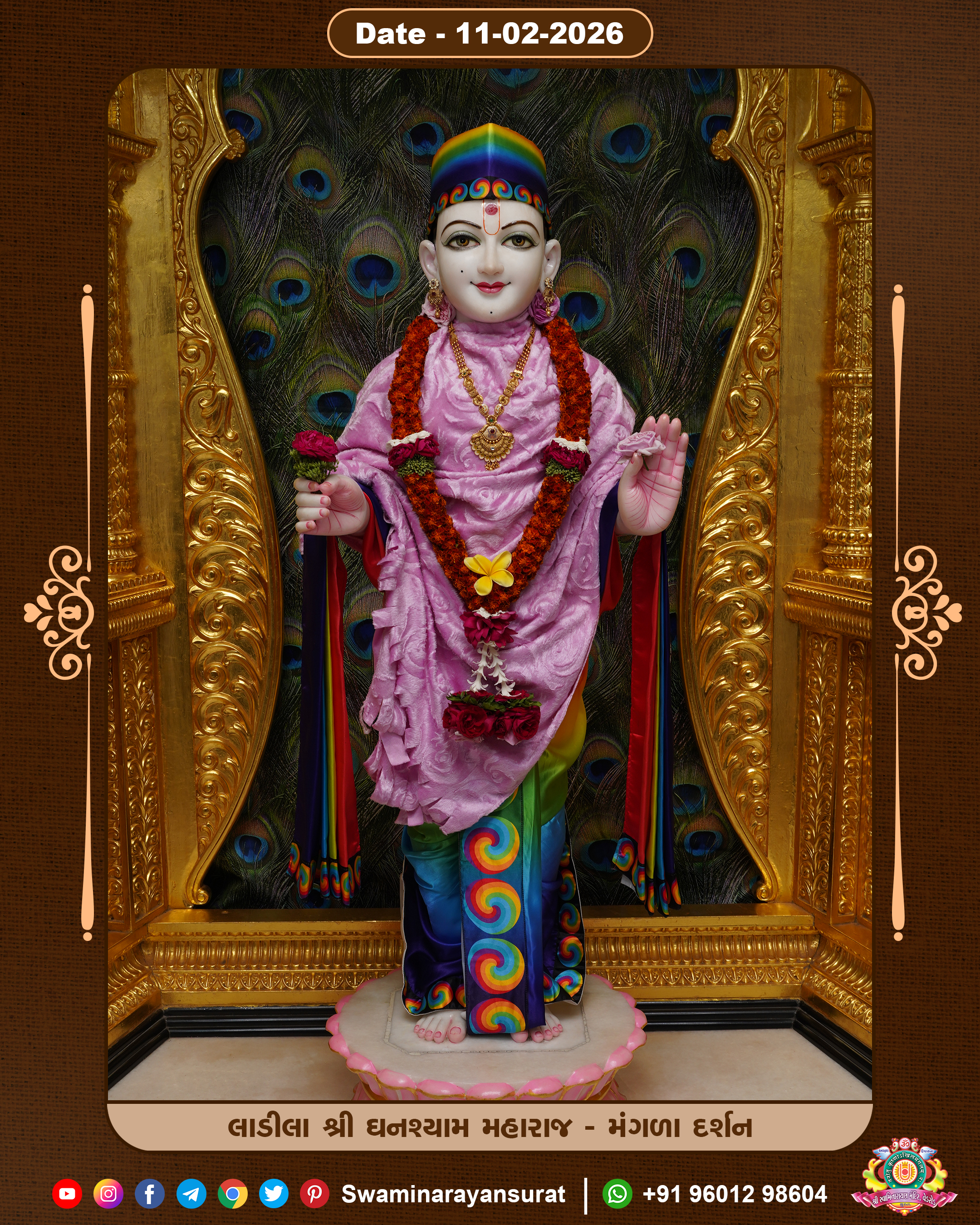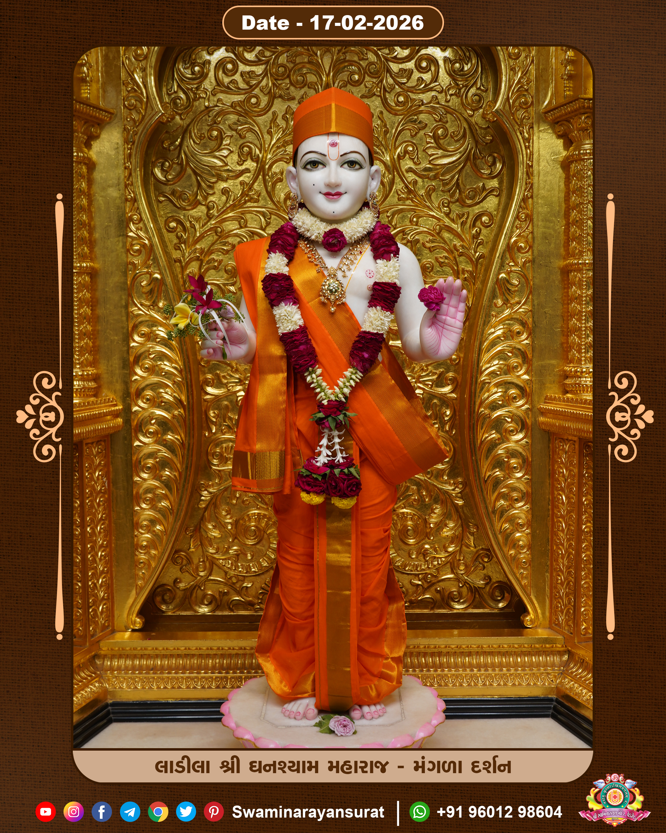 Shree Swaminarayan Temple, VedRoad is a Spiritual Organization Which falls under the region Of Vadtal Temple (The Headquarter Of Laxminarayan Dev Gadi). It is the First Organization Which is Constructed By Pink Stone With Beautiful and Marvellous Carving in Surat Of Swaminarayan Sampraday, Vadtal desh Which is increasing Pride & Prestige of Surat City, This temple contains One Main Shrine under which the idol of Ladila Shree Ghanshyam Maharaj is installed. P. Pu. Sadguru Shree Prabhucharandasji Swami is the Creator of this divine Organization. By the Several Activities & appearance Many devotees feels Easy in difficult Circumstances. He with his approx. 15 Saints & Devotees does Several Social & Spiritual Activities to fulfill the goal of Swaminarayan Sampraday, to do Worship with religious practices.