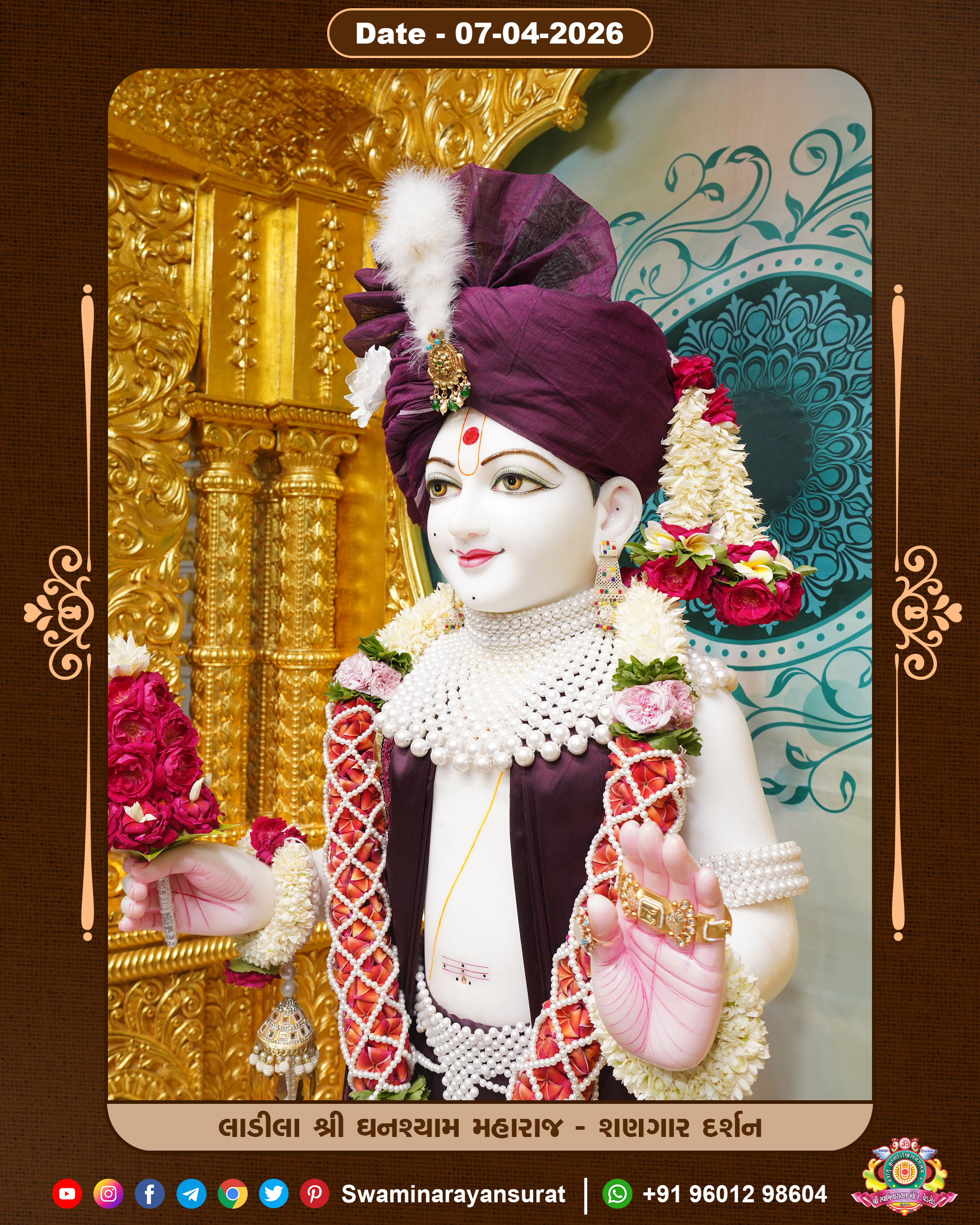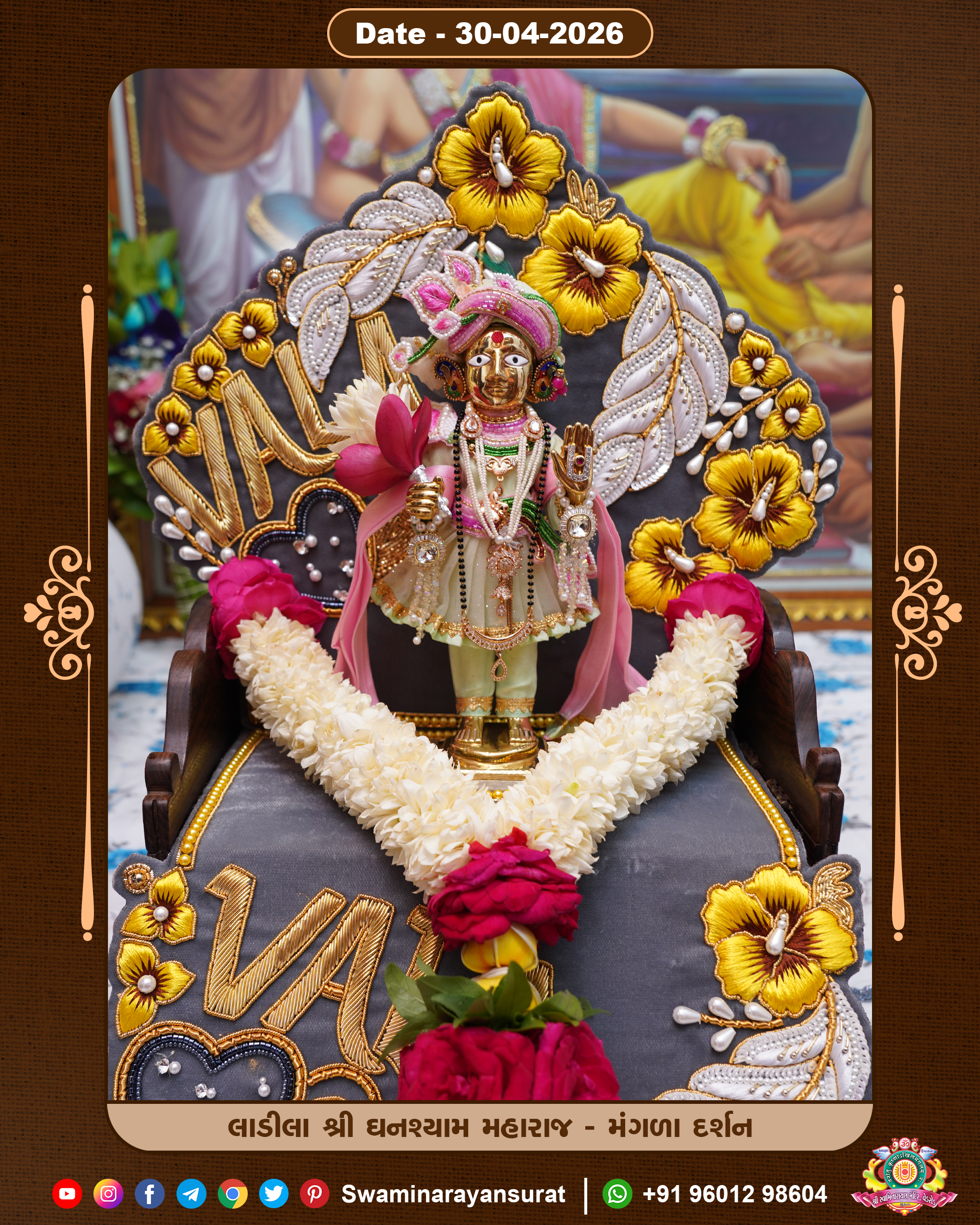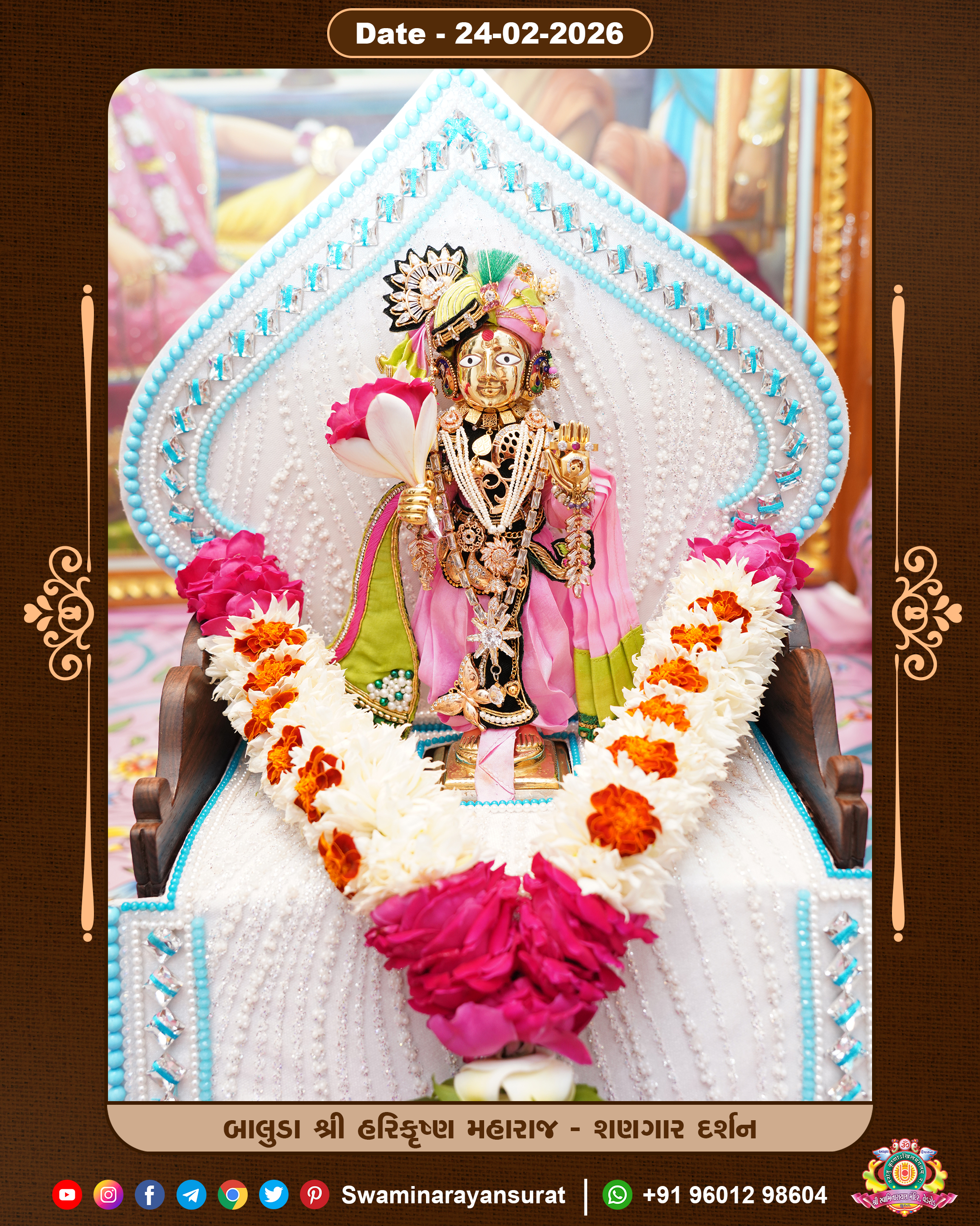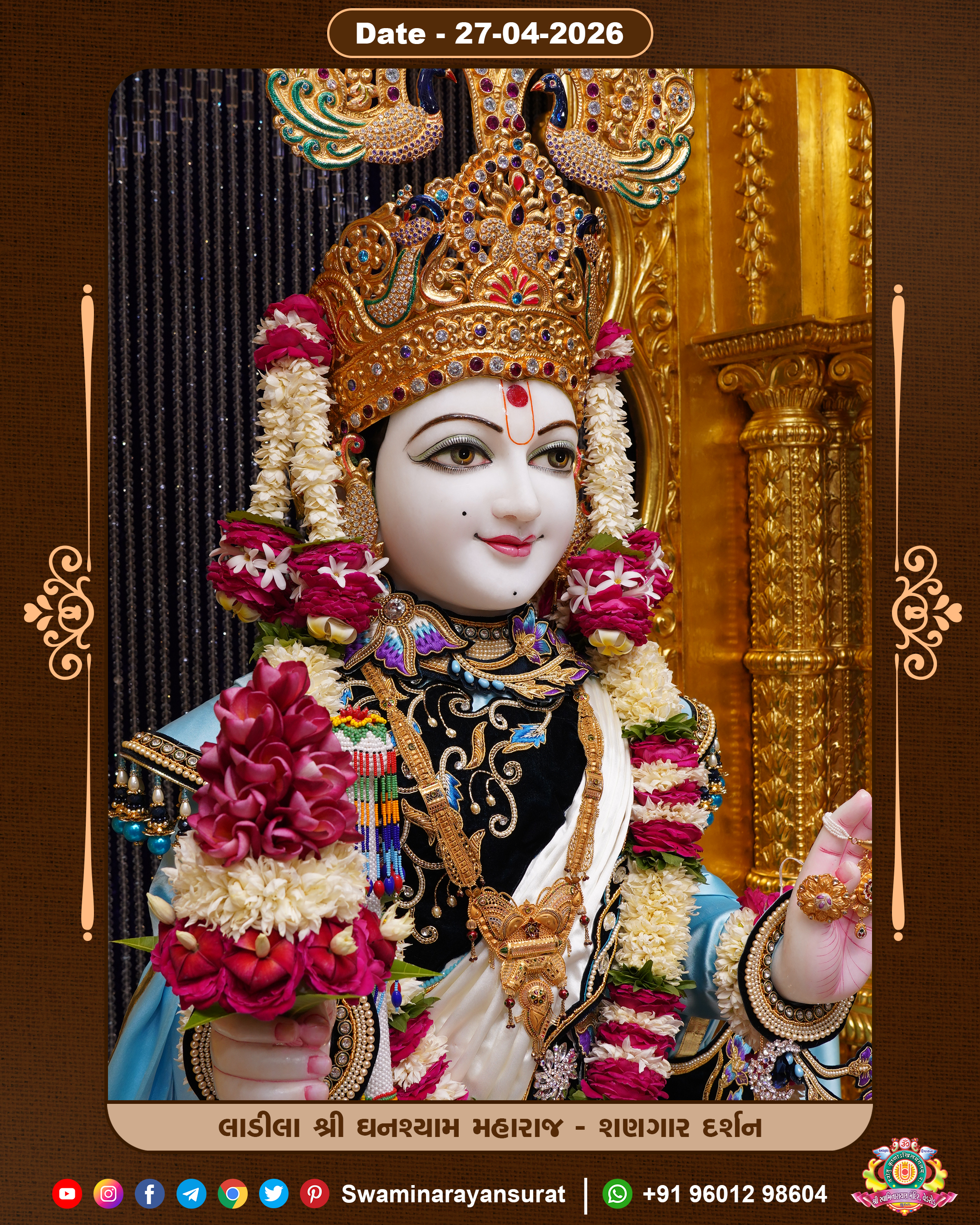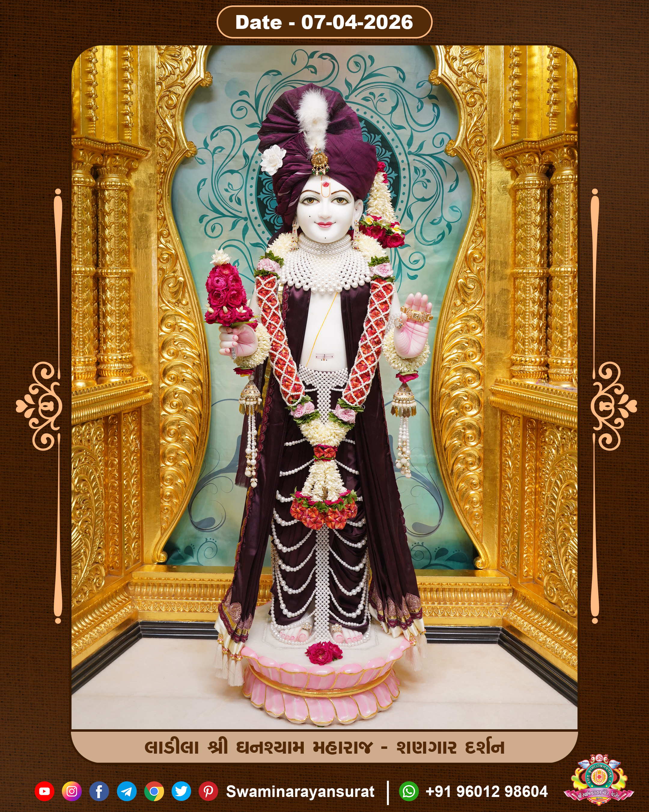 Shree Swaminarayan Temple, VedRoad is a Spiritual Organization Which falls under the region Of Vadtal Temple (The Headquarter Of Laxminarayan Dev Gadi). It is the First Organization Which is Constructed By Pink Stone With Beautiful and Marvellous Carving in Surat Of Swaminarayan Sampraday, Vadtal desh Which is increasing Pride & Prestige of Surat City, This temple contains One Main Shrine under which the idol of Ladila Shree Ghanshyam Maharaj is installed. P. Pu. Sadguru Shree Prabhucharandasji Swami is the Creator of this divine Organization. By the Several Activities & appearance Many devotees feels Easy in difficult Circumstances. He with his approx. 15 Saints & Devotees does Several Social & Spiritual Activities to fulfill the goal of Swaminarayan Sampraday, to do Worship with religious practices.