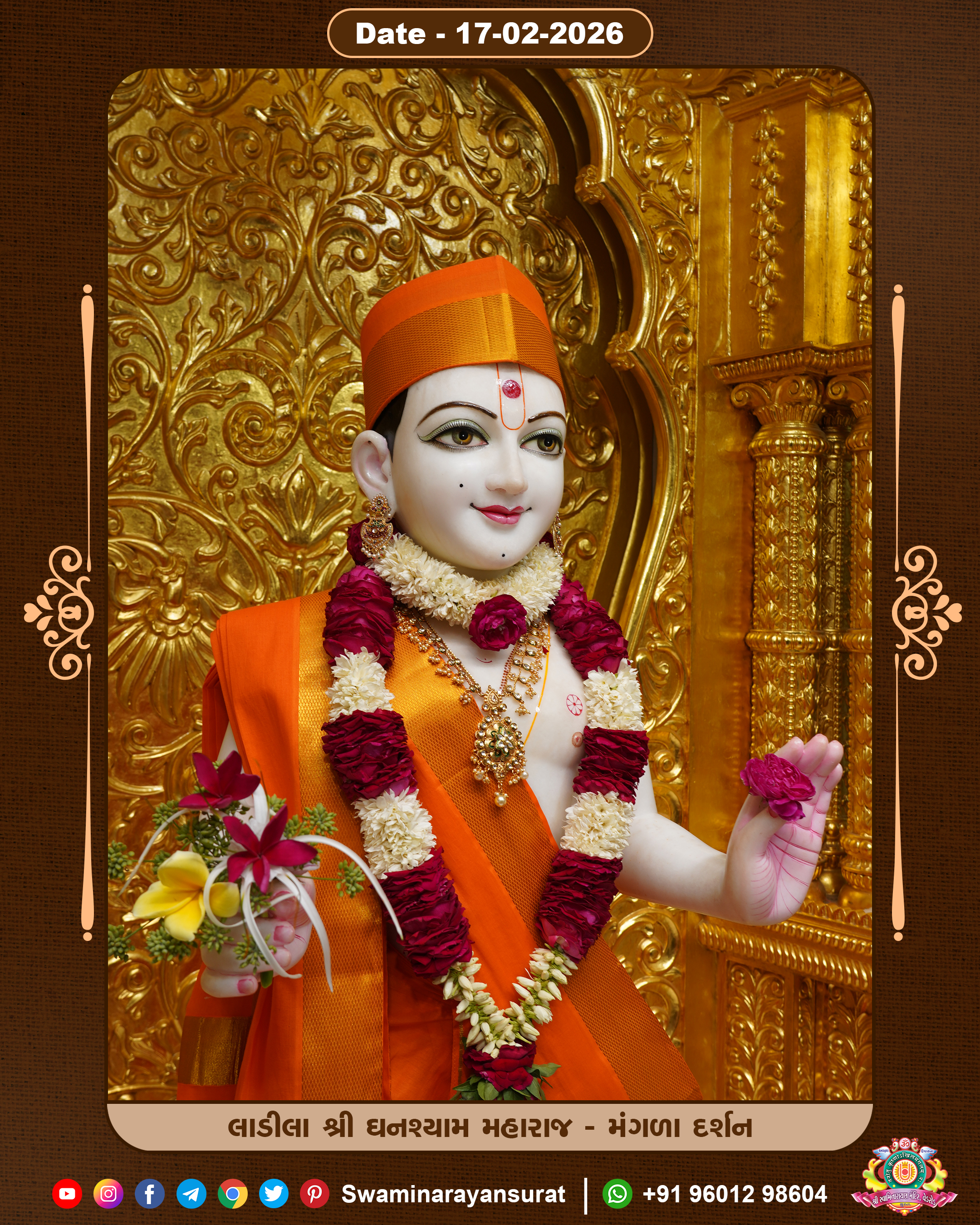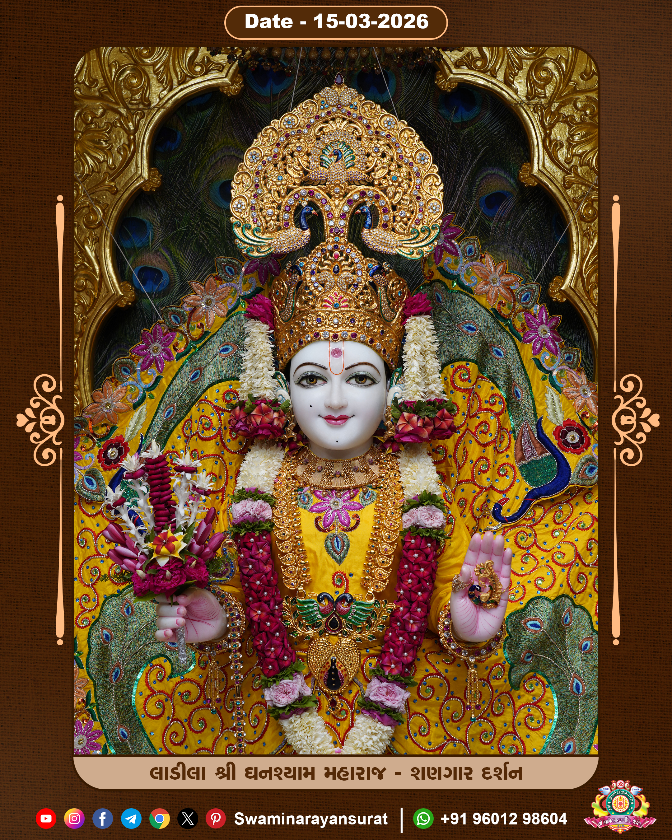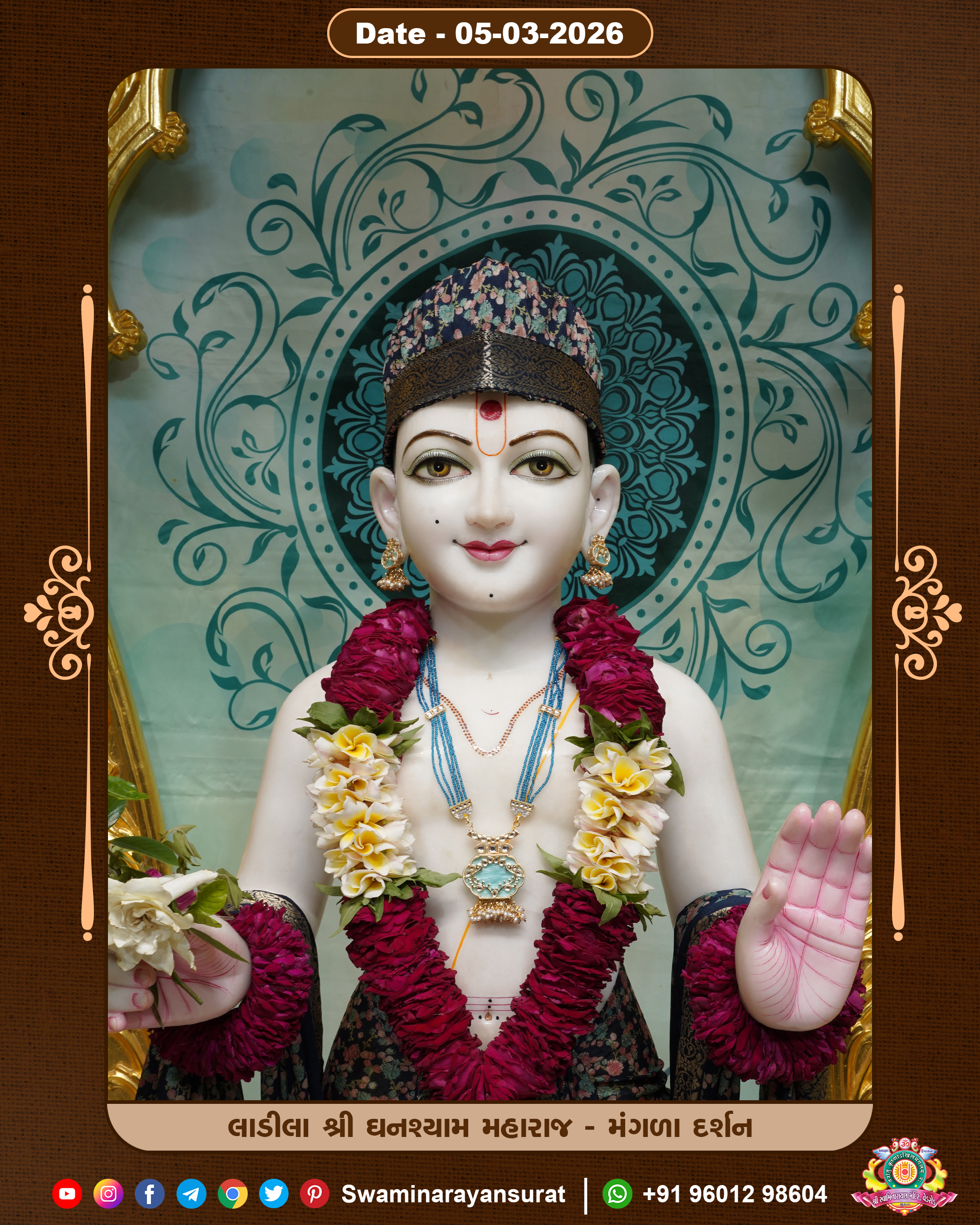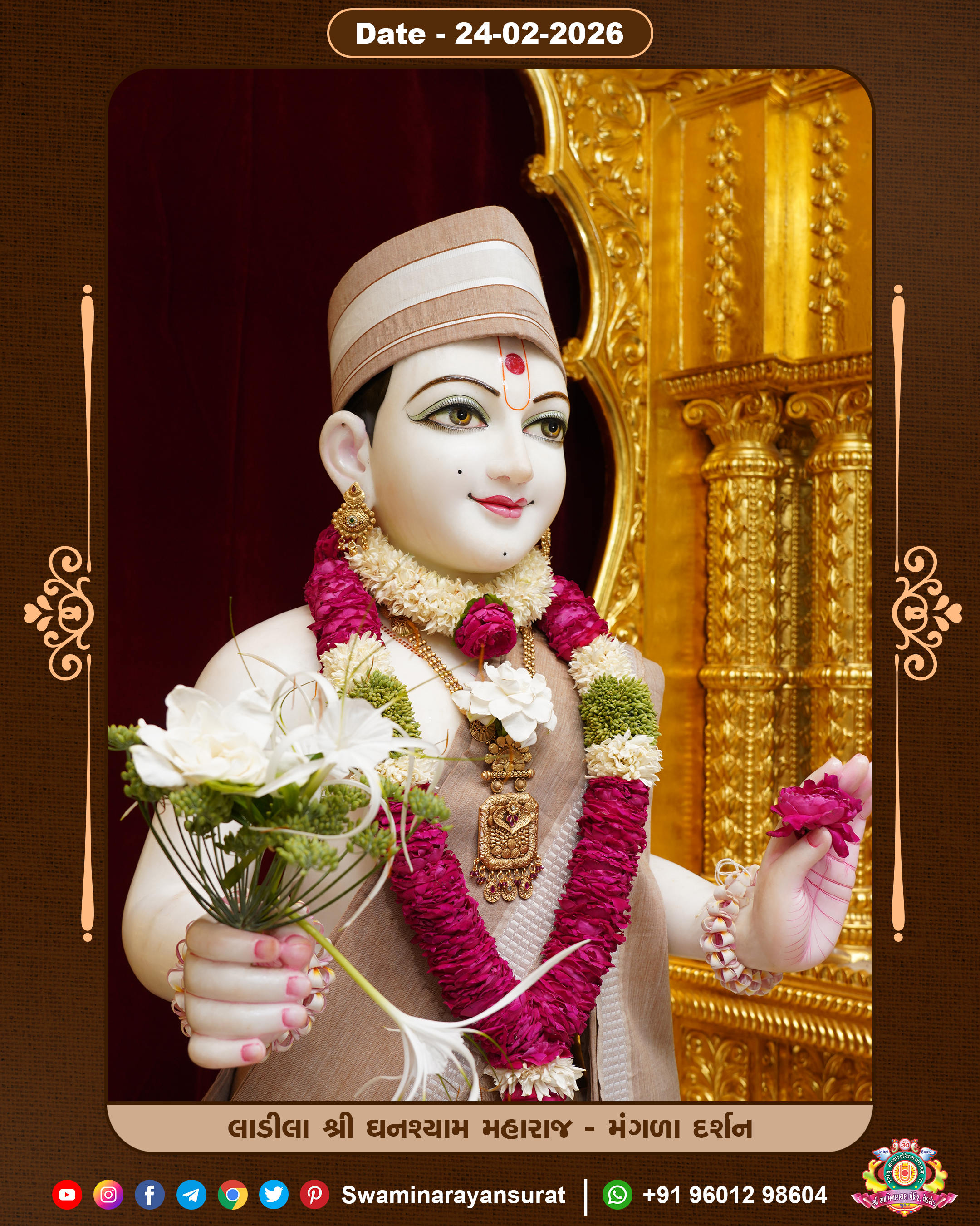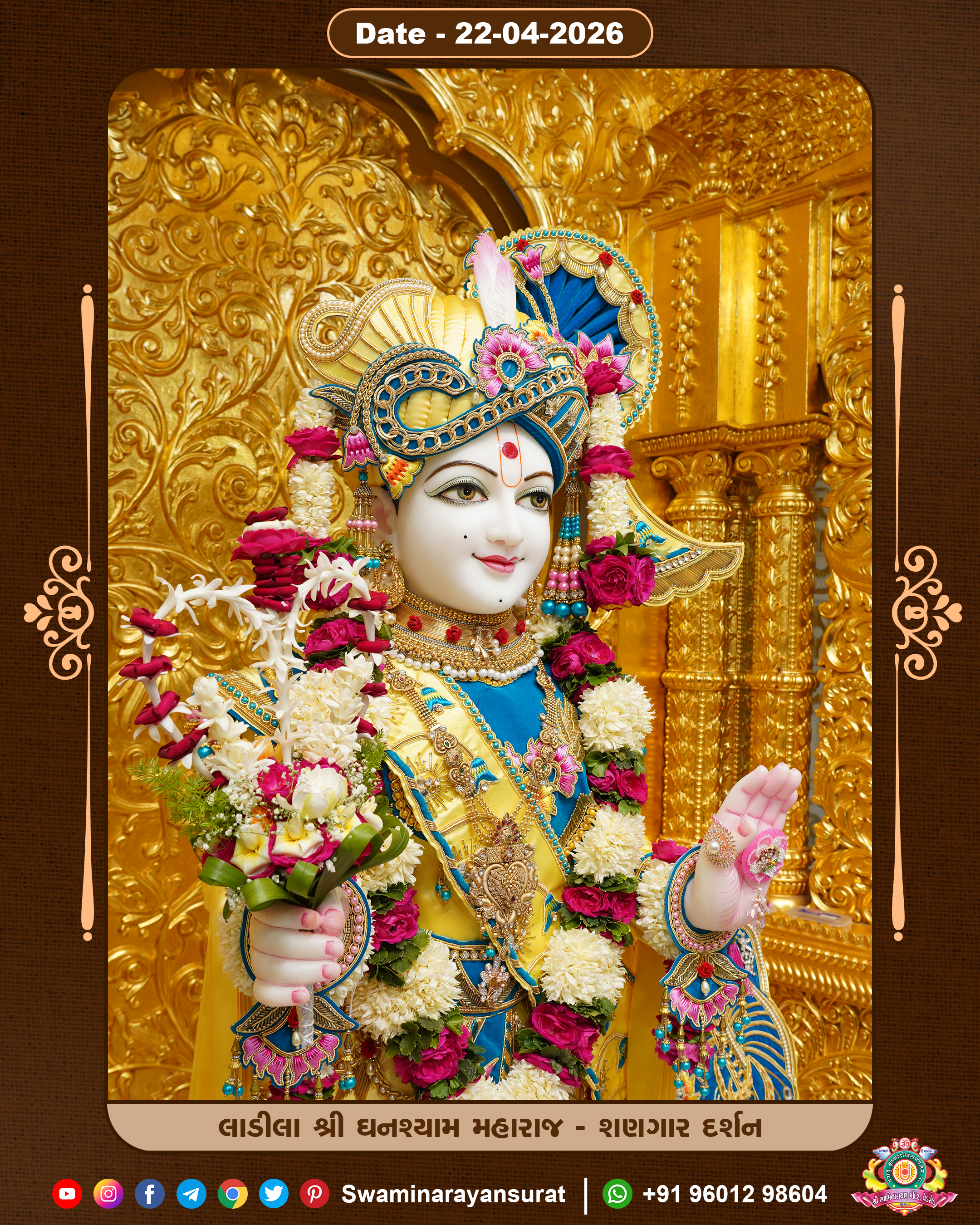Shree Swaminarayan Temple, VedRoad is a Spiritual Organization Which falls under the region Of Vadtal Temple (The Headquarter Of Laxminarayan Dev Gadi). It is the First Organization Which is Constructed By Pink Stone With Beautiful and Marvellous Carving in Surat Of Swaminarayan Sampraday, Vadtal desh Which is increasing Pride & Prestige of Surat City, This temple contains One Main Shrine under which the idol of Ladila Shree Ghanshyam Maharaj is installed. P. Pu. Sadguru Shree Prabhucharandasji Swami is the Creator of this divine Organization. By the Several Activities & appearance Many devotees feels Easy in difficult Circumstances. He with his approx. 15 Saints & Devotees does Several Social & Spiritual Activities to fulfill the goal of Swaminarayan Sampraday, to do Worship with religious practices.